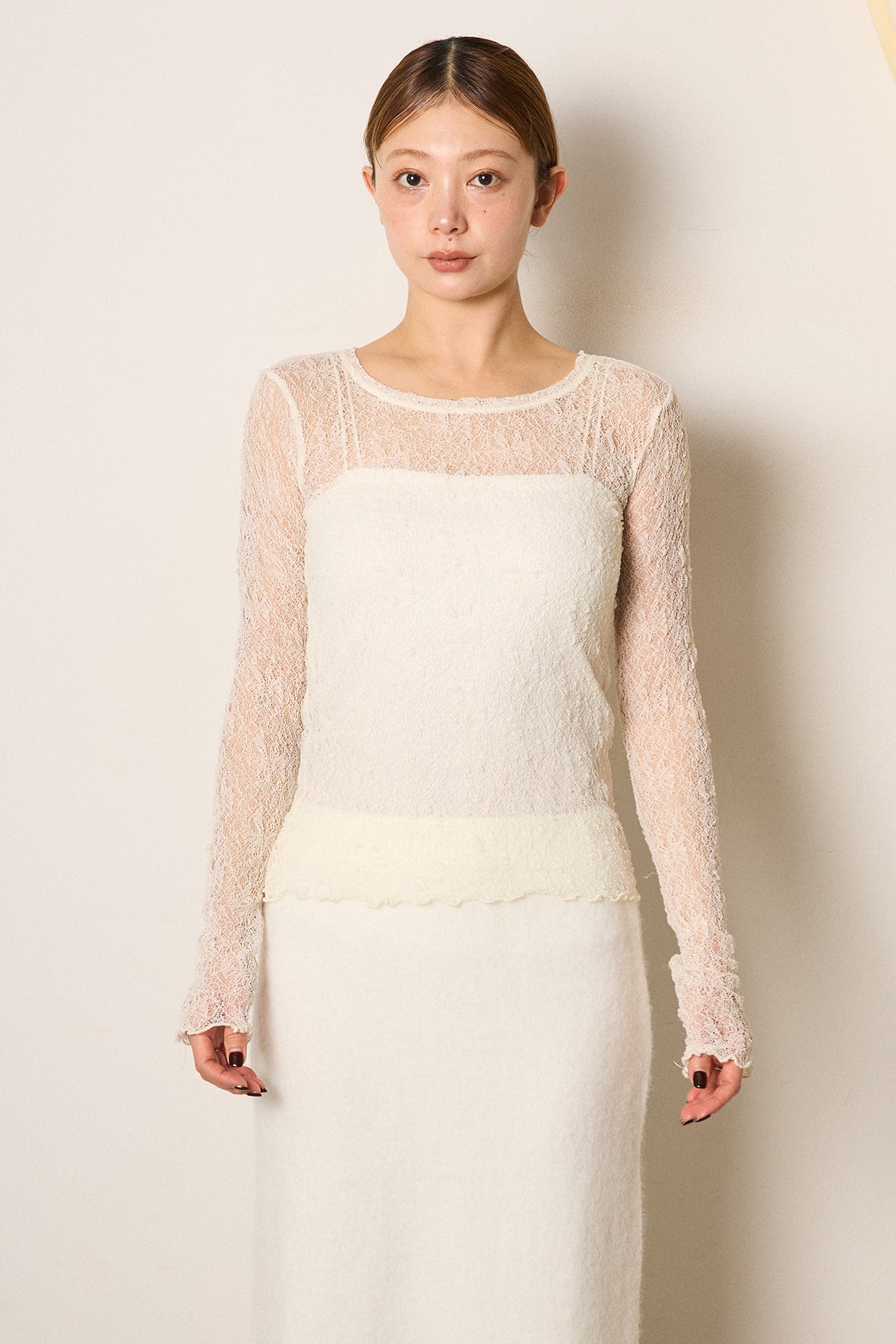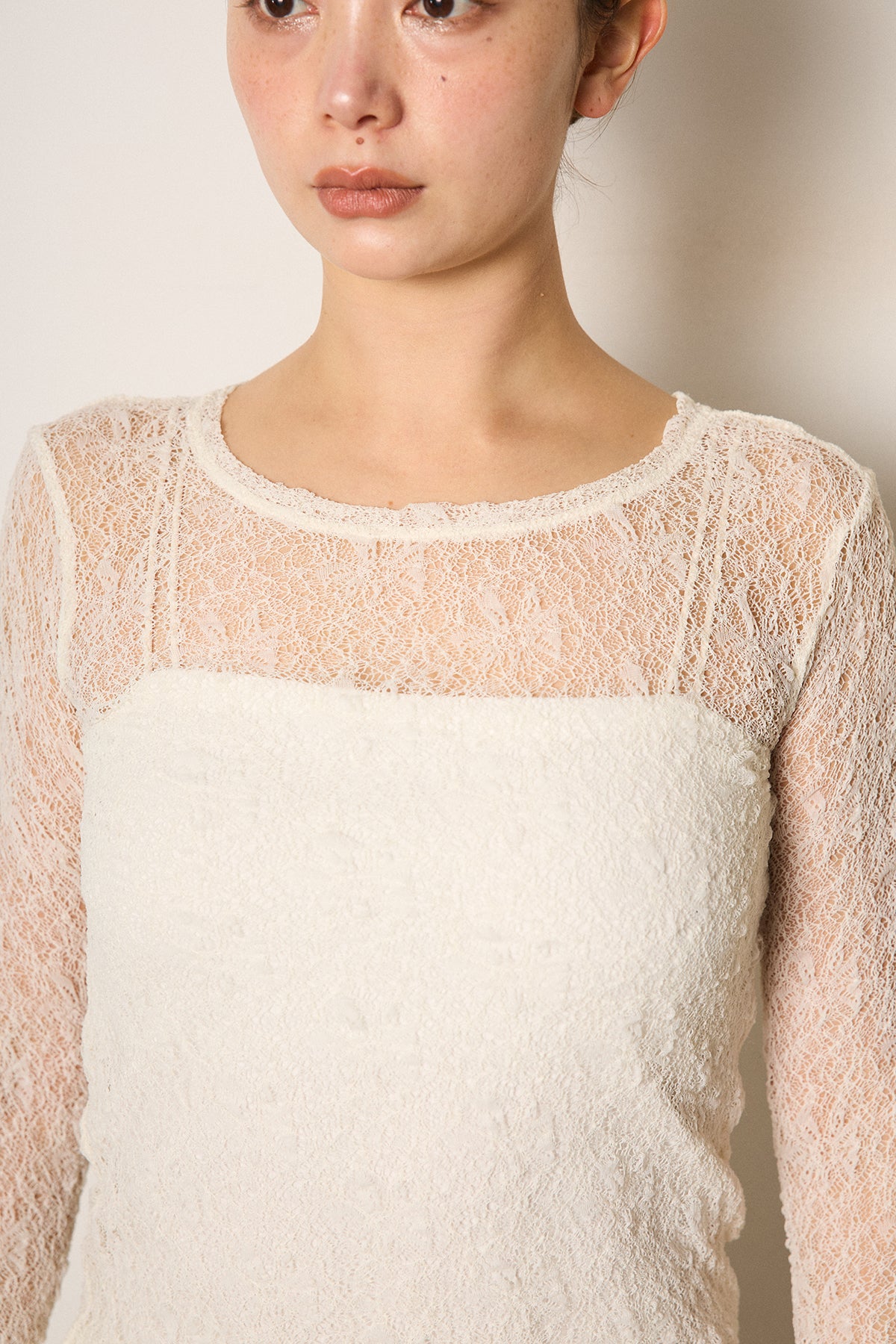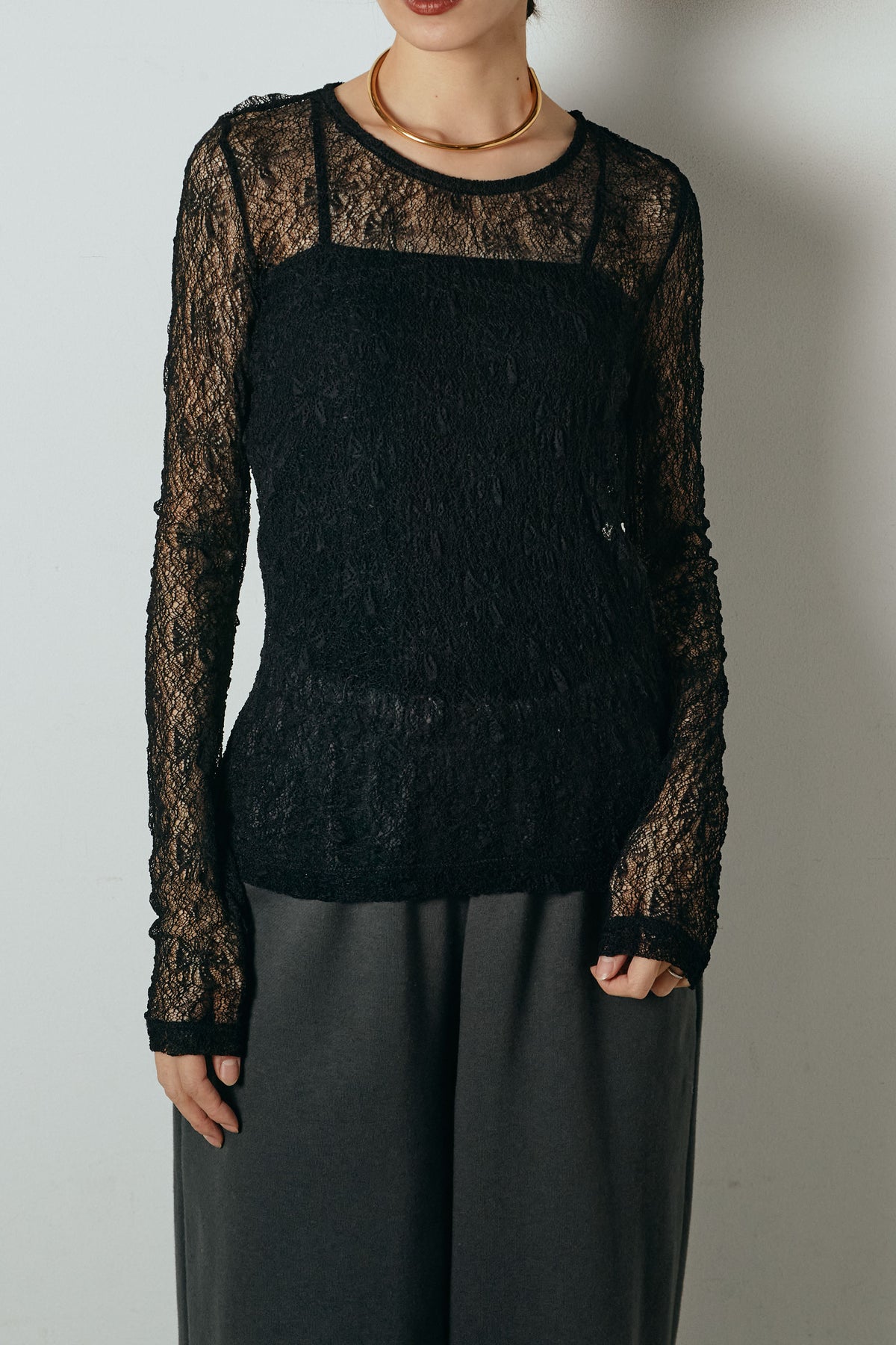 繊細なレース素材を使用した、クルーネックデザインのストレッチインナー。程よい透け感がスタイリングに奥行きを与え、レイヤードに取り入れるだけで女性らしいニュアンスを演出します。ストレッチ性があり、身体に優しくフィットしながらも動きやすい着心地。ニットやジャケットのインナーとして活躍し、コーディネートの幅を広げてくれる一枚です。