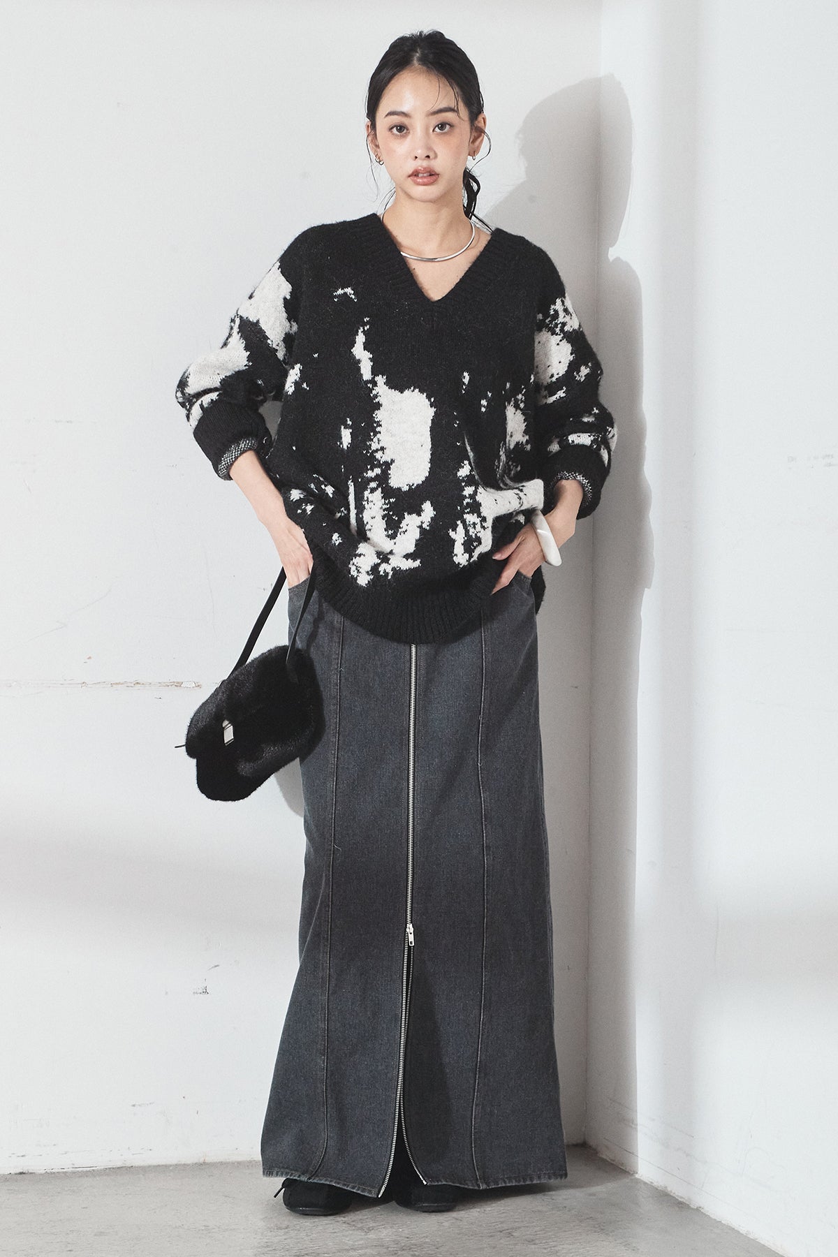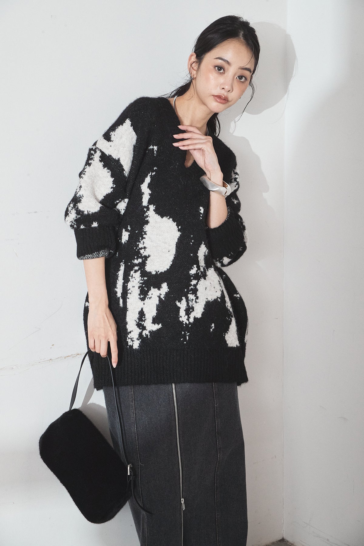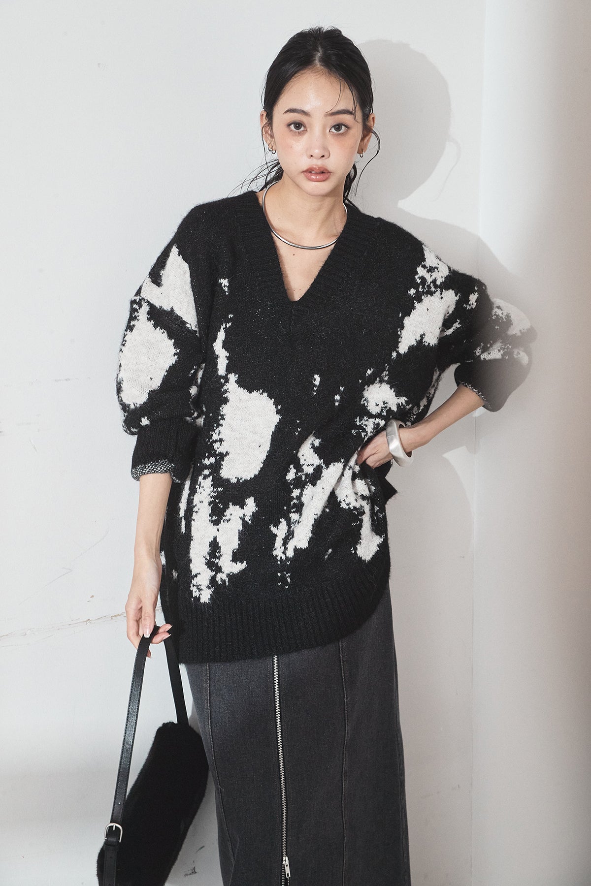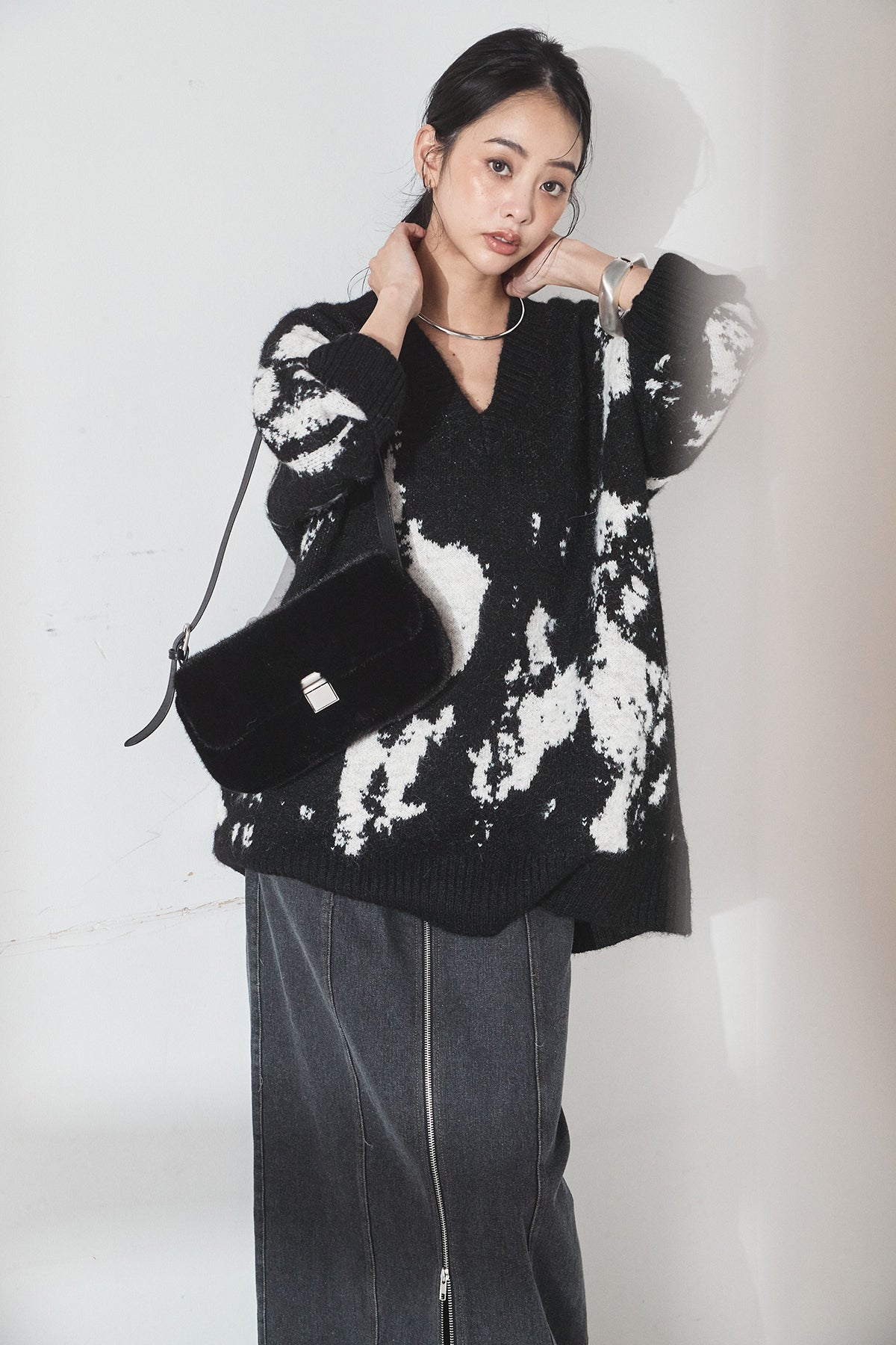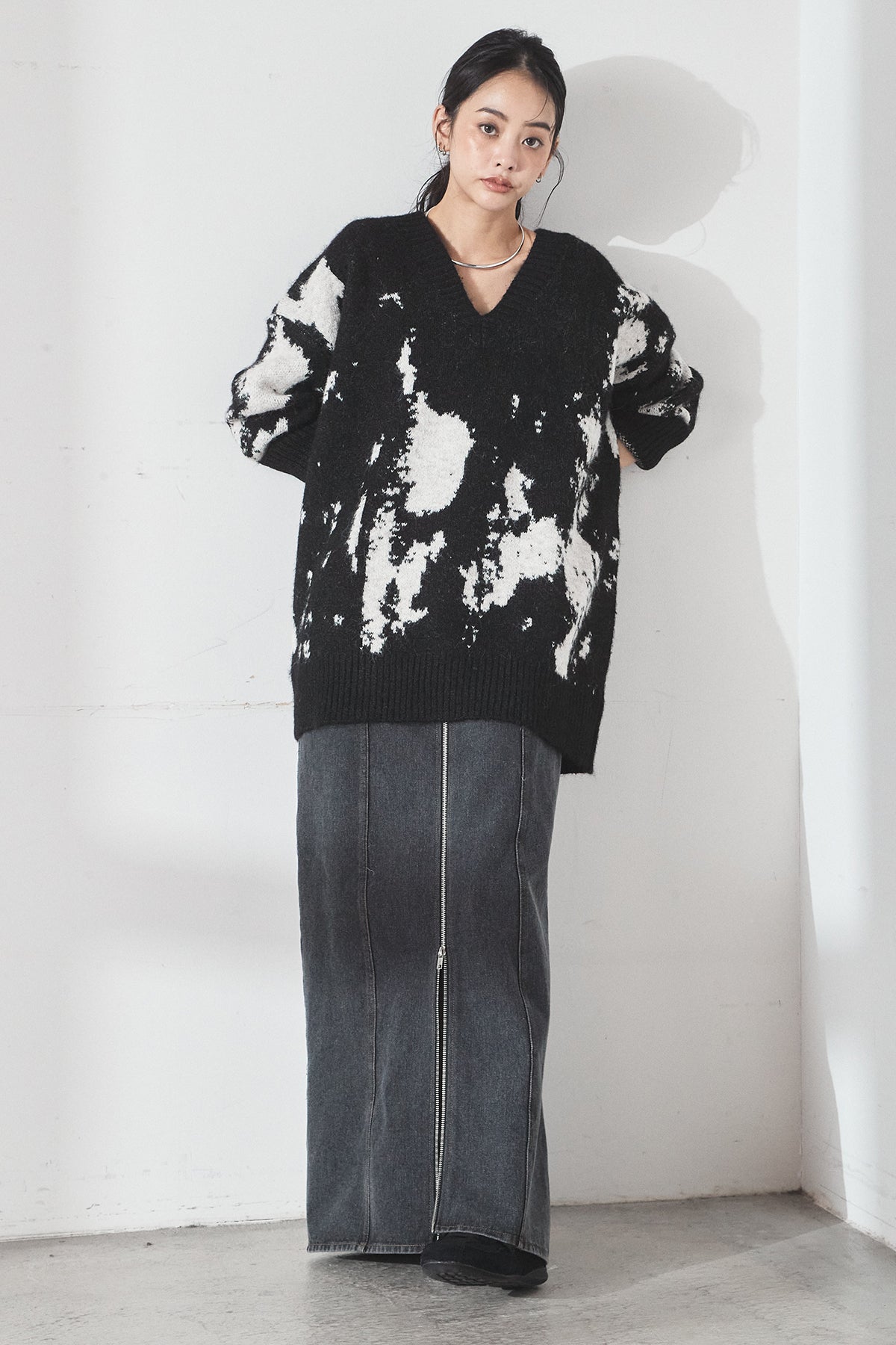 [SET]アブストラクト柄ニットプルオーバー+フロントジップデニムスカート(2set)