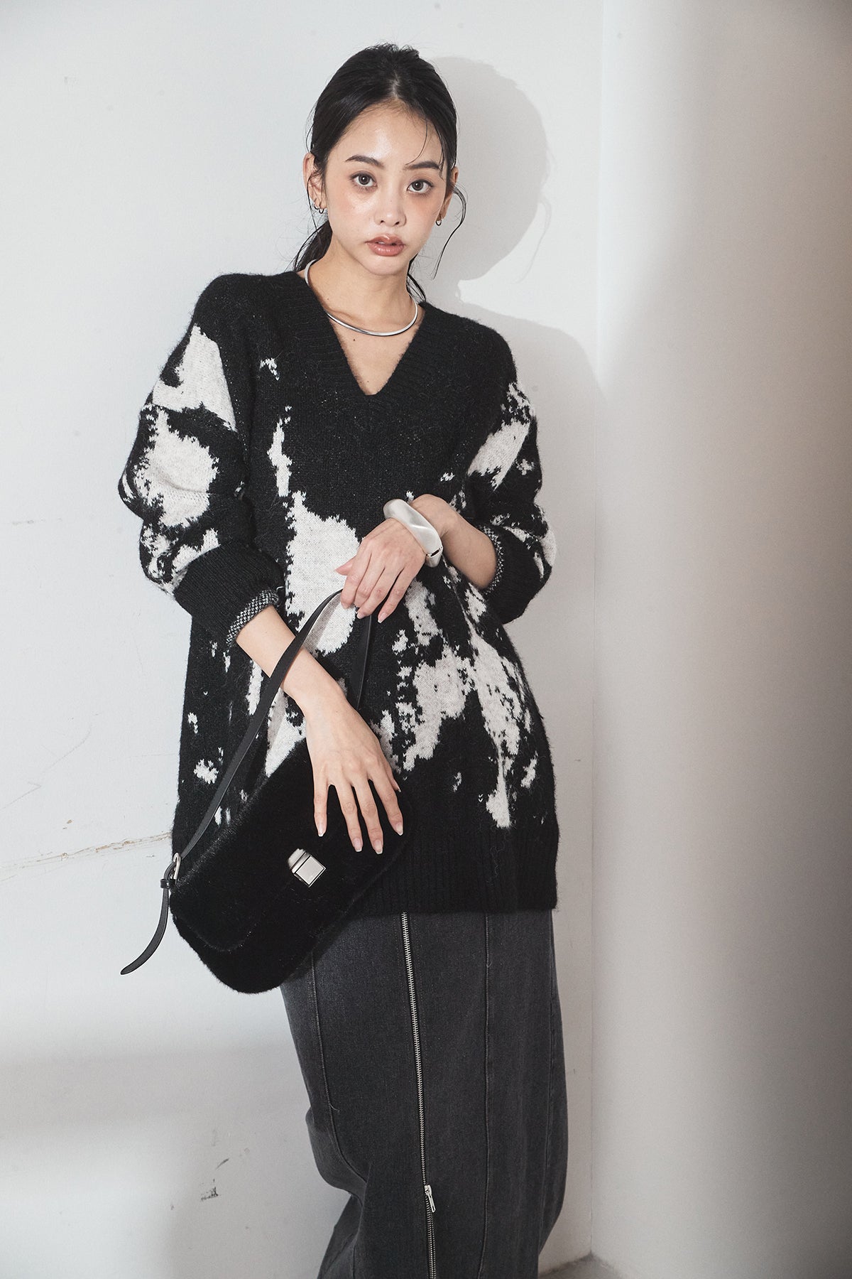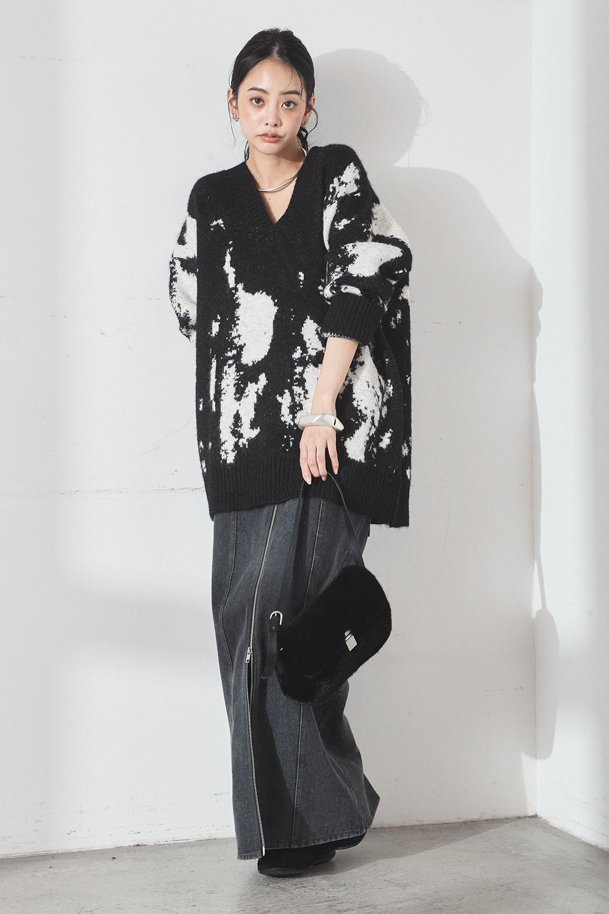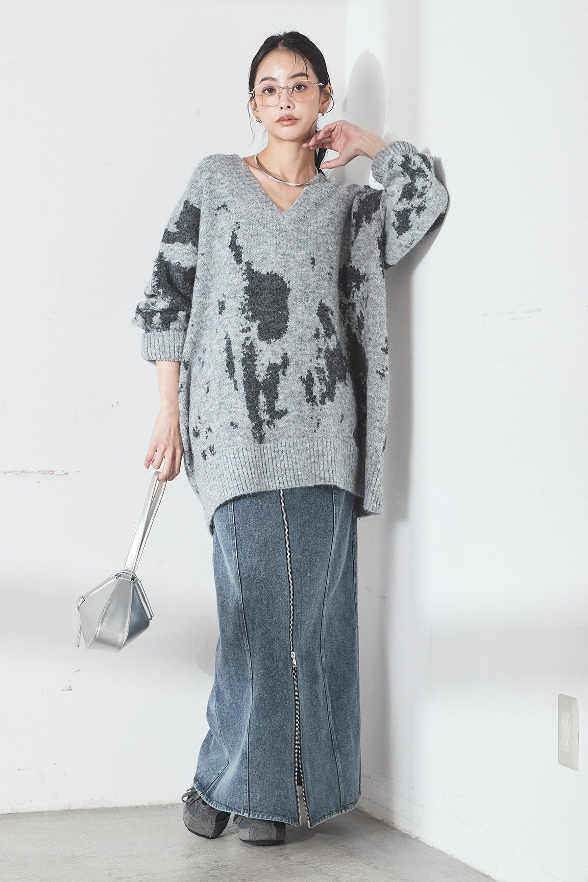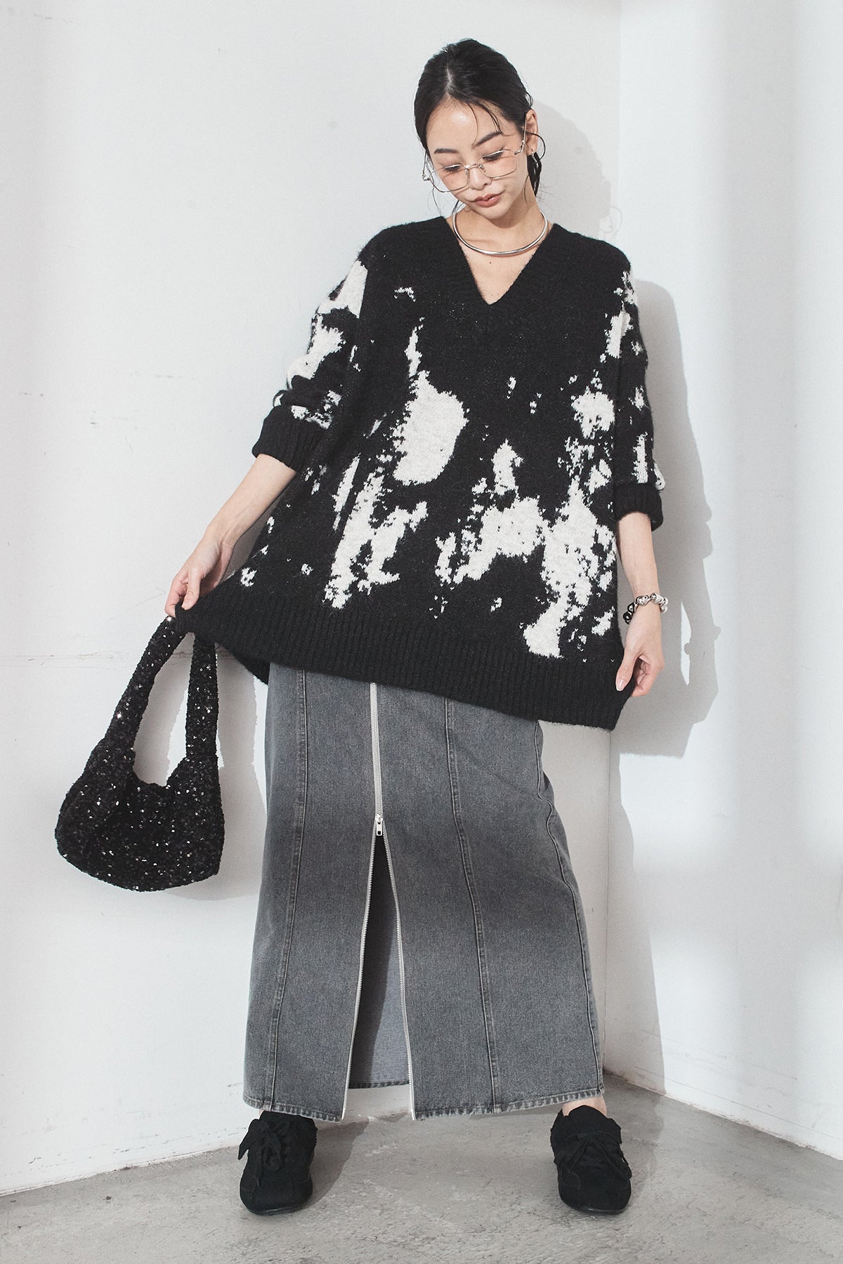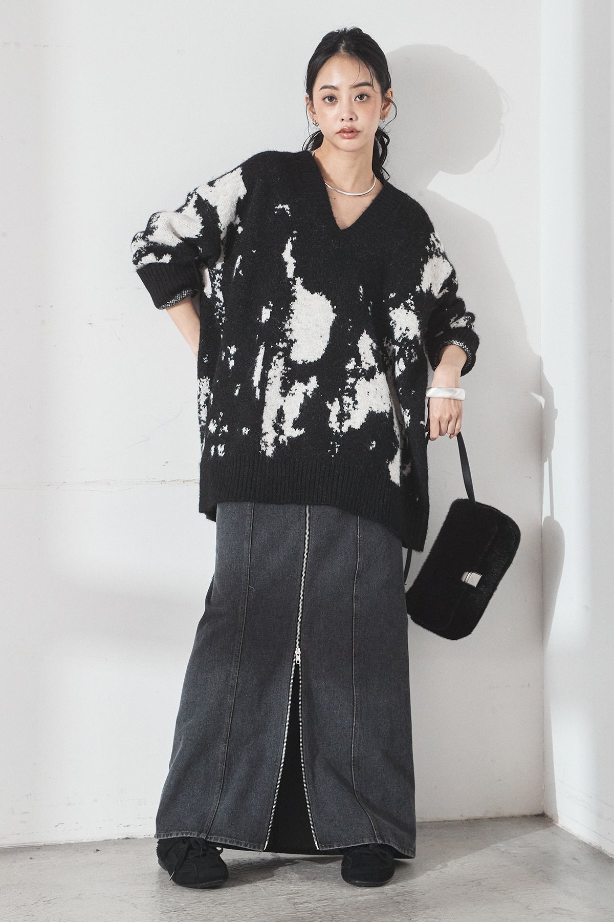[SET]アブストラクト柄ニットプルオーバー+フロントジップデニムスカート(2set)