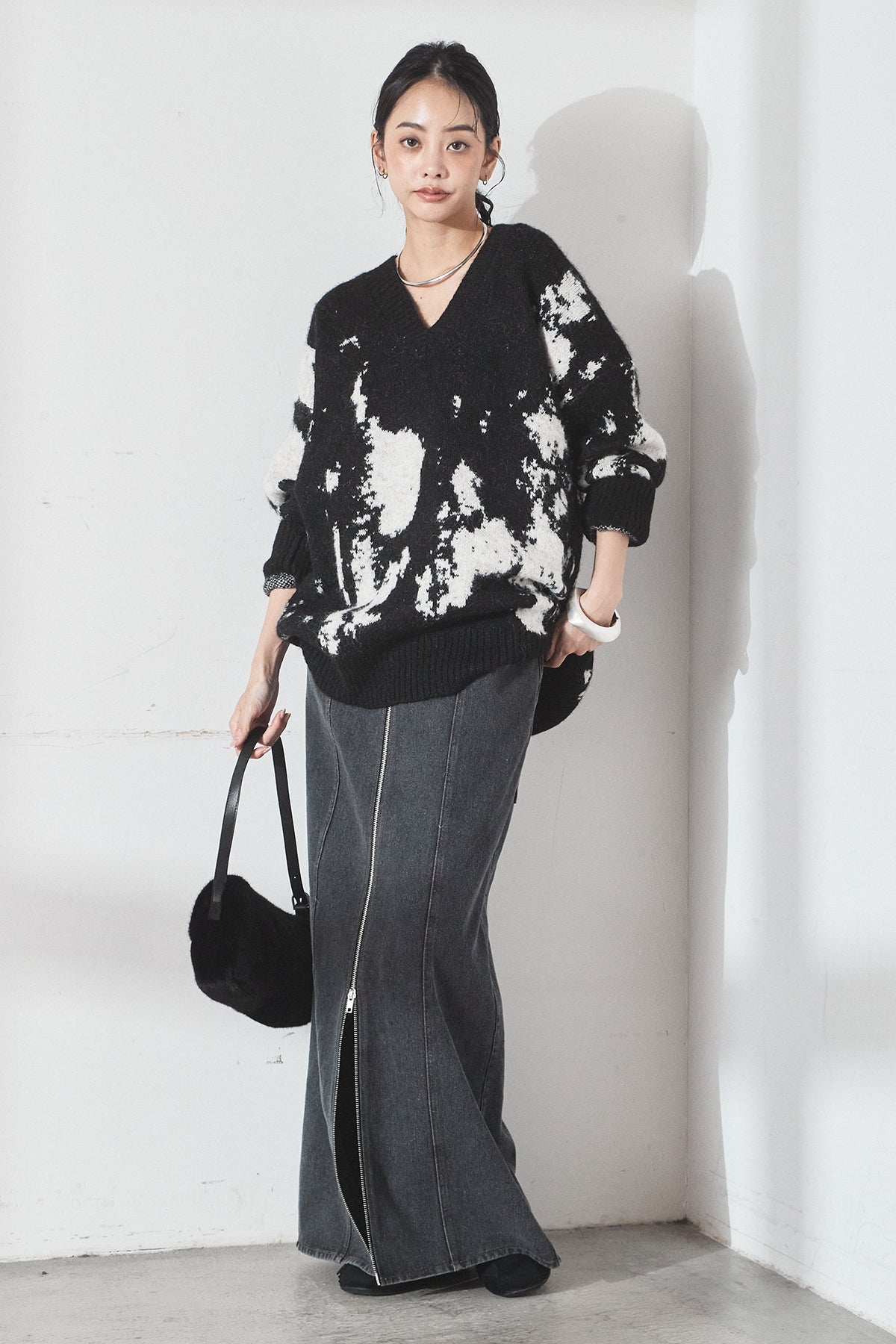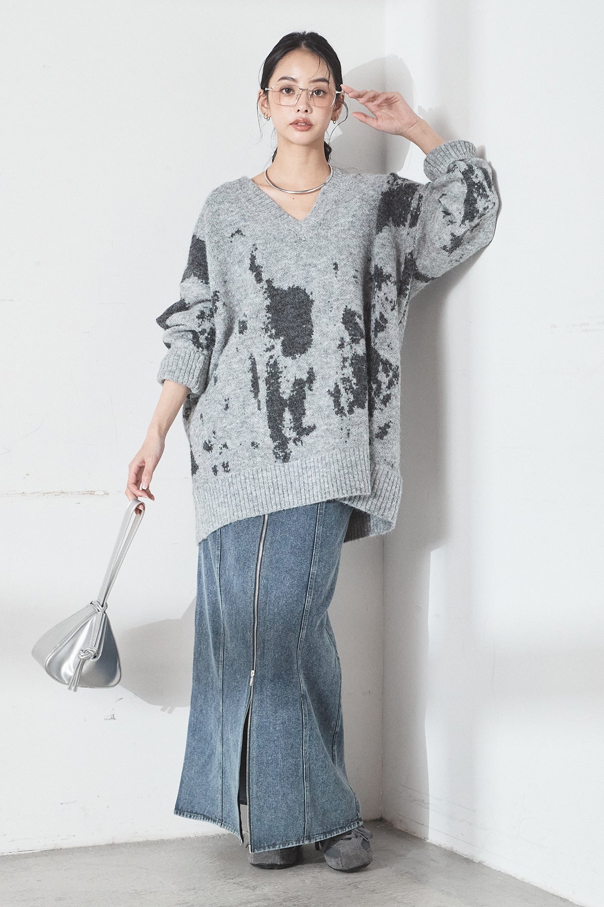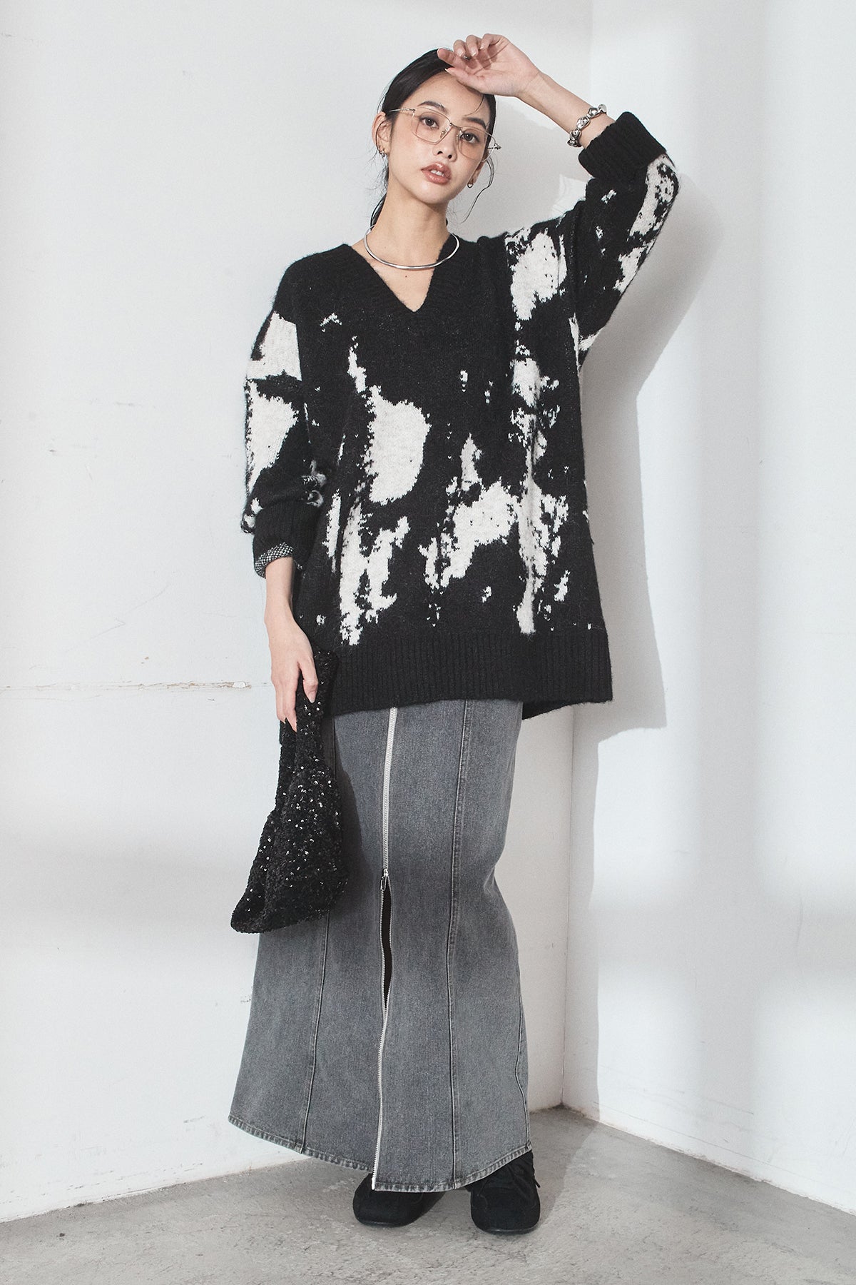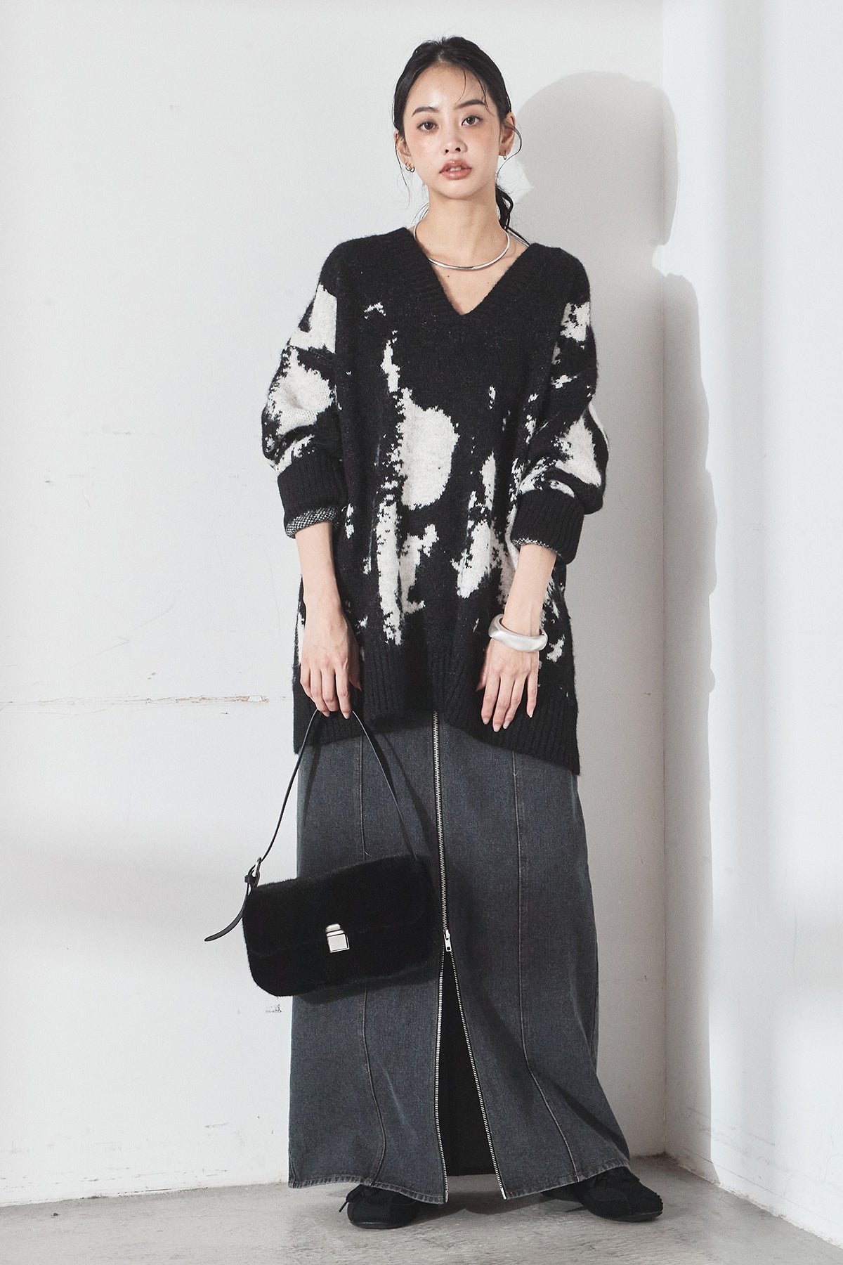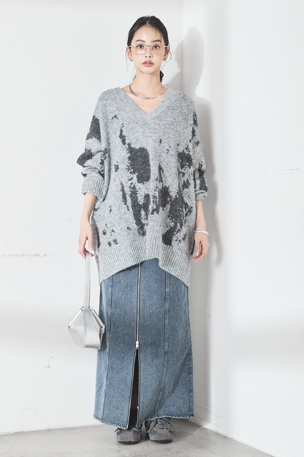 [SET]アブストラクト柄ニットプルオーバー+フロントジップデニムスカート(2set)