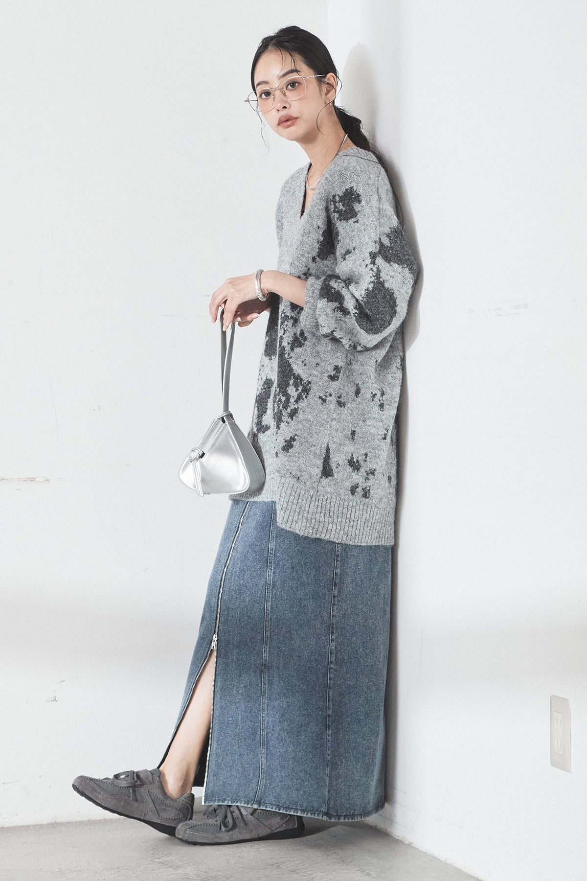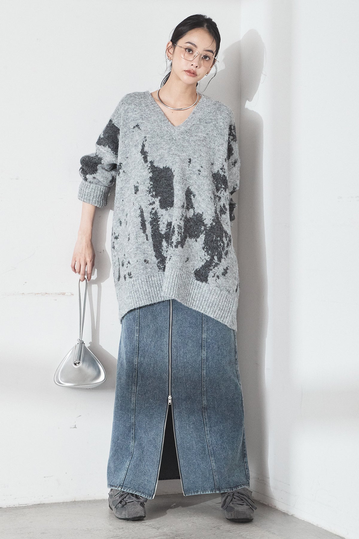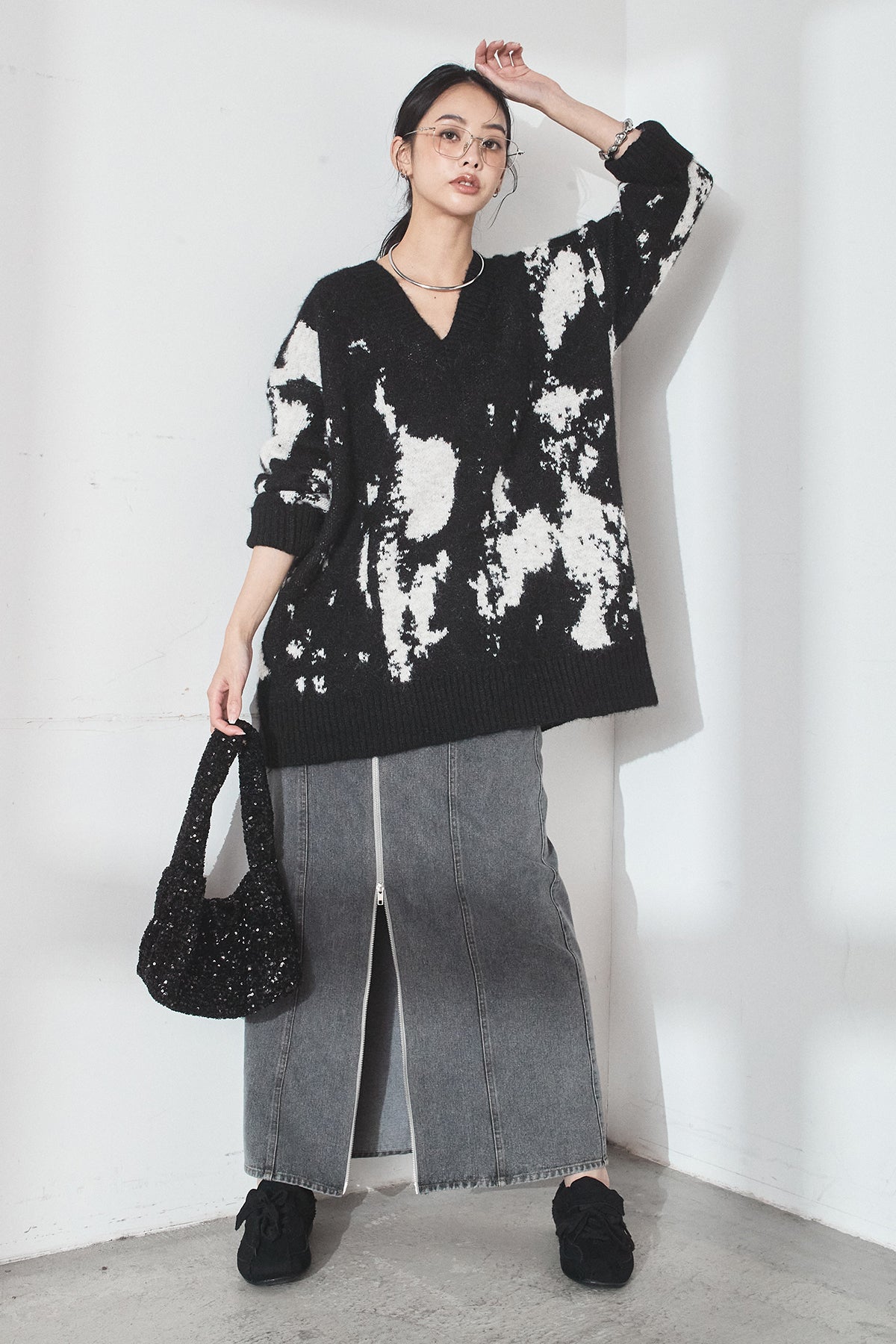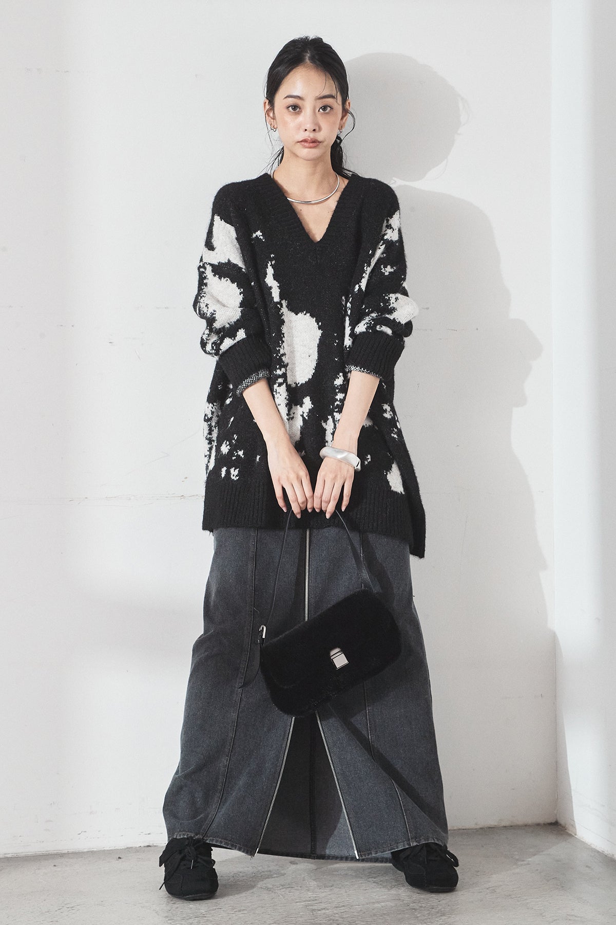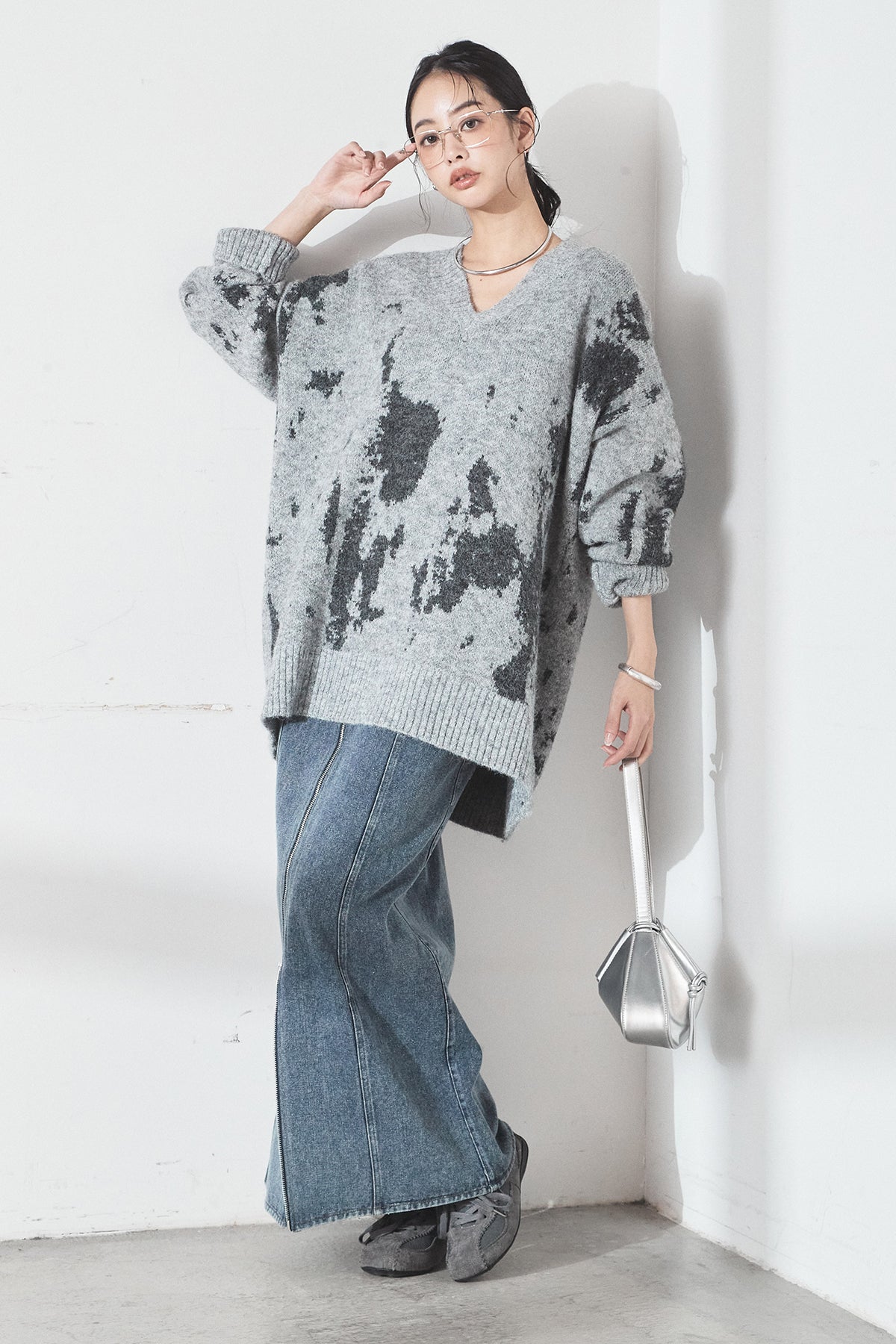 [SET]アブストラクト柄ニットプルオーバー+フロントジップデニムスカート(2set)