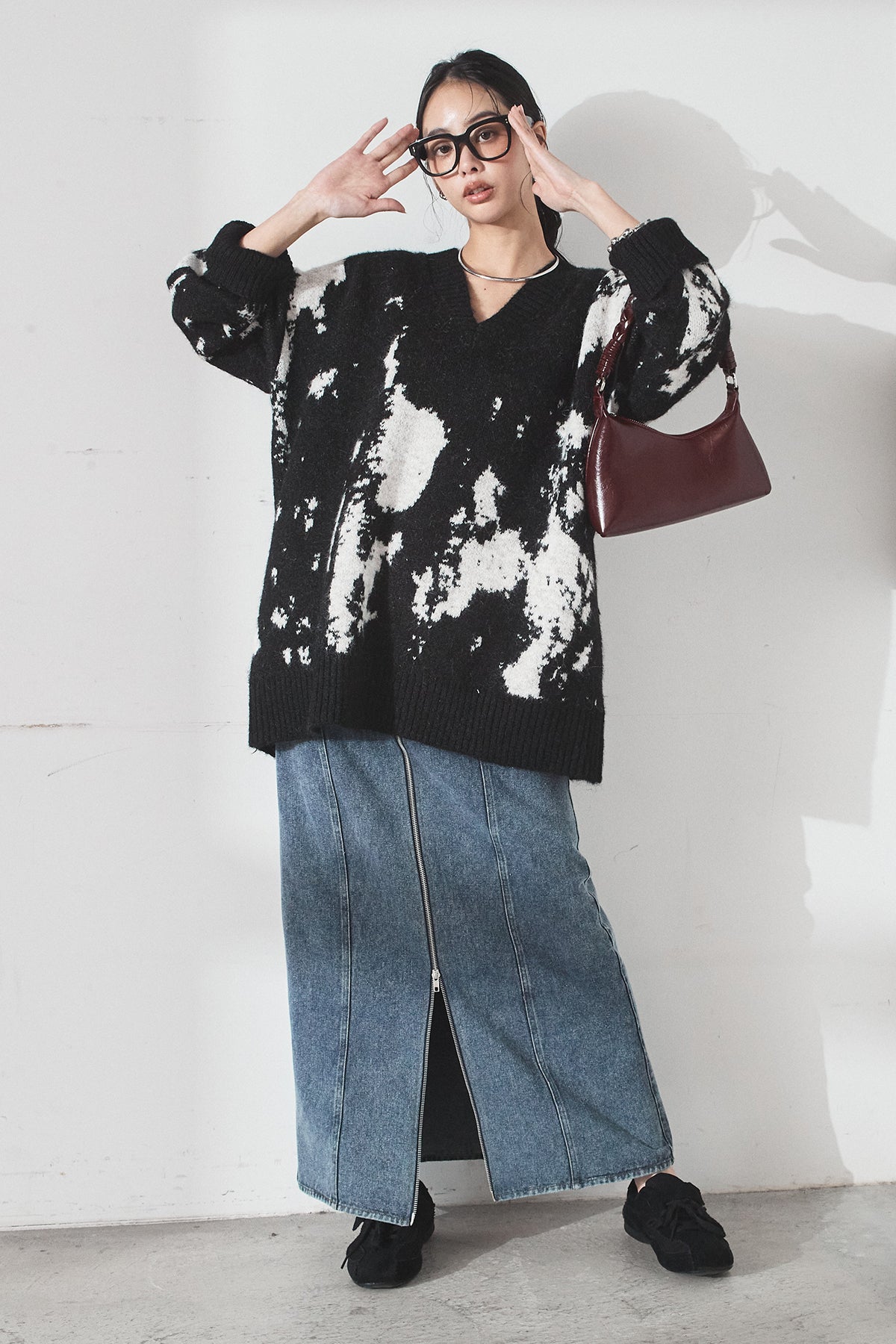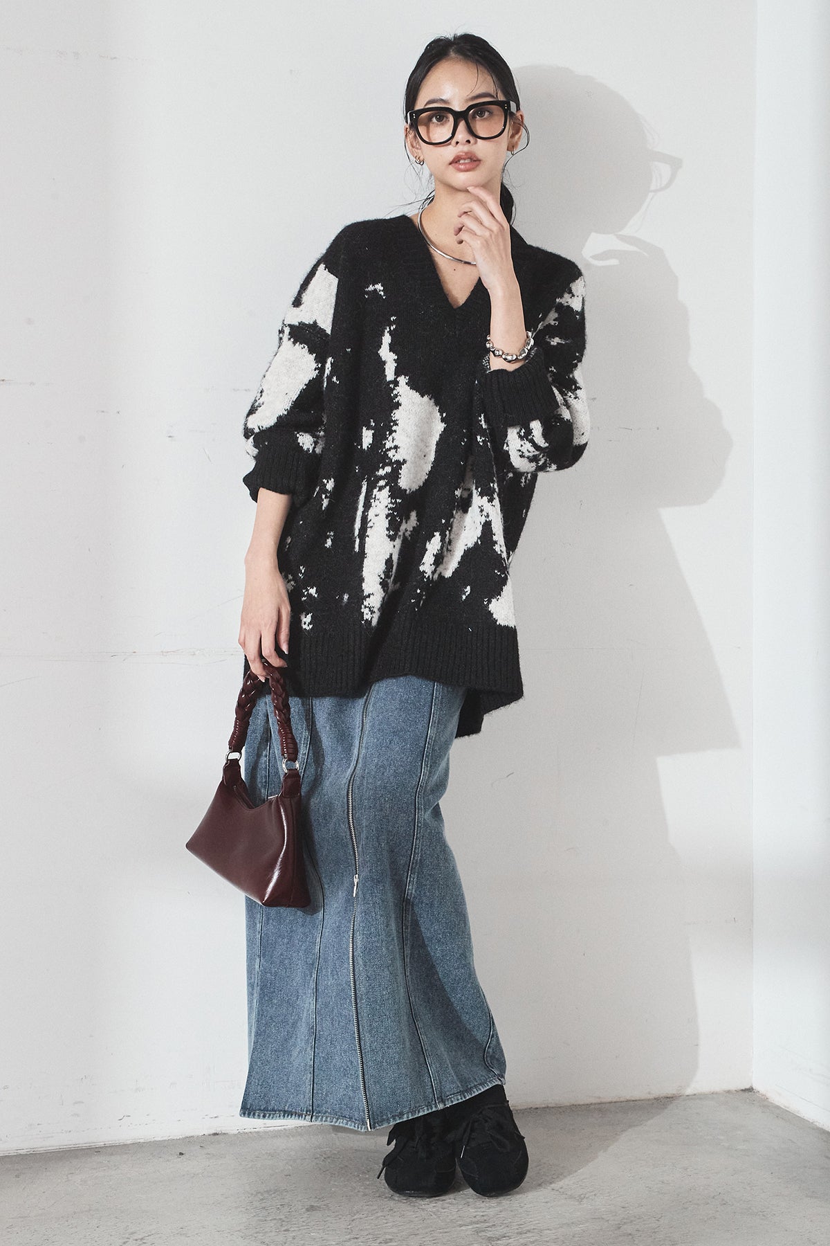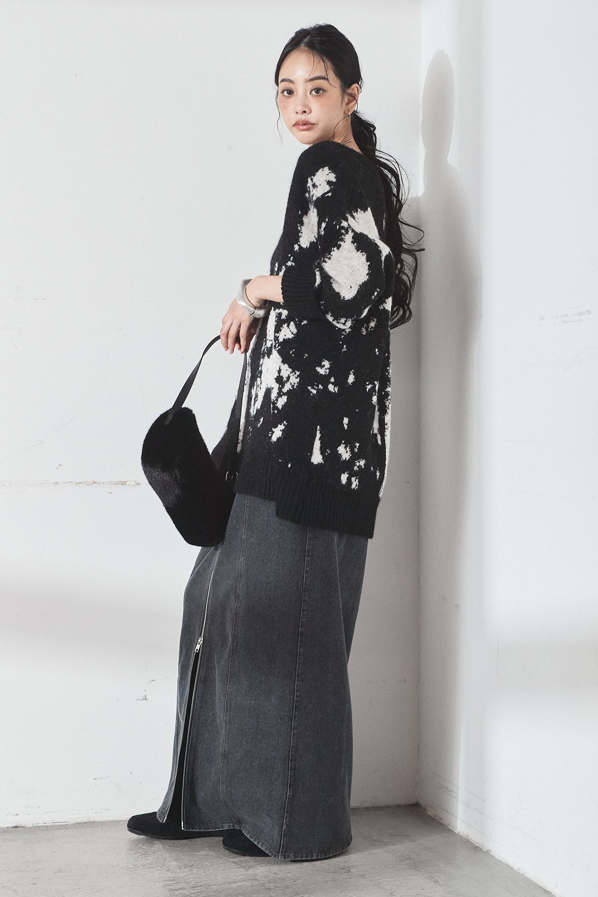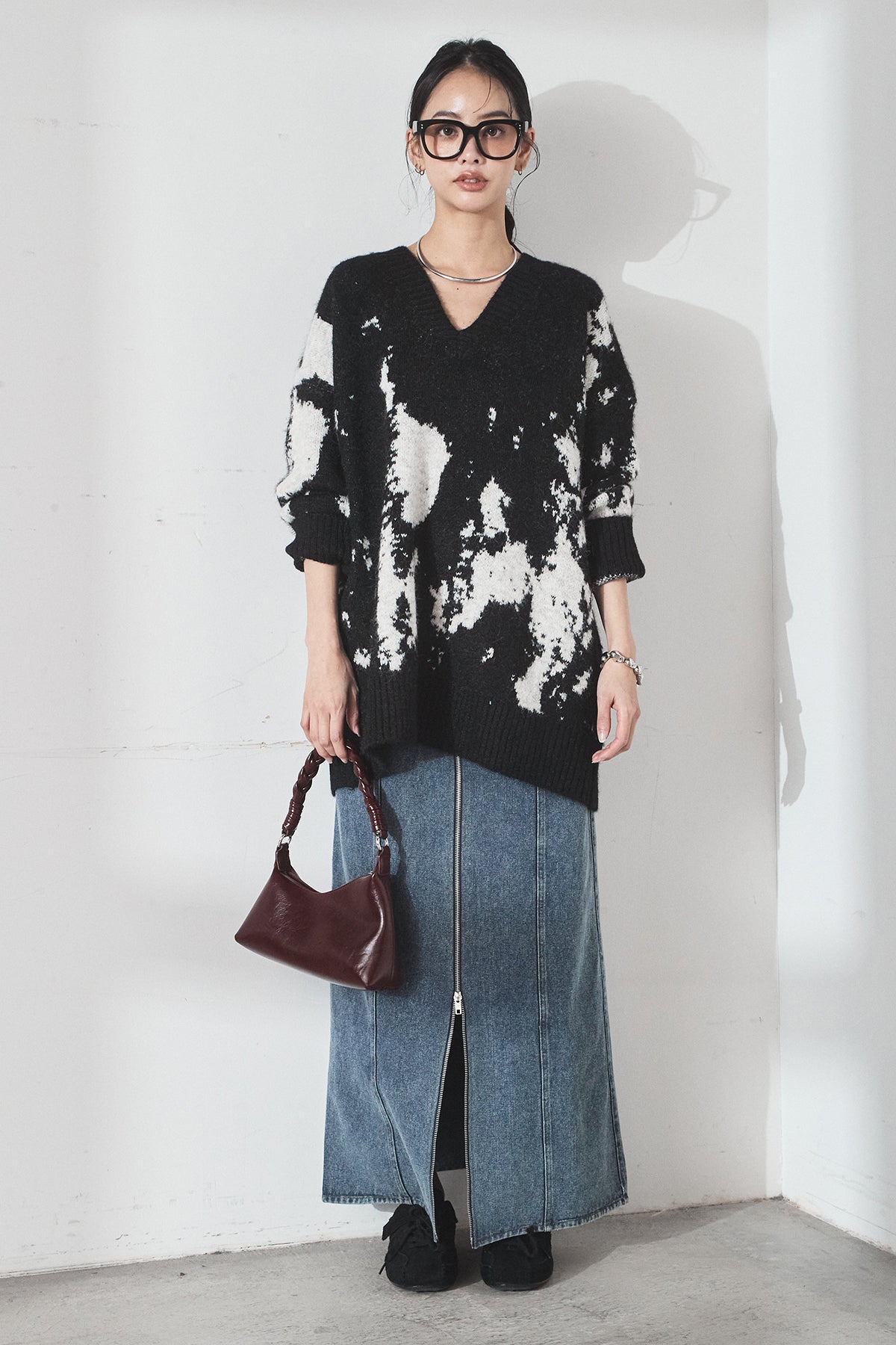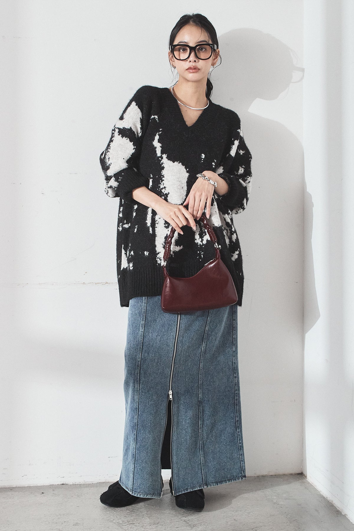 [SET]アブストラクト柄ニットプルオーバー+フロントジップデニムスカート(2set)