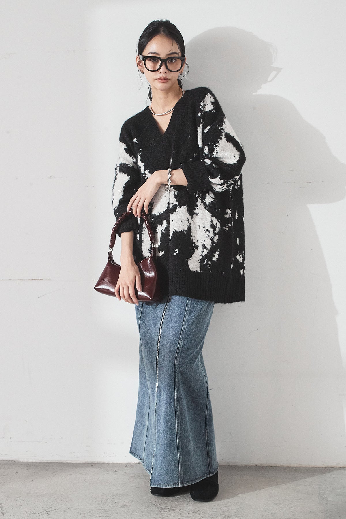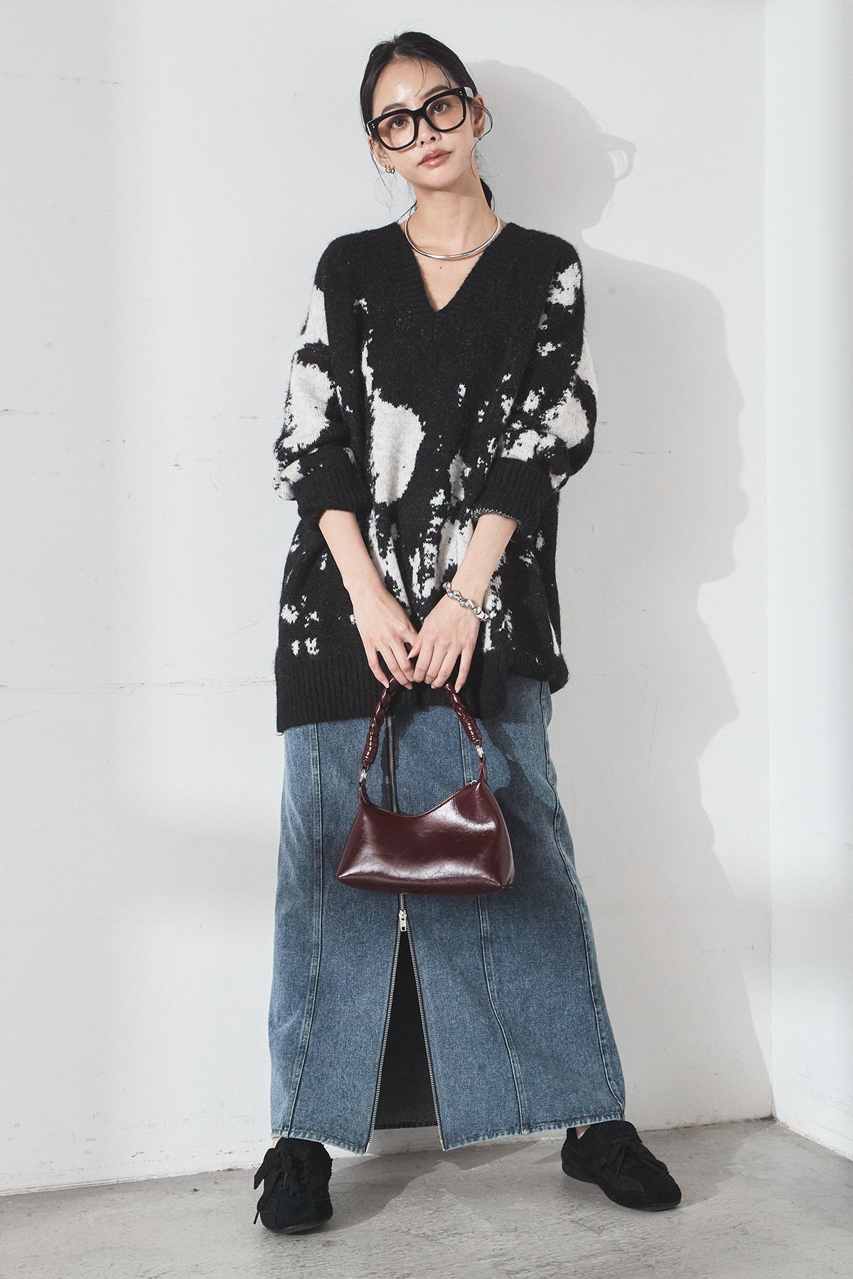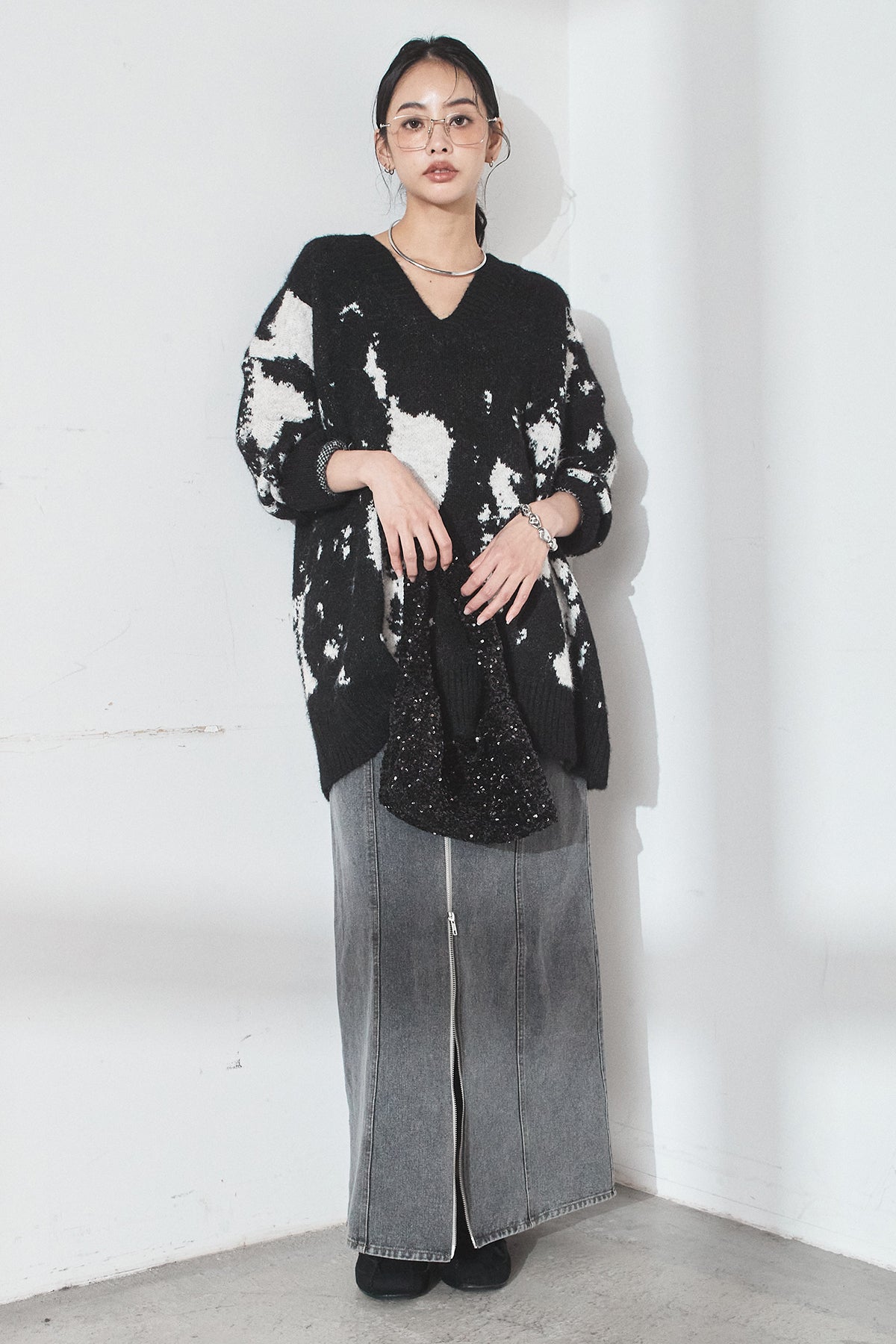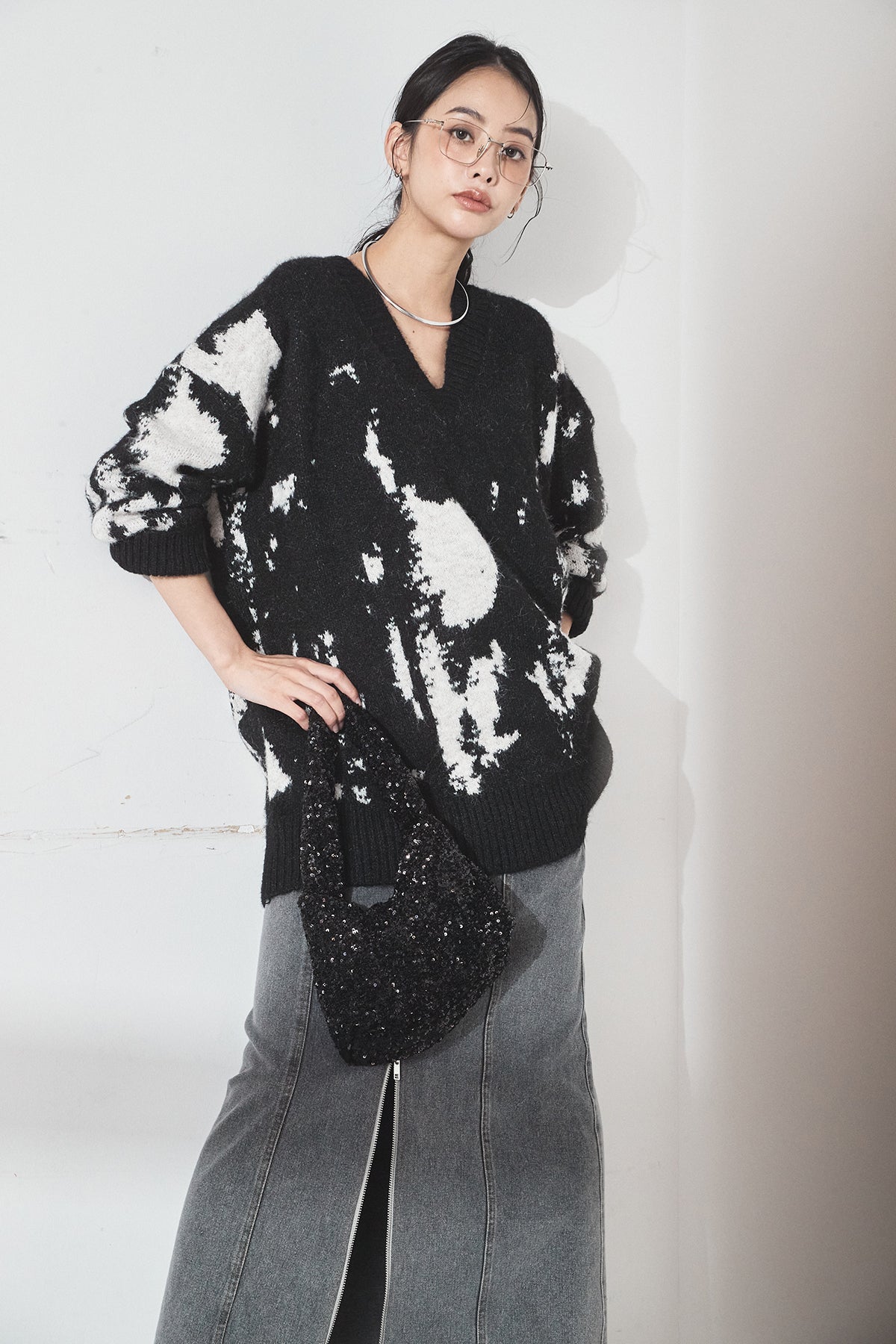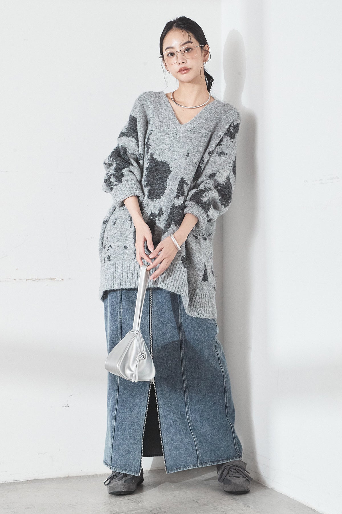 [SET]アブストラクト柄ニットプルオーバー+フロントジップデニムスカート(2set)