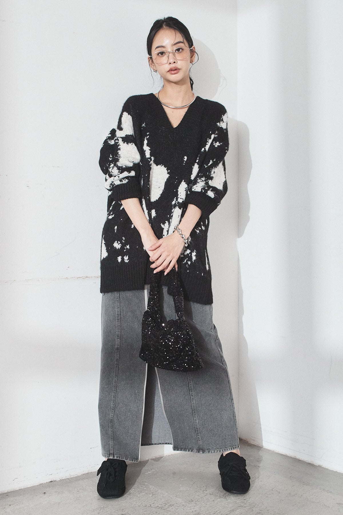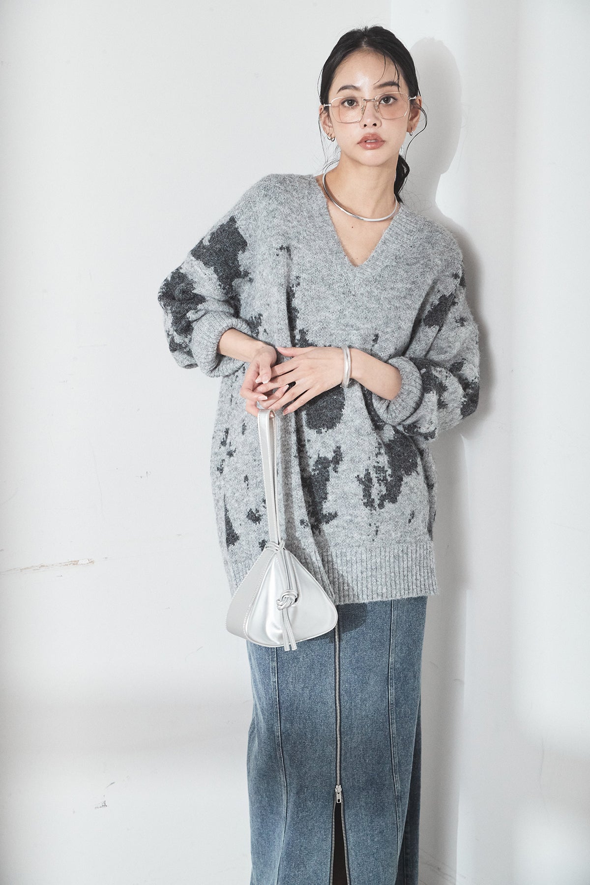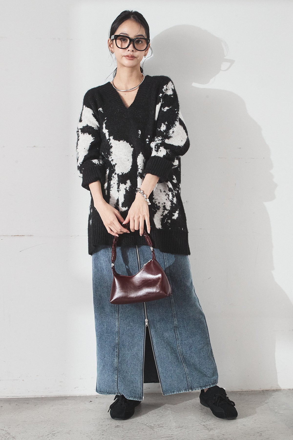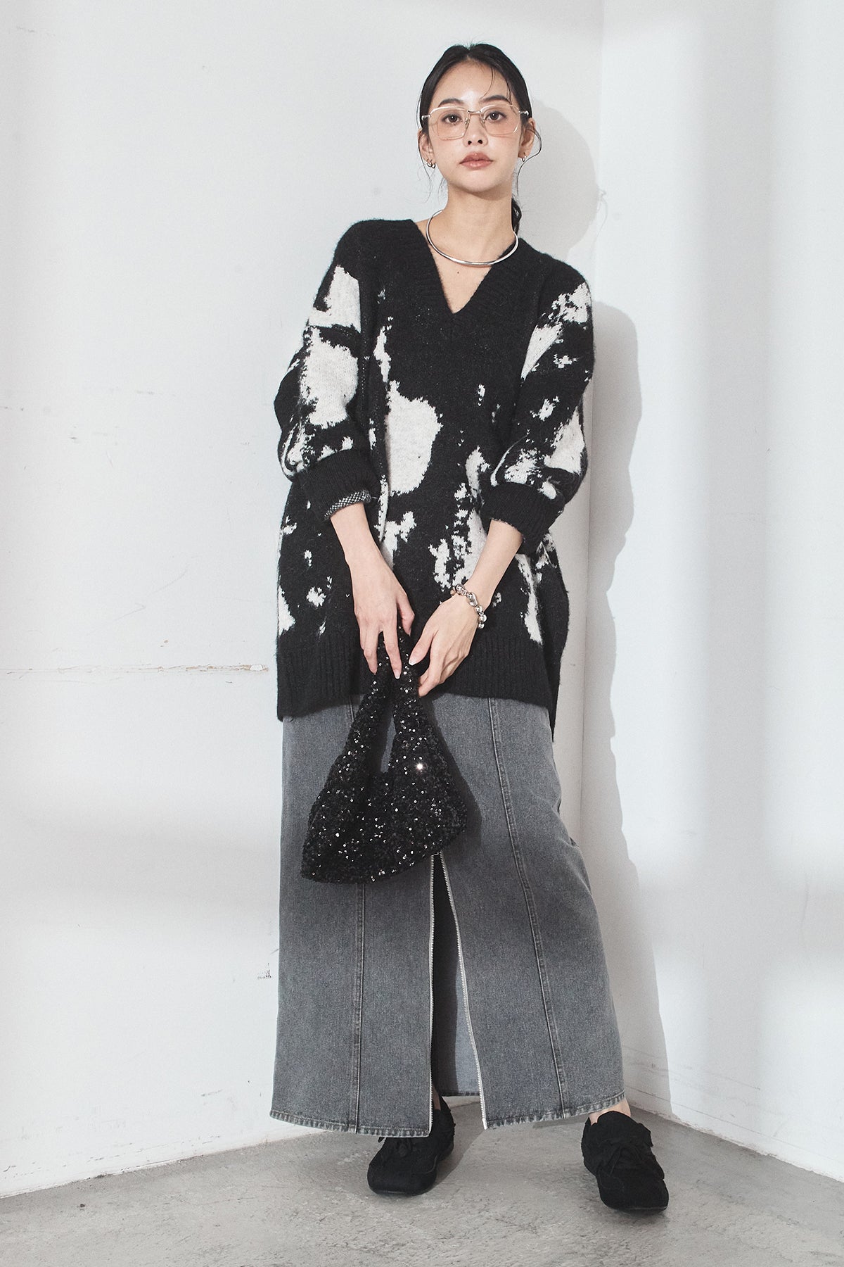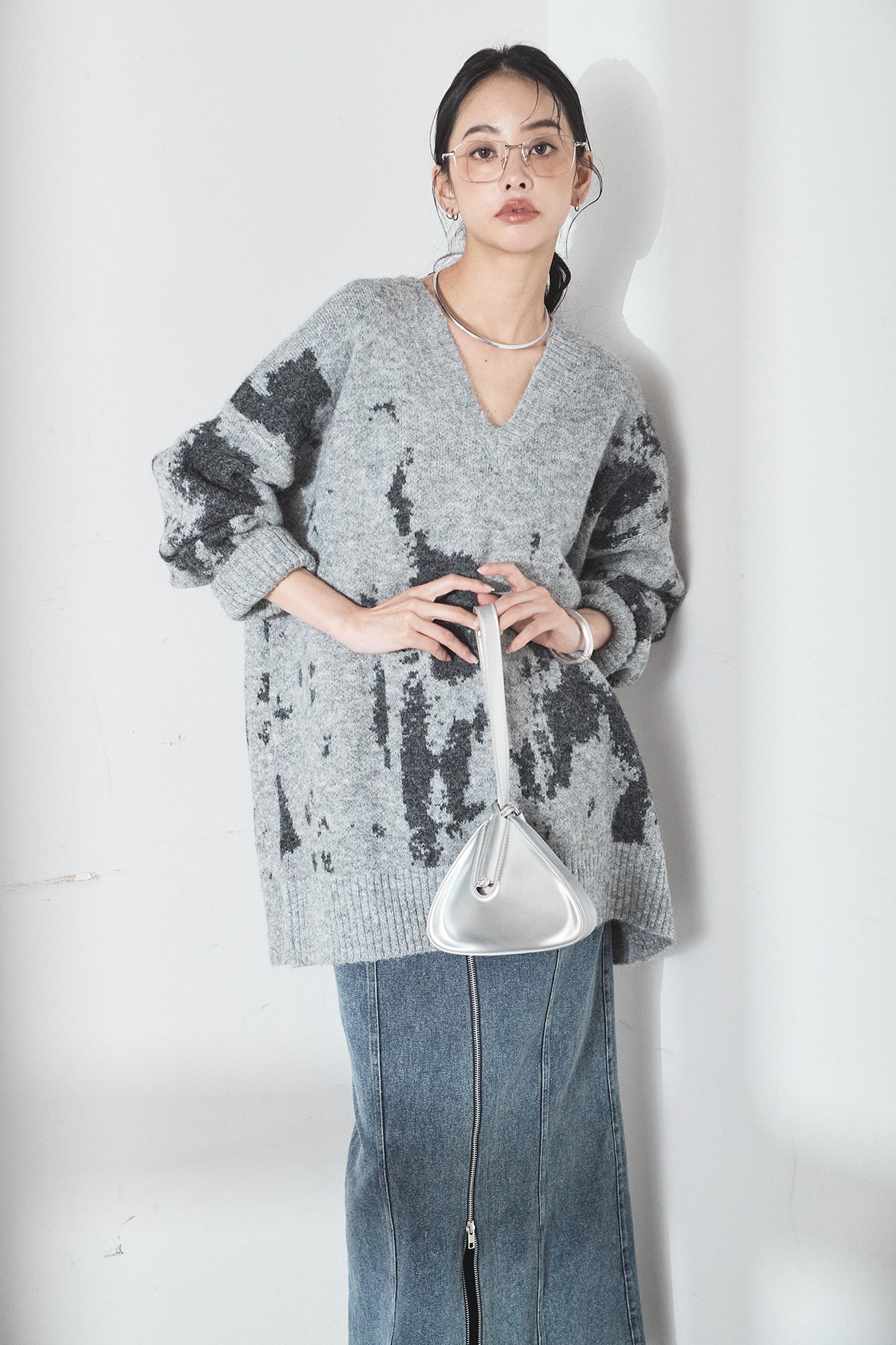 [SET]アブストラクト柄ニットプルオーバー+フロントジップデニムスカート(2set)