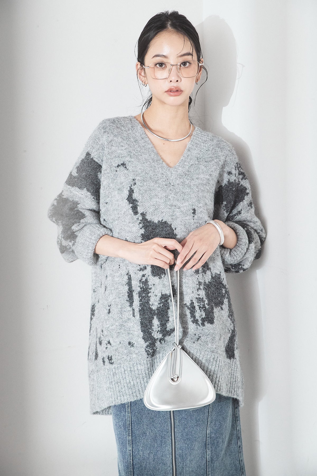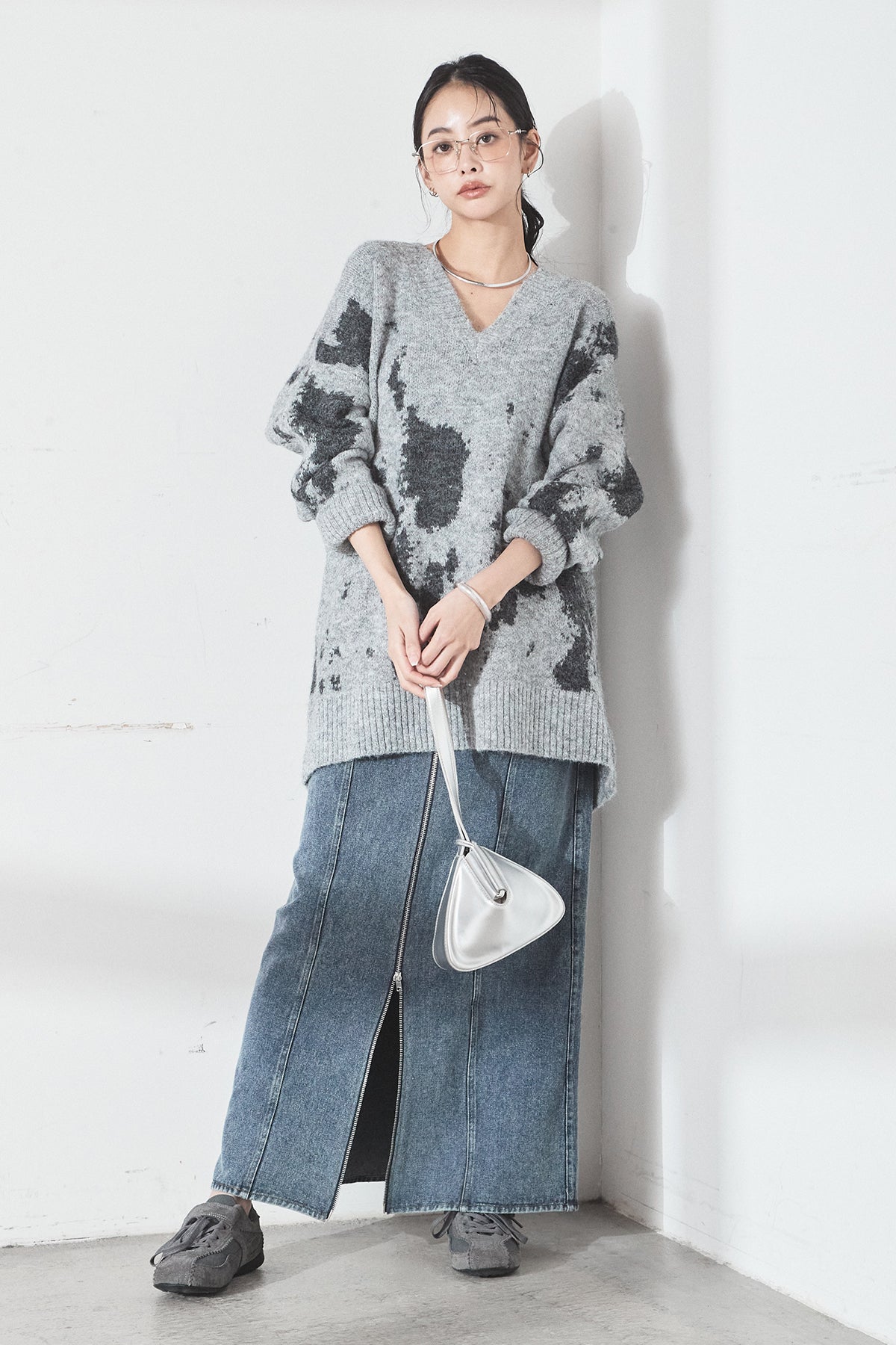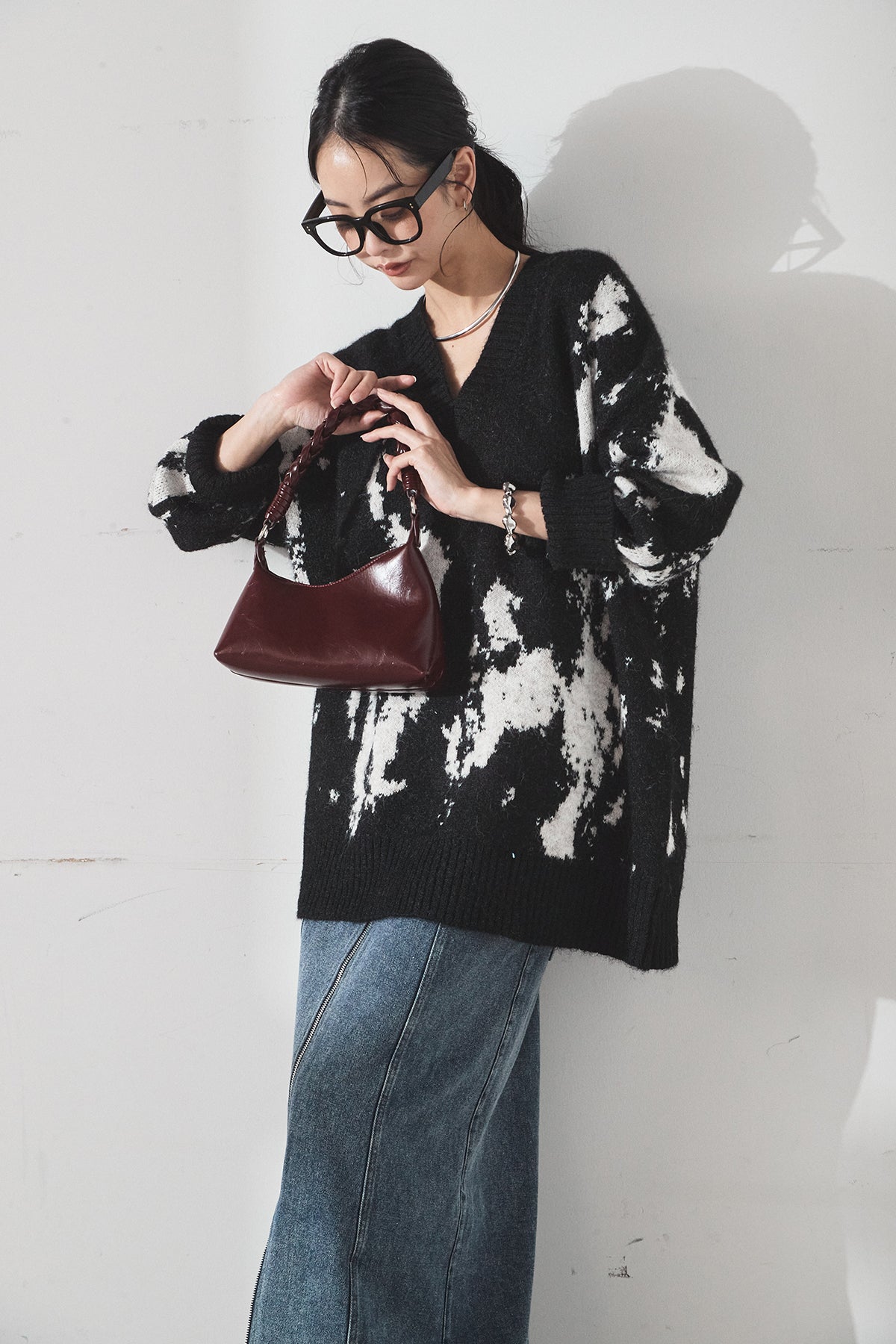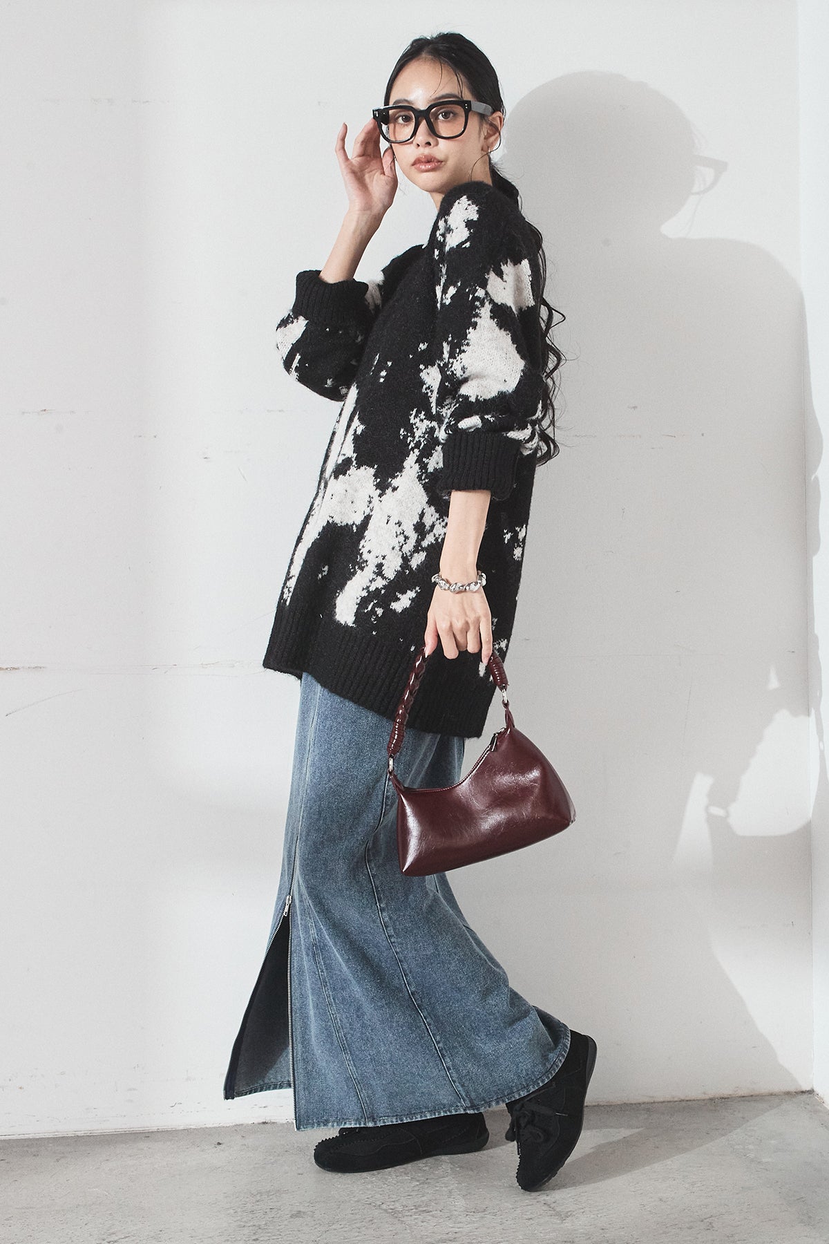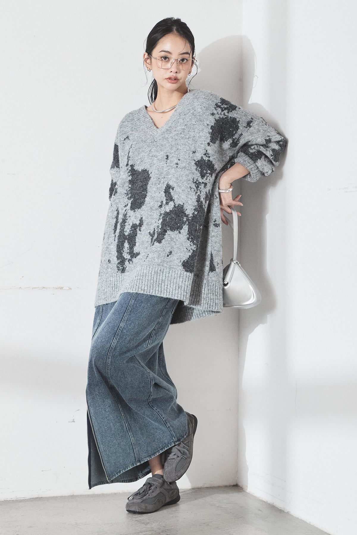 [SET]アブストラクト柄ニットプルオーバー+フロントジップデニムスカート(2set)