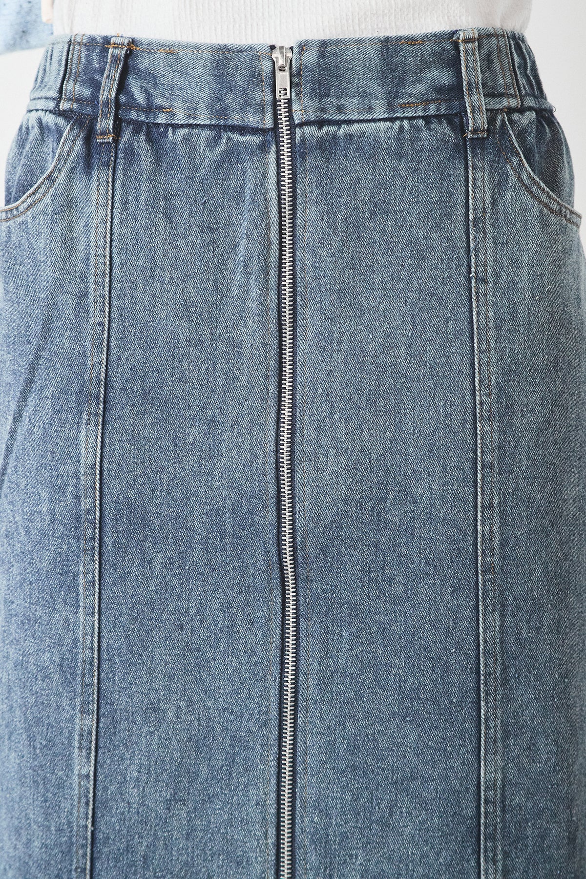 フロントに配したジップが縦ラインを強調する、デニム素材のスカート。シンプルなデザインにさりげないアクセントを加え、すっきりとした印象に仕上げています。程よい厚みのデニムでシーズンを問わず着用しやすく、トップスを選ばず合わせやすいのも魅力。カジュアルにもきれいめにも馴染む、デイリーに活躍する一枚です。
