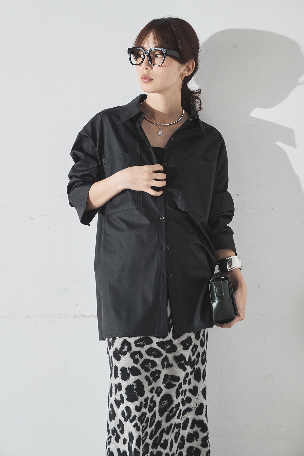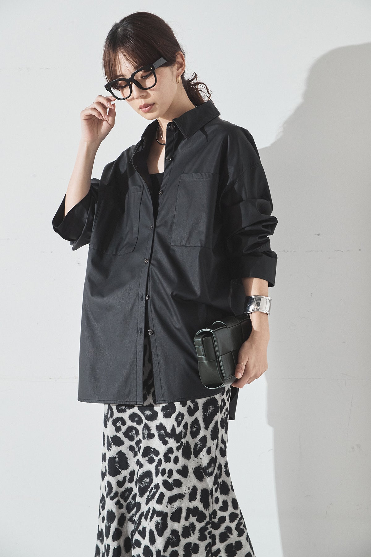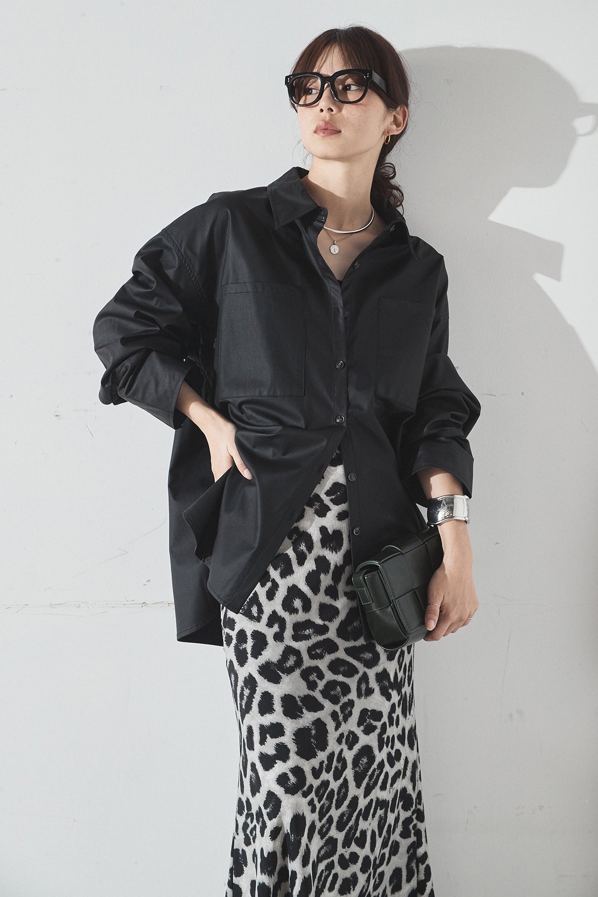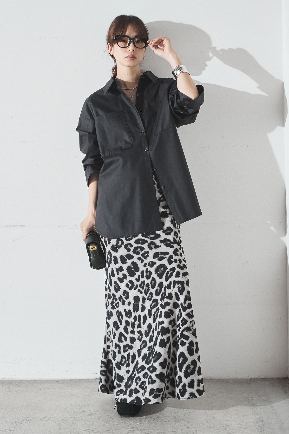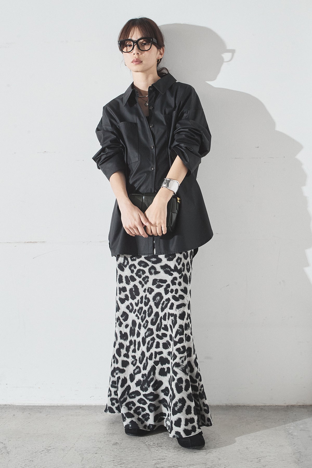 [SET]ウォッシャブルエコレザービックカフスシャツ+レオパードサテンナロースカート(2set)