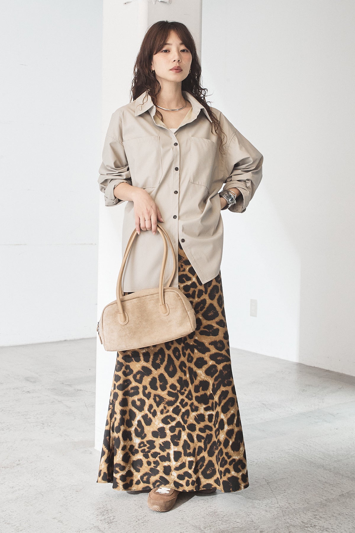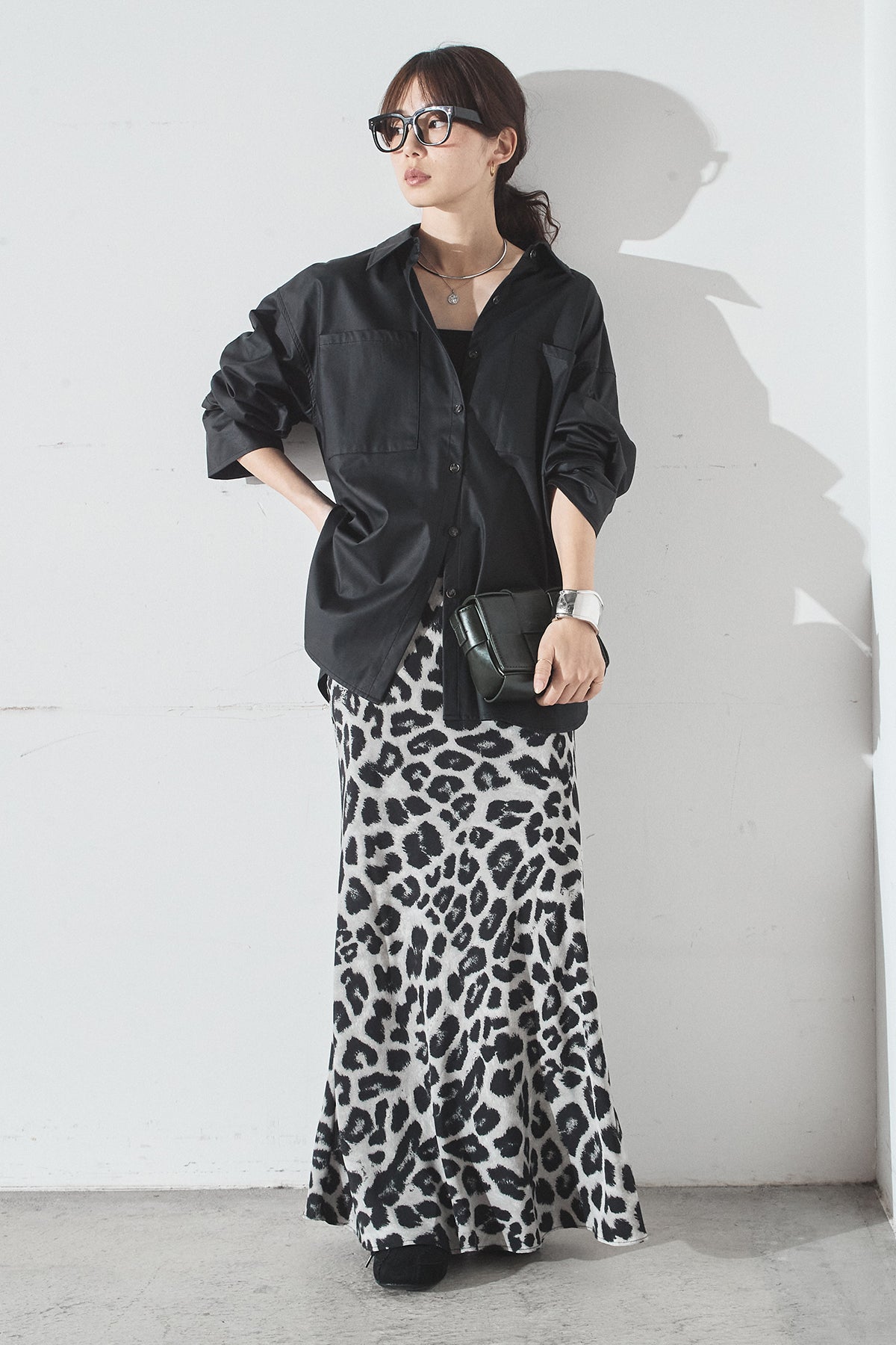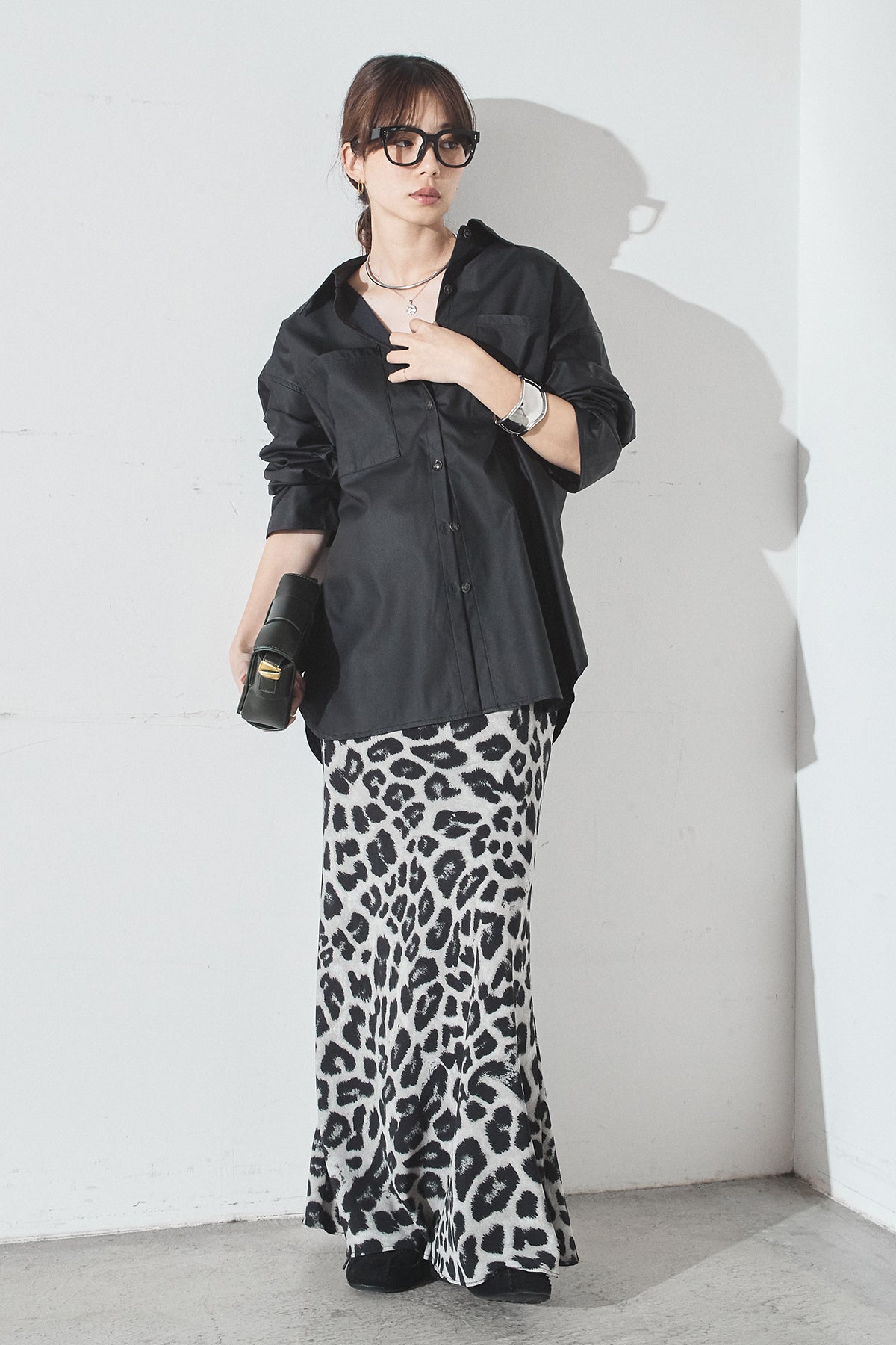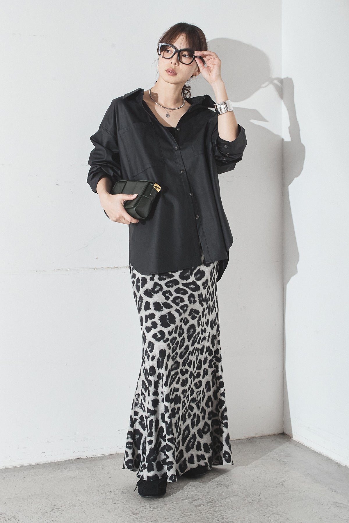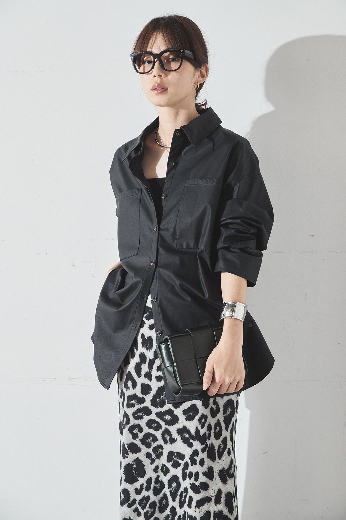 [SET]ウォッシャブルエコレザービックカフスシャツ+レオパードサテンナロースカート(2set)