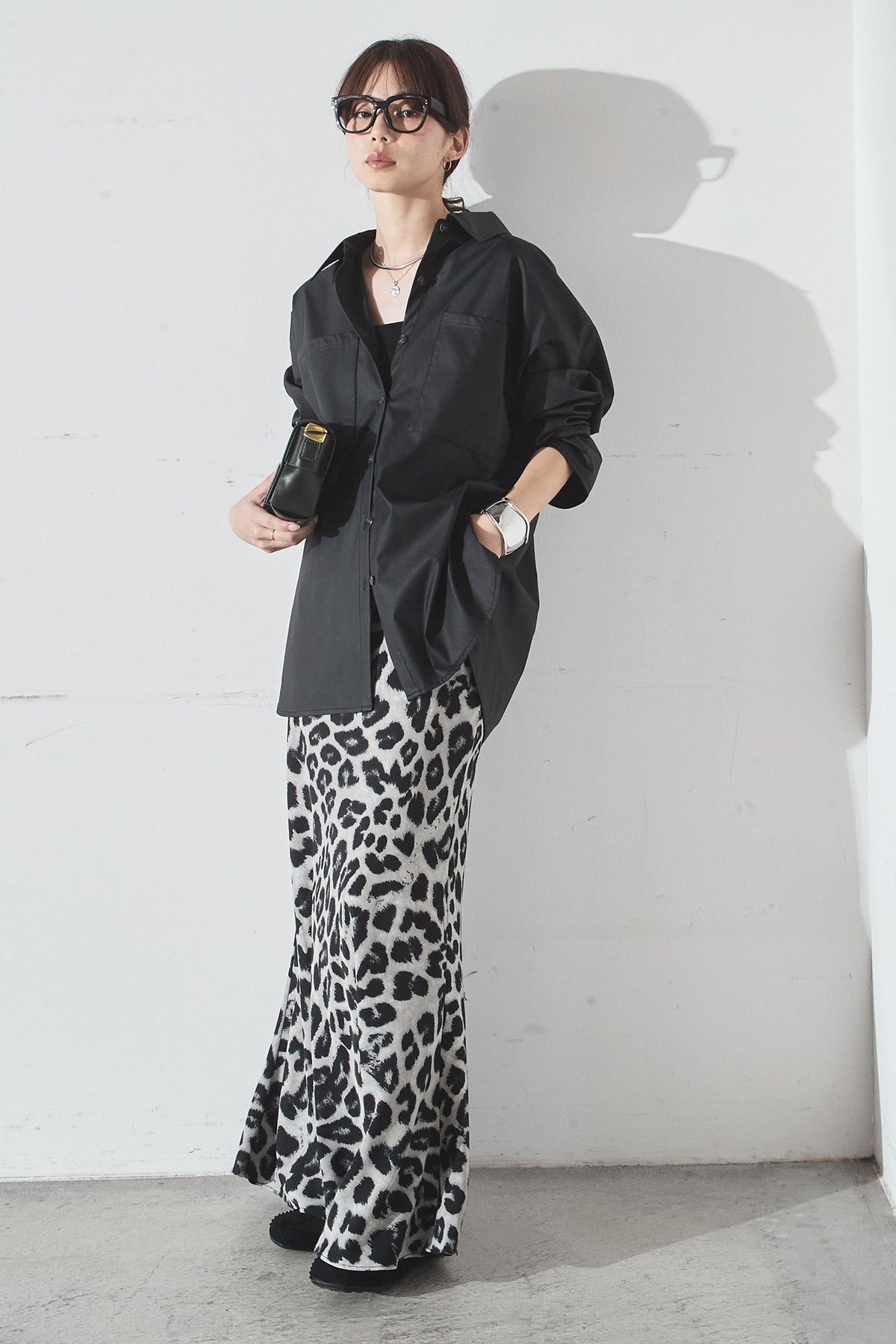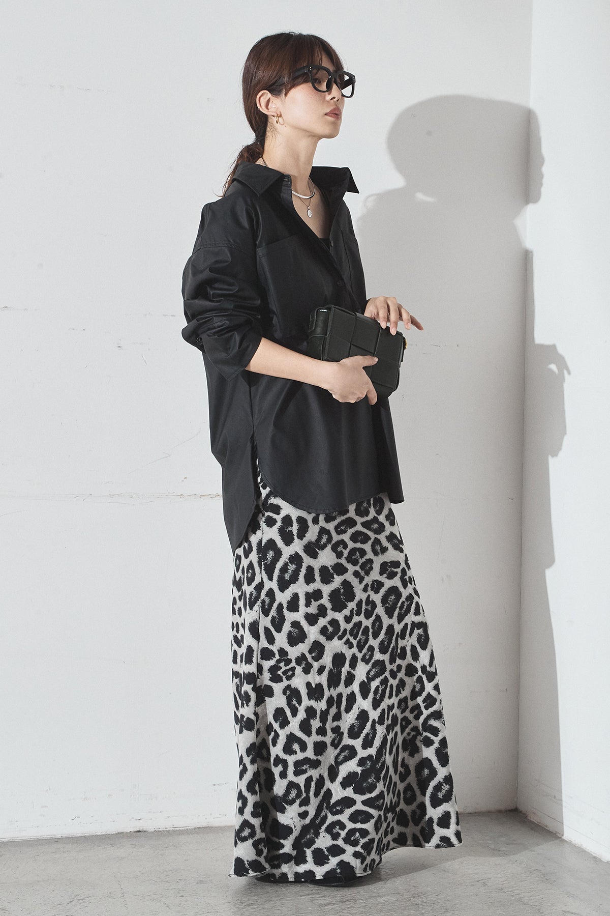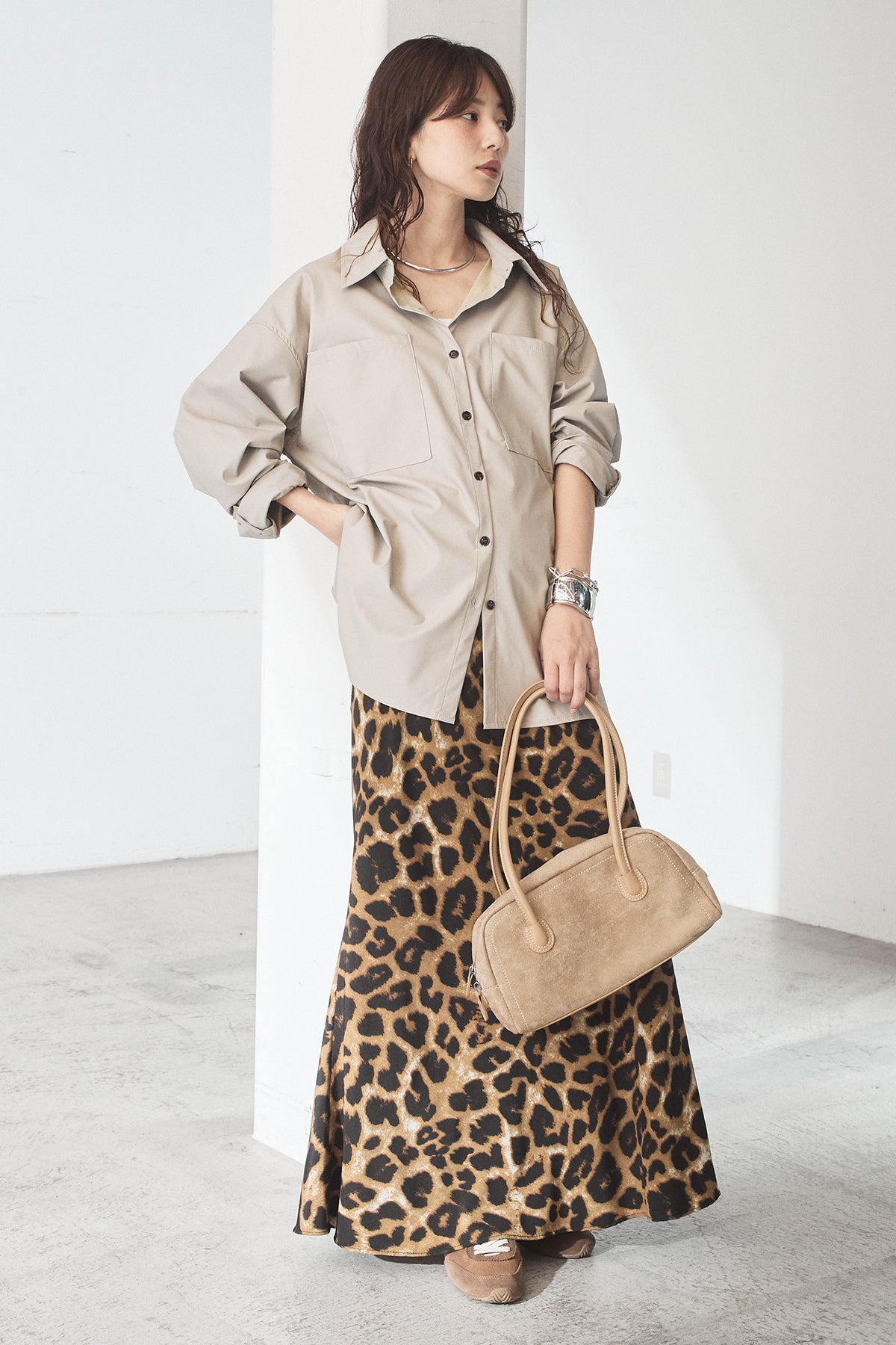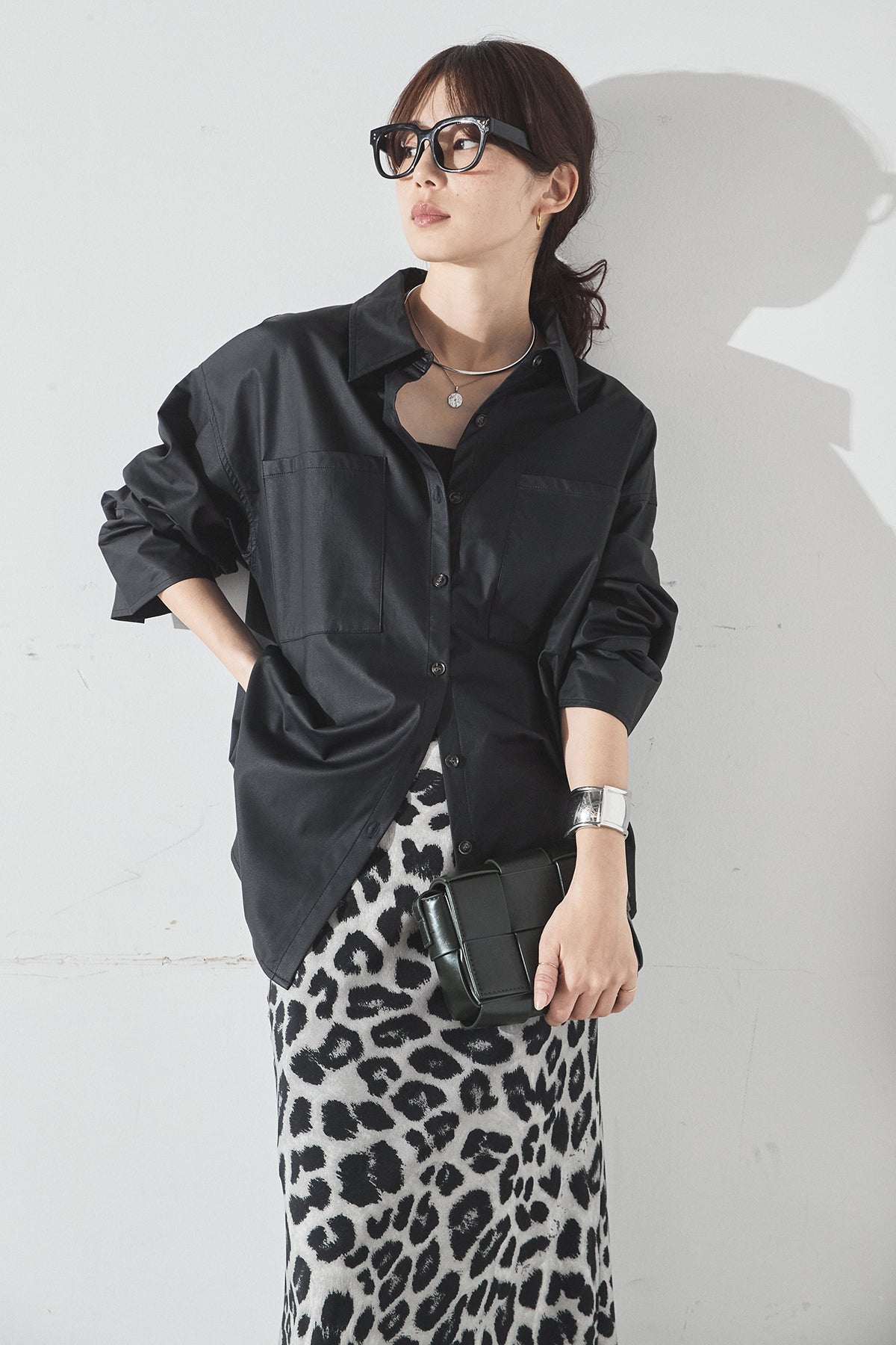 [SET]ウォッシャブルエコレザービックカフスシャツ+レオパードサテンナロースカート(2set)