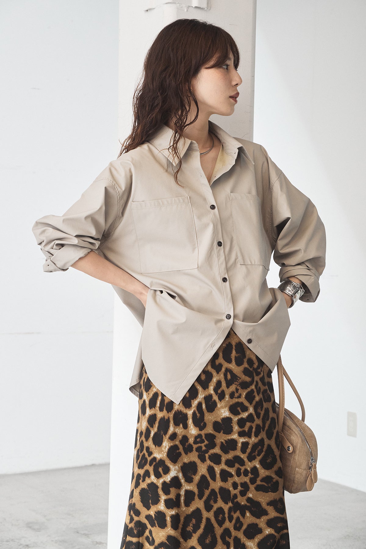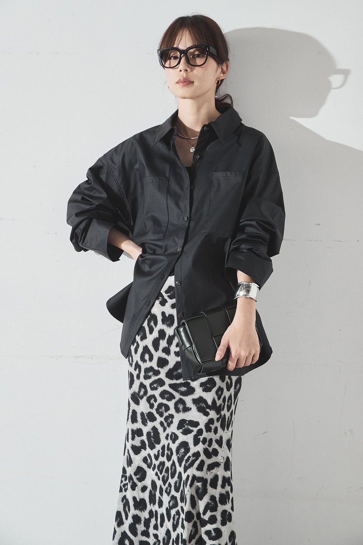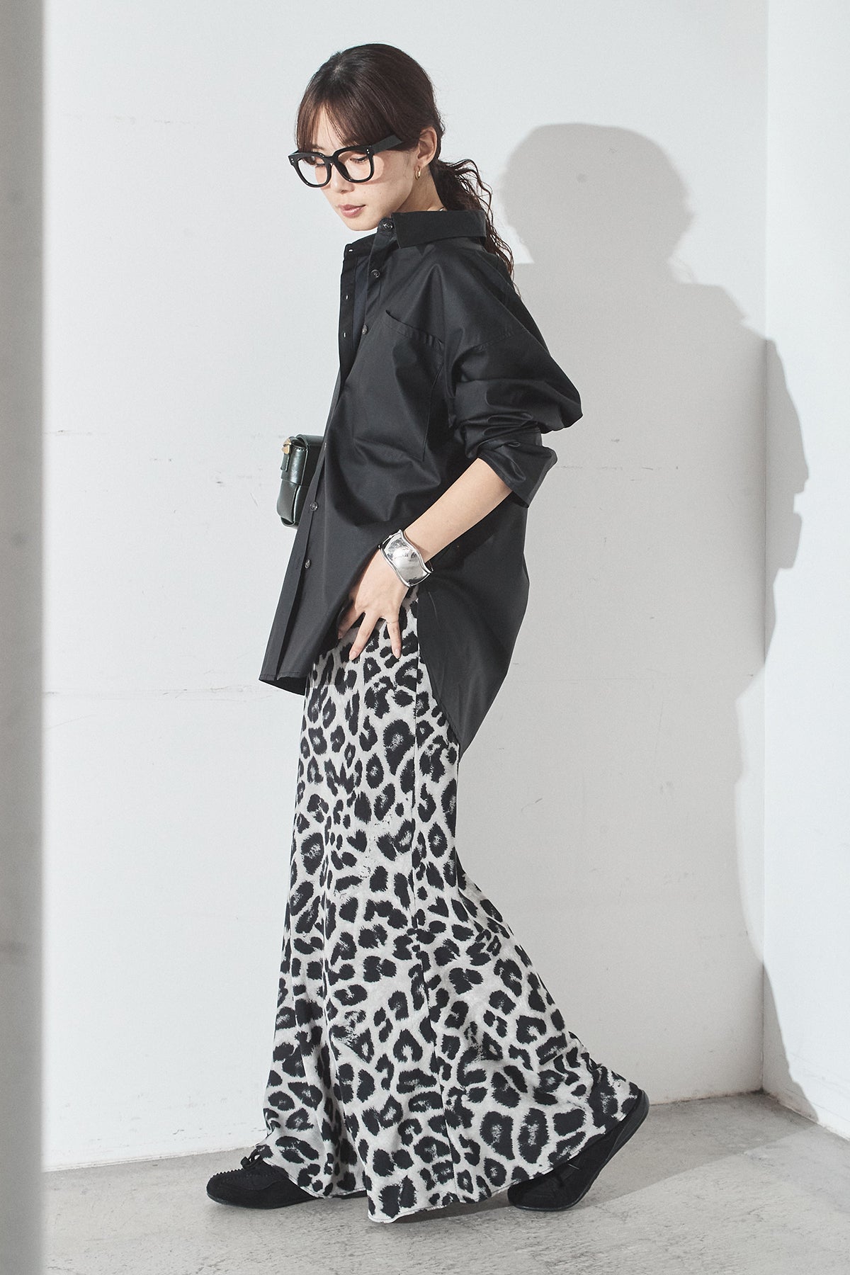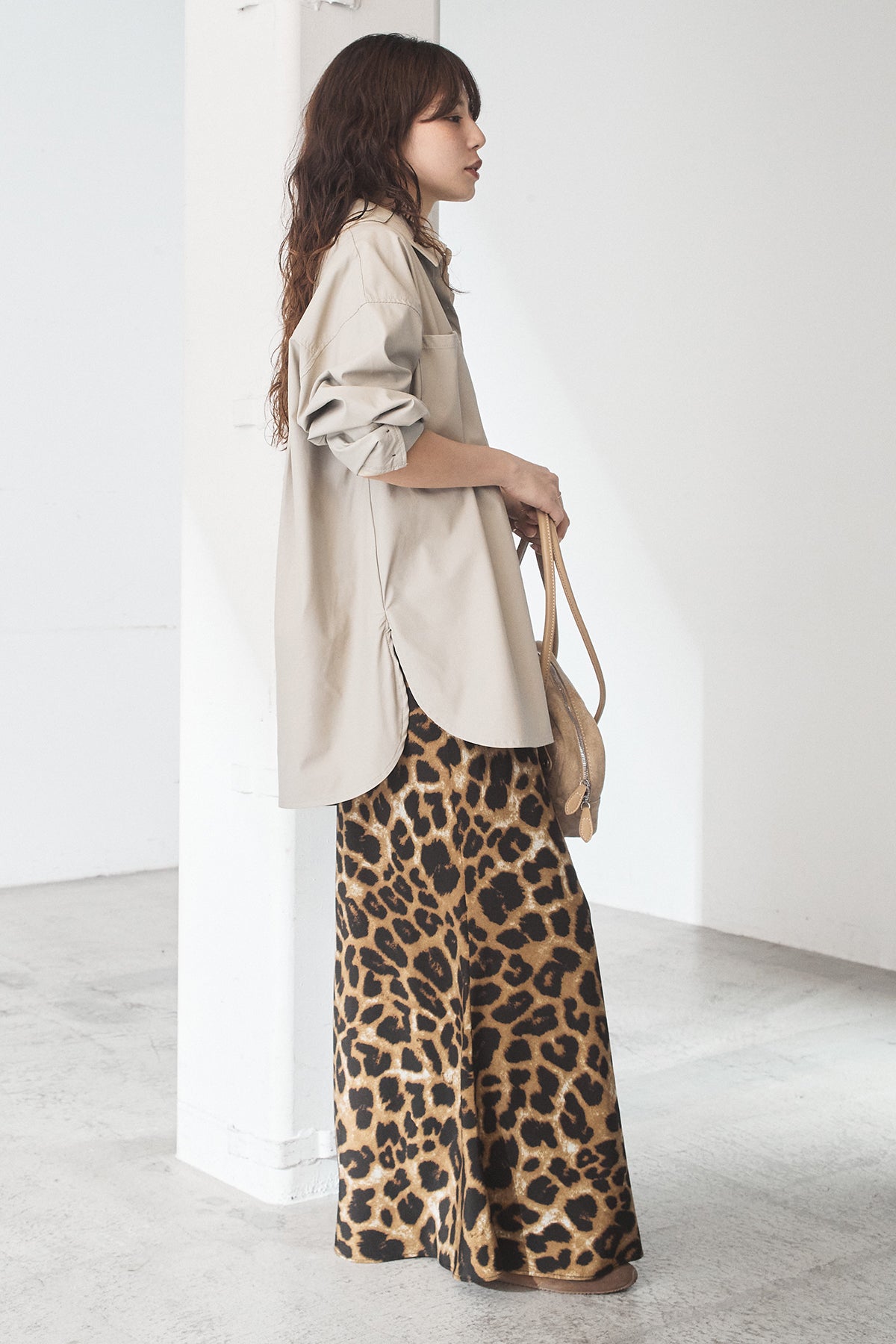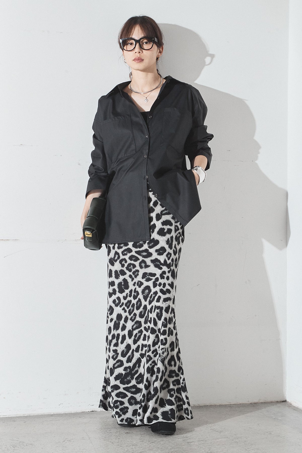 [SET]ウォッシャブルエコレザービックカフスシャツ+レオパードサテンナロースカート(2set)