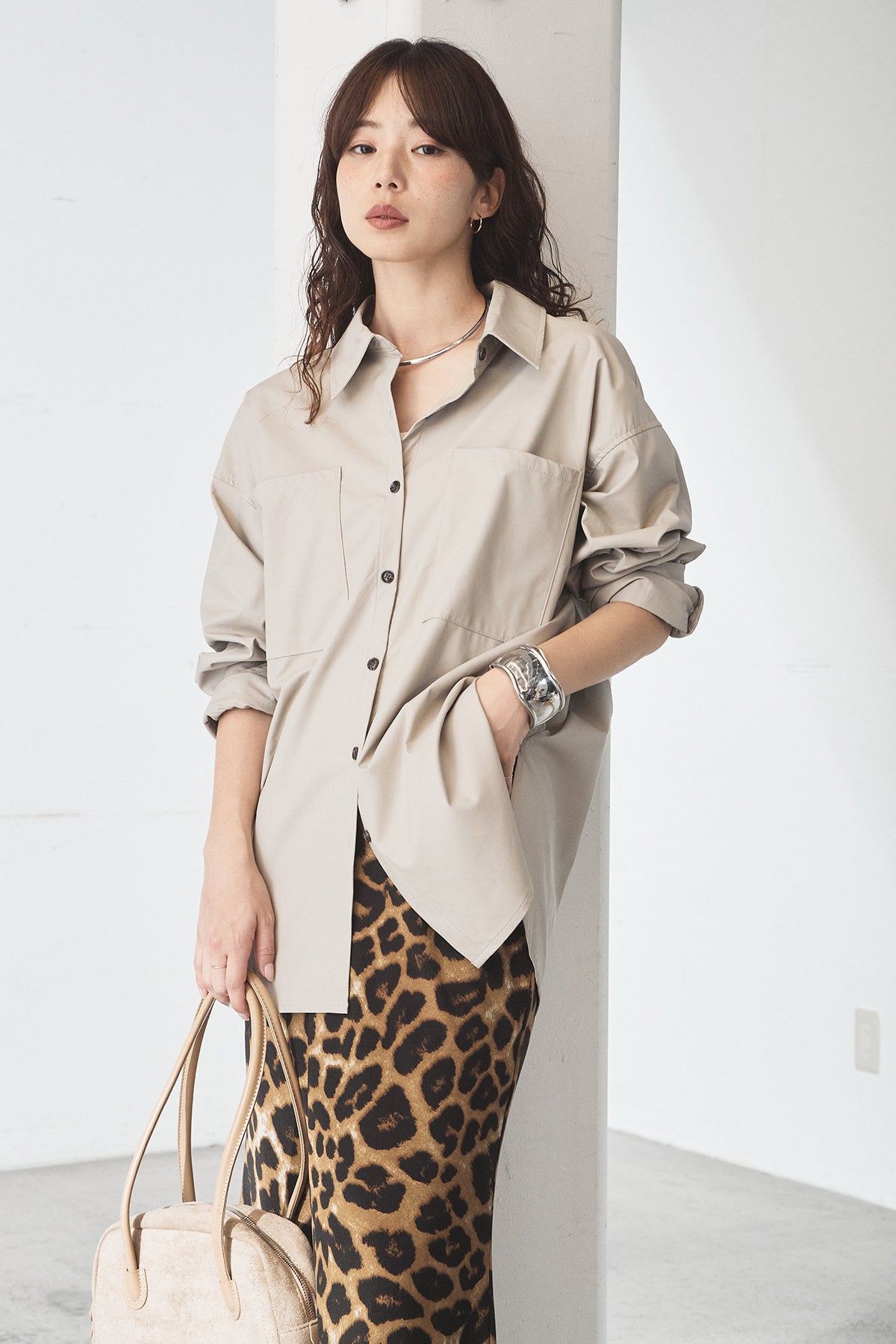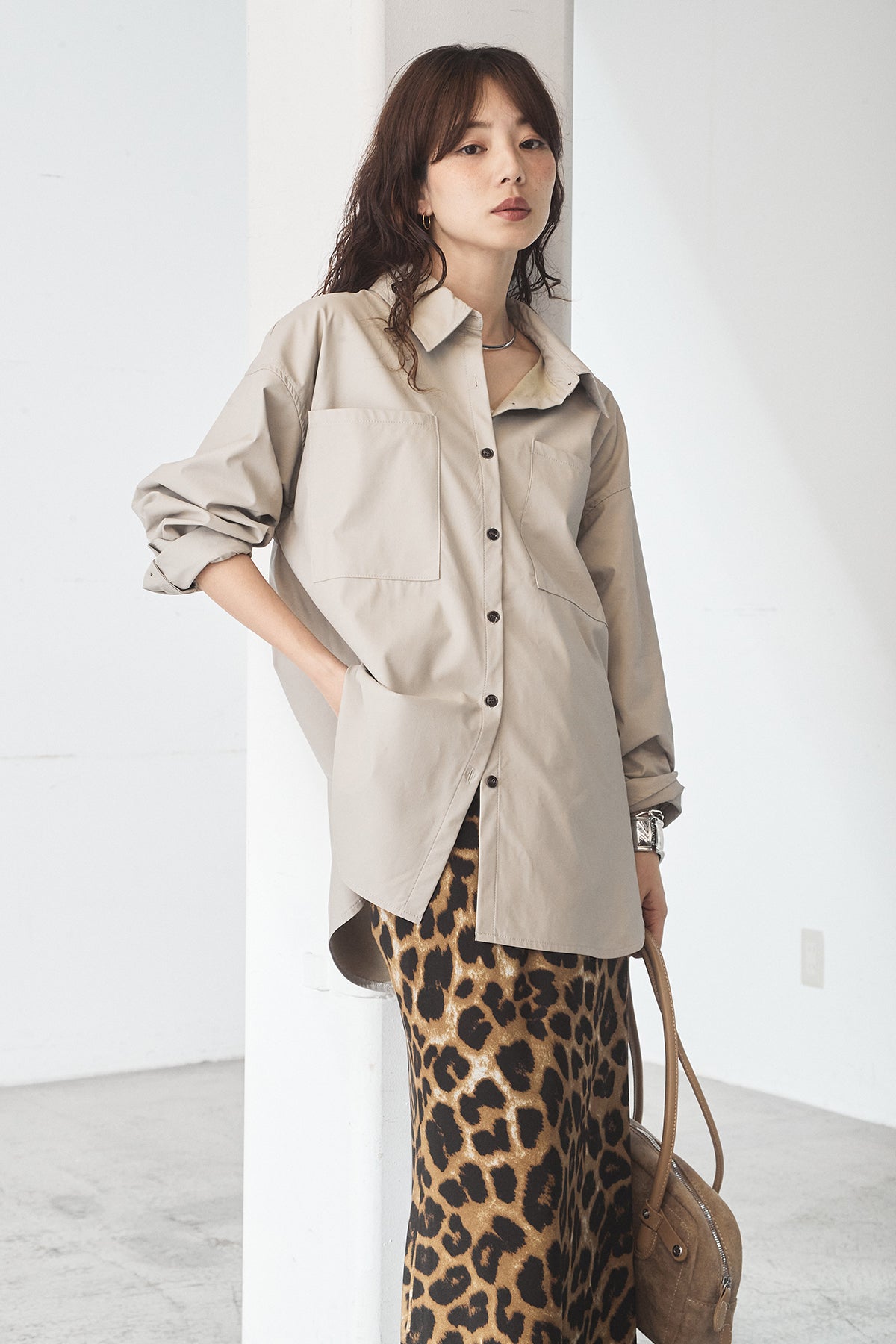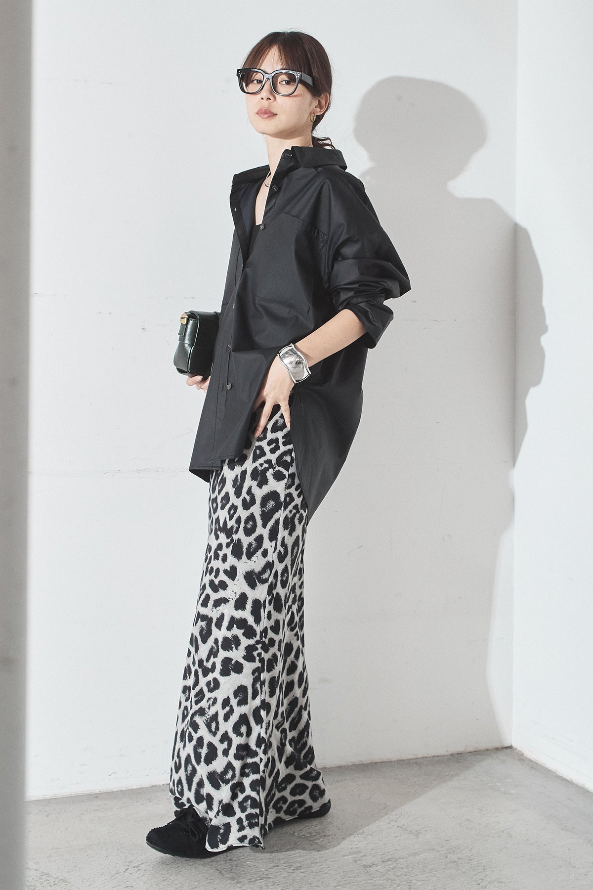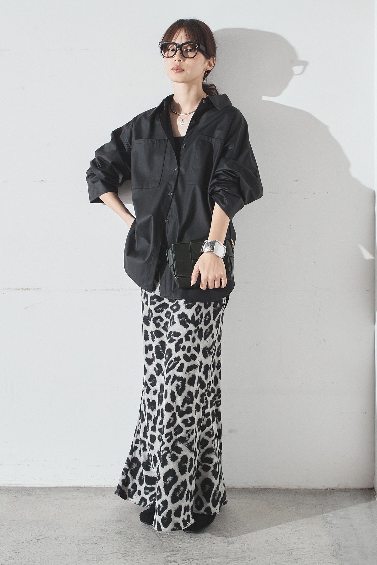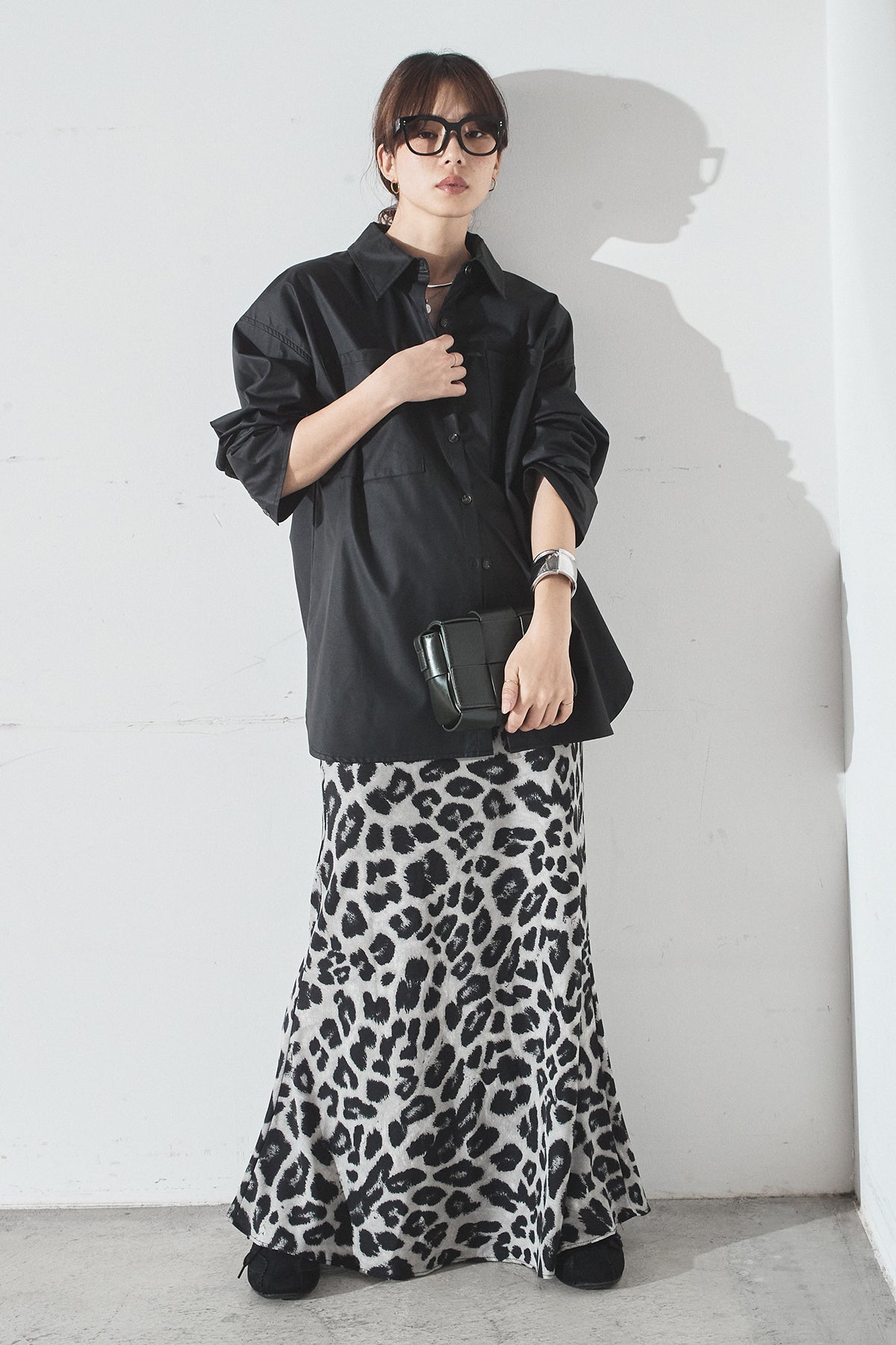 [SET]ウォッシャブルエコレザービックカフスシャツ+レオパードサテンナロースカート(2set)