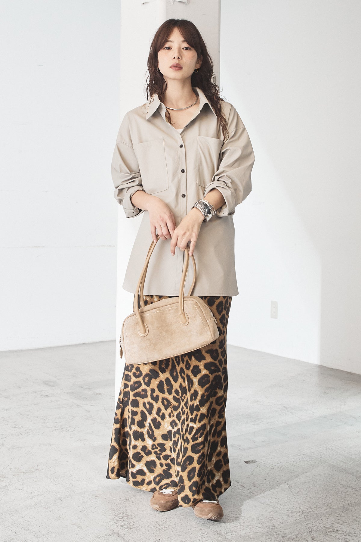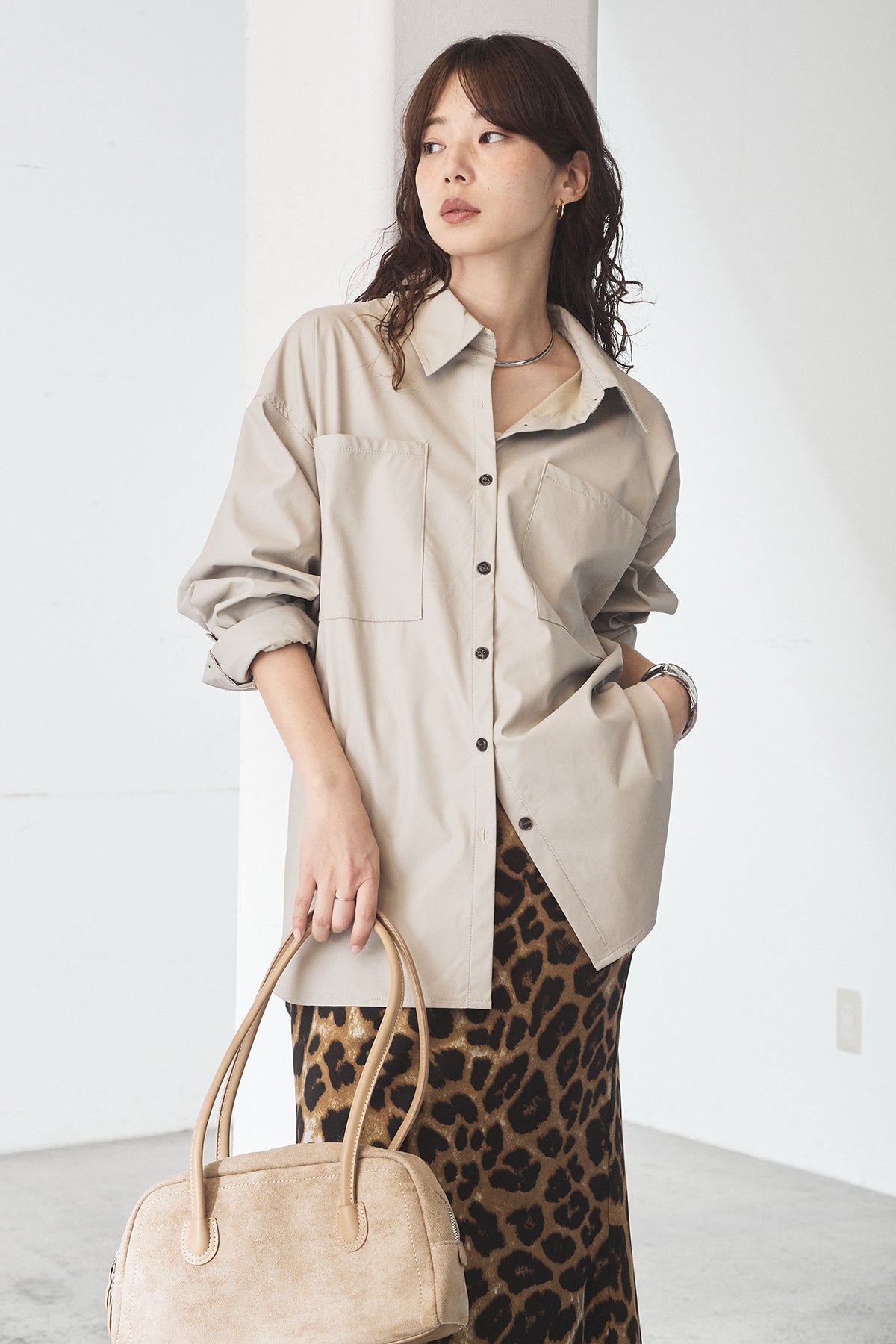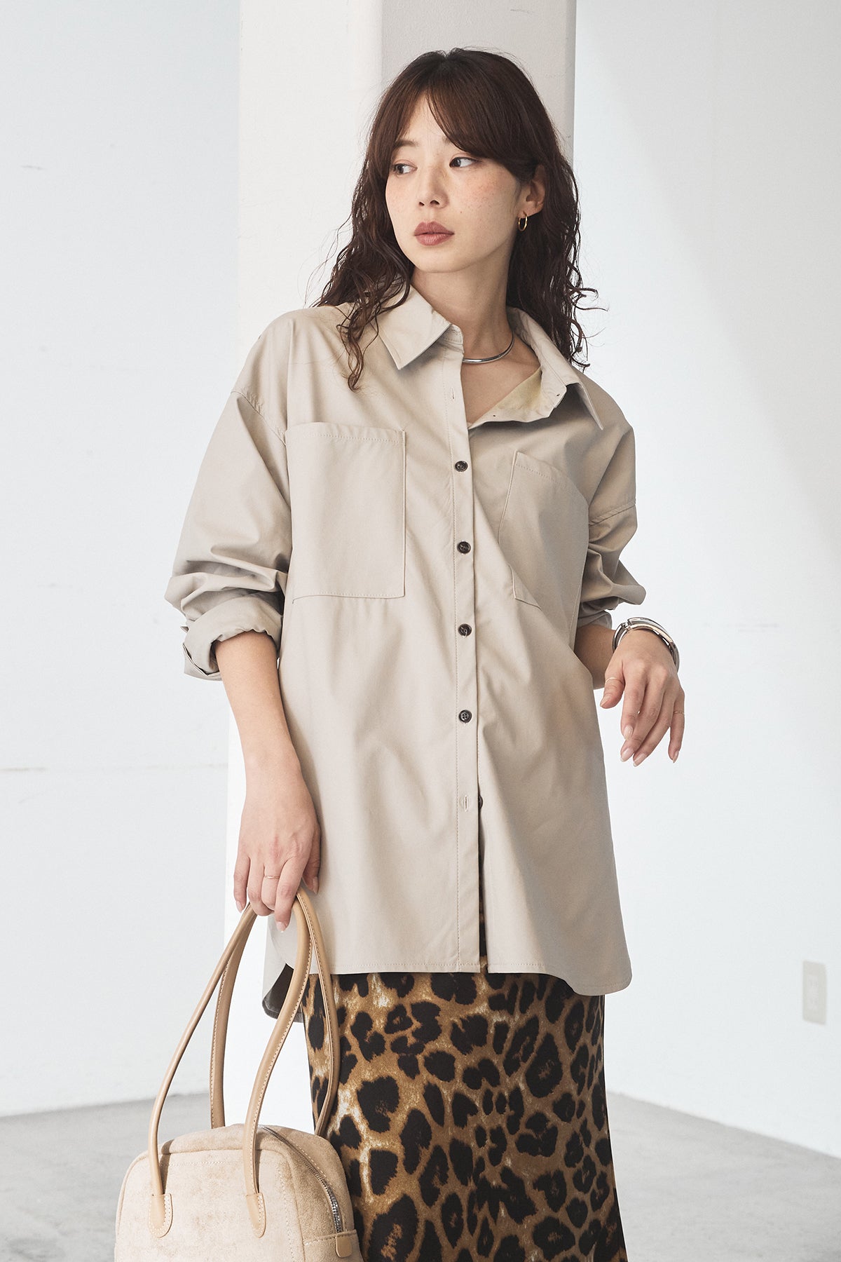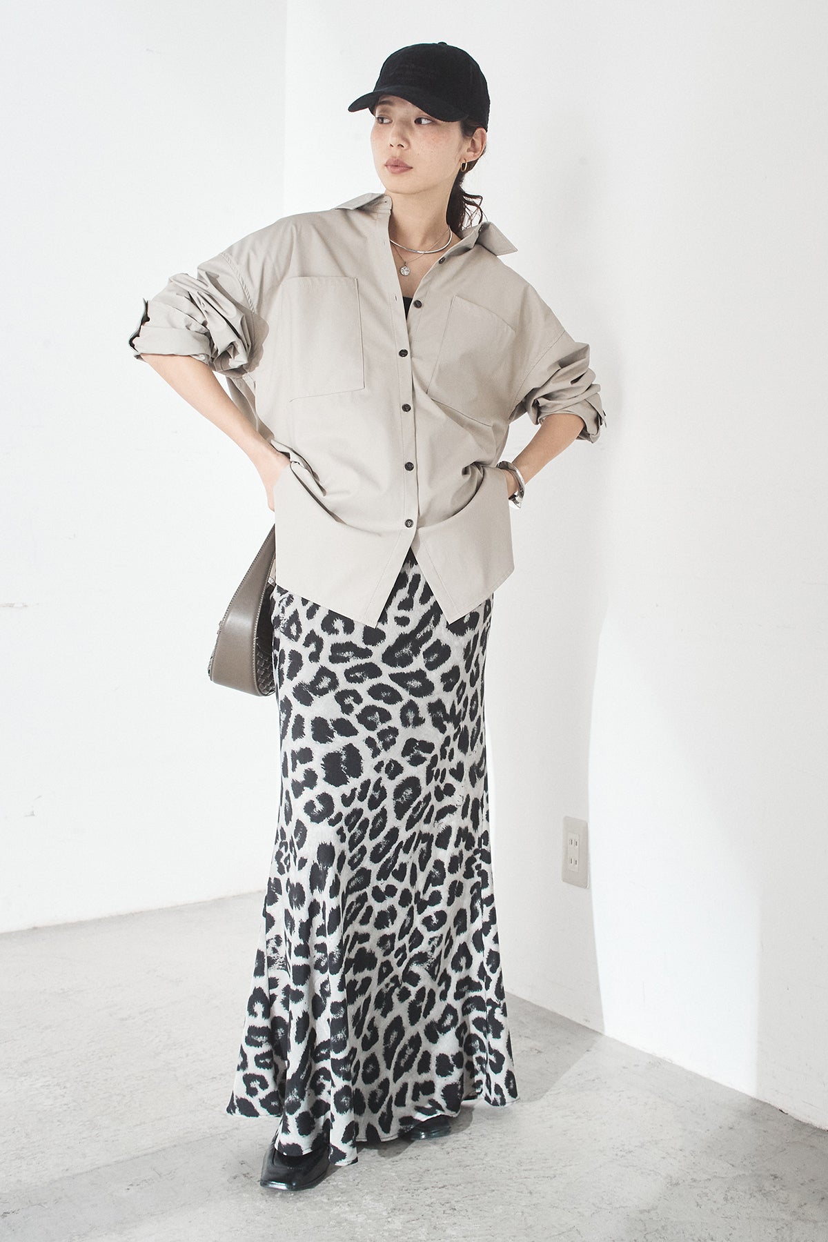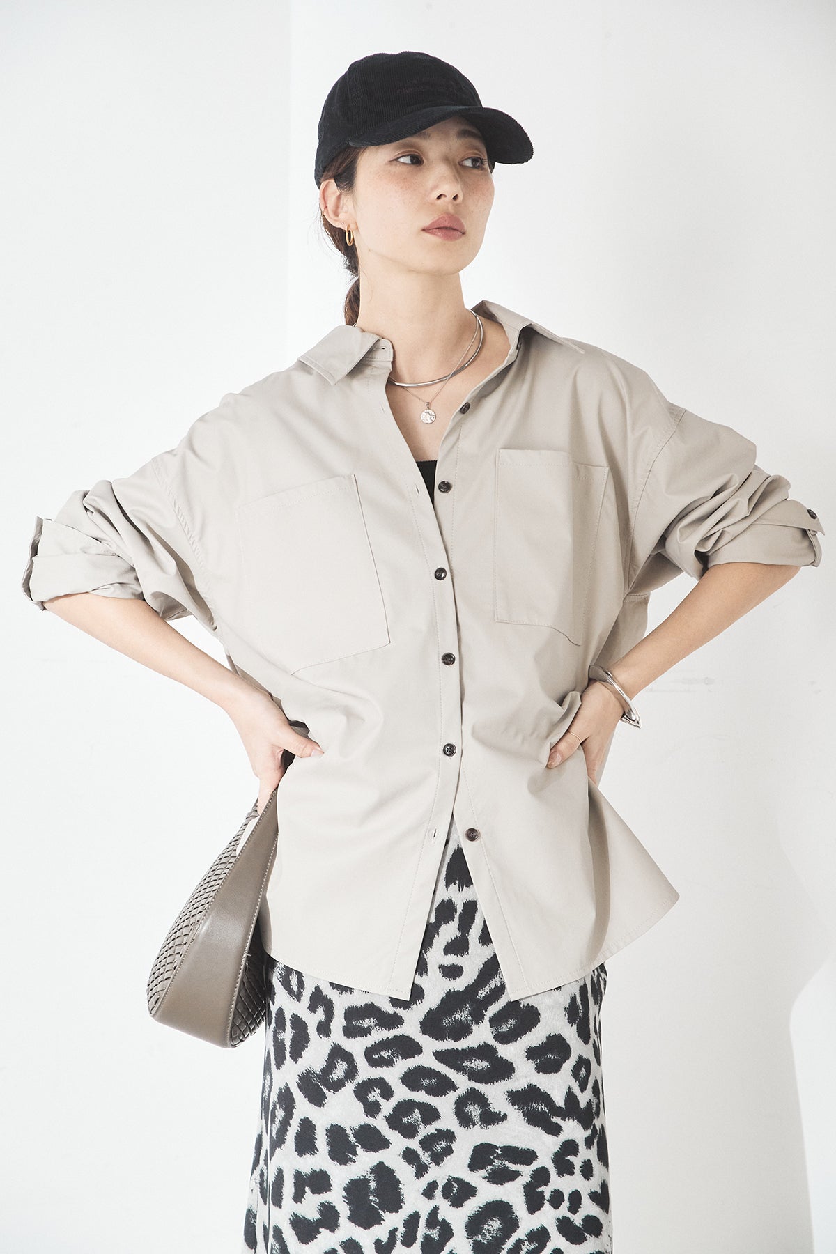 [SET]ウォッシャブルエコレザービックカフスシャツ+レオパードサテンナロースカート(2set)