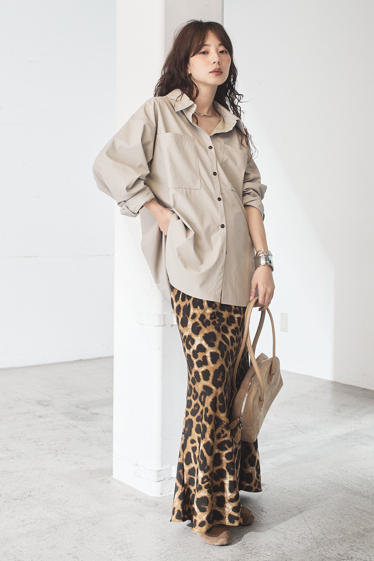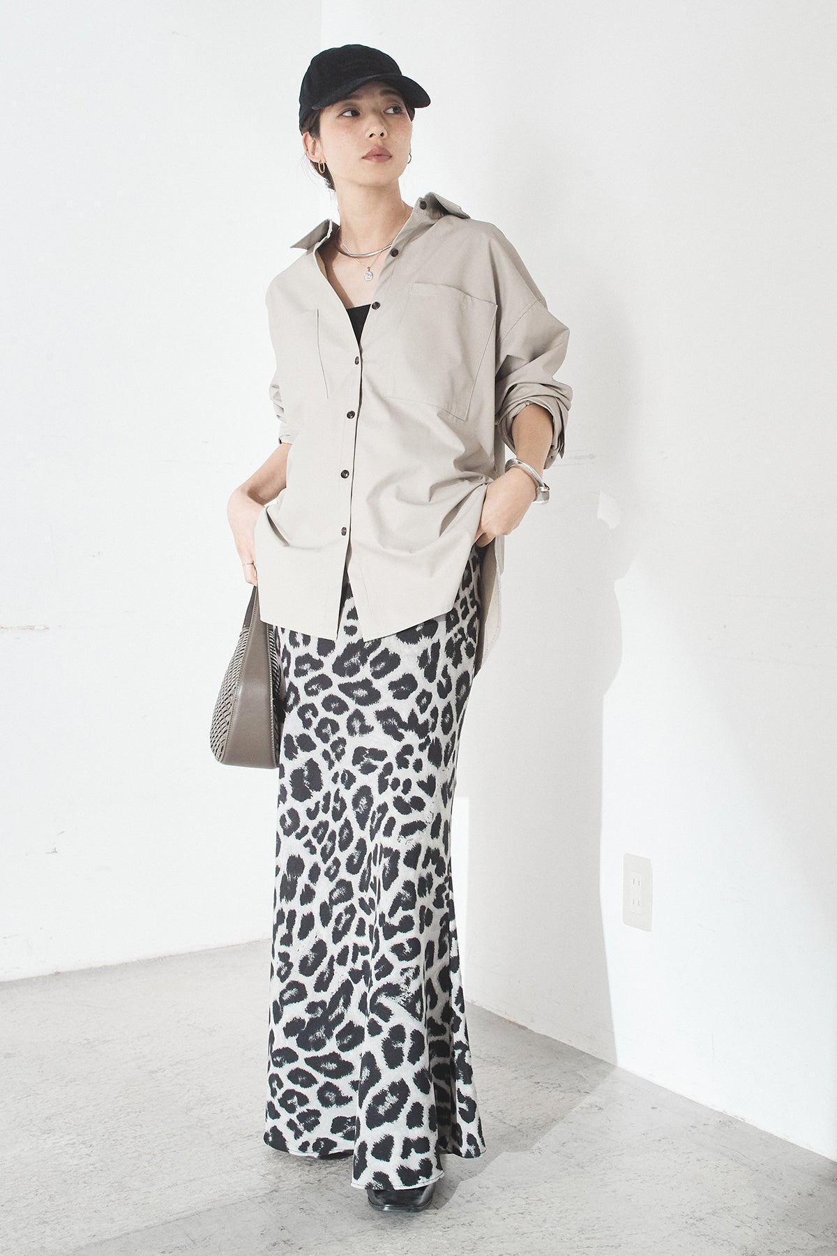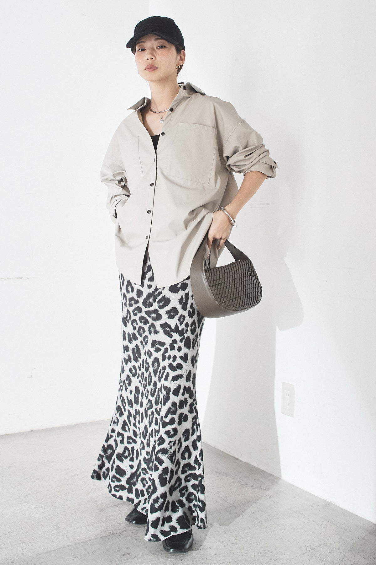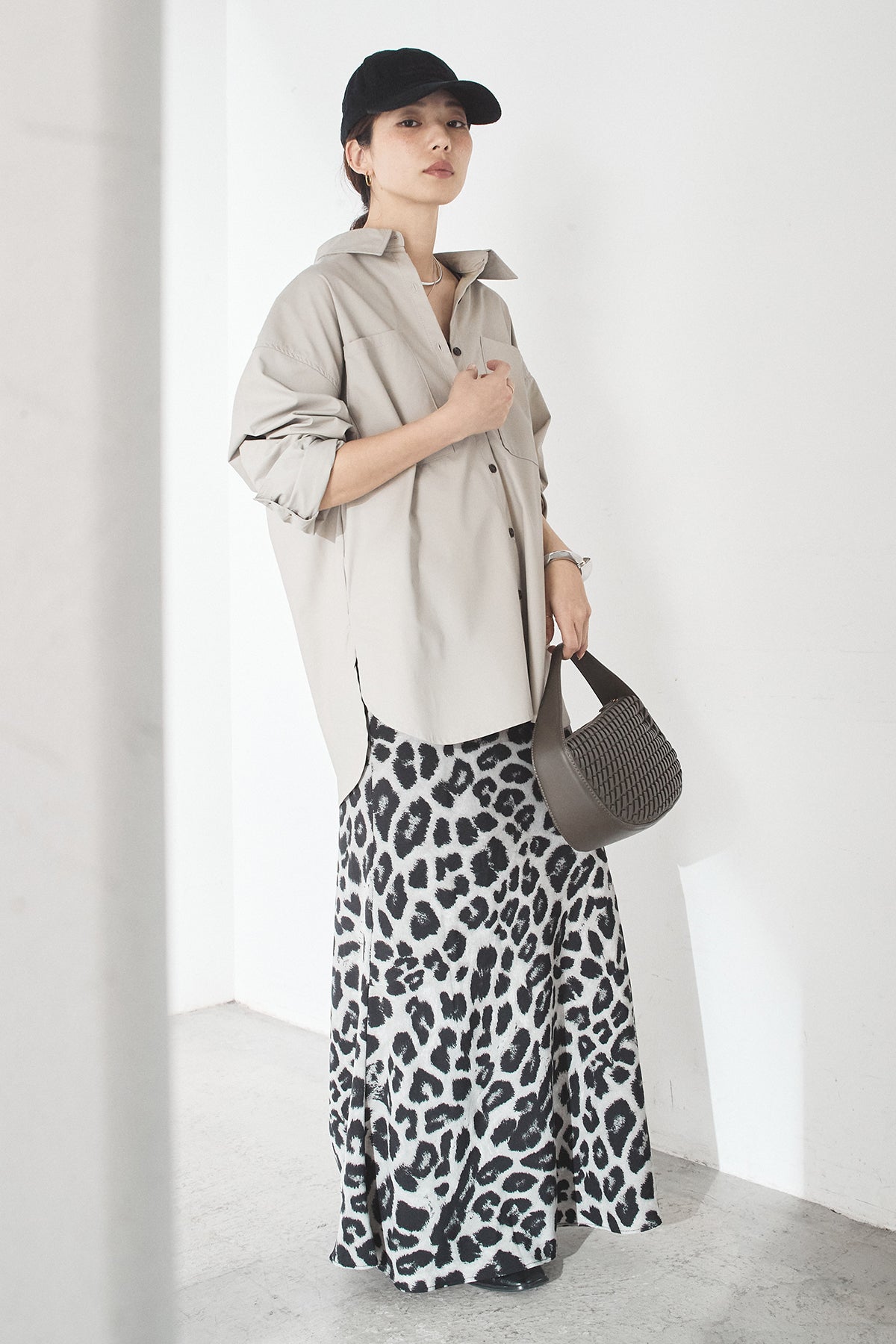[SET]ウォッシャブルエコレザービックカフスシャツ+レオパードサテンナロースカート(2set)