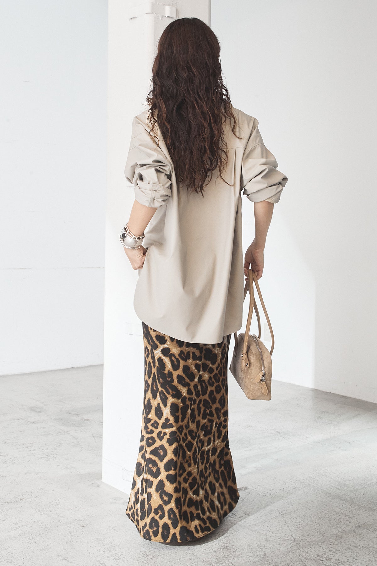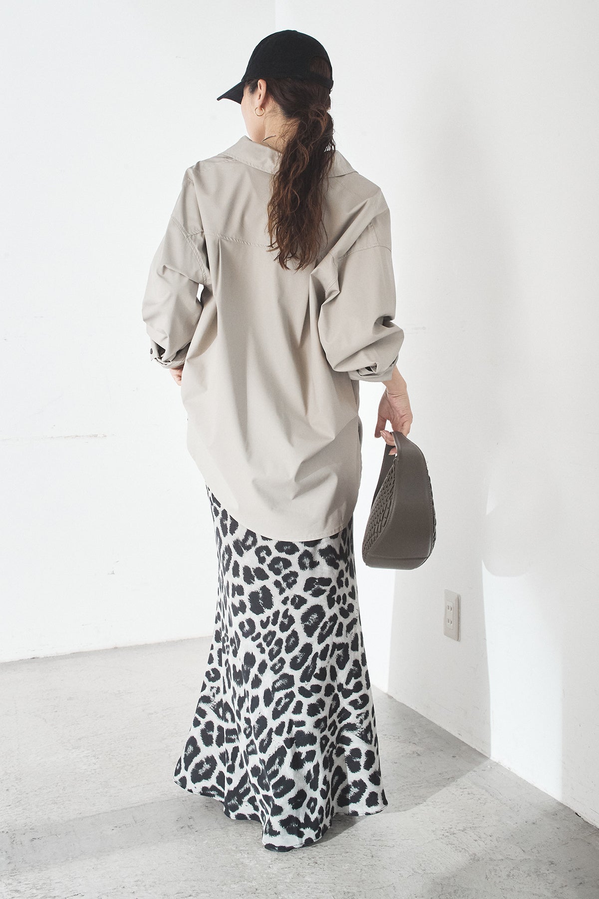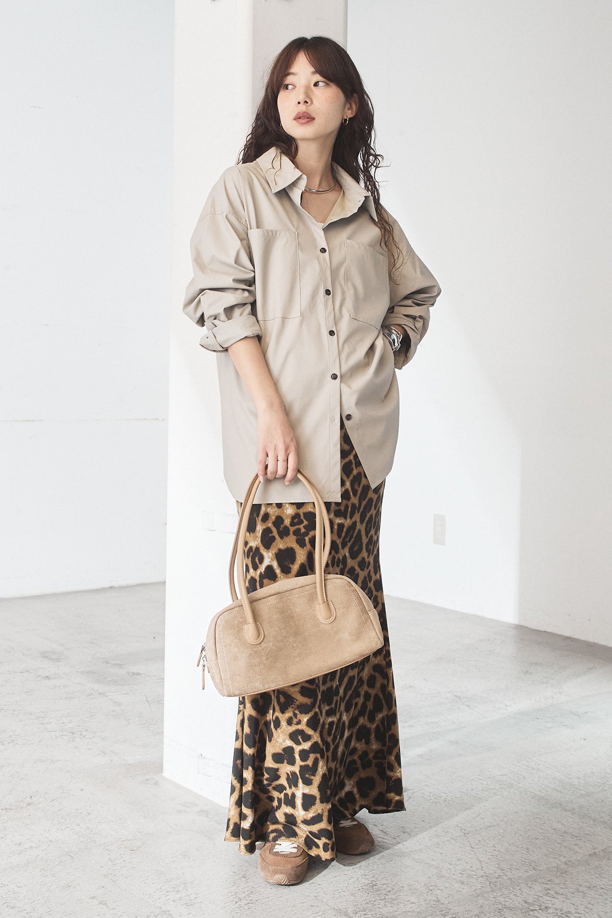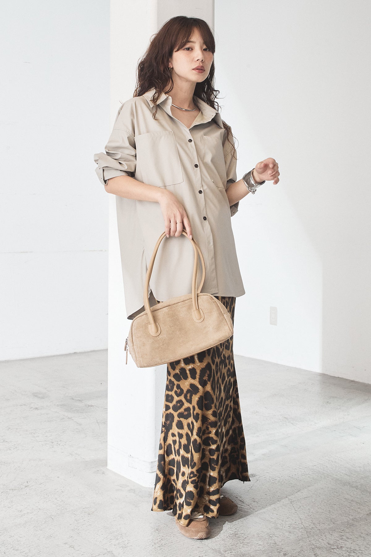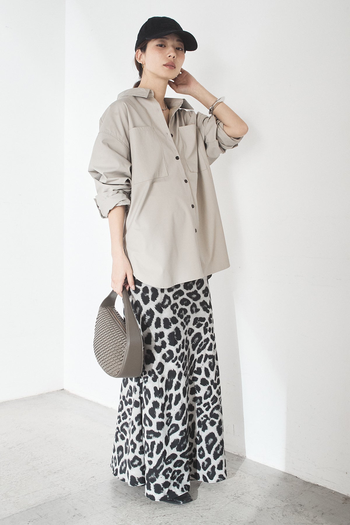 [SET]ウォッシャブルエコレザービックカフスシャツ+レオパードサテンナロースカート(2set)