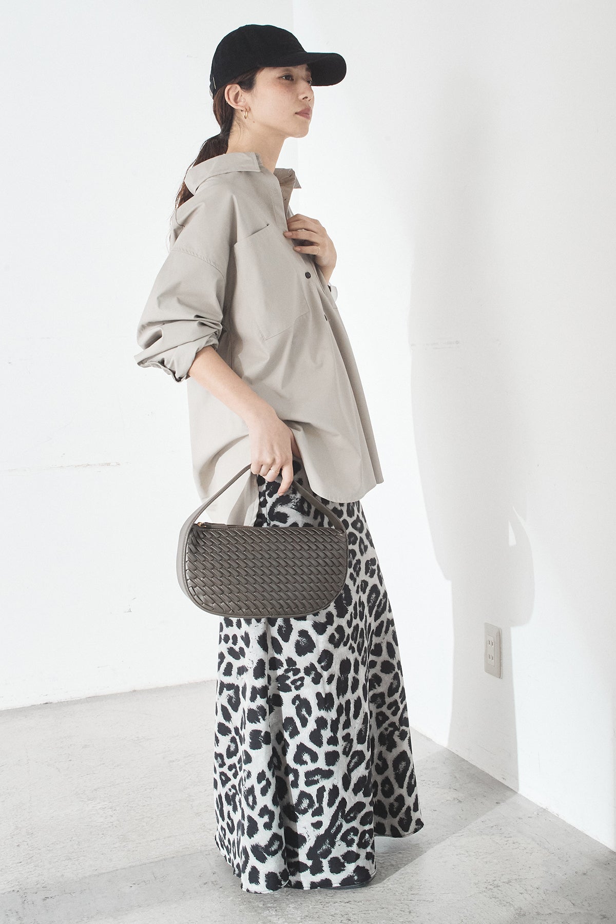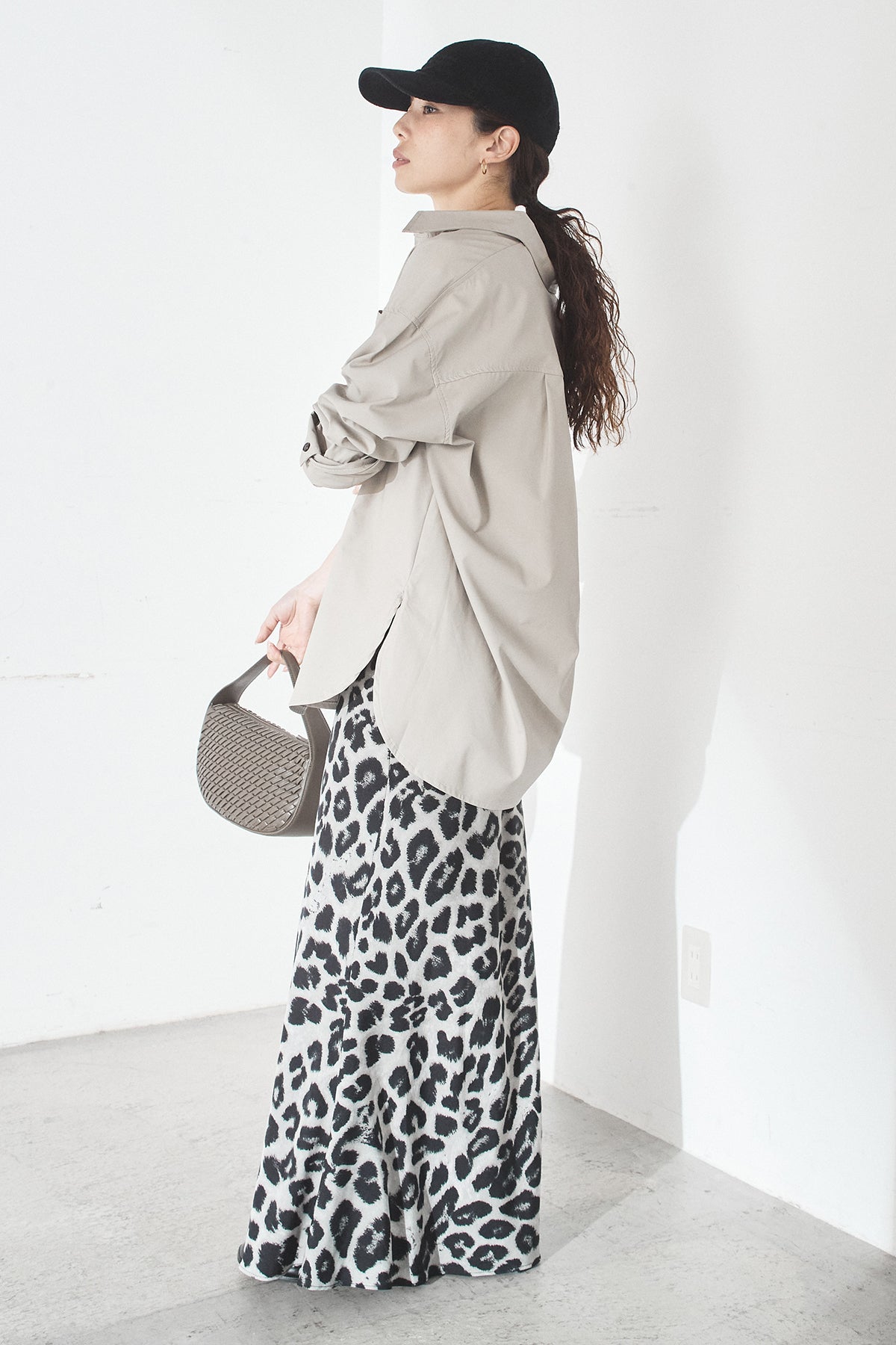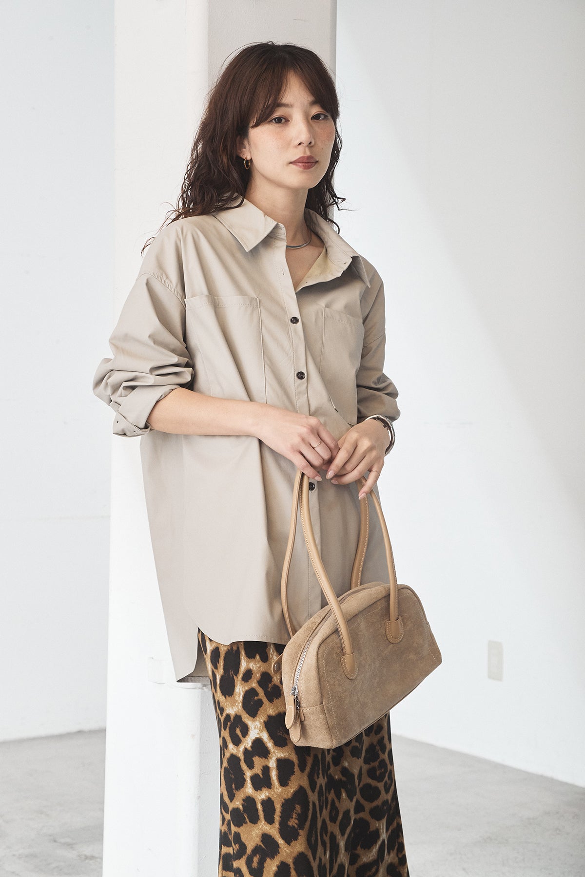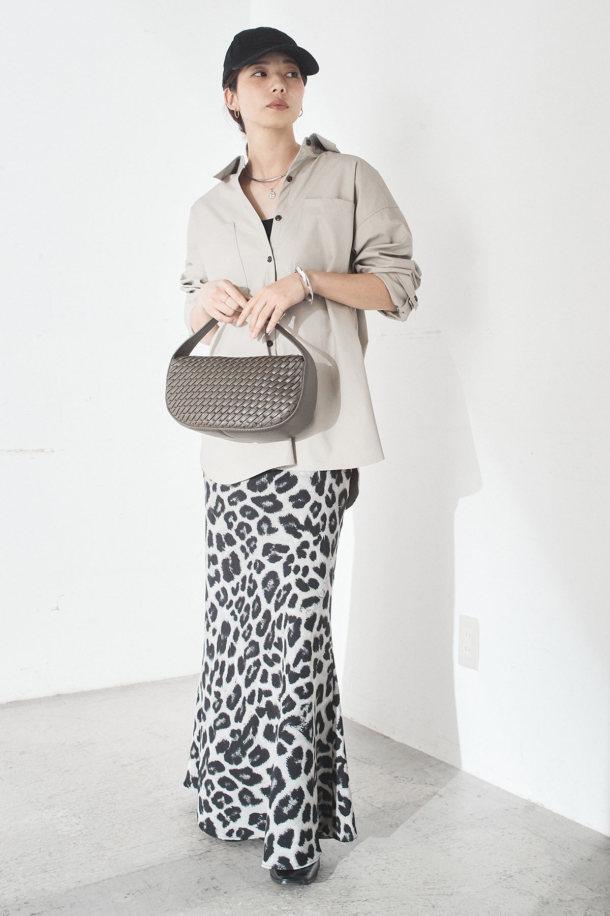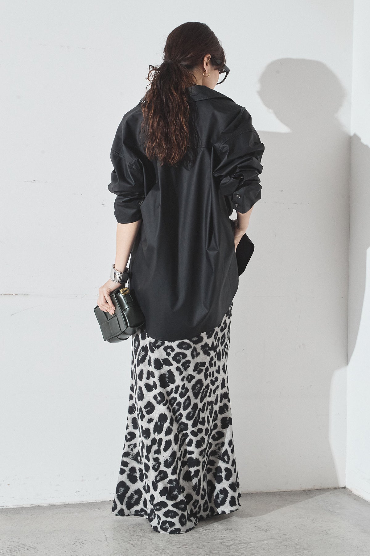 [SET]ウォッシャブルエコレザービックカフスシャツ+レオパードサテンナロースカート(2set)