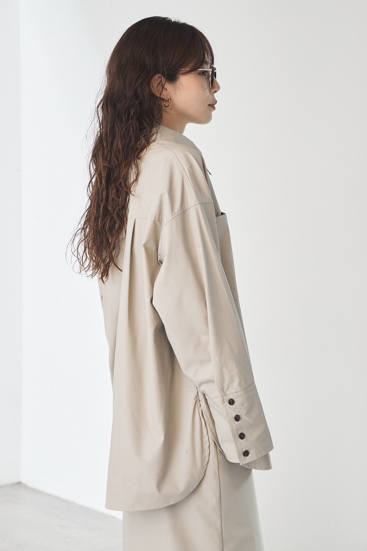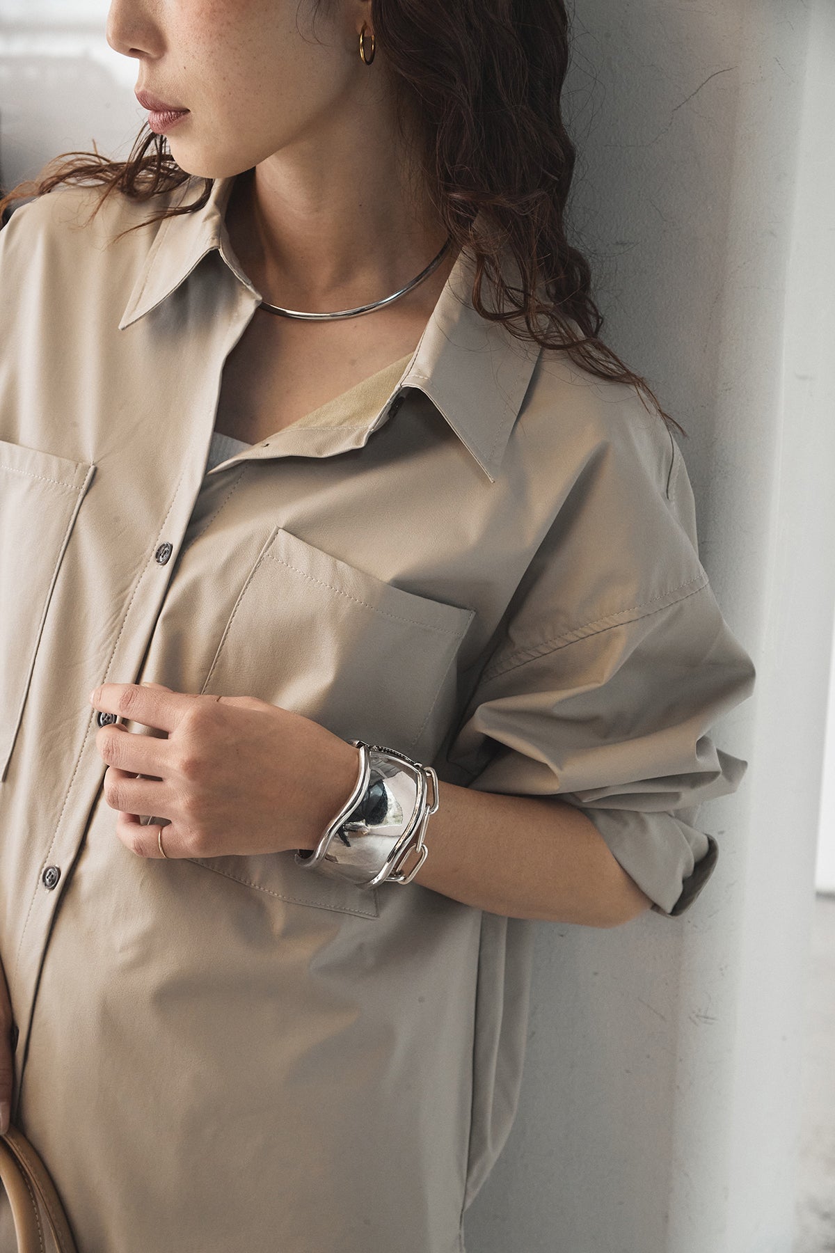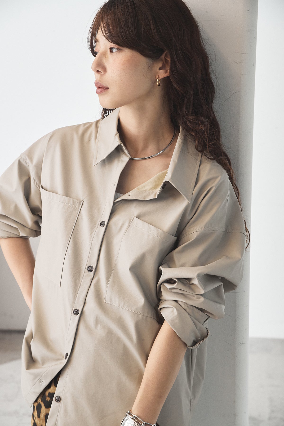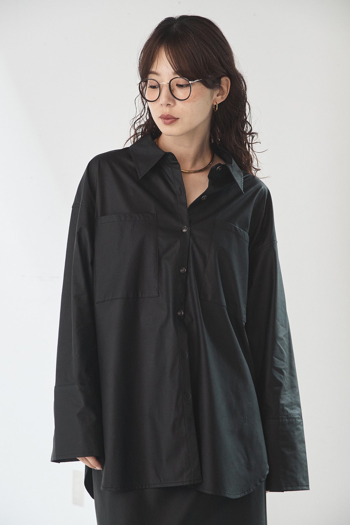 ウォッシャブル仕様のエコレザー素材を使用した、ビッグカフスデザインが特徴のシャツ。程よいハリとマットな質感が、カジュアルすぎず洗練された印象を演出します。ゆったりとしたシルエットに大きめのカフスを合わせることで、さりげなくモード感をプラス。一枚で着映えするのはもちろん、羽織りとしても活躍し、幅広いスタイリングに取り入れやすいアイテムです。