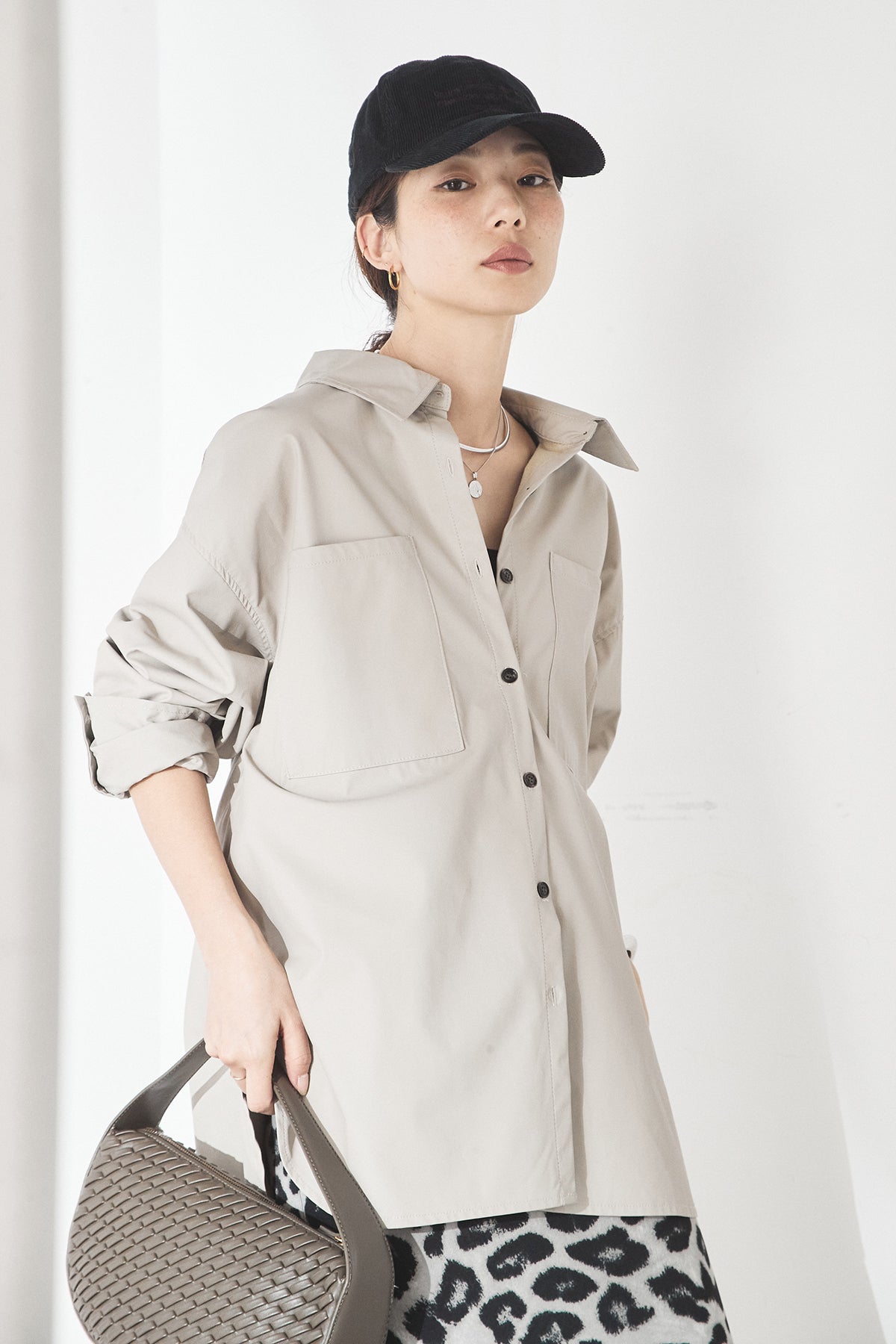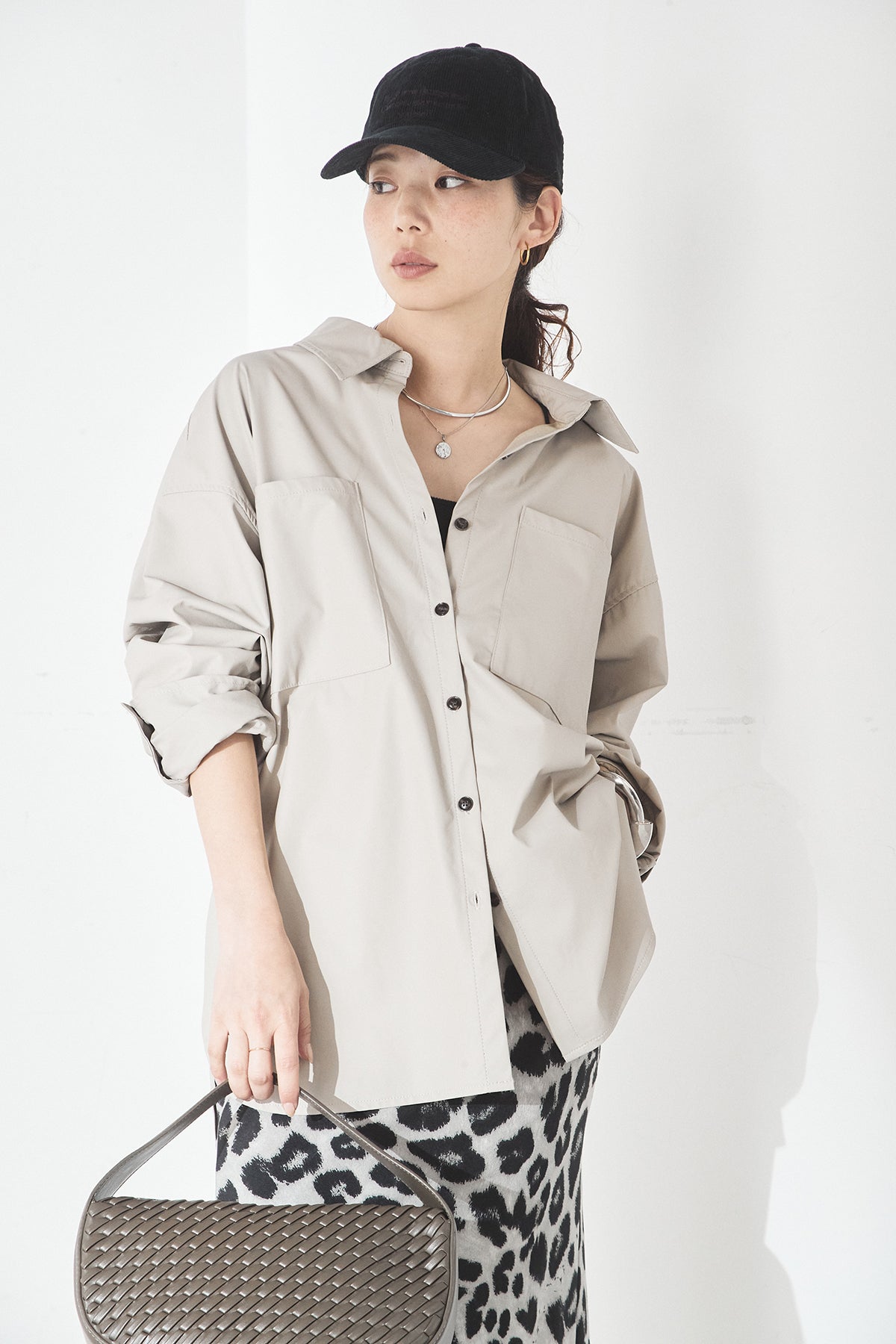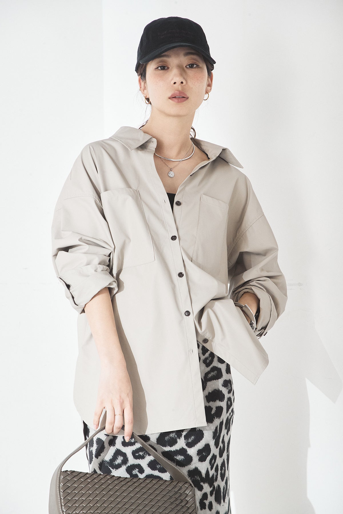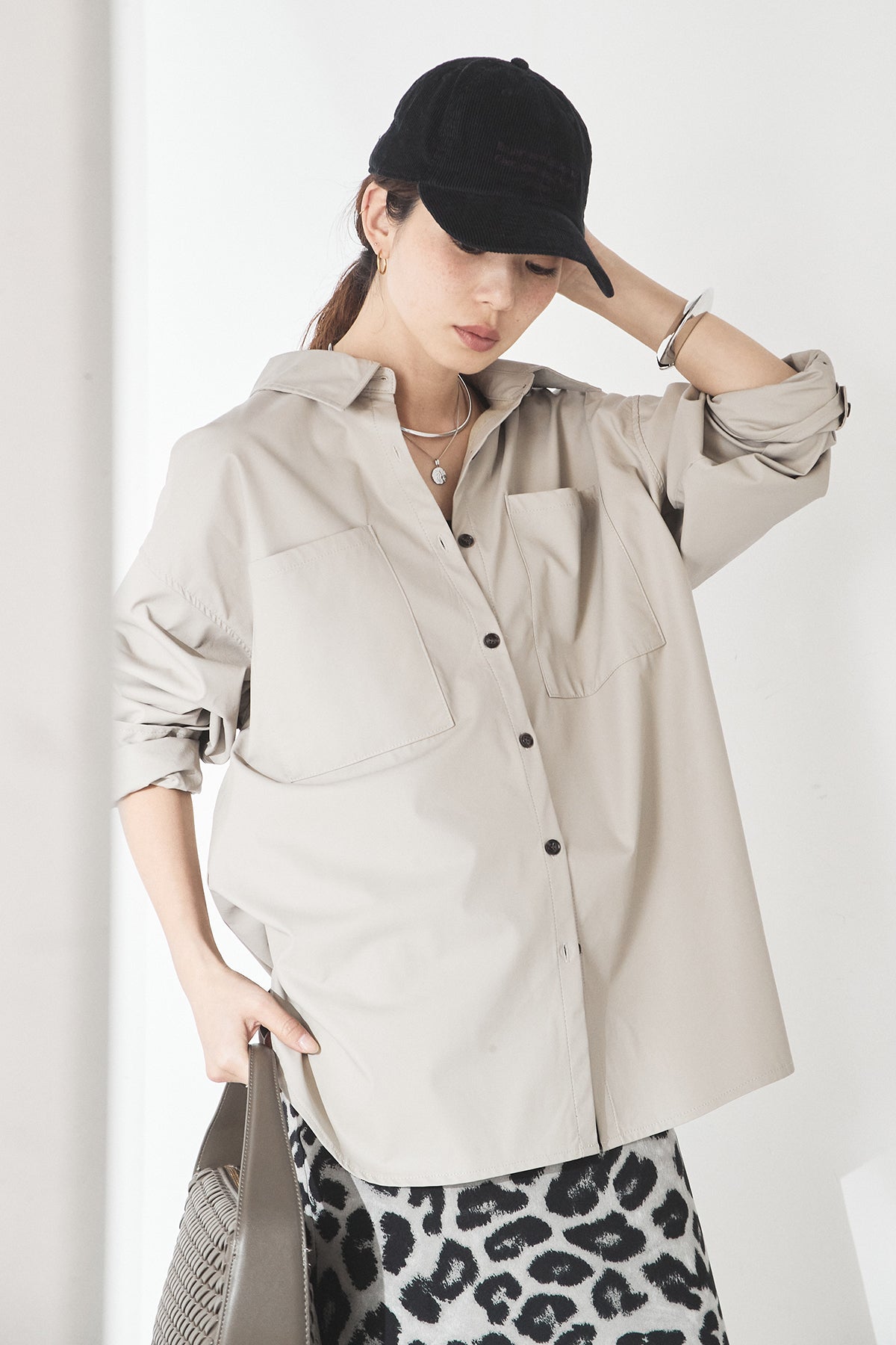 ウォッシャブル仕様のエコレザー素材を使用した、ビッグカフスデザインが特徴のシャツ。程よいハリとマットな質感が、カジュアルすぎず洗練された印象を演出します。ゆったりとしたシルエットに大きめのカフスを合わせることで、さりげなくモード感をプラス。一枚で着映えするのはもちろん、羽織りとしても活躍し、幅広いスタイリングに取り入れやすいアイテムです。