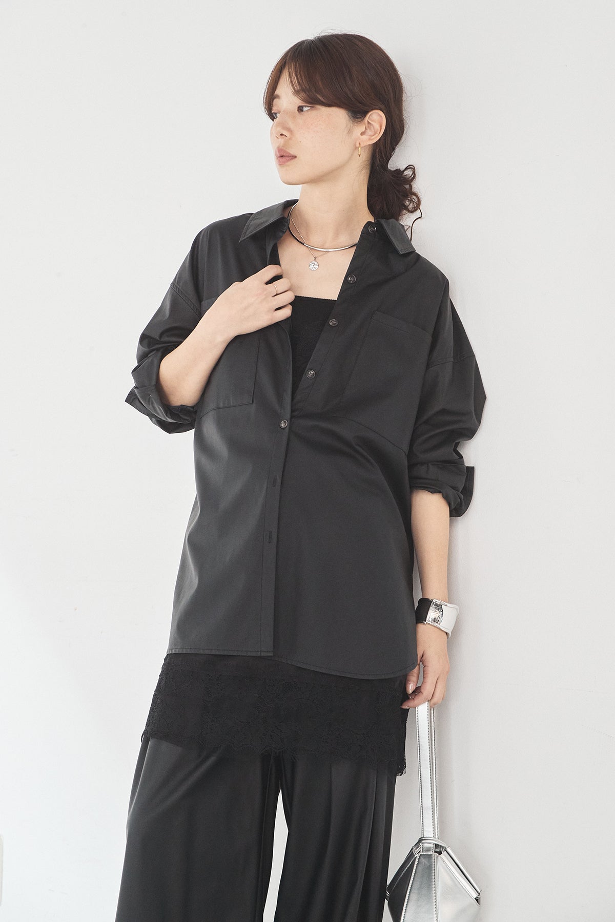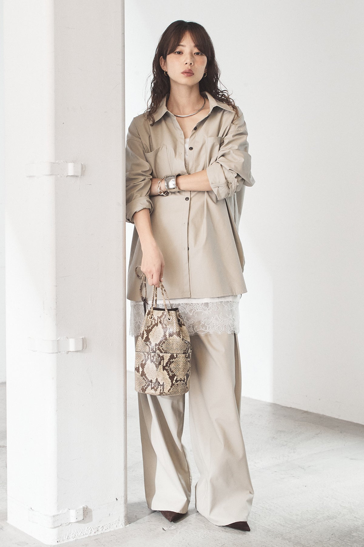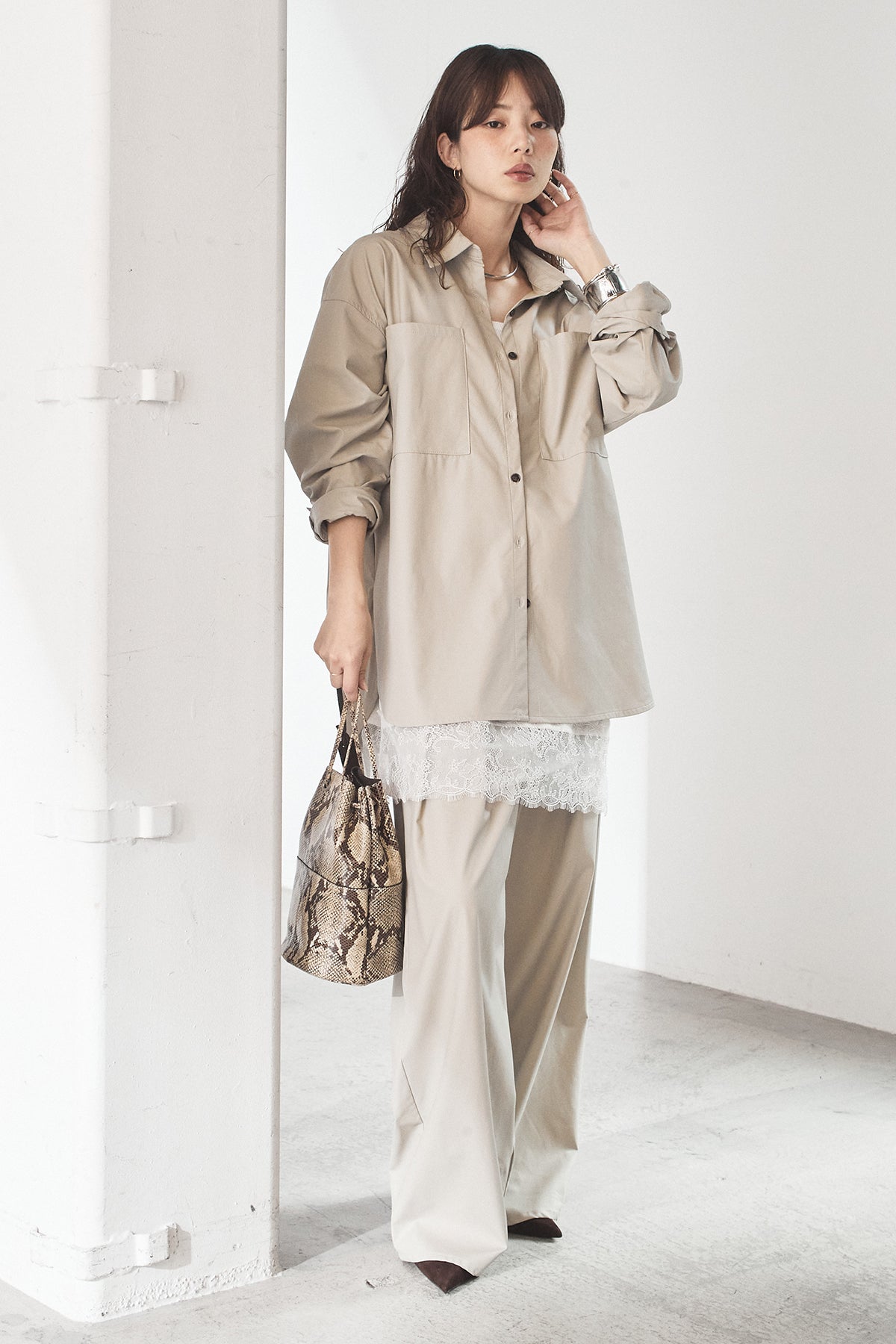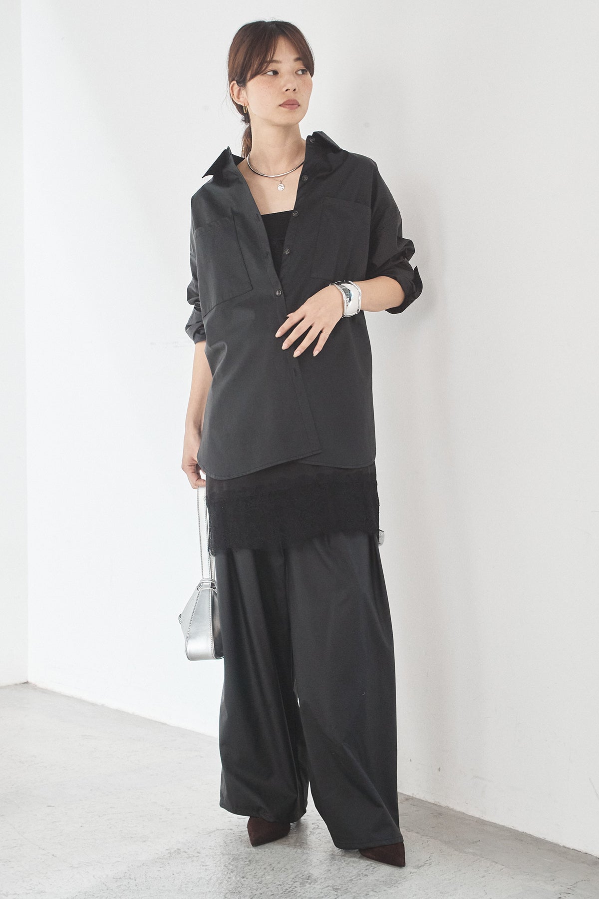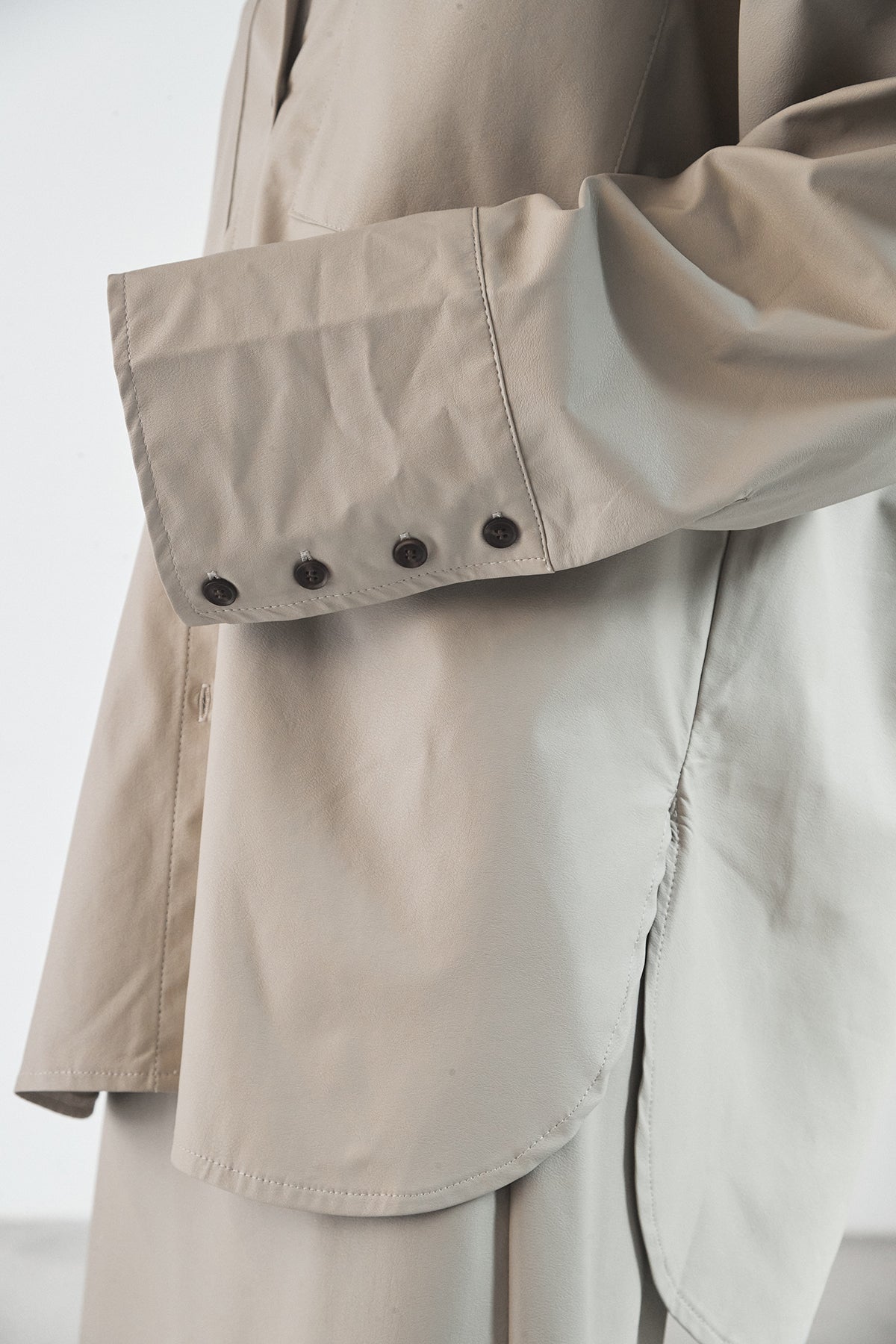 ウォッシャブル仕様のエコレザー素材を使用した、ビッグカフスデザインが特徴のシャツ。程よいハリとマットな質感が、カジュアルすぎず洗練された印象を演出します。ゆったりとしたシルエットに大きめのカフスを合わせることで、さりげなくモード感をプラス。一枚で着映えするのはもちろん、羽織りとしても活躍し、幅広いスタイリングに取り入れやすいアイテムです。