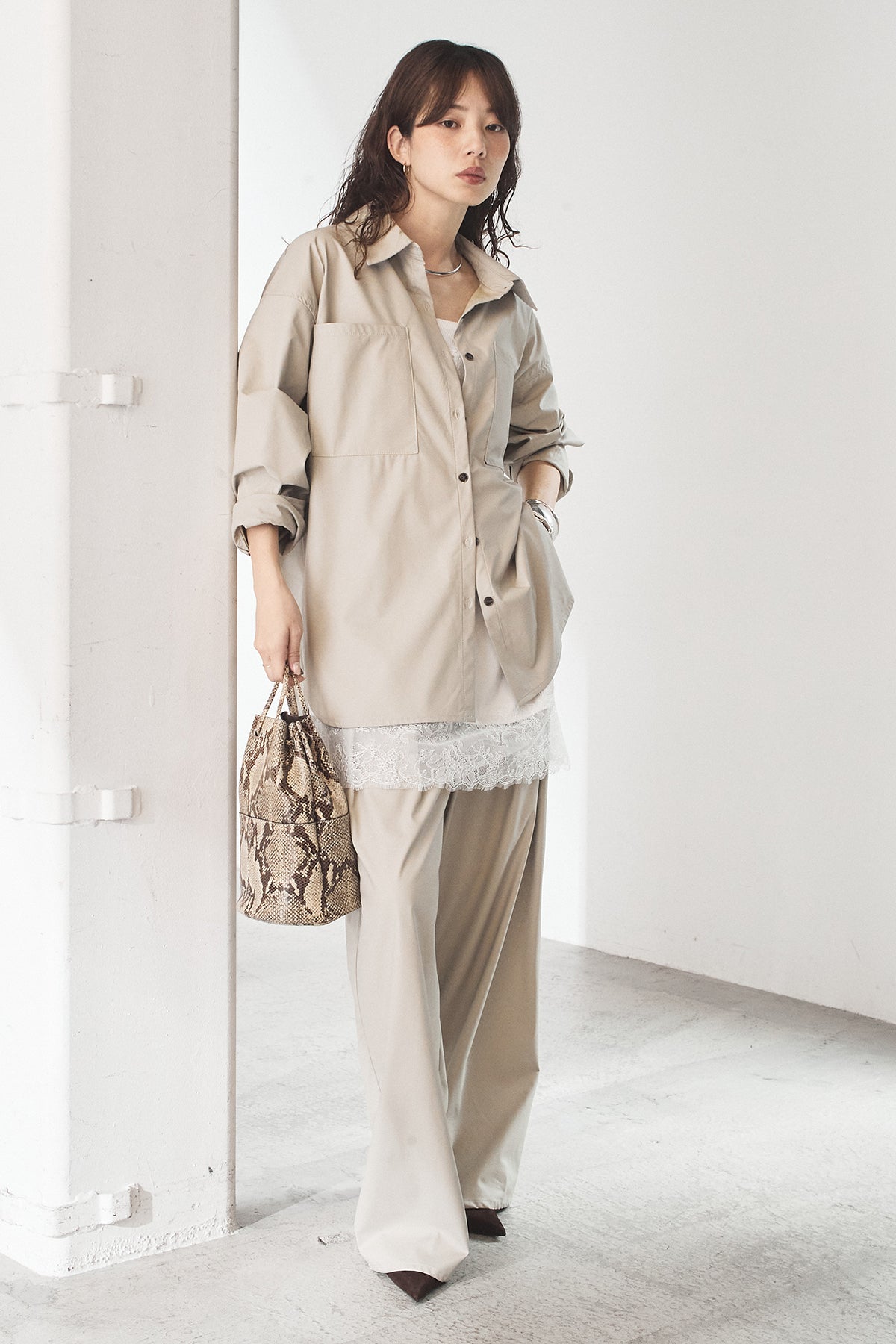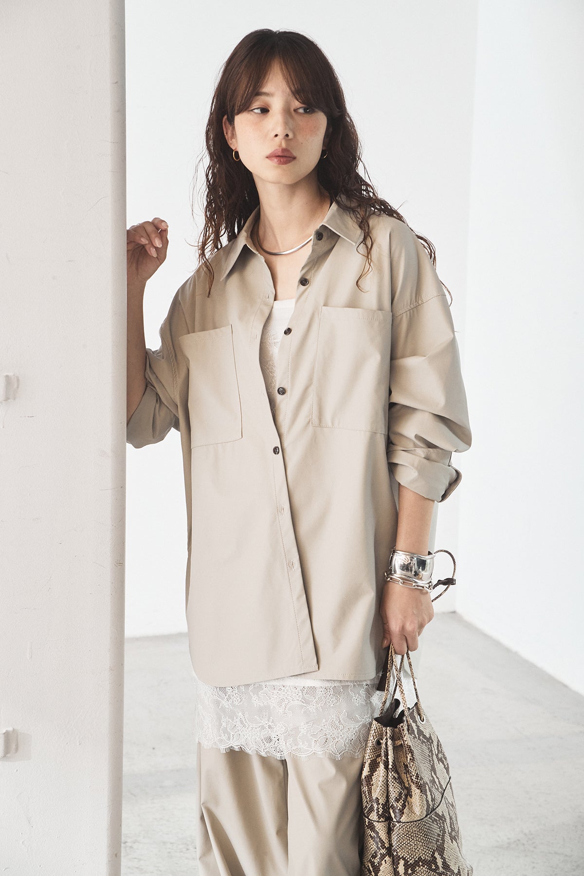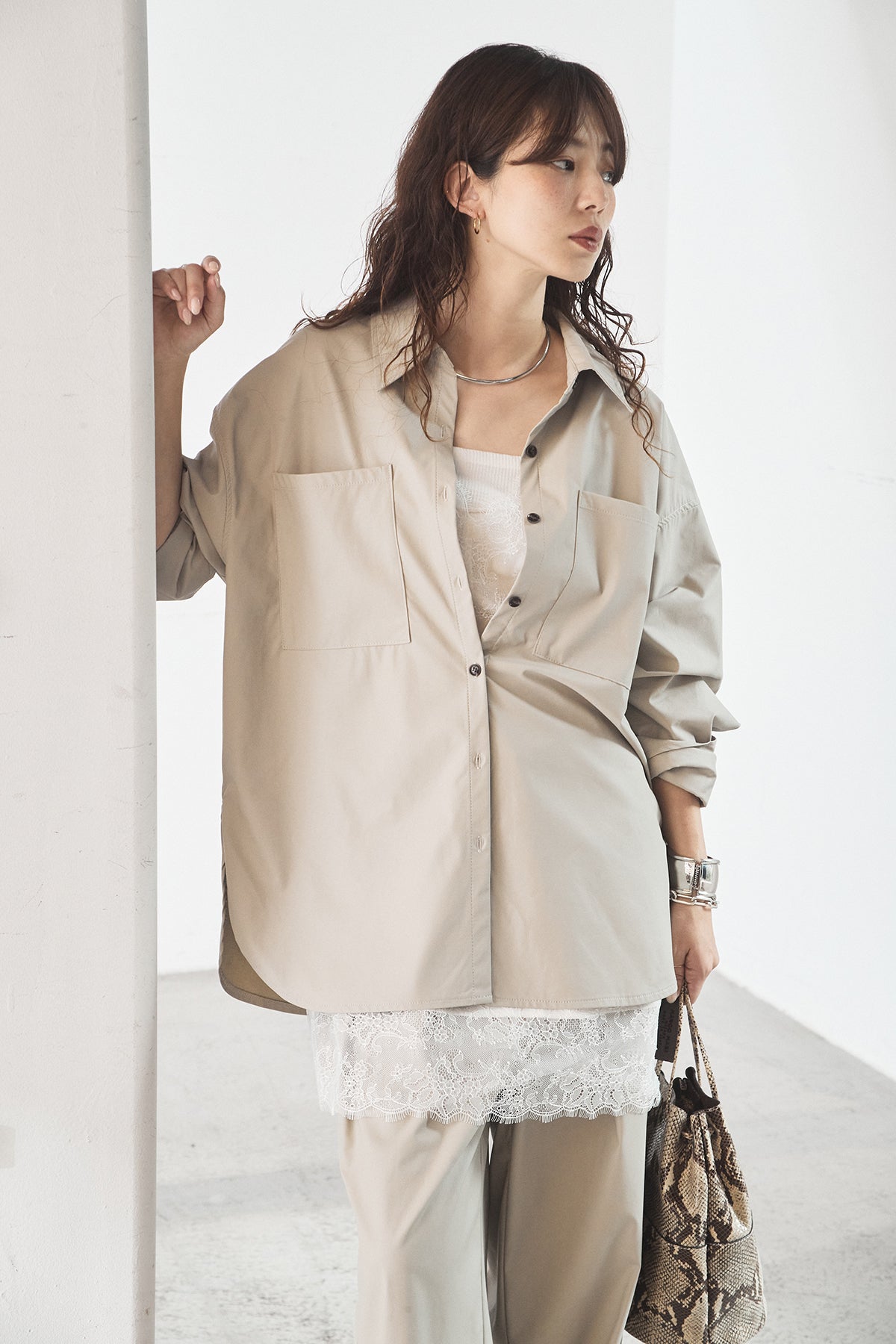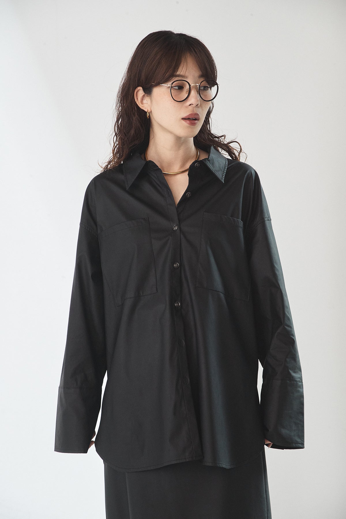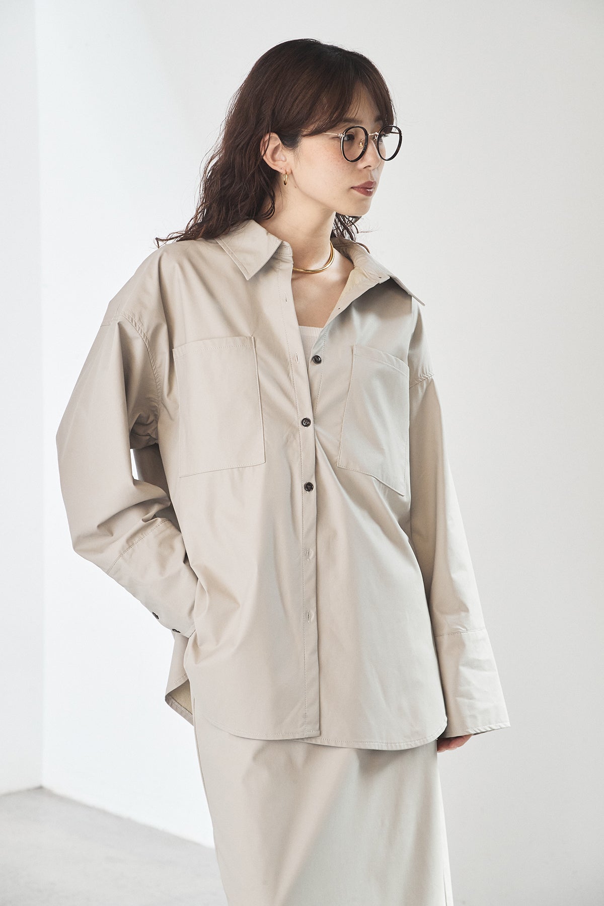ウォッシャブル仕様のエコレザー素材を使用した、ビッグカフスデザインが特徴のシャツ。程よいハリとマットな質感が、カジュアルすぎず洗練された印象を演出します。ゆったりとしたシルエットに大きめのカフスを合わせることで、さりげなくモード感をプラス。一枚で着映えするのはもちろん、羽織りとしても活躍し、幅広いスタイリングに取り入れやすいアイテムです。