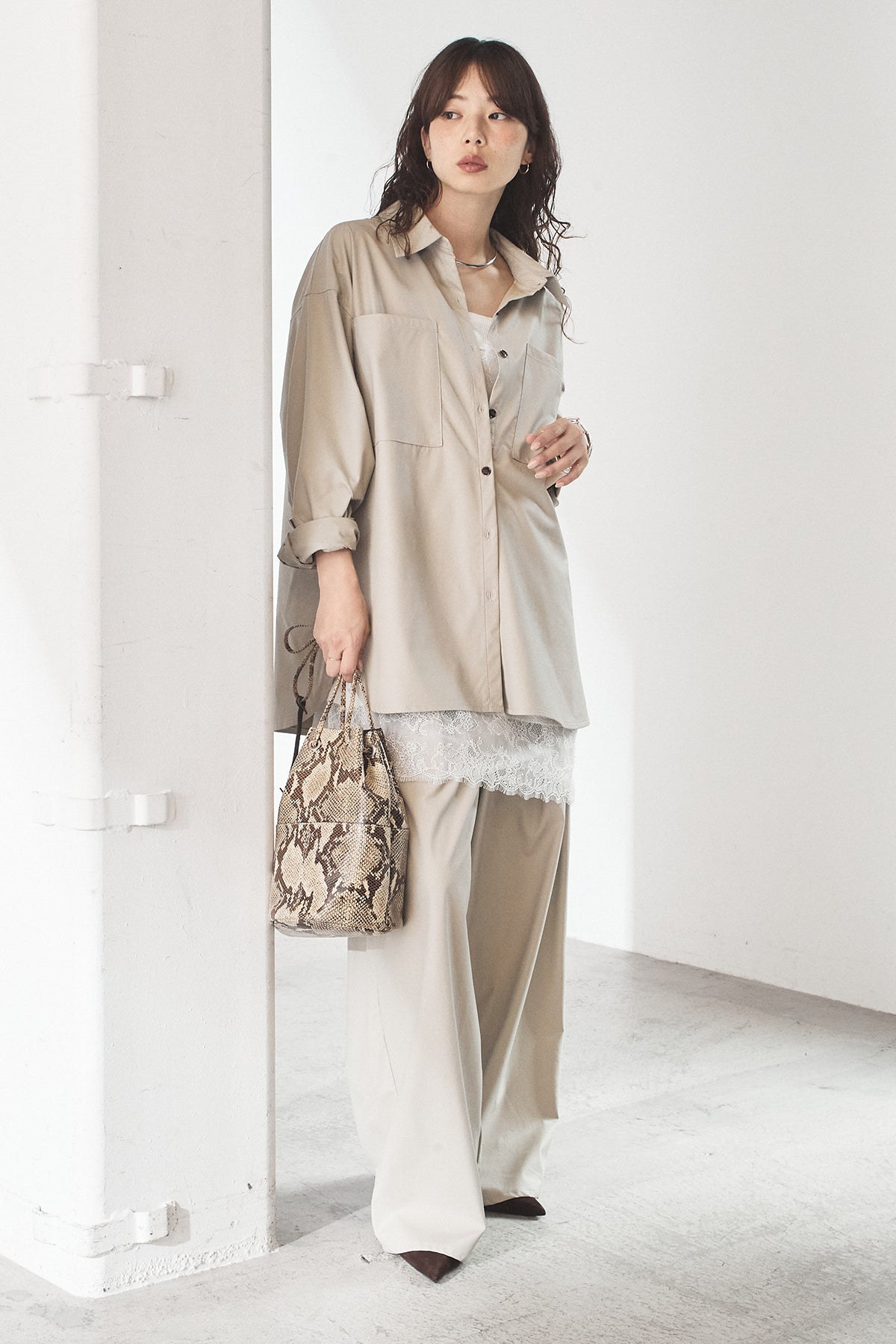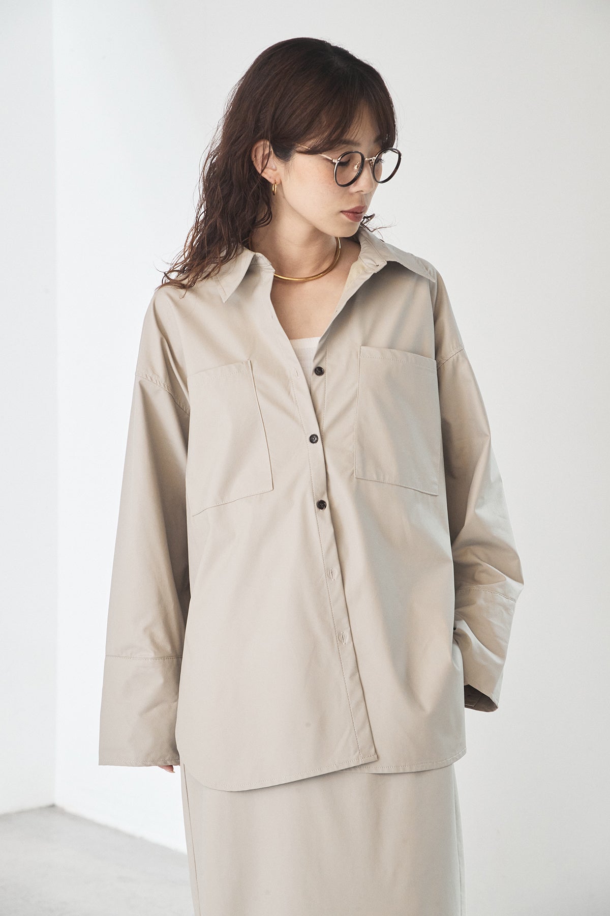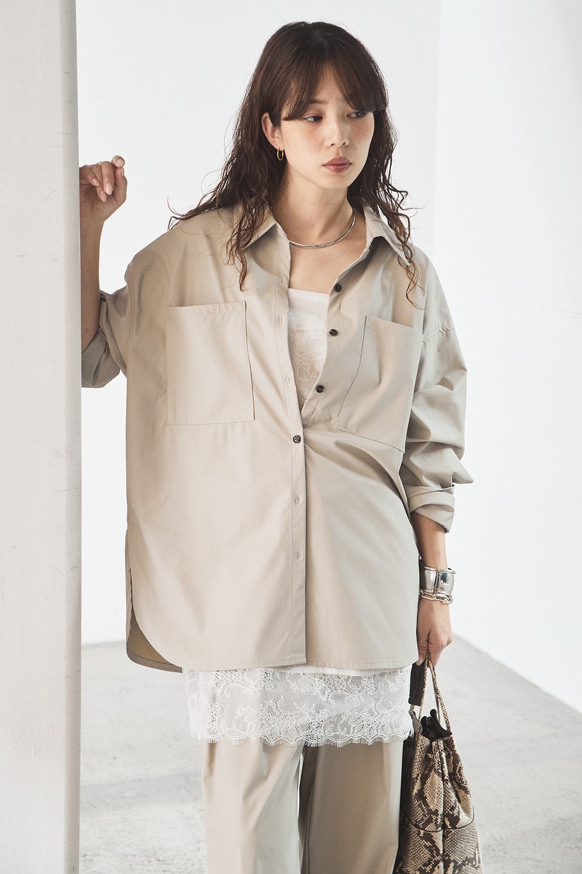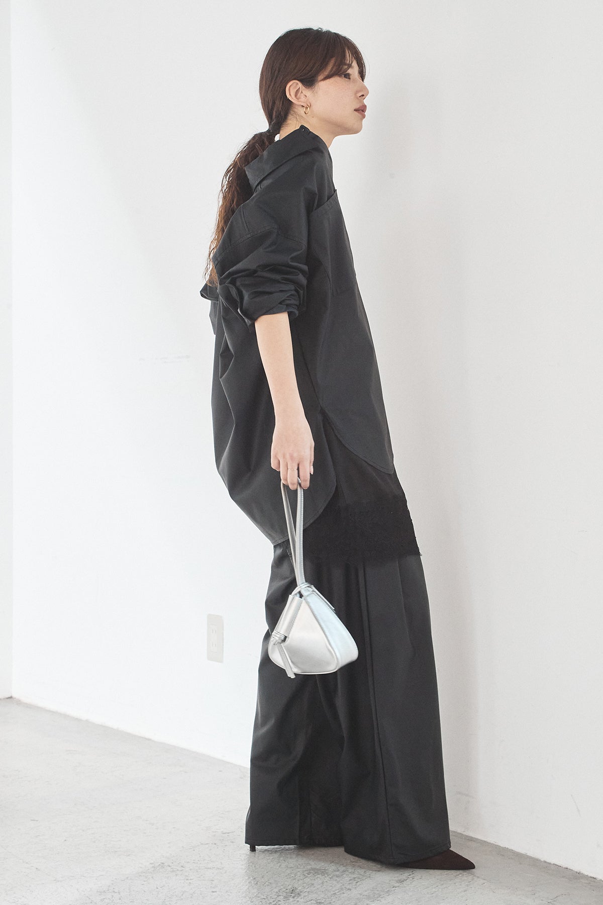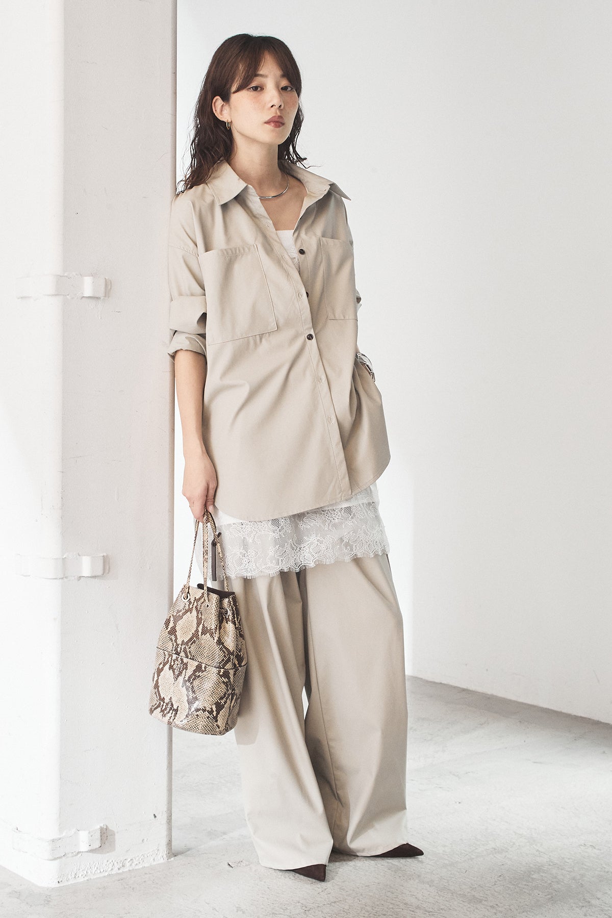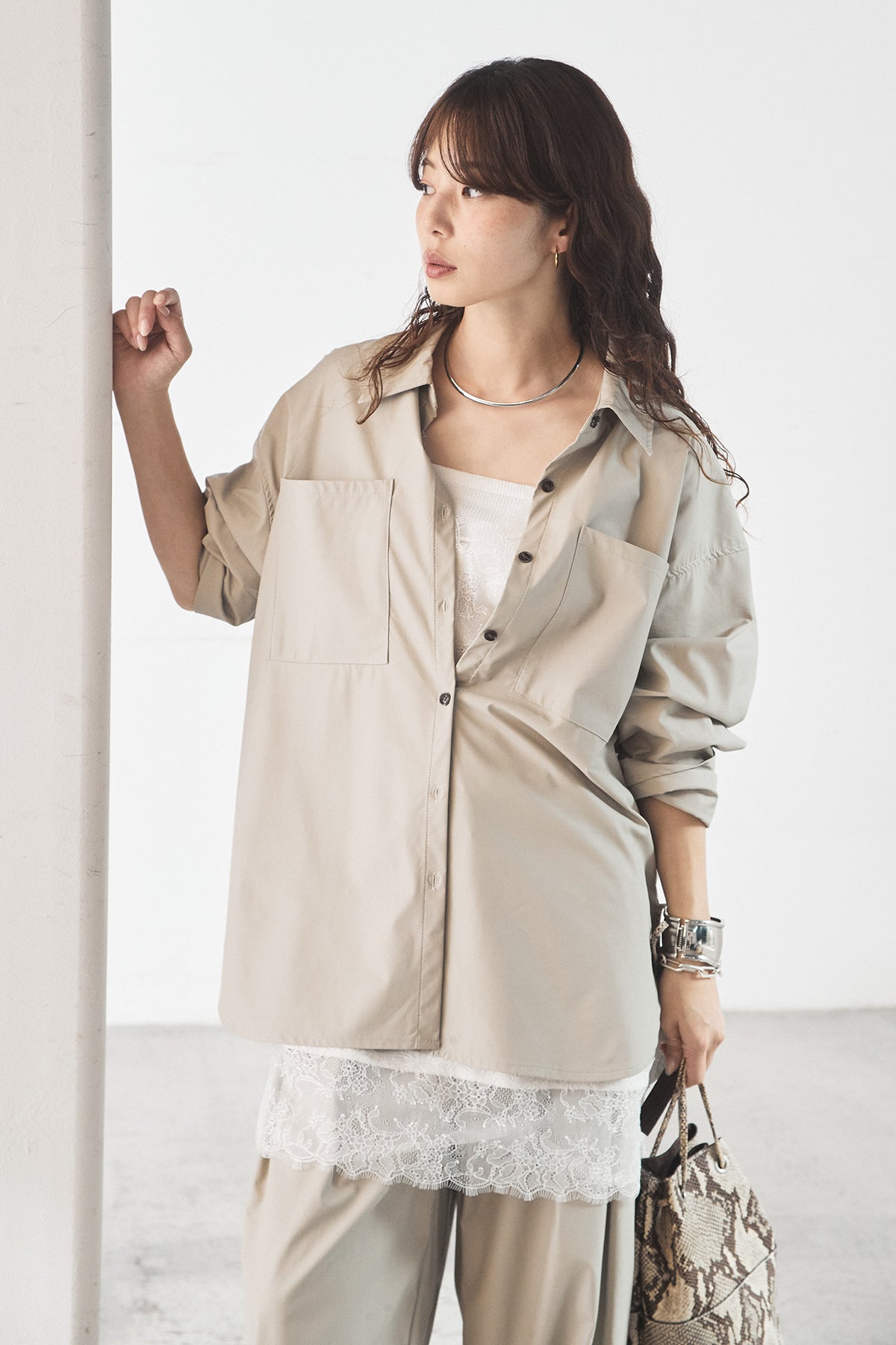 ウォッシャブル仕様のエコレザー素材を使用した、ビッグカフスデザインが特徴のシャツ。程よいハリとマットな質感が、カジュアルすぎず洗練された印象を演出します。ゆったりとしたシルエットに大きめのカフスを合わせることで、さりげなくモード感をプラス。一枚で着映えするのはもちろん、羽織りとしても活躍し、幅広いスタイリングに取り入れやすいアイテムです。