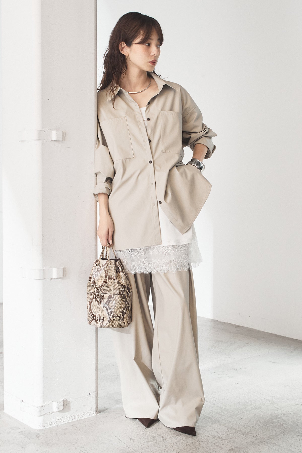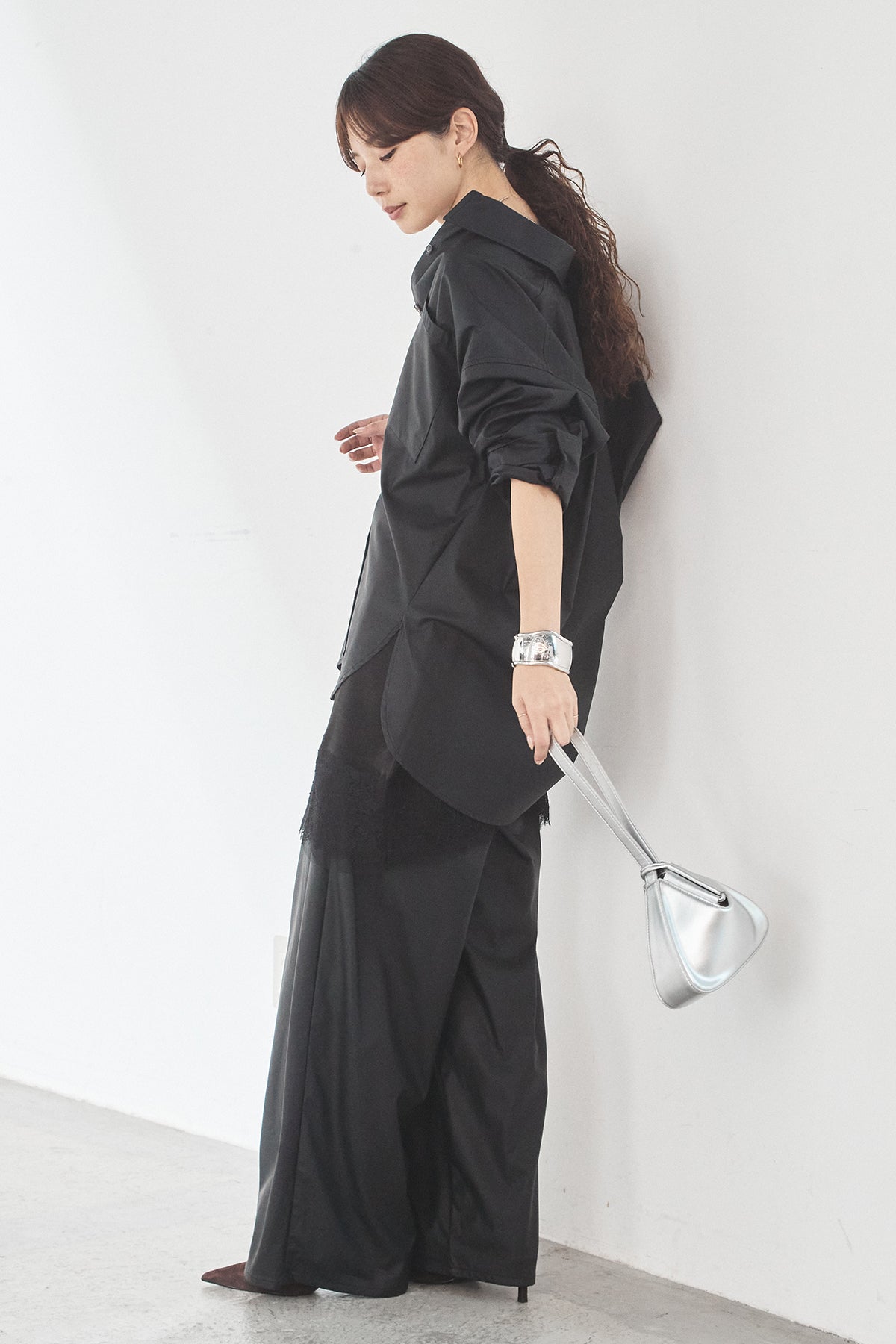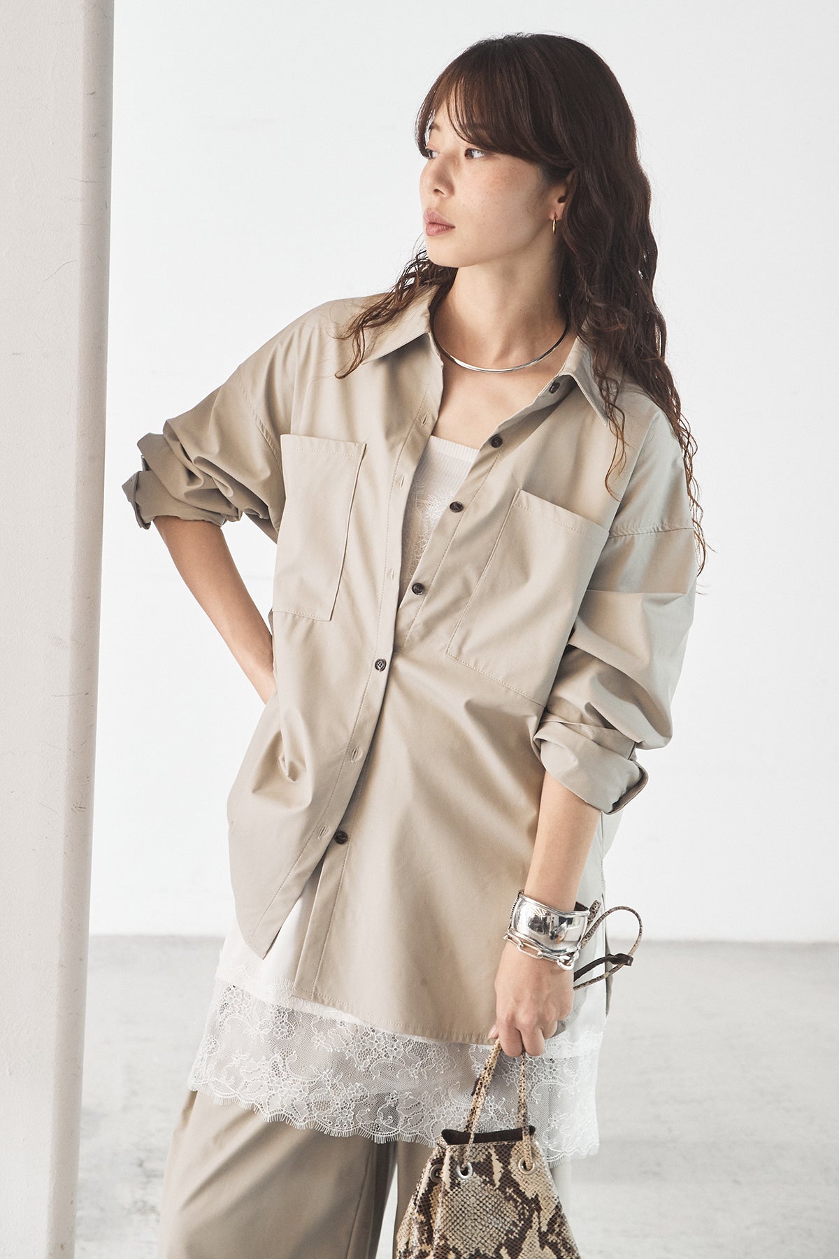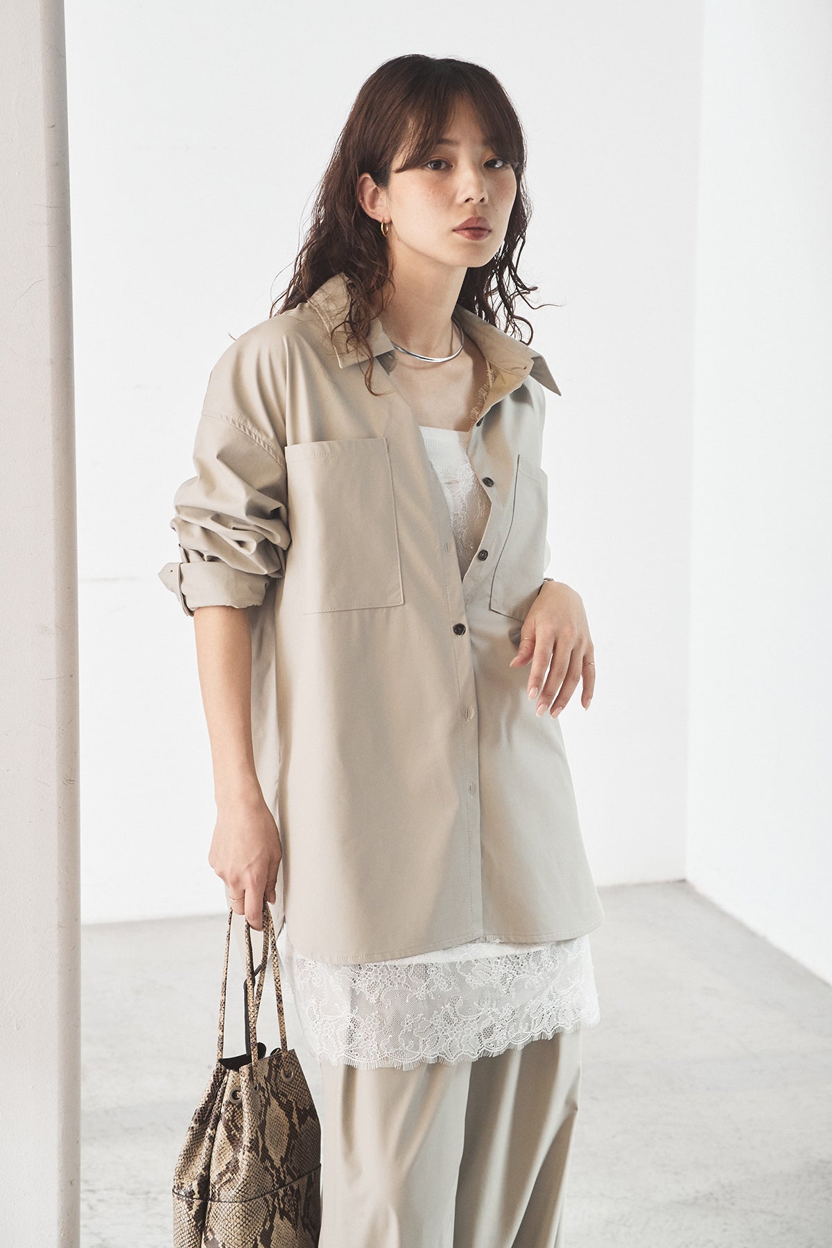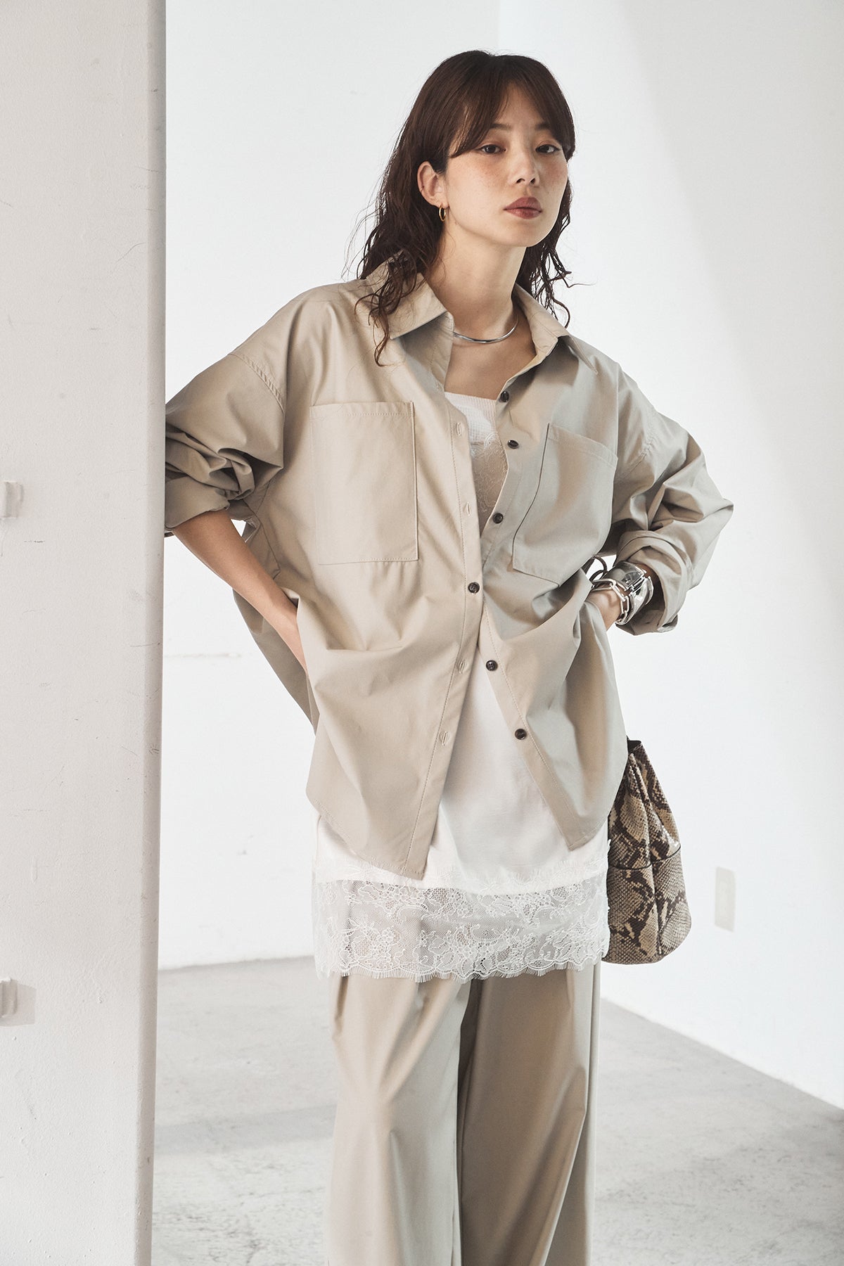 ウォッシャブル仕様のエコレザー素材を使用した、ビッグカフスデザインが特徴のシャツ。程よいハリとマットな質感が、カジュアルすぎず洗練された印象を演出します。ゆったりとしたシルエットに大きめのカフスを合わせることで、さりげなくモード感をプラス。一枚で着映えするのはもちろん、羽織りとしても活躍し、幅広いスタイリングに取り入れやすいアイテムです。
