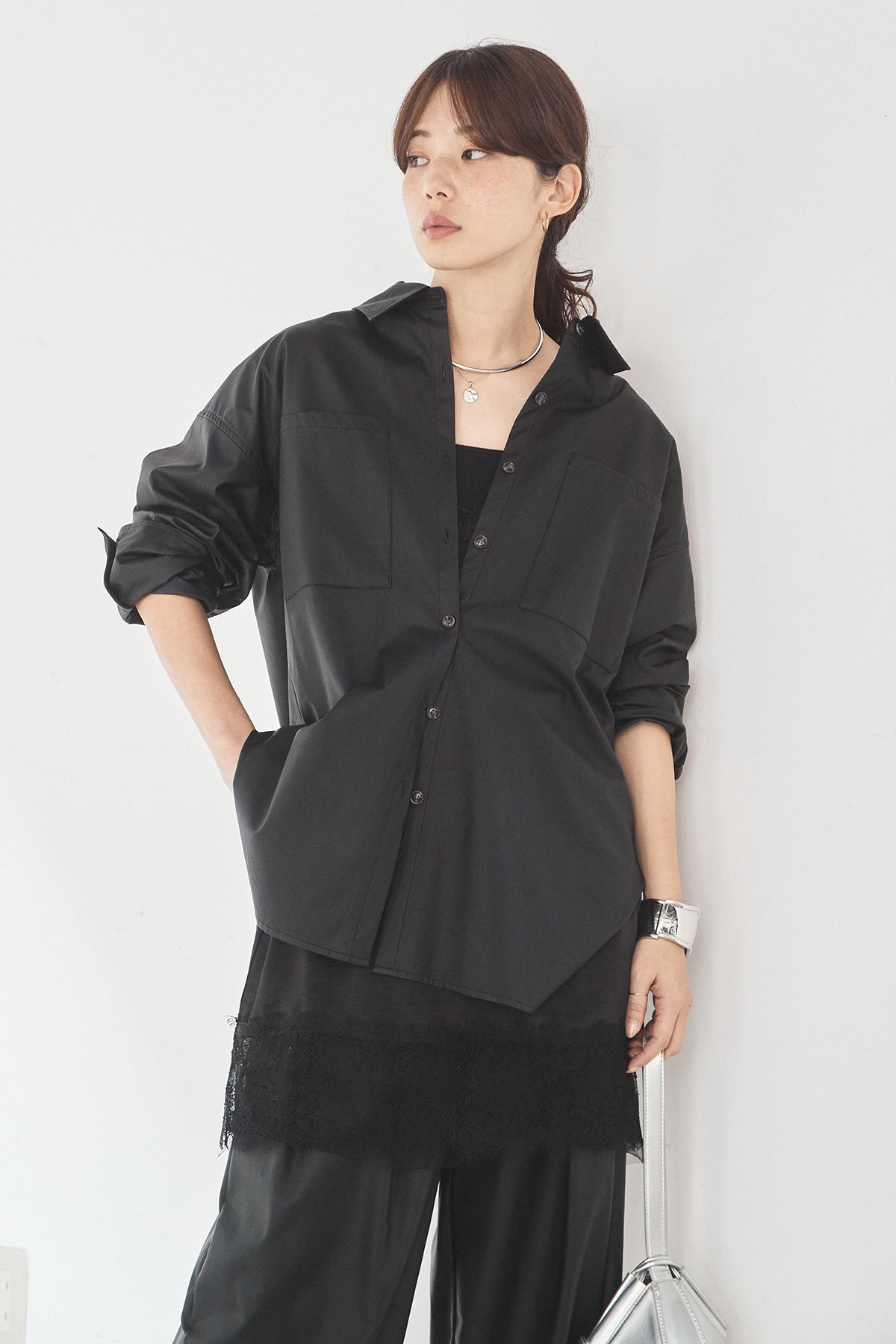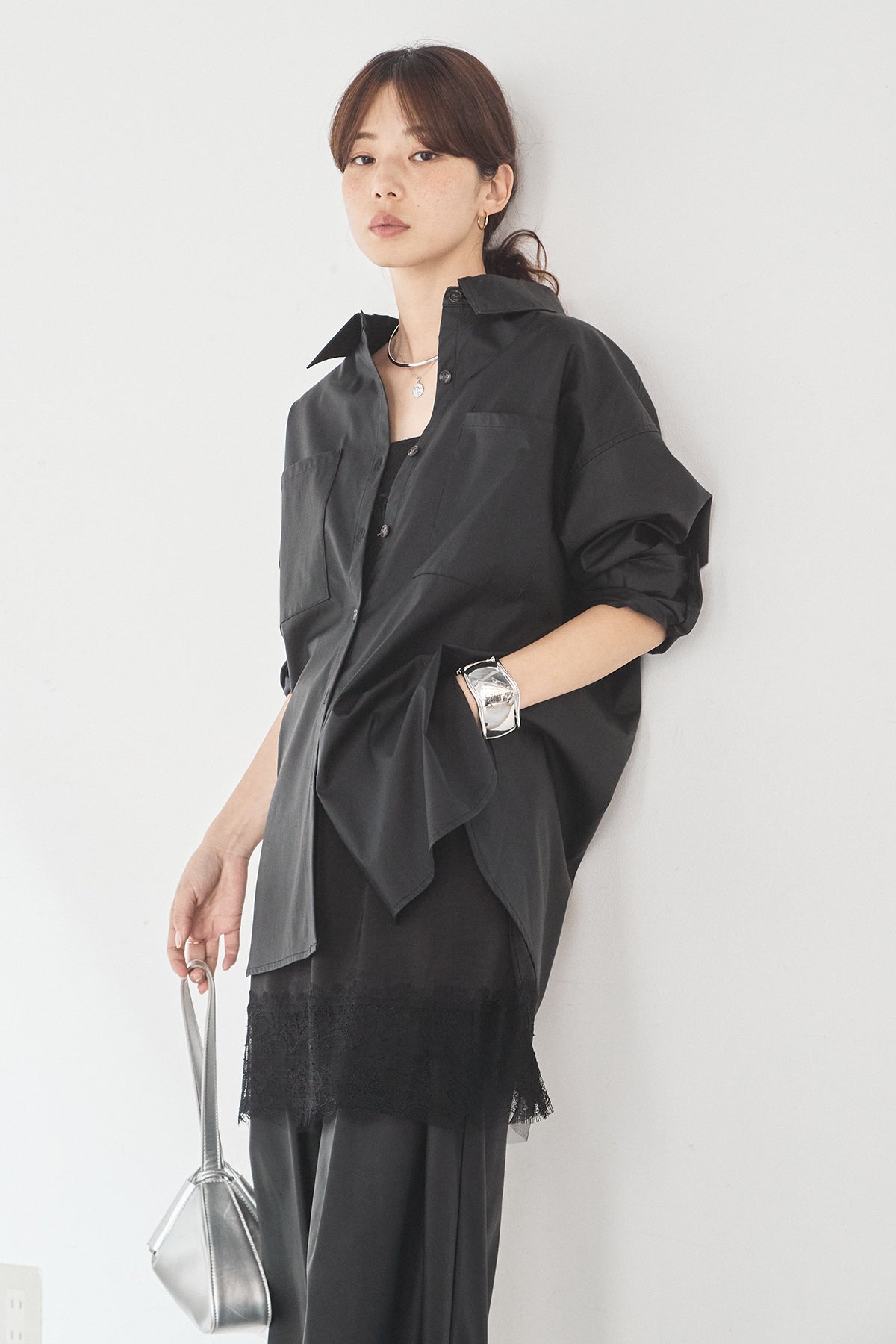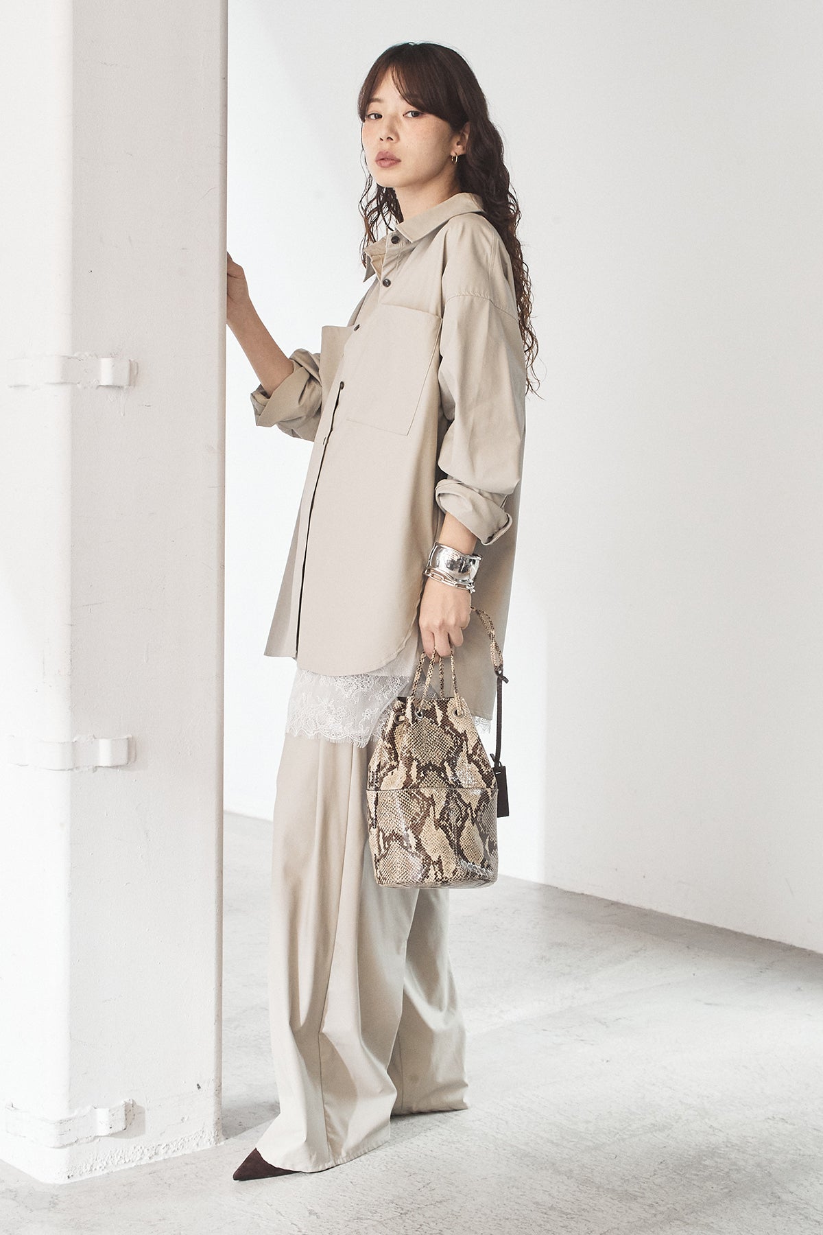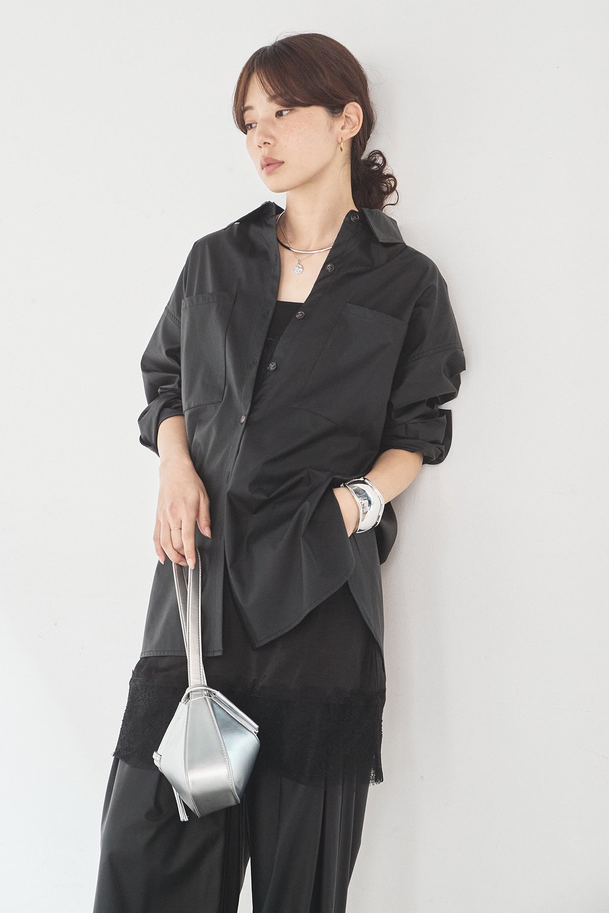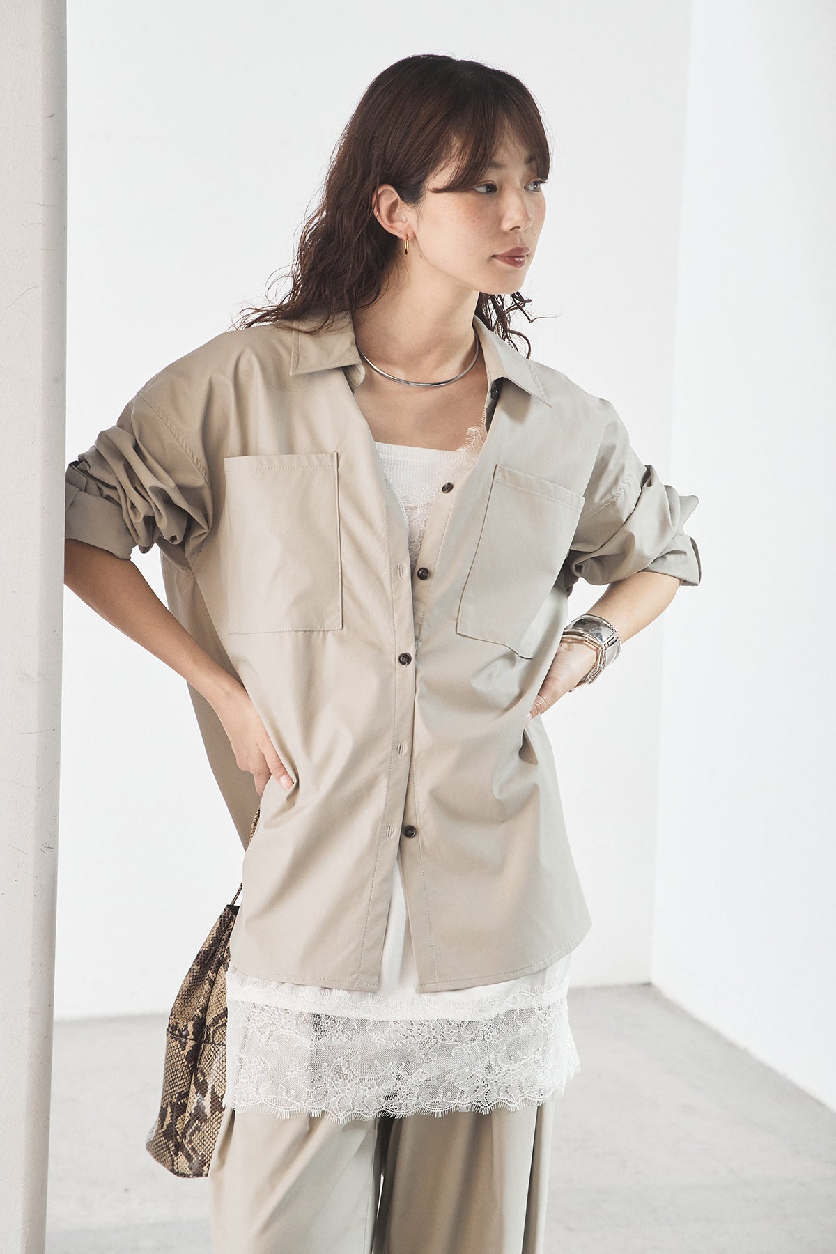 ウォッシャブル仕様のエコレザー素材を使用した、ビッグカフスデザインが特徴のシャツ。程よいハリとマットな質感が、カジュアルすぎず洗練された印象を演出します。ゆったりとしたシルエットに大きめのカフスを合わせることで、さりげなくモード感をプラス。一枚で着映えするのはもちろん、羽織りとしても活躍し、幅広いスタイリングに取り入れやすいアイテムです。