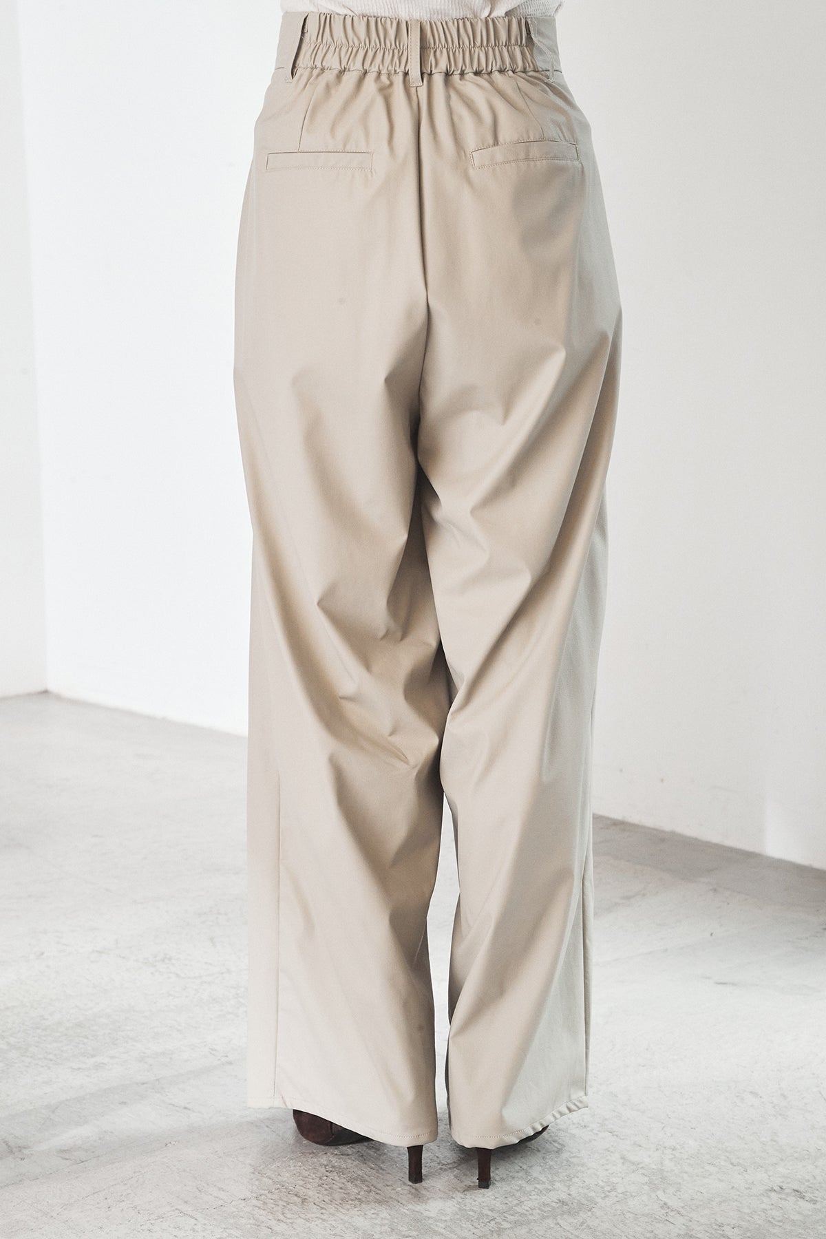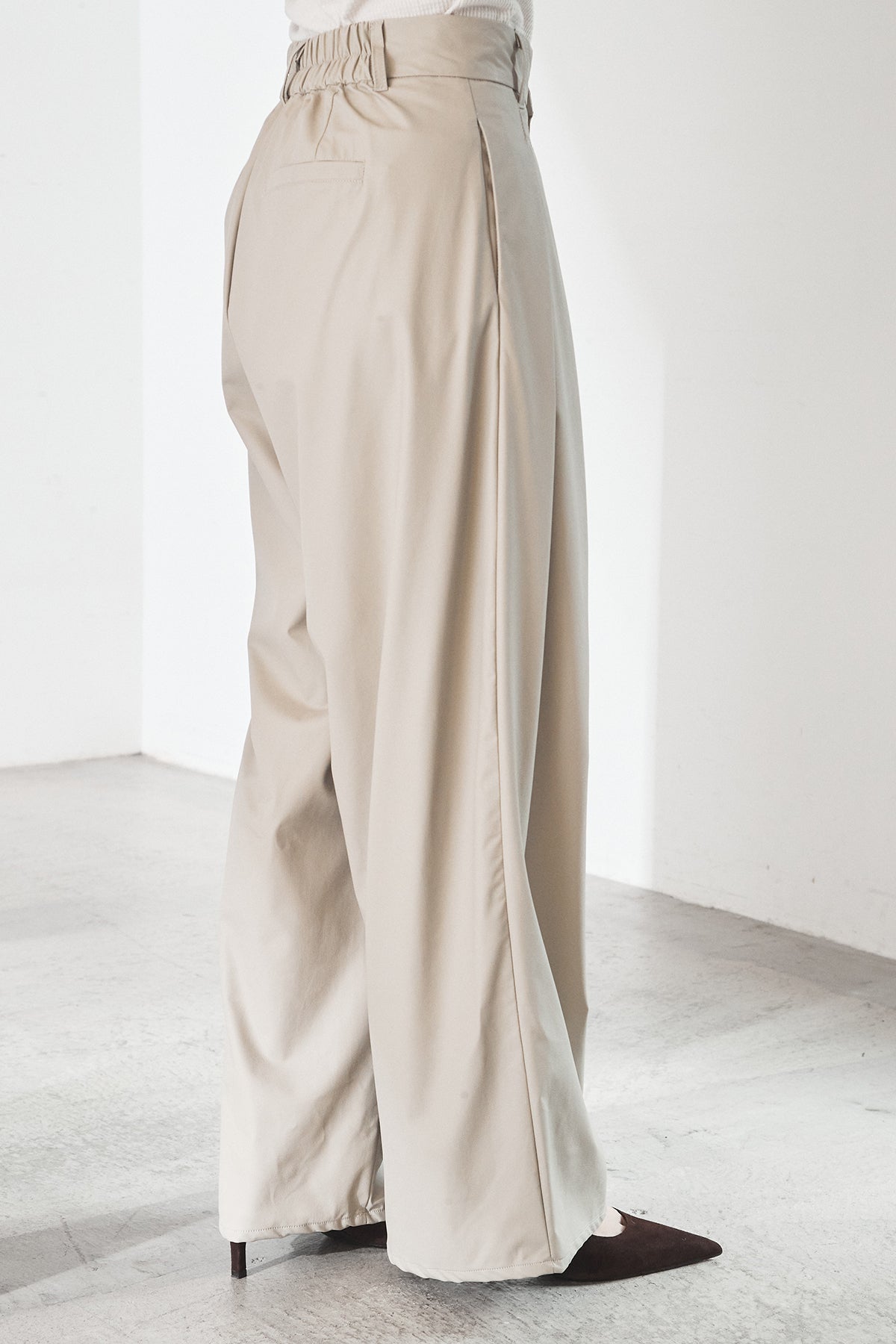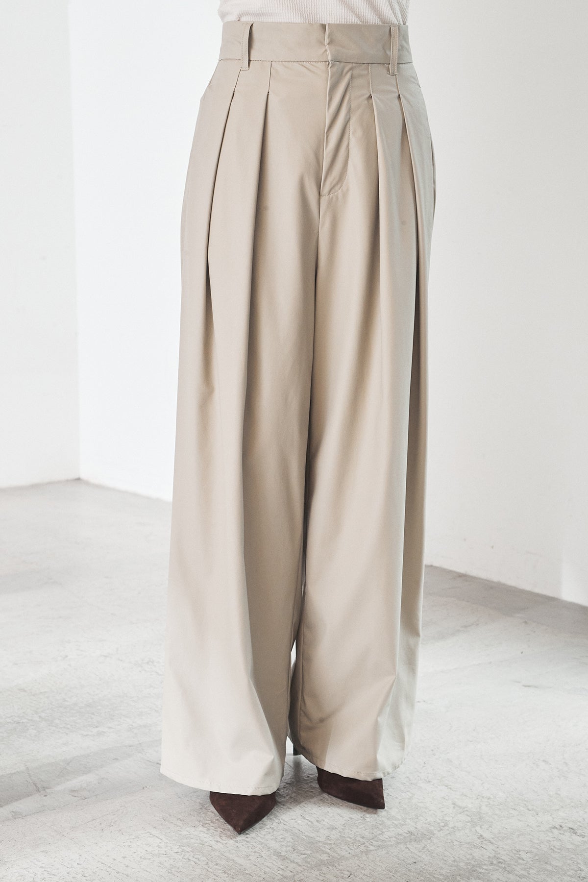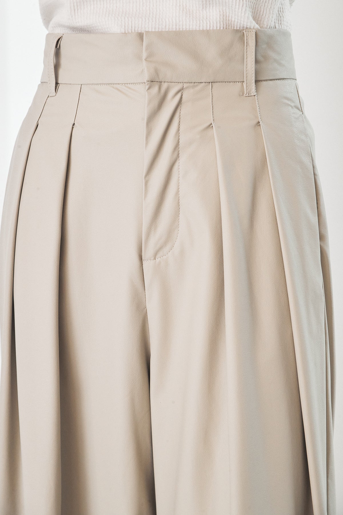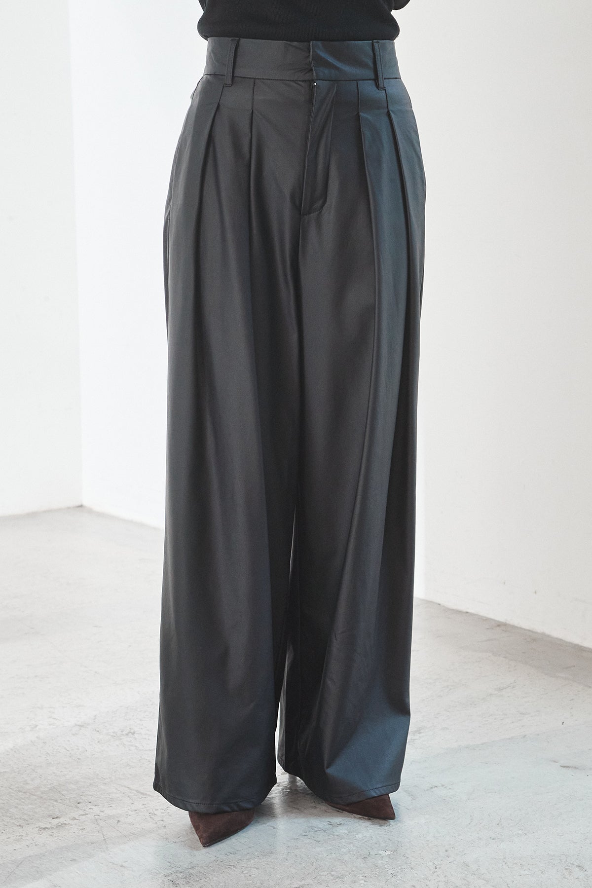 しなやかな質感が魅力の、ウォッシャブル仕様エコレザータックパンツ。上品な光沢を抑えた素材感で、レザー見えしながらも軽やかな穿き心地を実現しています。フロントのタックが縦ラインを強調し、腰まわりにゆとりを持たせつつ美しい落ち感を演出。ワイドシルエットながらもすっきりとした印象で、きれいめからカジュアルまで幅広いスタイリングに対応する一本です。