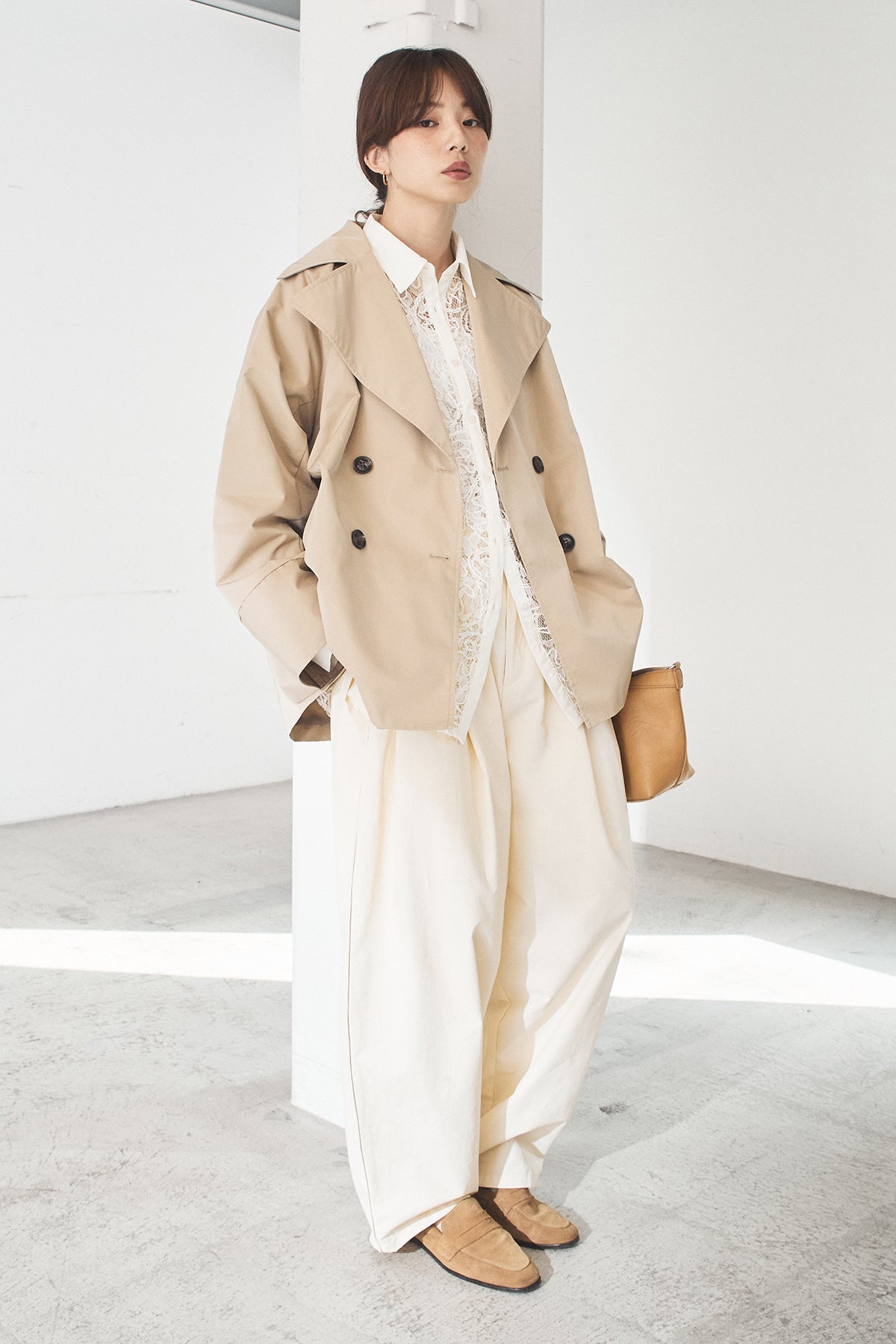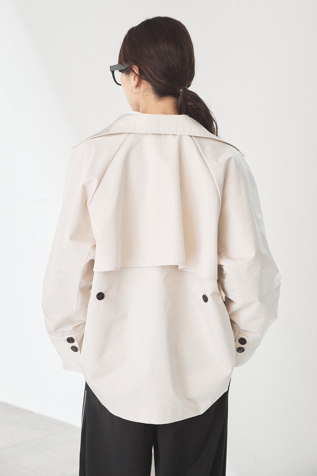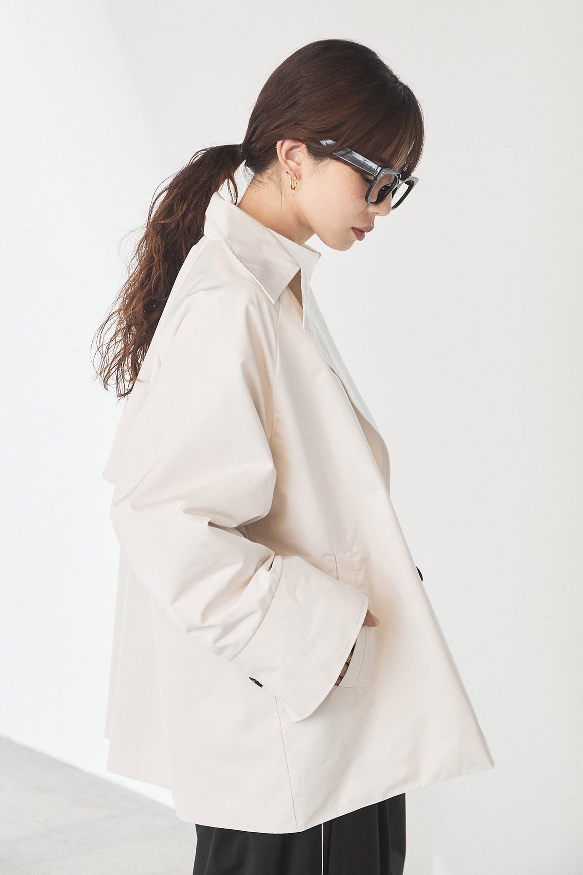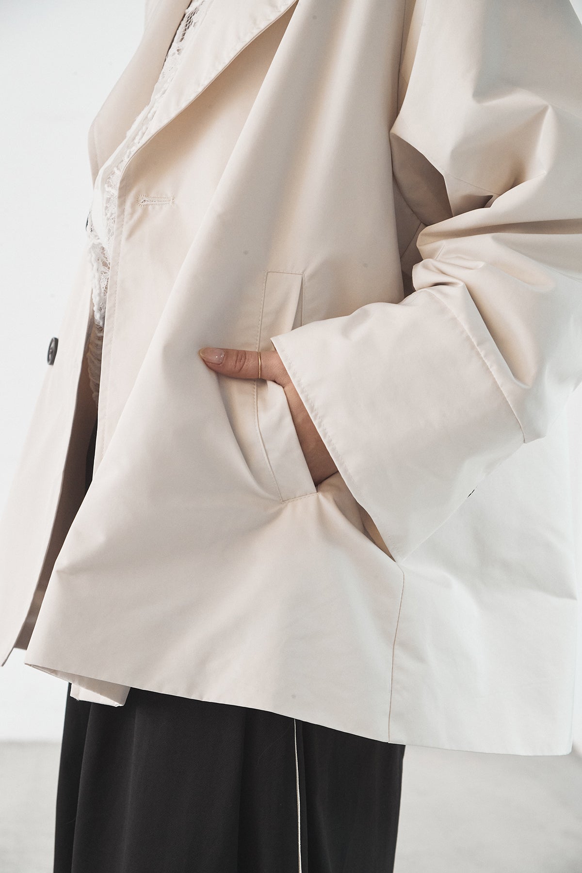 軽やかなナイロン素材を使用したトレンチコート。程よくハリのある質感が立体的なシルエットを保ち、カジュアルになりすぎず洗練された印象に仕上げます。大きめの襟とダブルボタンデザインがクラシックな雰囲気を演出しつつ、ショート丈でバランスの取りやすさも◎。さっと羽織れる軽さで、季節の変わり目や端境期に活躍する一着です。きれいめからモードまで、幅広いスタイリングに馴染みます。