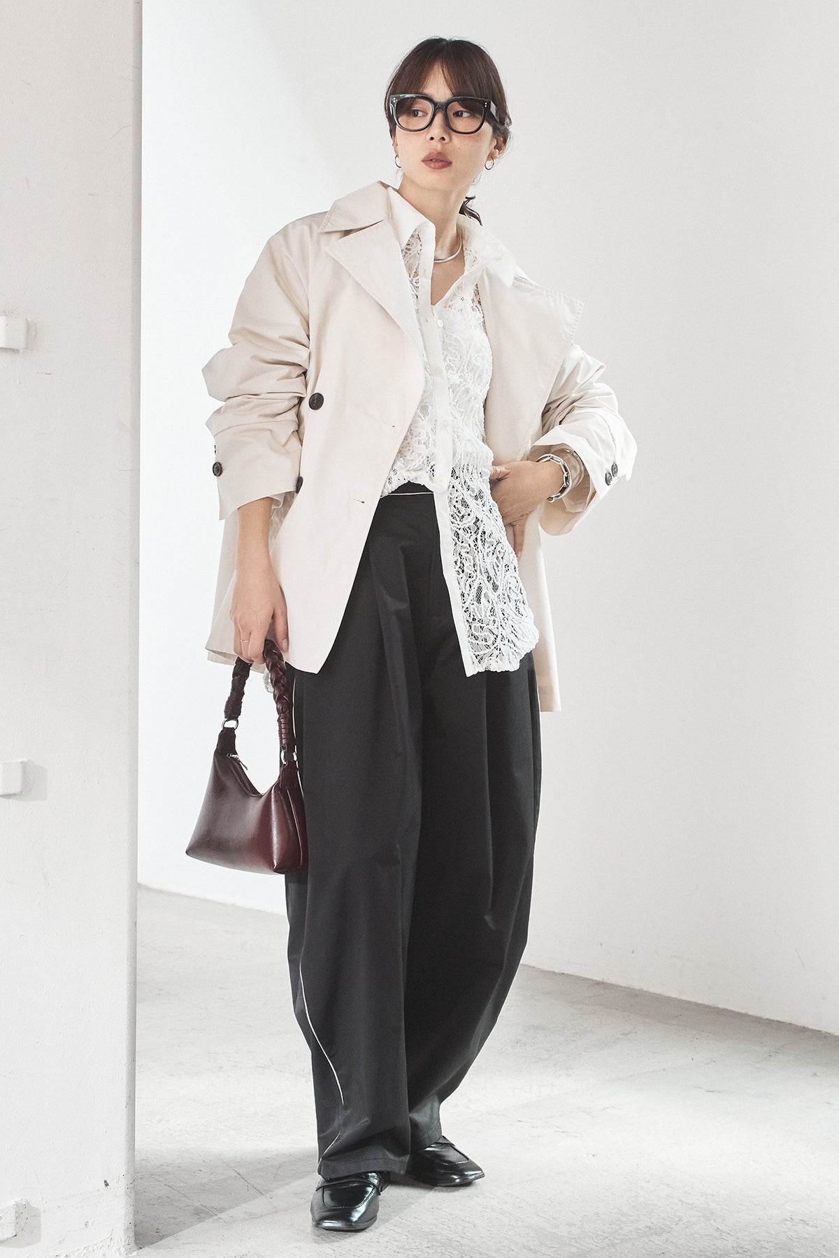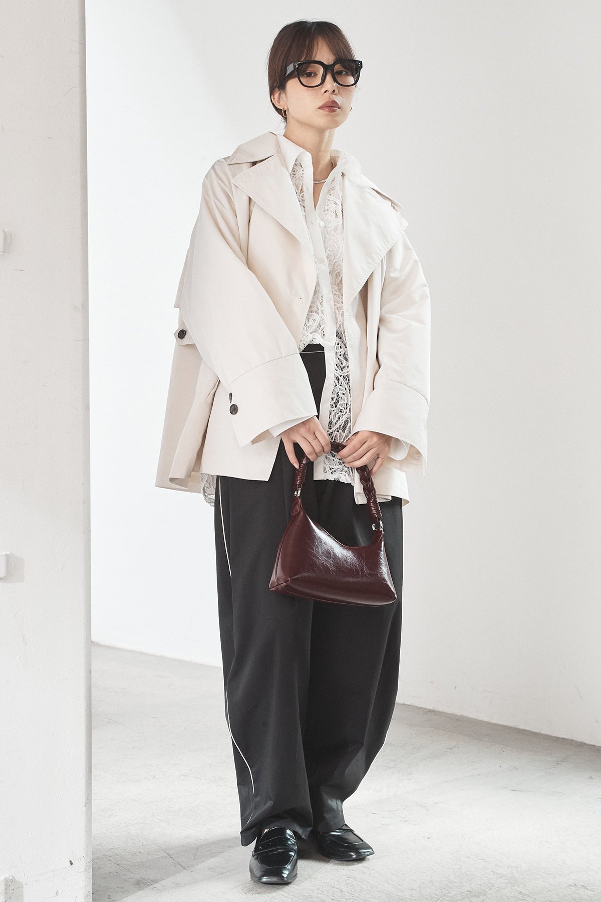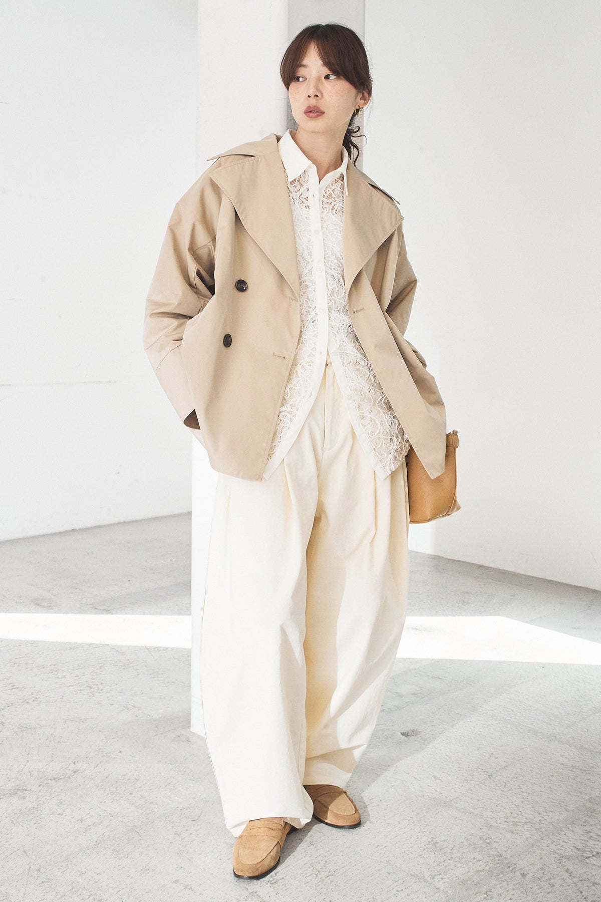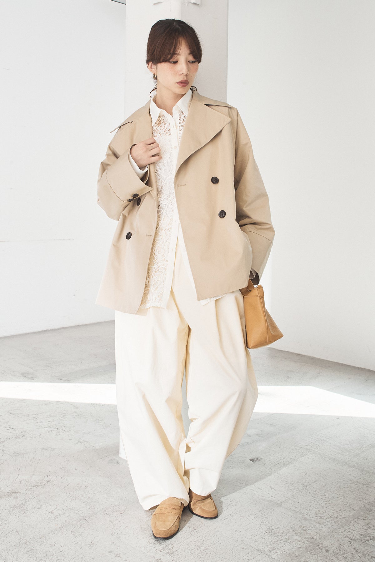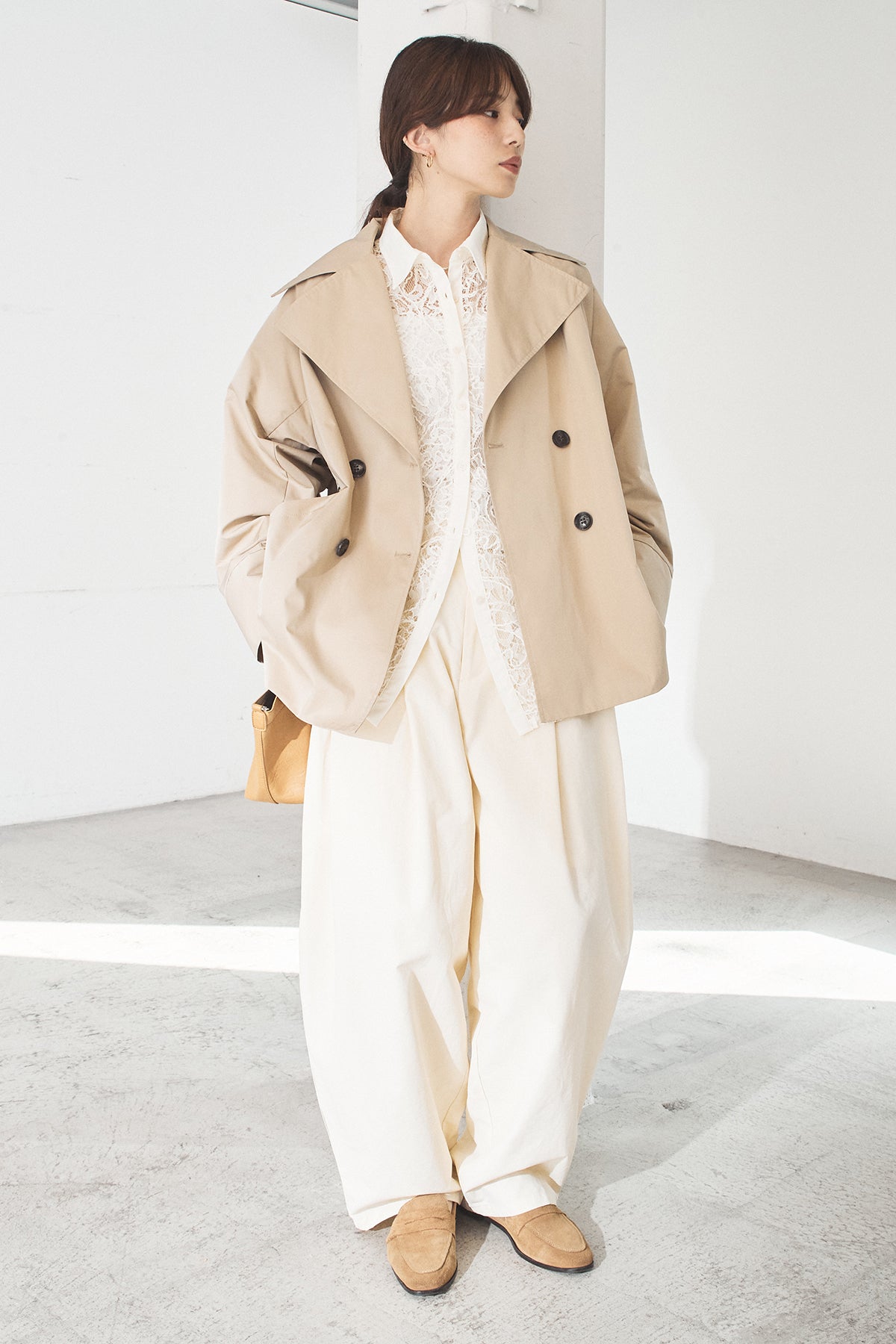 軽やかなナイロン素材を使用したトレンチコート。程よくハリのある質感が立体的なシルエットを保ち、カジュアルになりすぎず洗練された印象に仕上げます。大きめの襟とダブルボタンデザインがクラシックな雰囲気を演出しつつ、ショート丈でバランスの取りやすさも◎。さっと羽織れる軽さで、季節の変わり目や端境期に活躍する一着です。きれいめからモードまで、幅広いスタイリングに馴染みます。