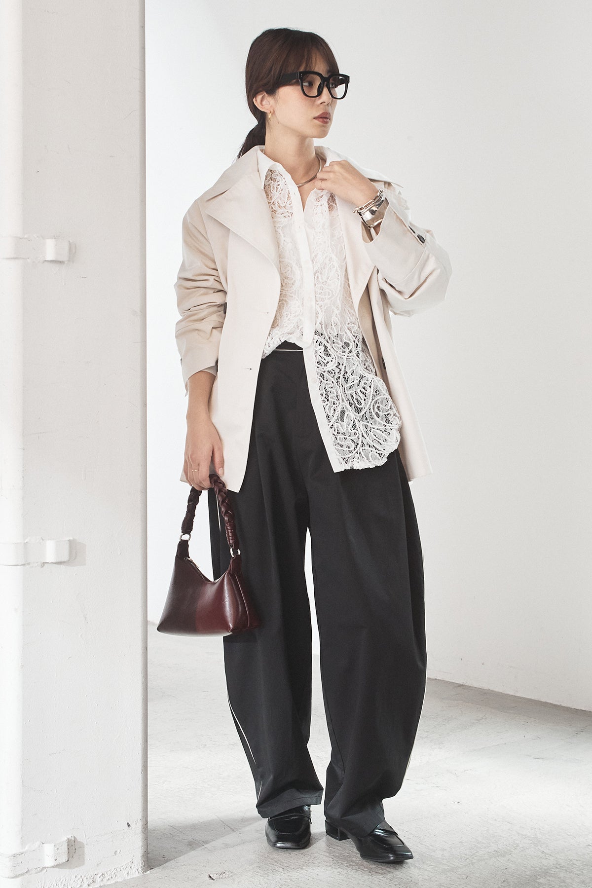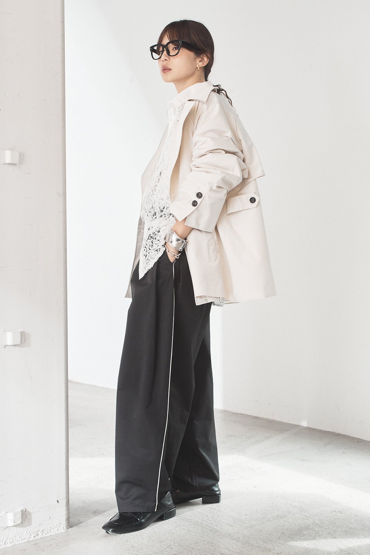 [SET]ナイロントレンチコート+合繊ツイルパイピングタックカーブパンツ(2set)