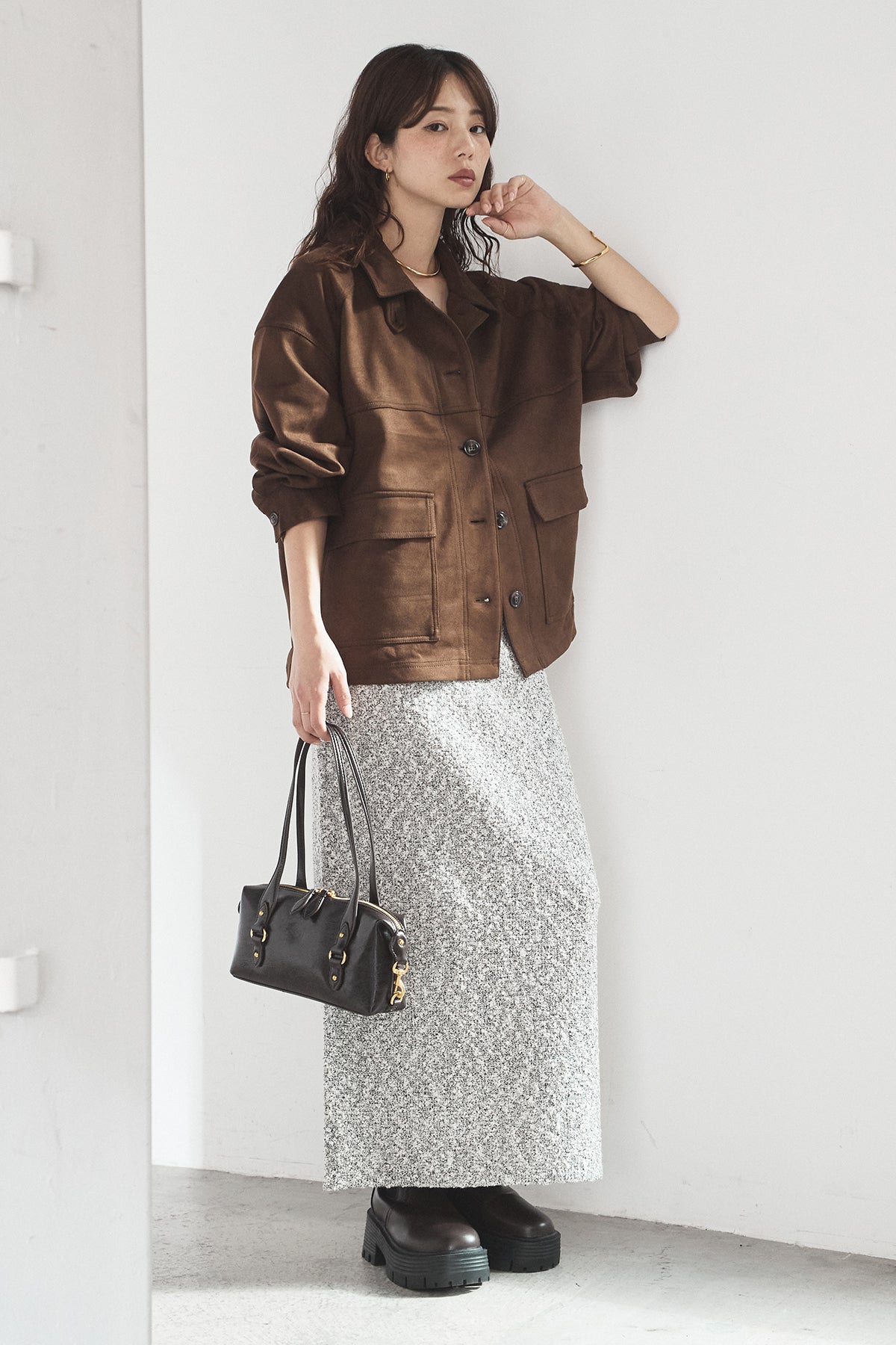 [SET]デカポケスエポンジャケット+ツイード風MIXスラブスカート(2set)
