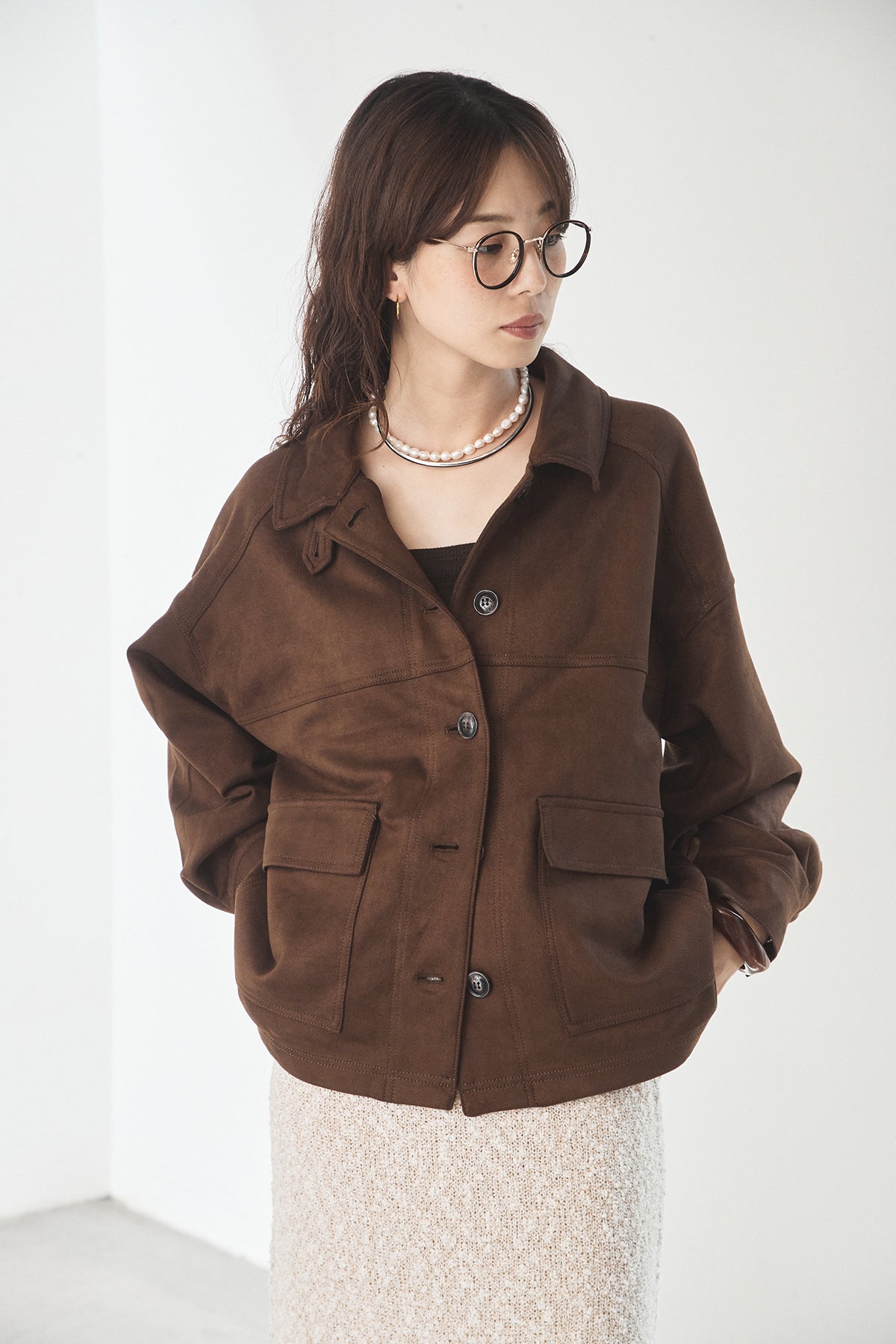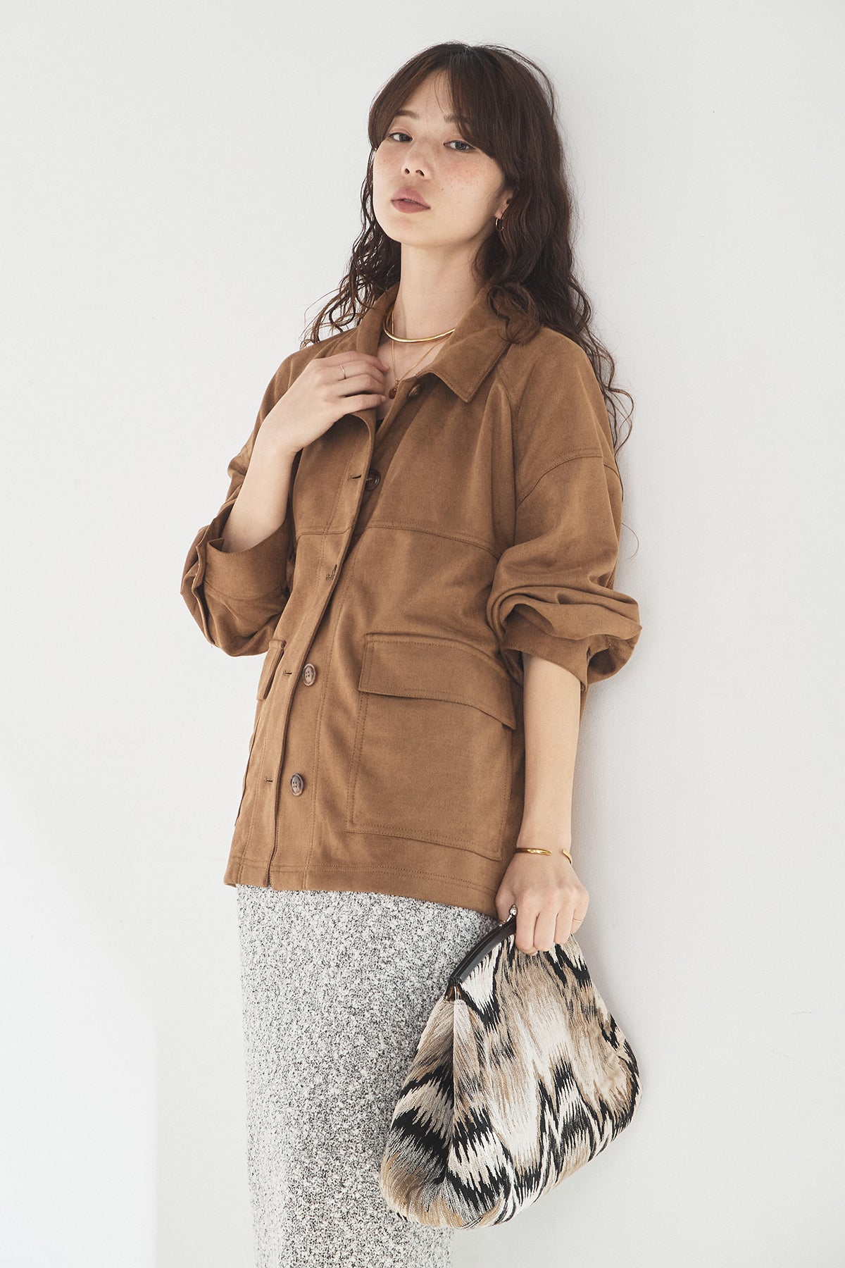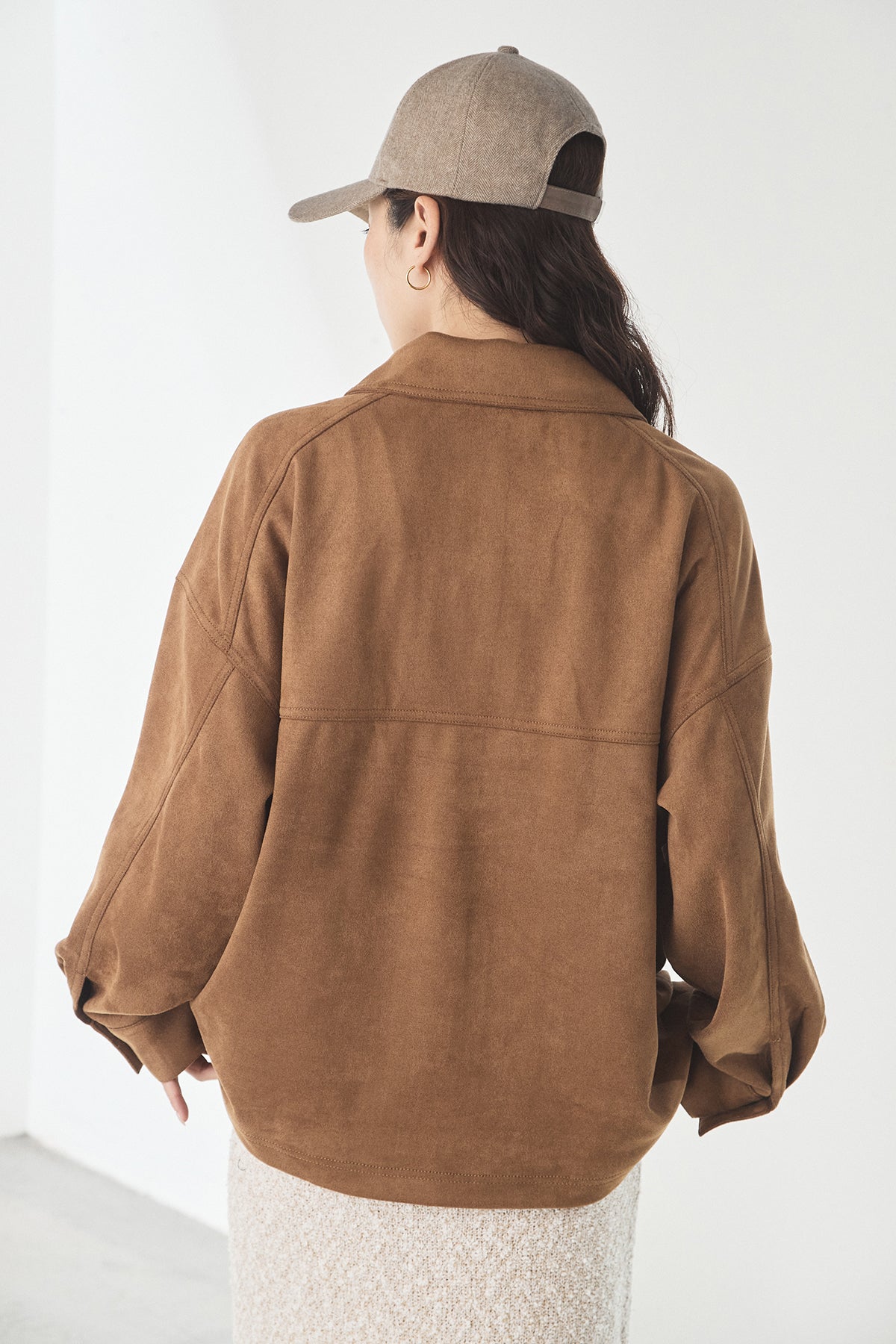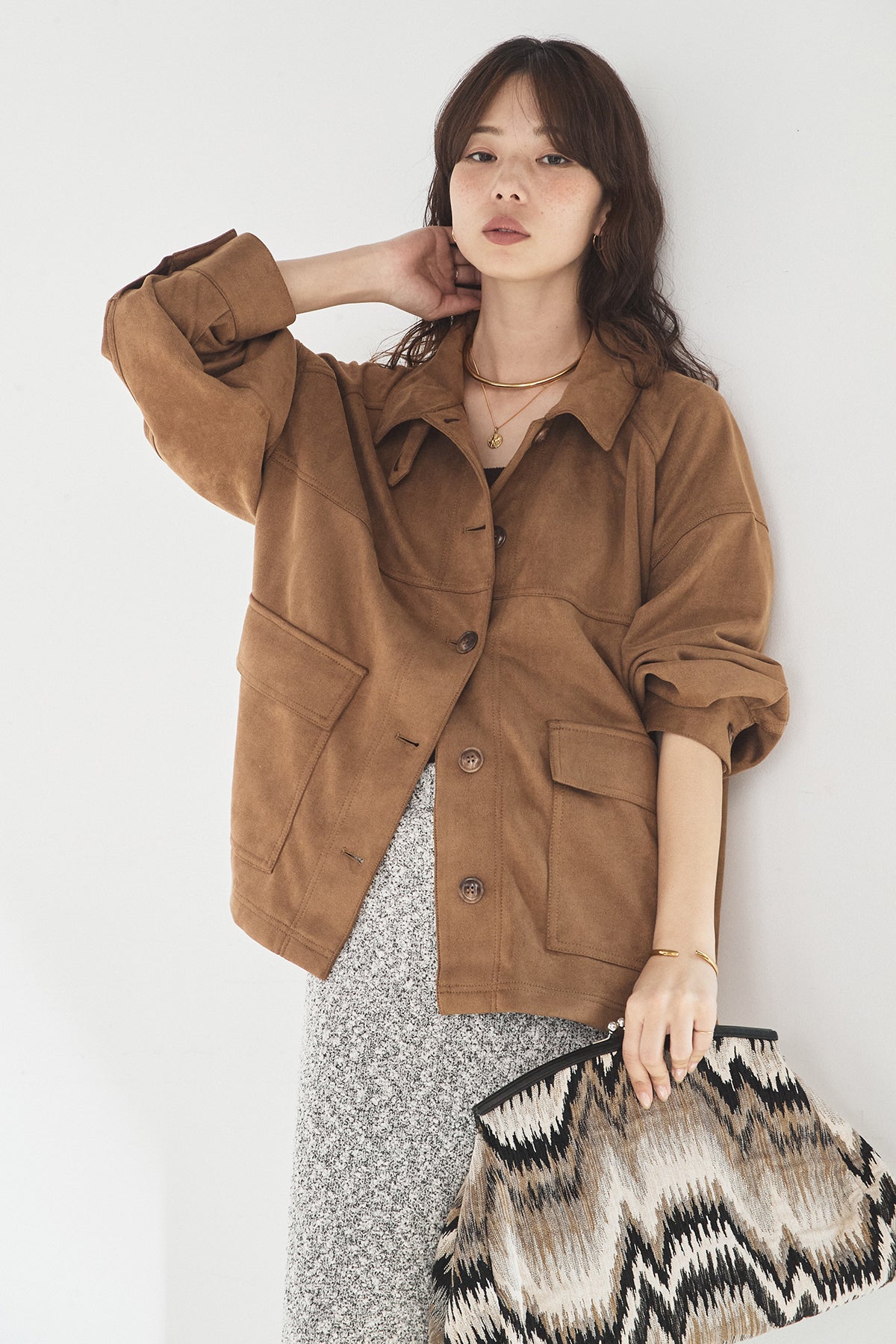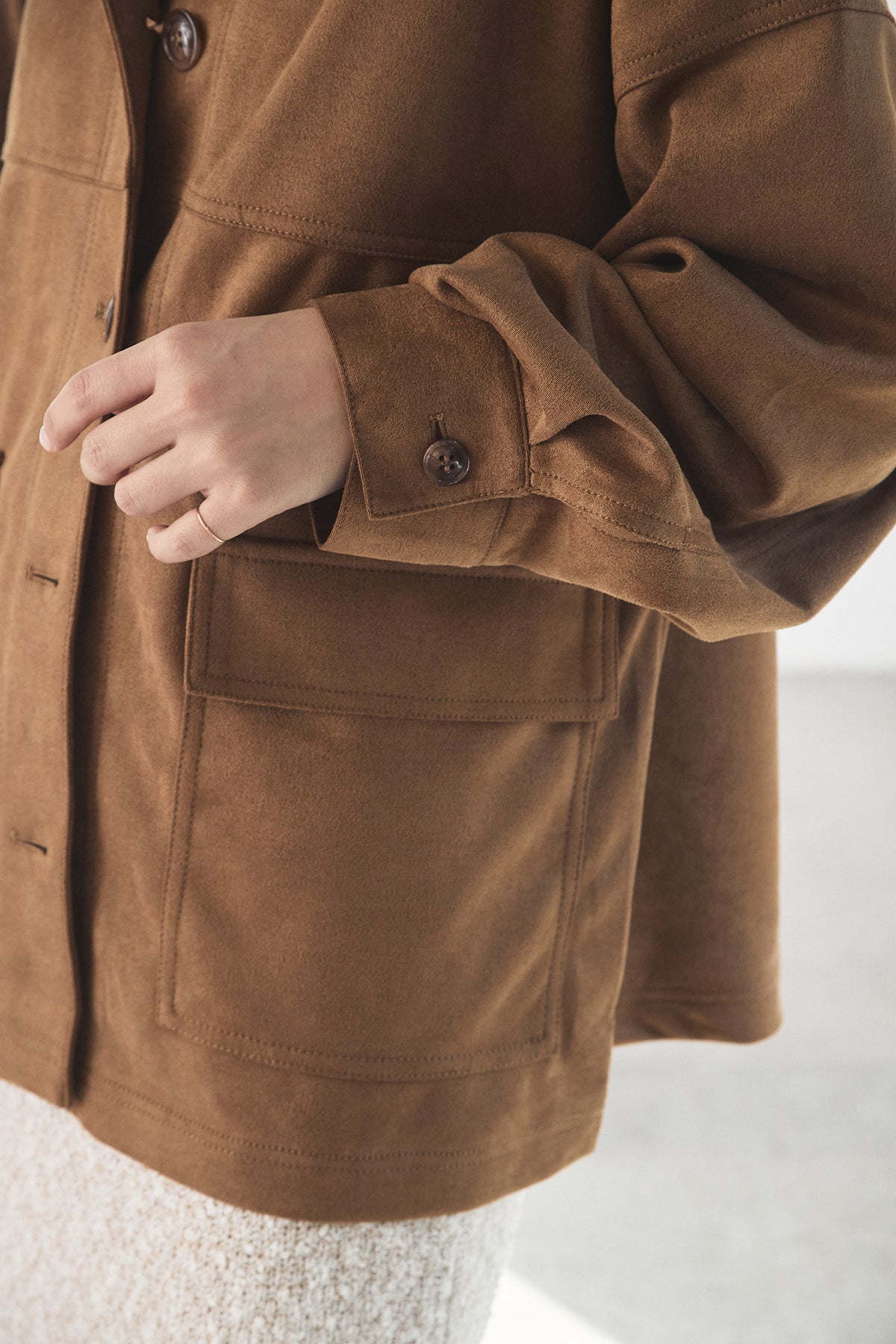 スエード調のエコ素材を使用した、程よくラフな雰囲気のジャケット。フロントの大きめポケットがアクセントになり、シンプルながらも存在感のあるデザインに仕上げています。ゆとりのあるシルエットで、インナーを選ばずさっと羽織れるのも魅力。柔らかな素材感で着心地が良く、カジュアルにもきれいめにも合わせやすい一枚です。