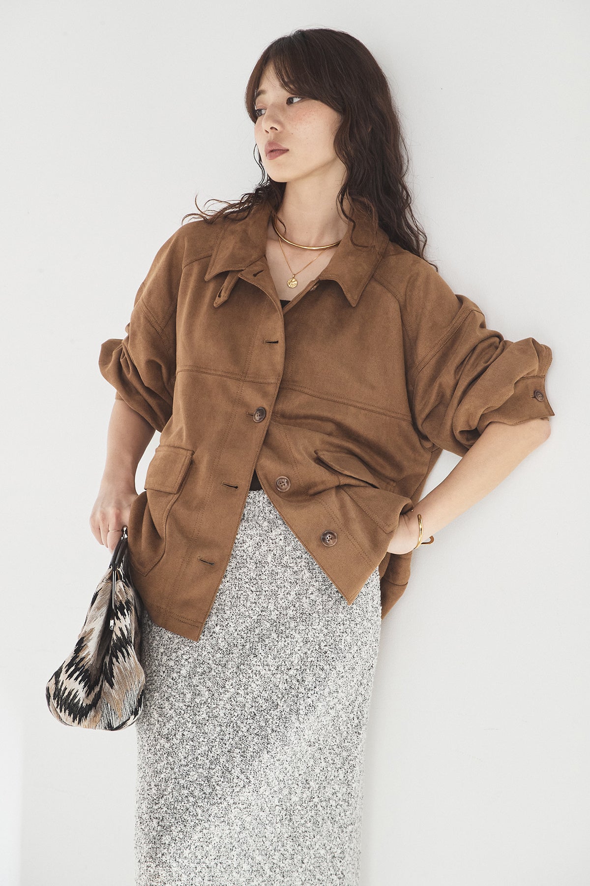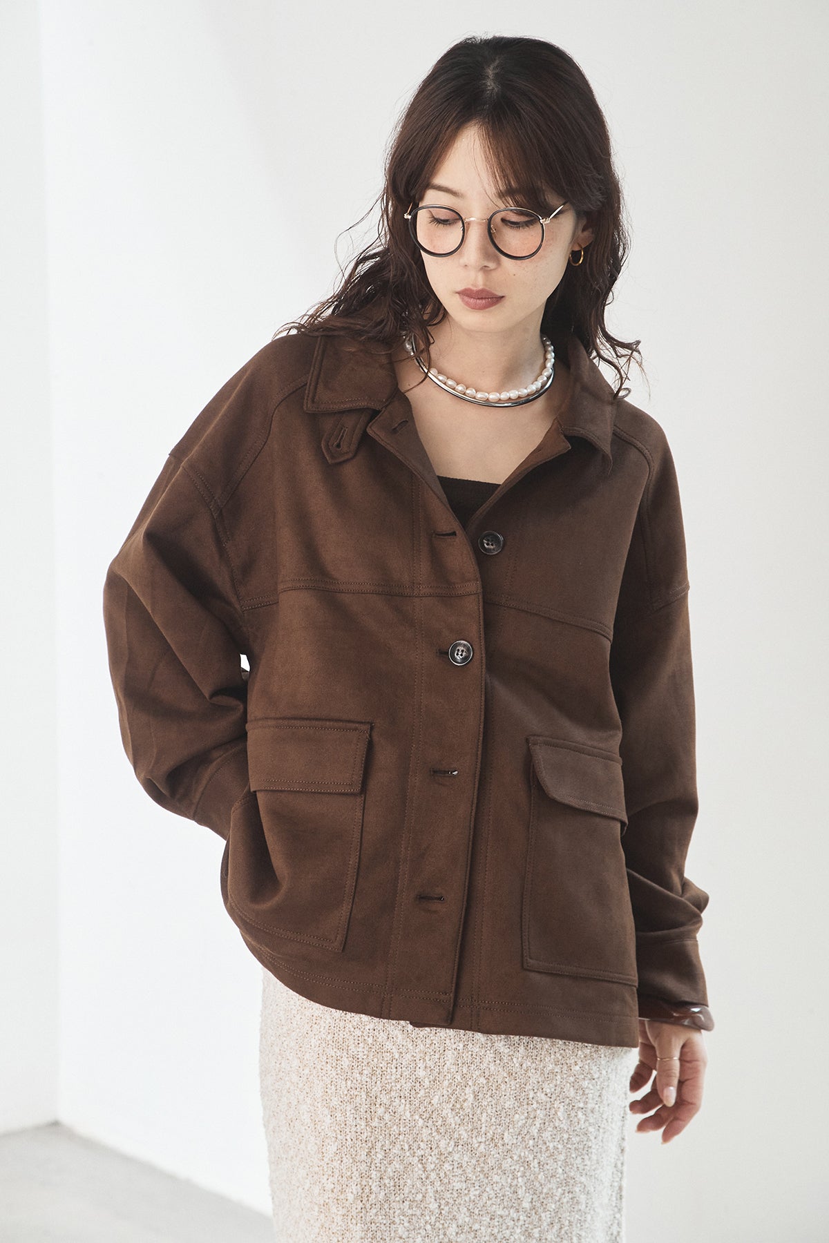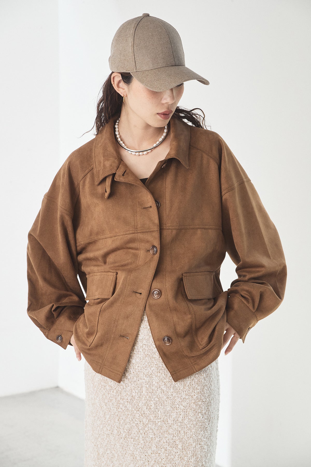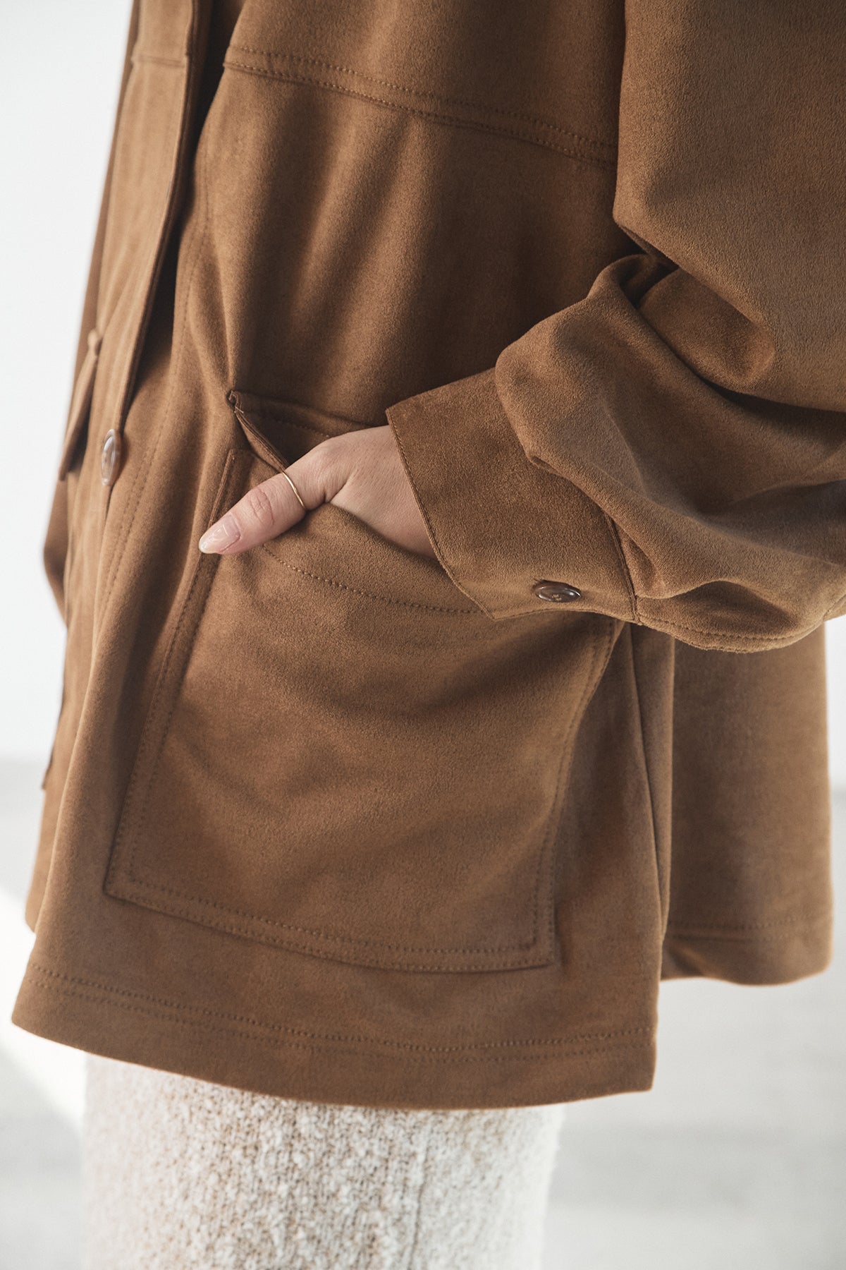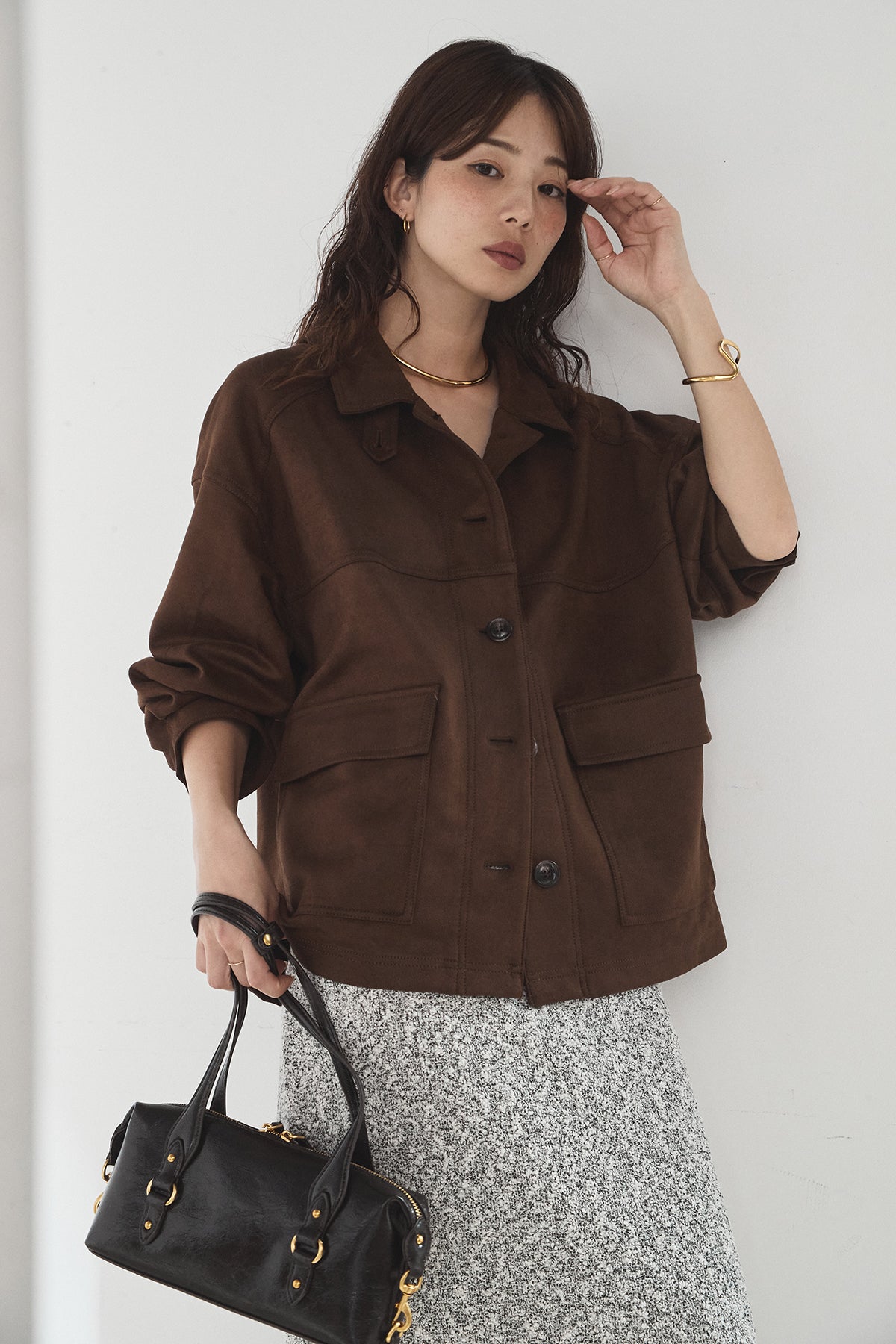 スエード調のエコ素材を使用した、程よくラフな雰囲気のジャケット。フロントの大きめポケットがアクセントになり、シンプルながらも存在感のあるデザインに仕上げています。ゆとりのあるシルエットで、インナーを選ばずさっと羽織れるのも魅力。柔らかな素材感で着心地が良く、カジュアルにもきれいめにも合わせやすい一枚です。