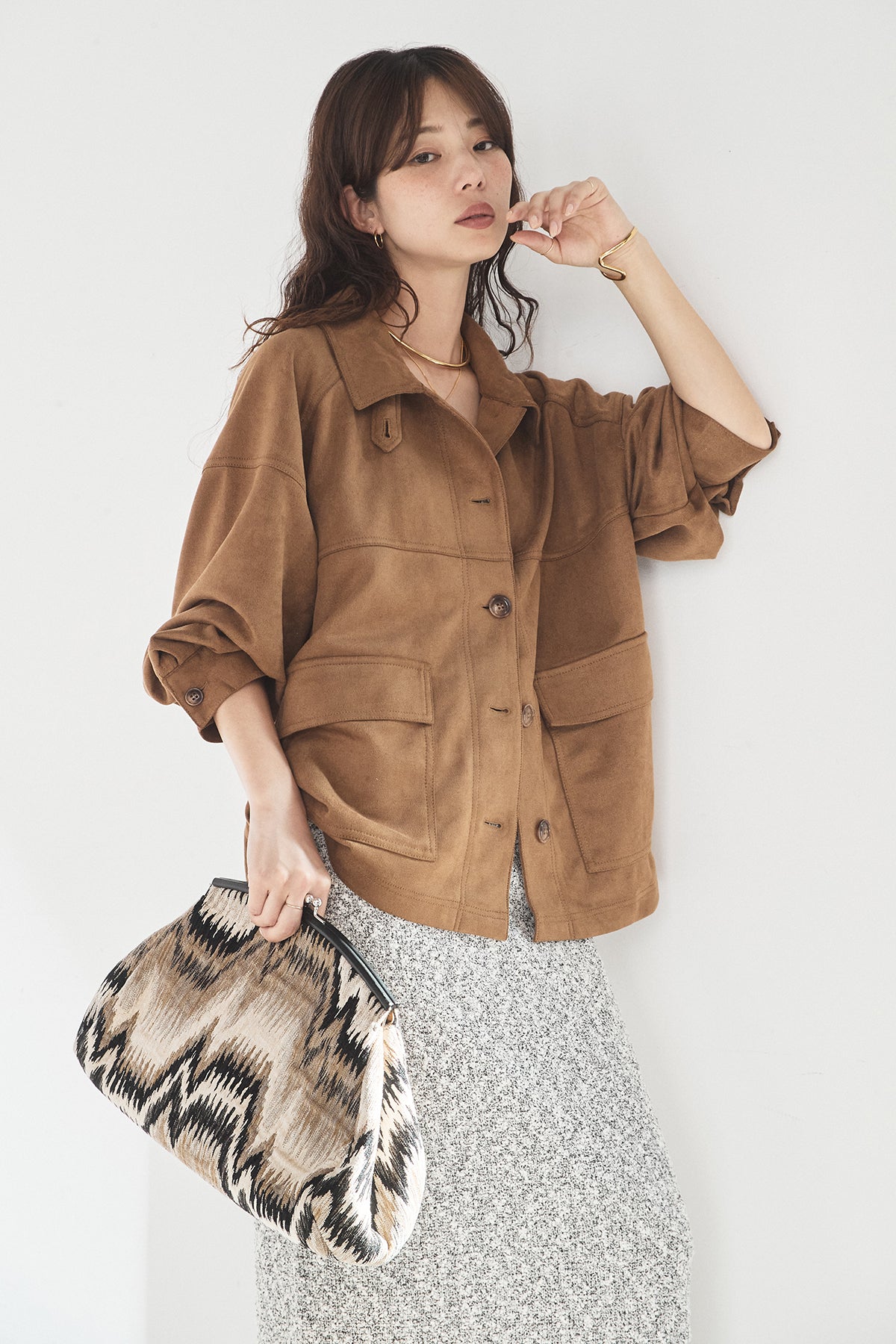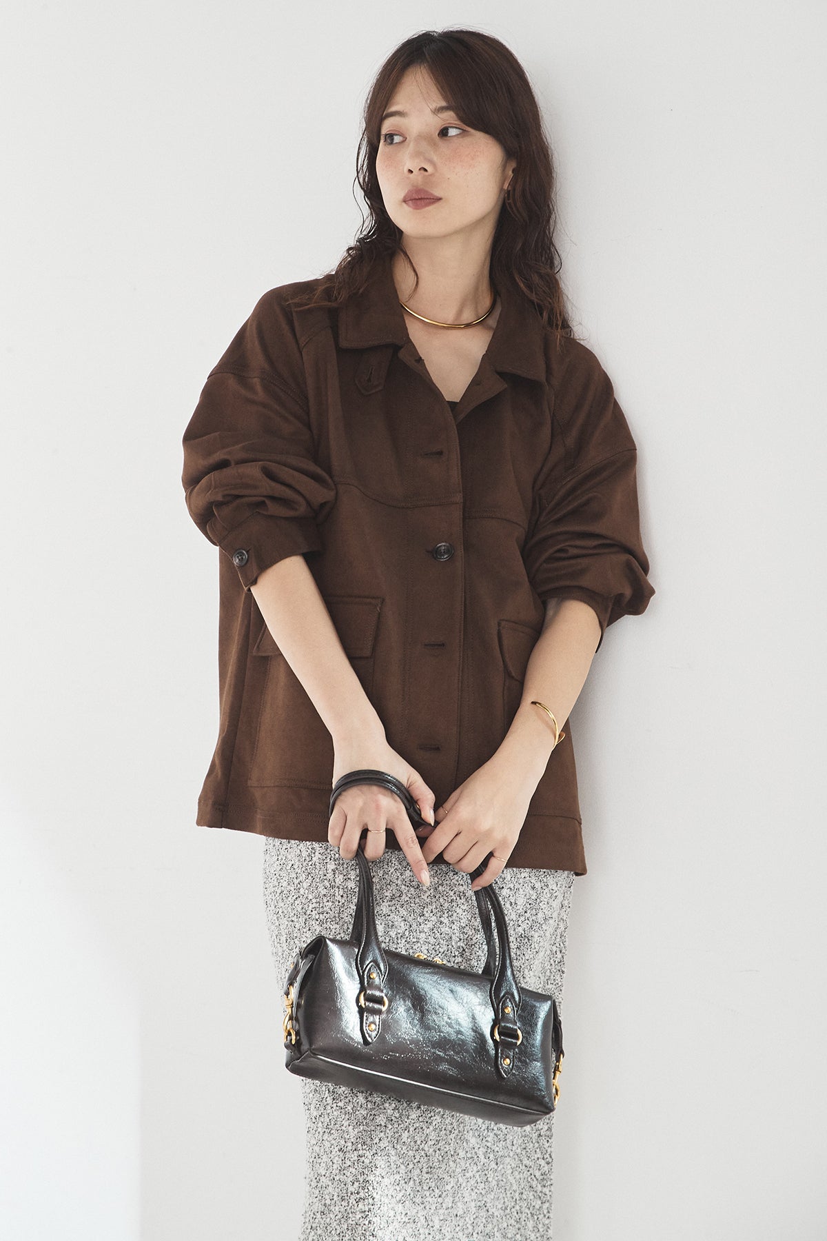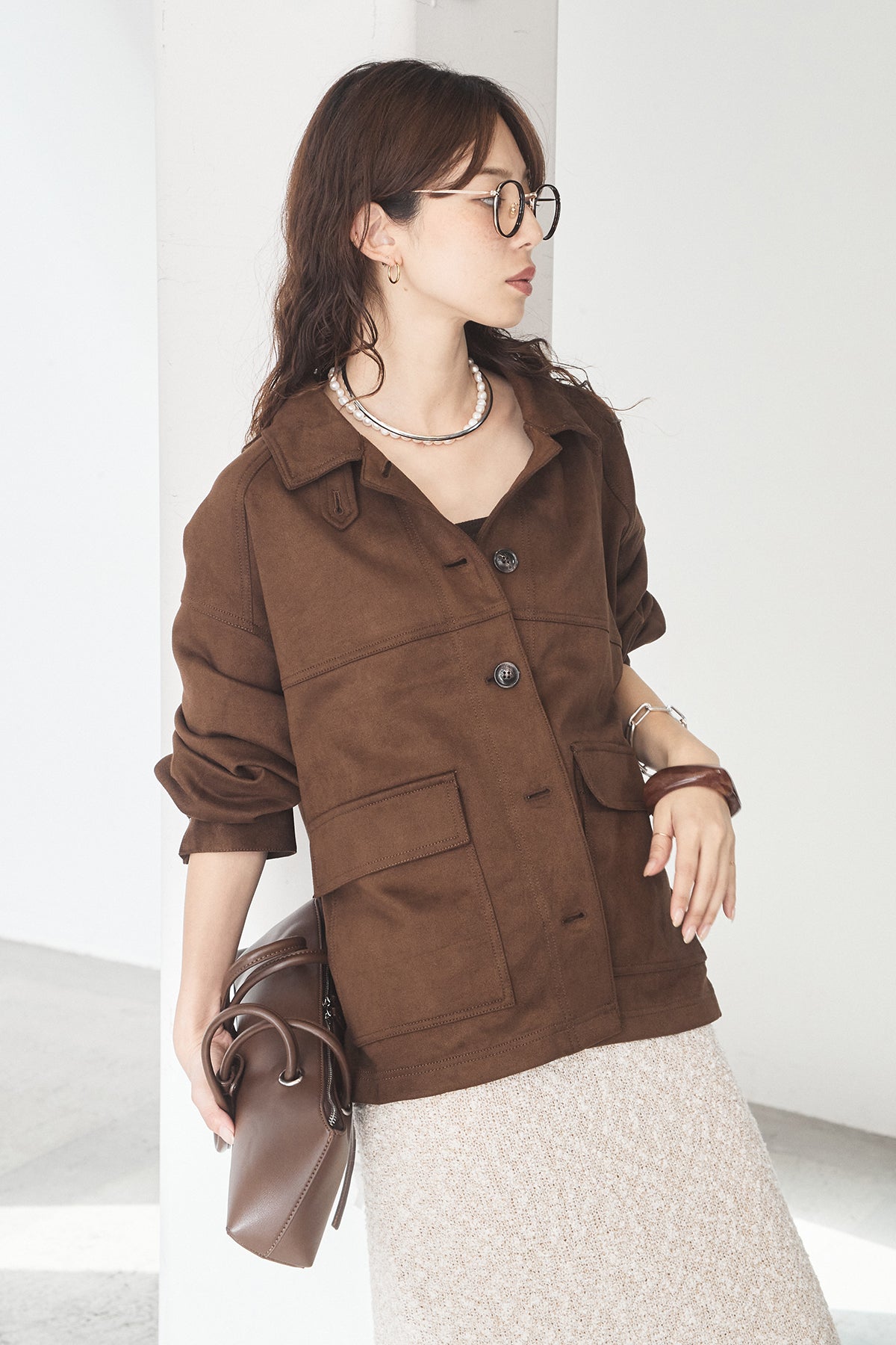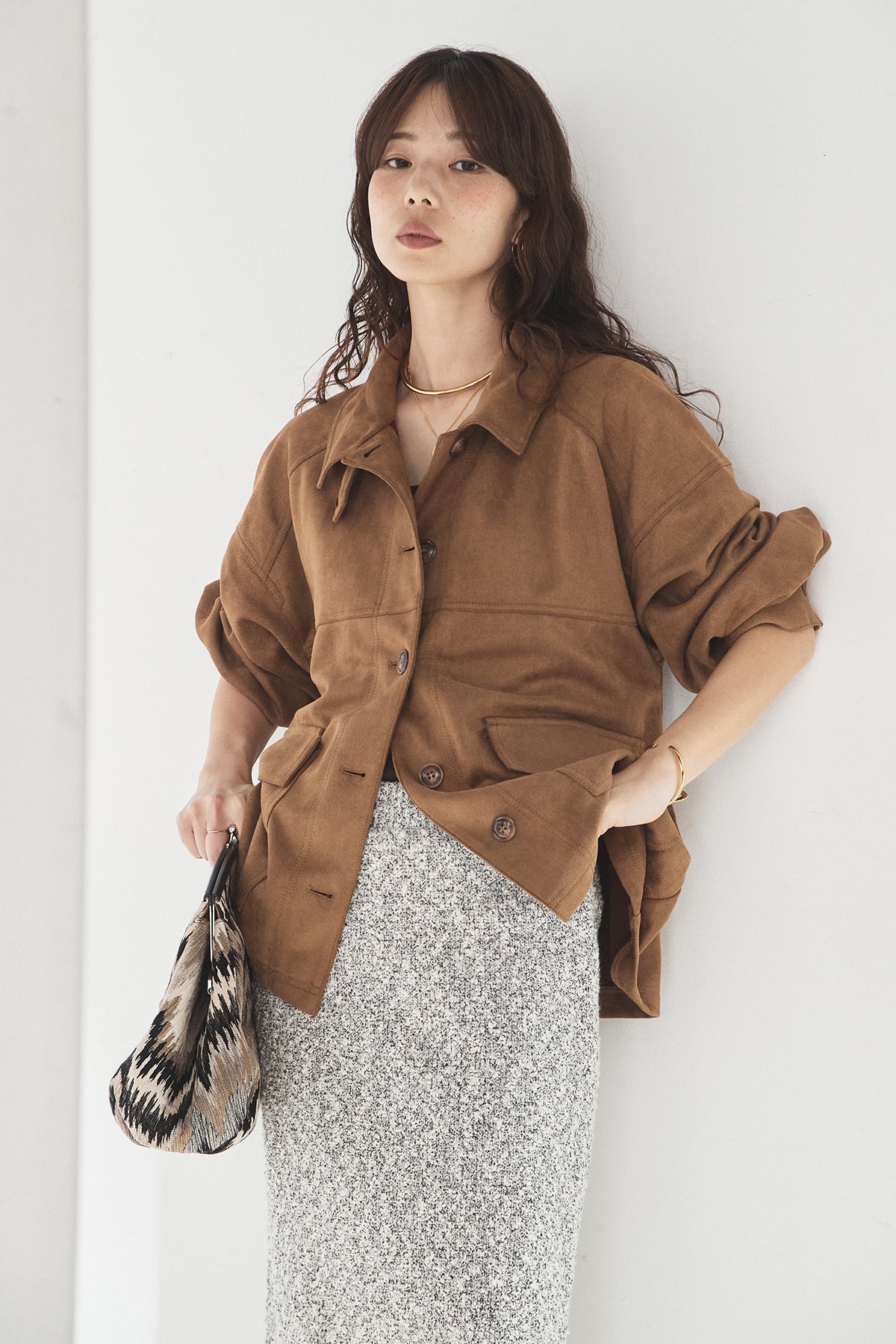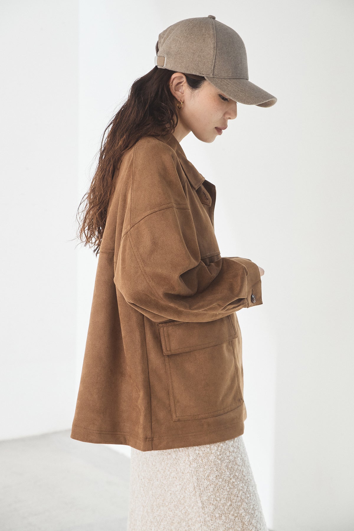 スエード調のエコ素材を使用した、程よくラフな雰囲気のジャケット。フロントの大きめポケットがアクセントになり、シンプルながらも存在感のあるデザインに仕上げています。ゆとりのあるシルエットで、インナーを選ばずさっと羽織れるのも魅力。柔らかな素材感で着心地が良く、カジュアルにもきれいめにも合わせやすい一枚です。