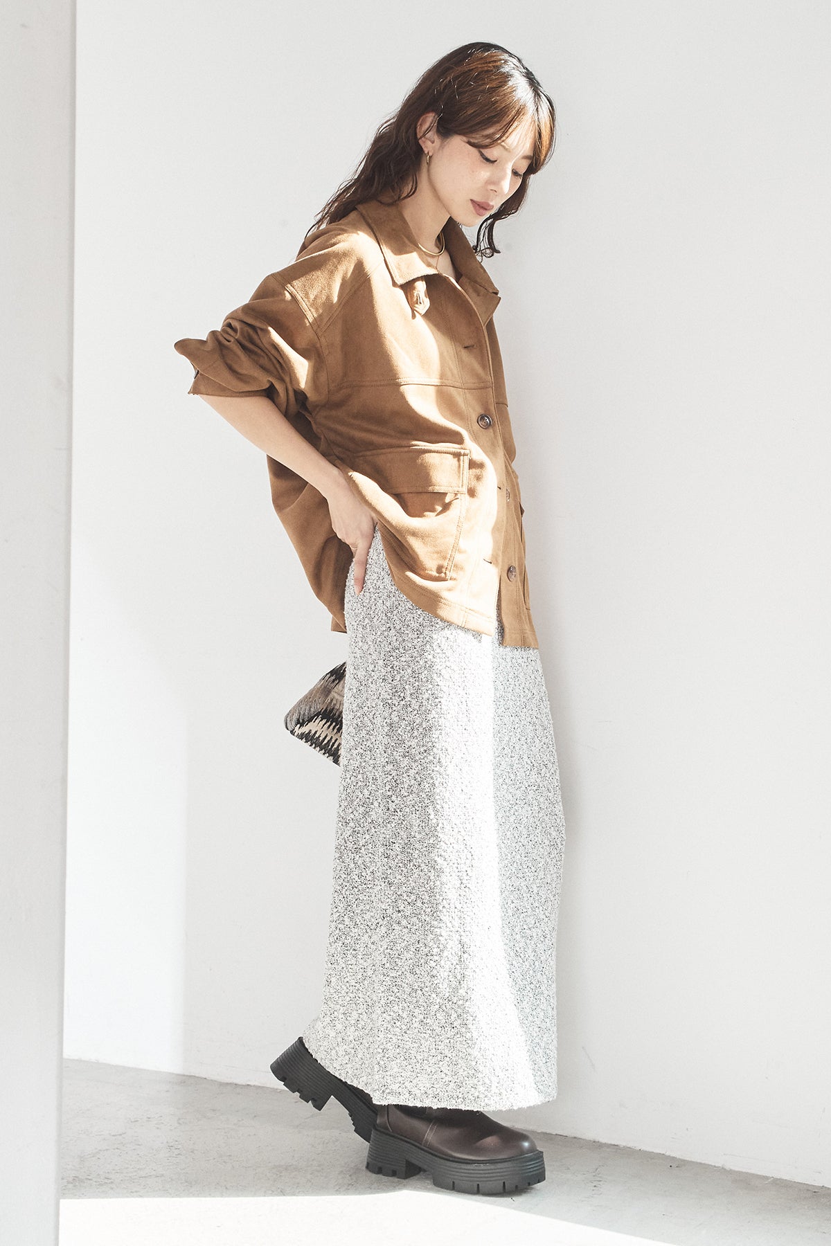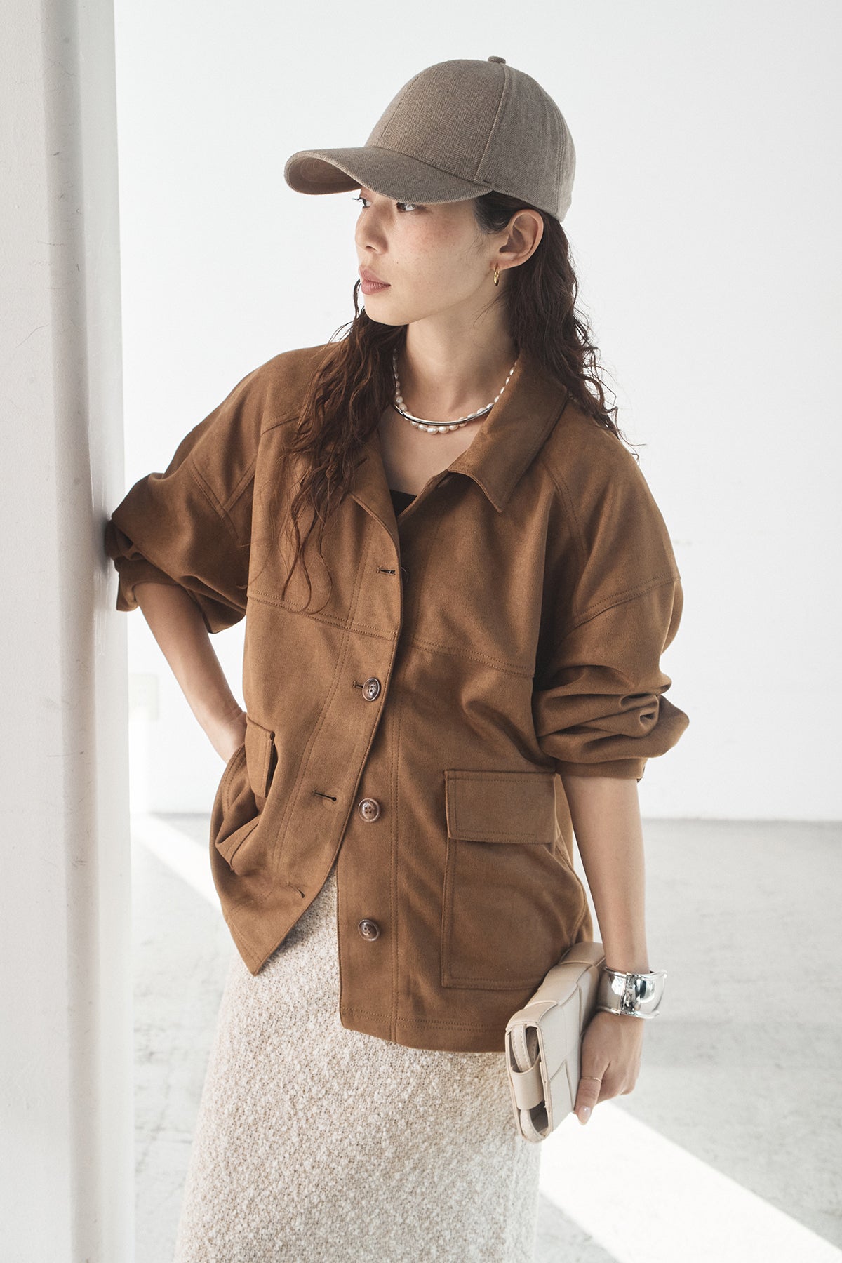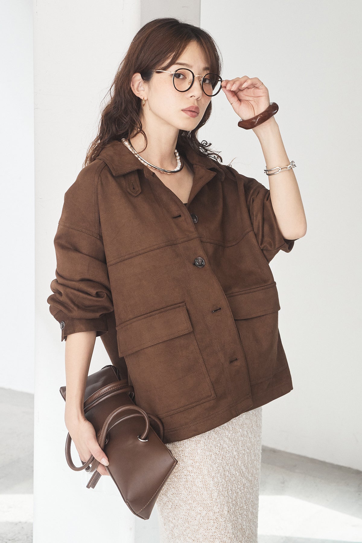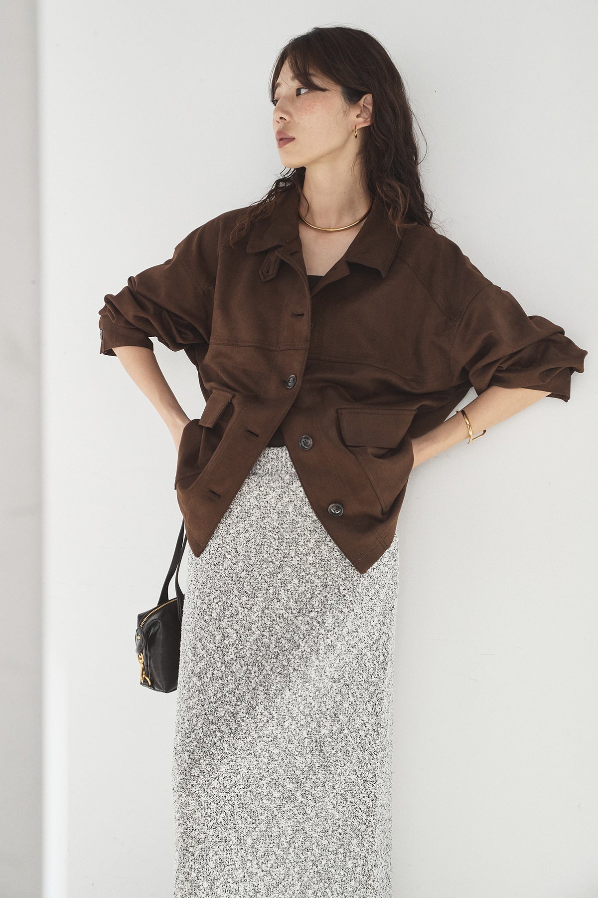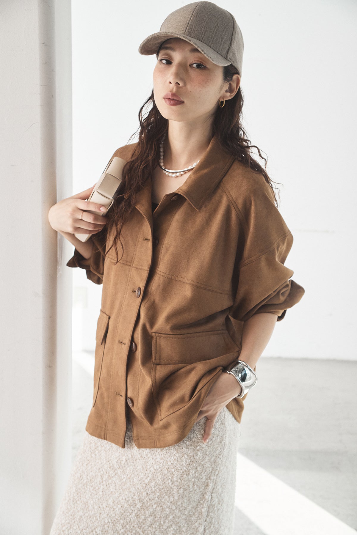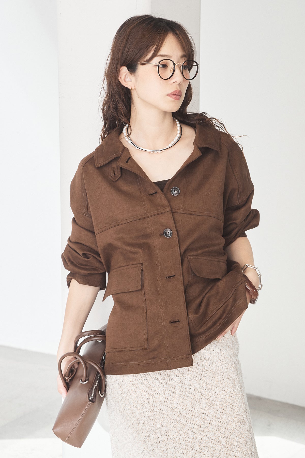 スエード調のエコ素材を使用した、程よくラフな雰囲気のジャケット。フロントの大きめポケットがアクセントになり、シンプルながらも存在感のあるデザインに仕上げています。ゆとりのあるシルエットで、インナーを選ばずさっと羽織れるのも魅力。柔らかな素材感で着心地が良く、カジュアルにもきれいめにも合わせやすい一枚です。