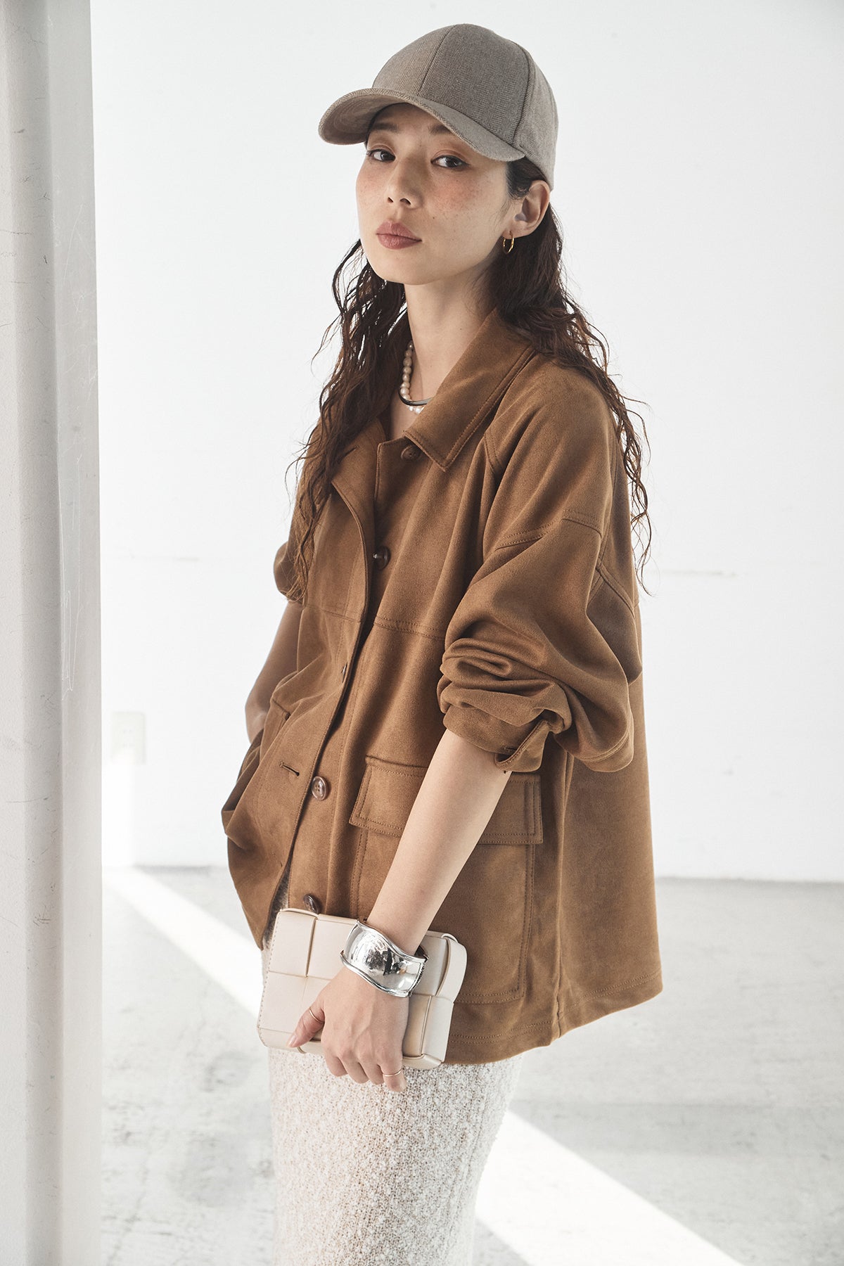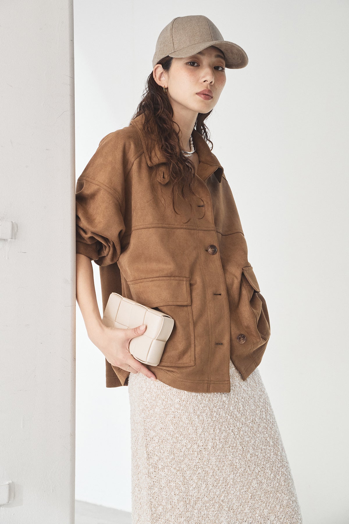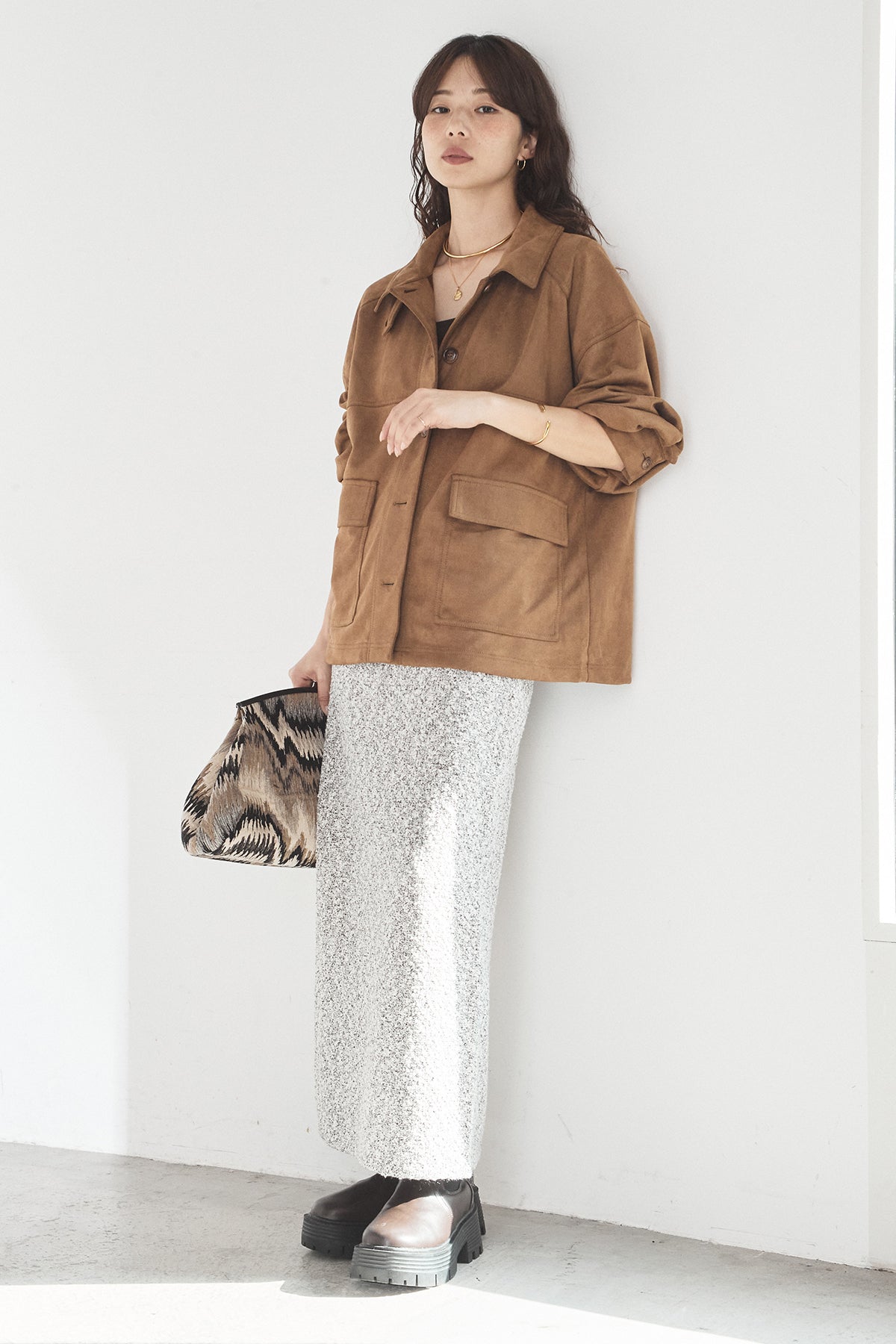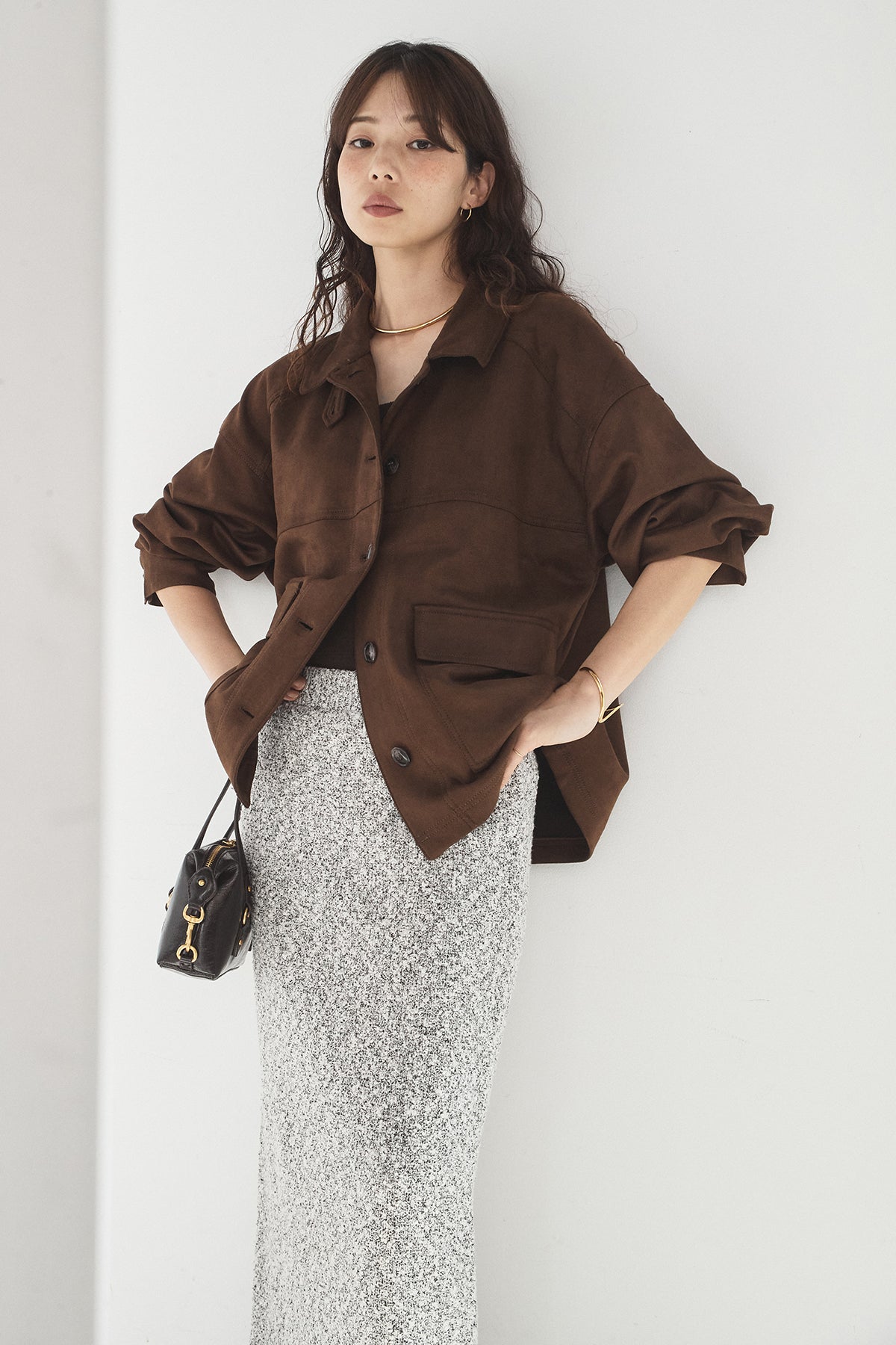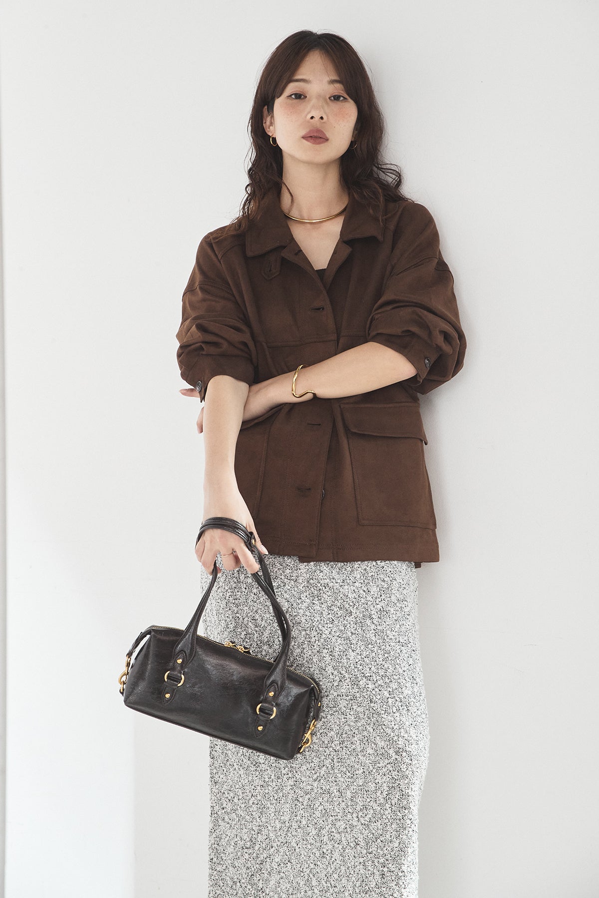 スエード調のエコ素材を使用した、程よくラフな雰囲気のジャケット。フロントの大きめポケットがアクセントになり、シンプルながらも存在感のあるデザインに仕上げています。ゆとりのあるシルエットで、インナーを選ばずさっと羽織れるのも魅力。柔らかな素材感で着心地が良く、カジュアルにもきれいめにも合わせやすい一枚です。