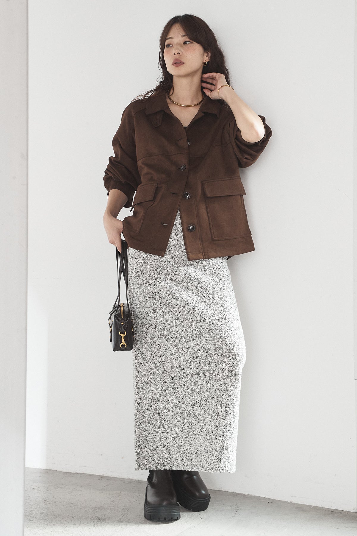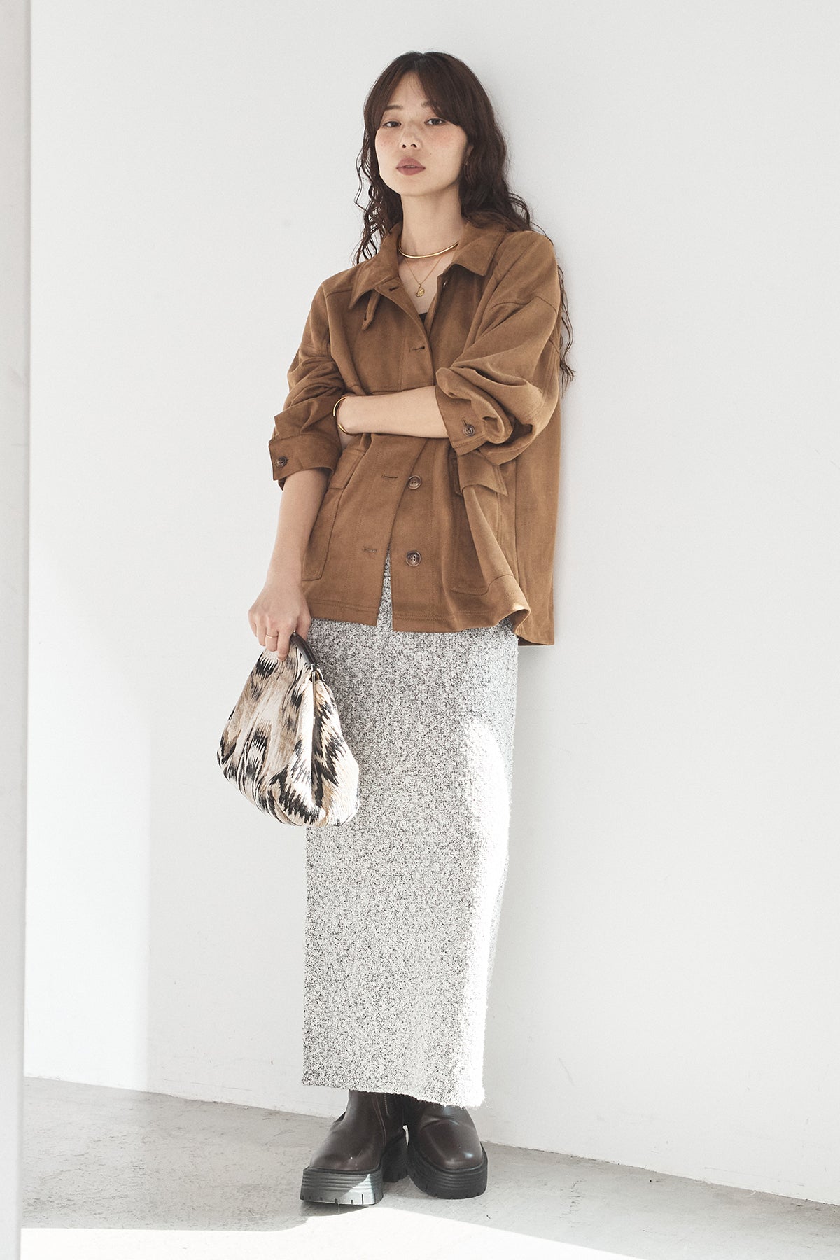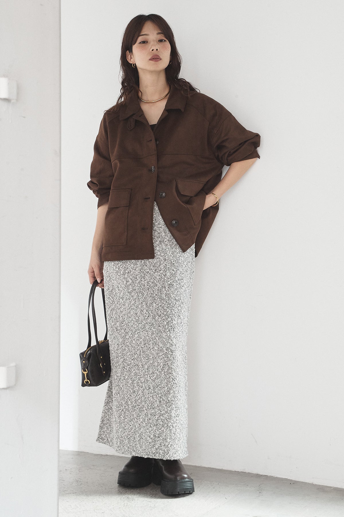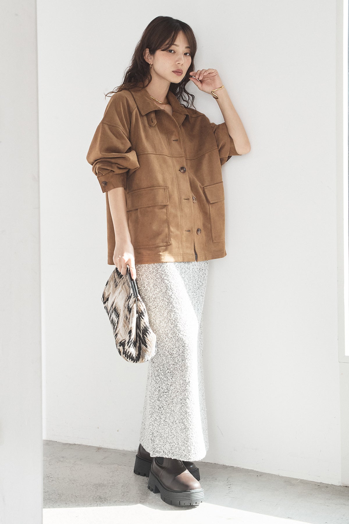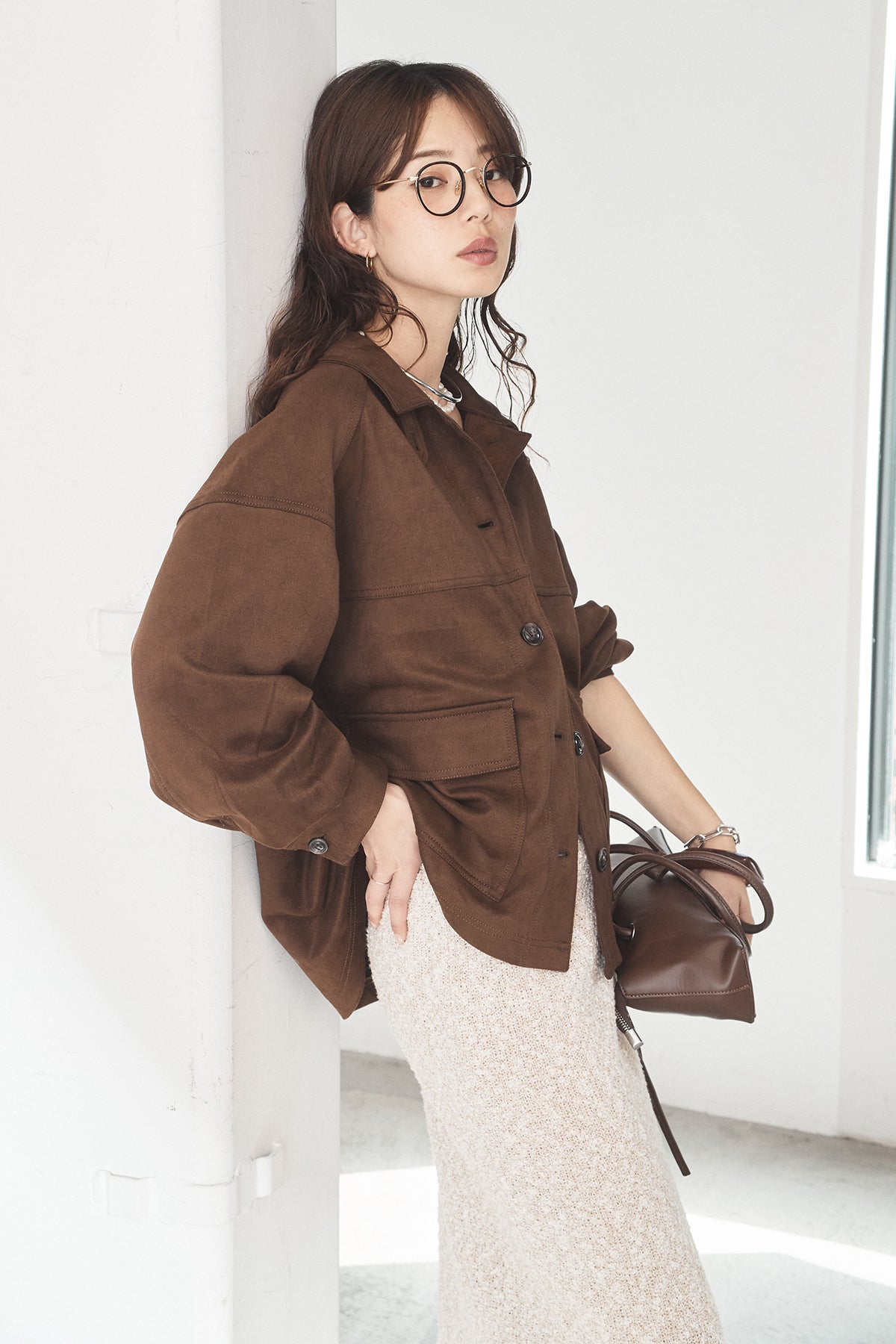 スエード調のエコ素材を使用した、程よくラフな雰囲気のジャケット。フロントの大きめポケットがアクセントになり、シンプルながらも存在感のあるデザインに仕上げています。ゆとりのあるシルエットで、インナーを選ばずさっと羽織れるのも魅力。柔らかな素材感で着心地が良く、カジュアルにもきれいめにも合わせやすい一枚です。