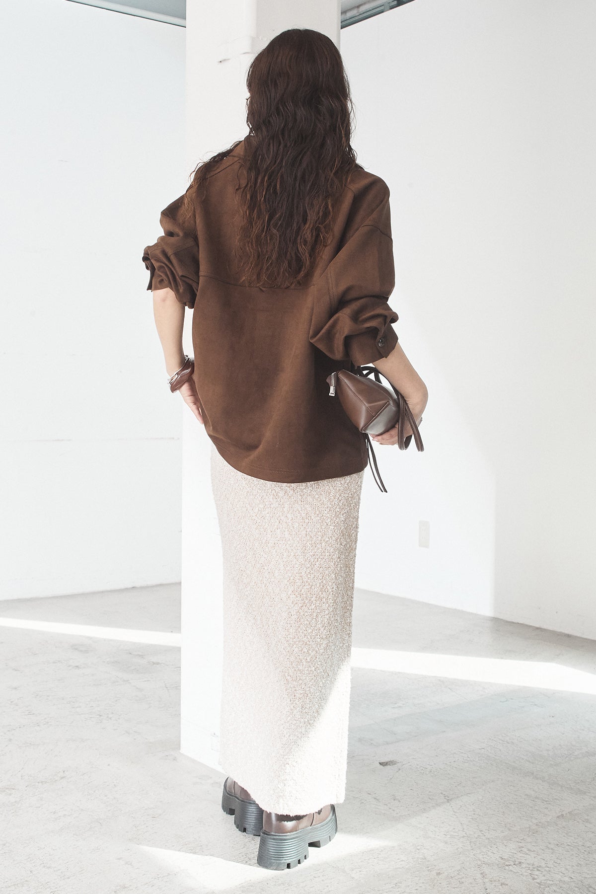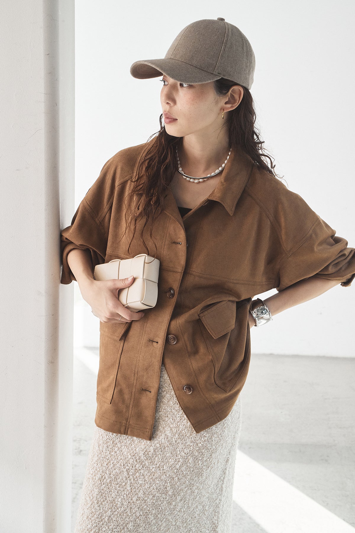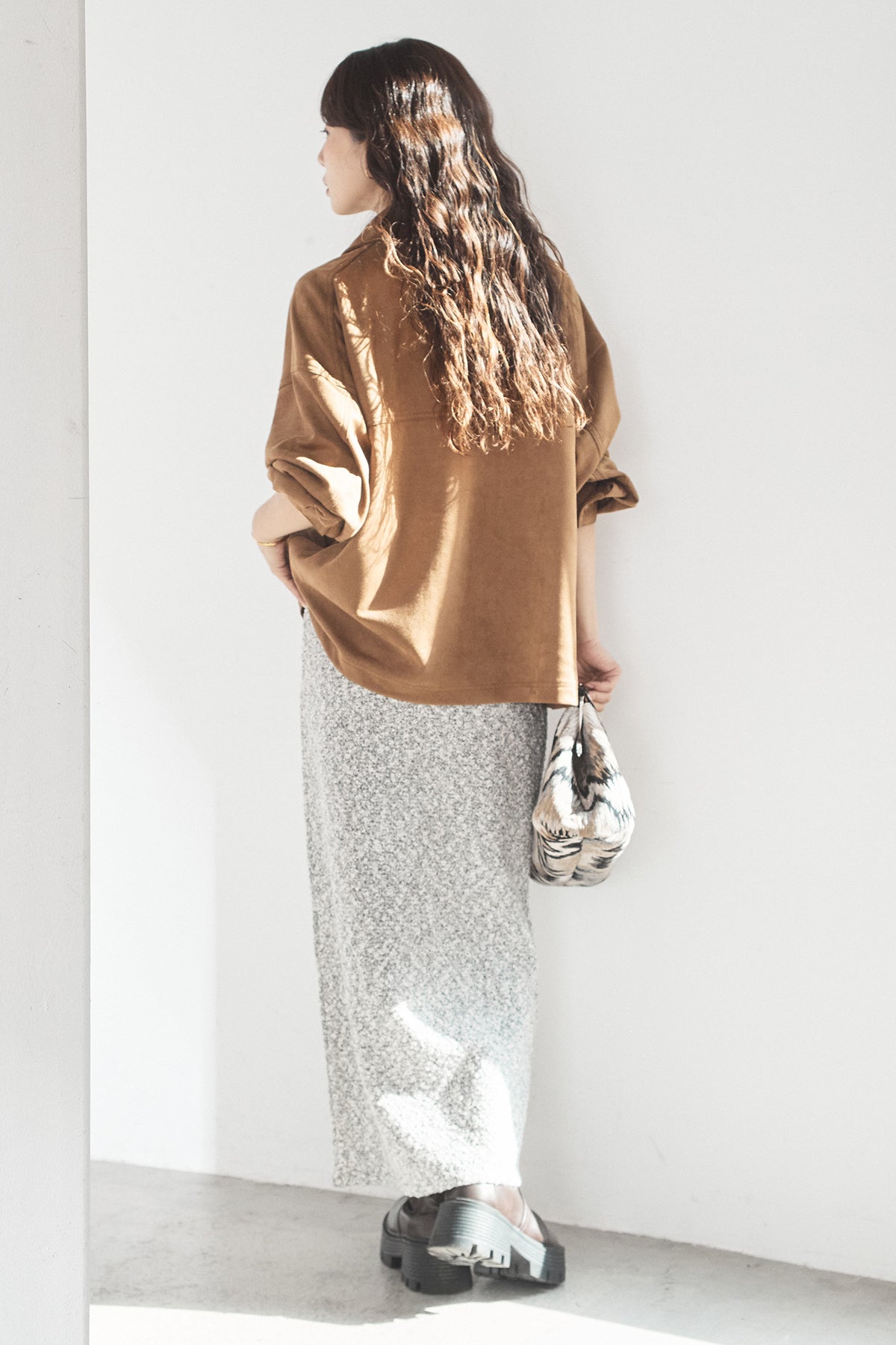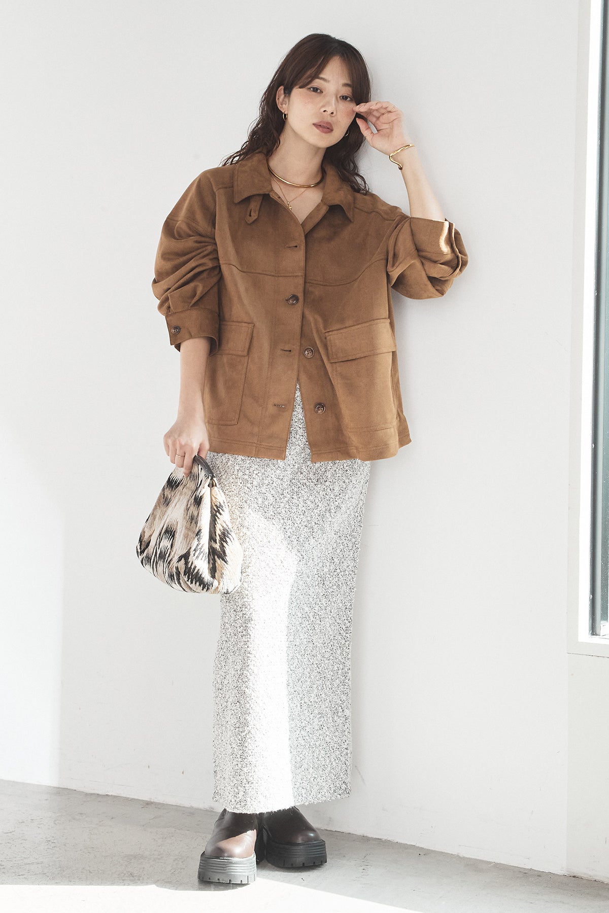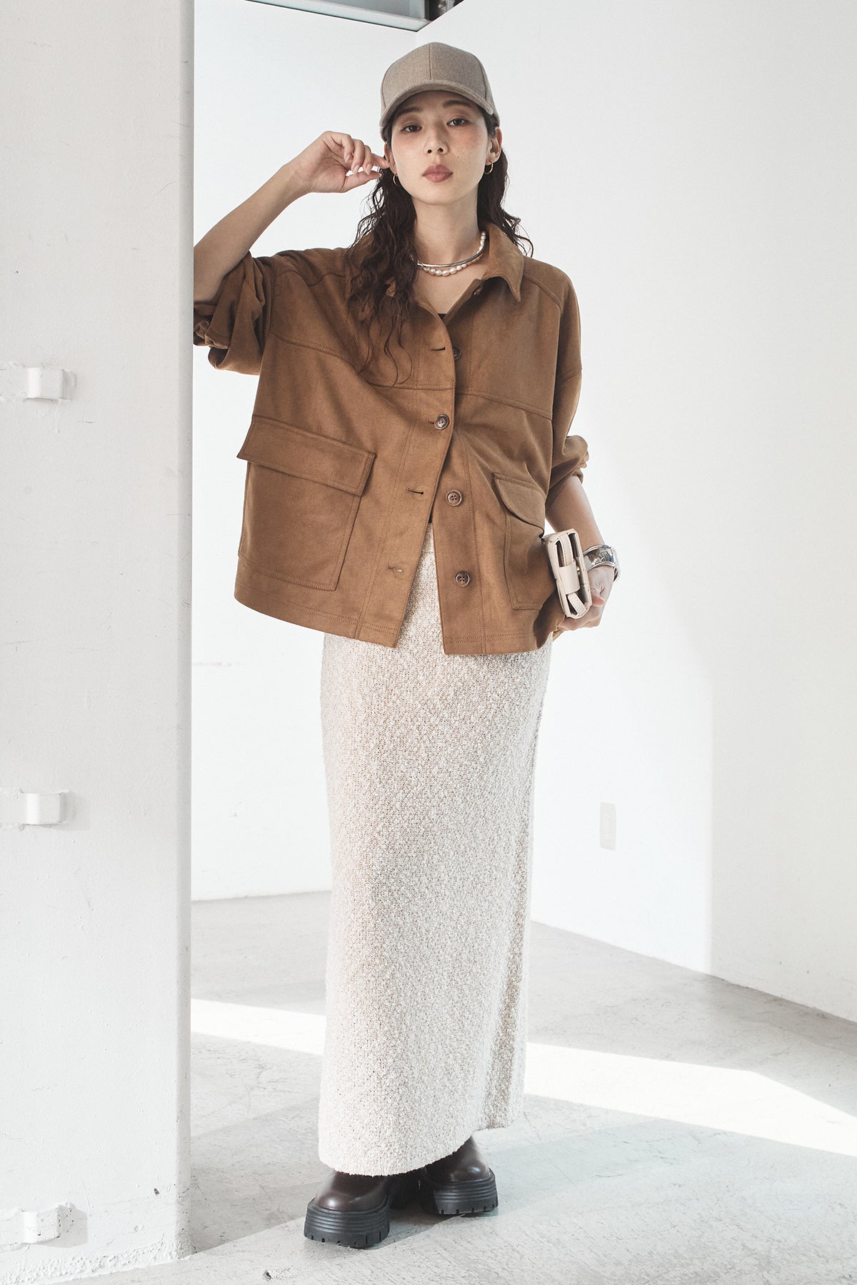 スエード調のエコ素材を使用した、程よくラフな雰囲気のジャケット。フロントの大きめポケットがアクセントになり、シンプルながらも存在感のあるデザインに仕上げています。ゆとりのあるシルエットで、インナーを選ばずさっと羽織れるのも魅力。柔らかな素材感で着心地が良く、カジュアルにもきれいめにも合わせやすい一枚です。