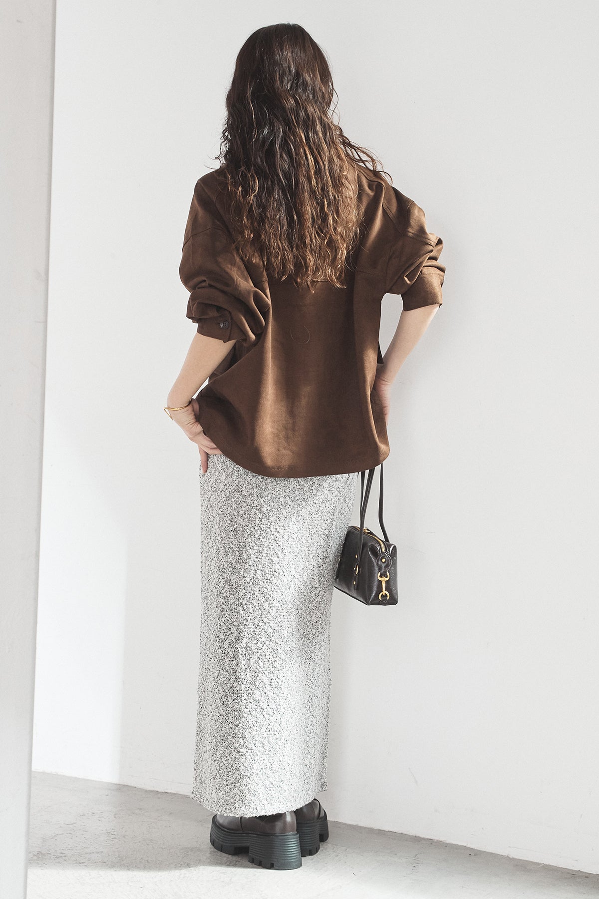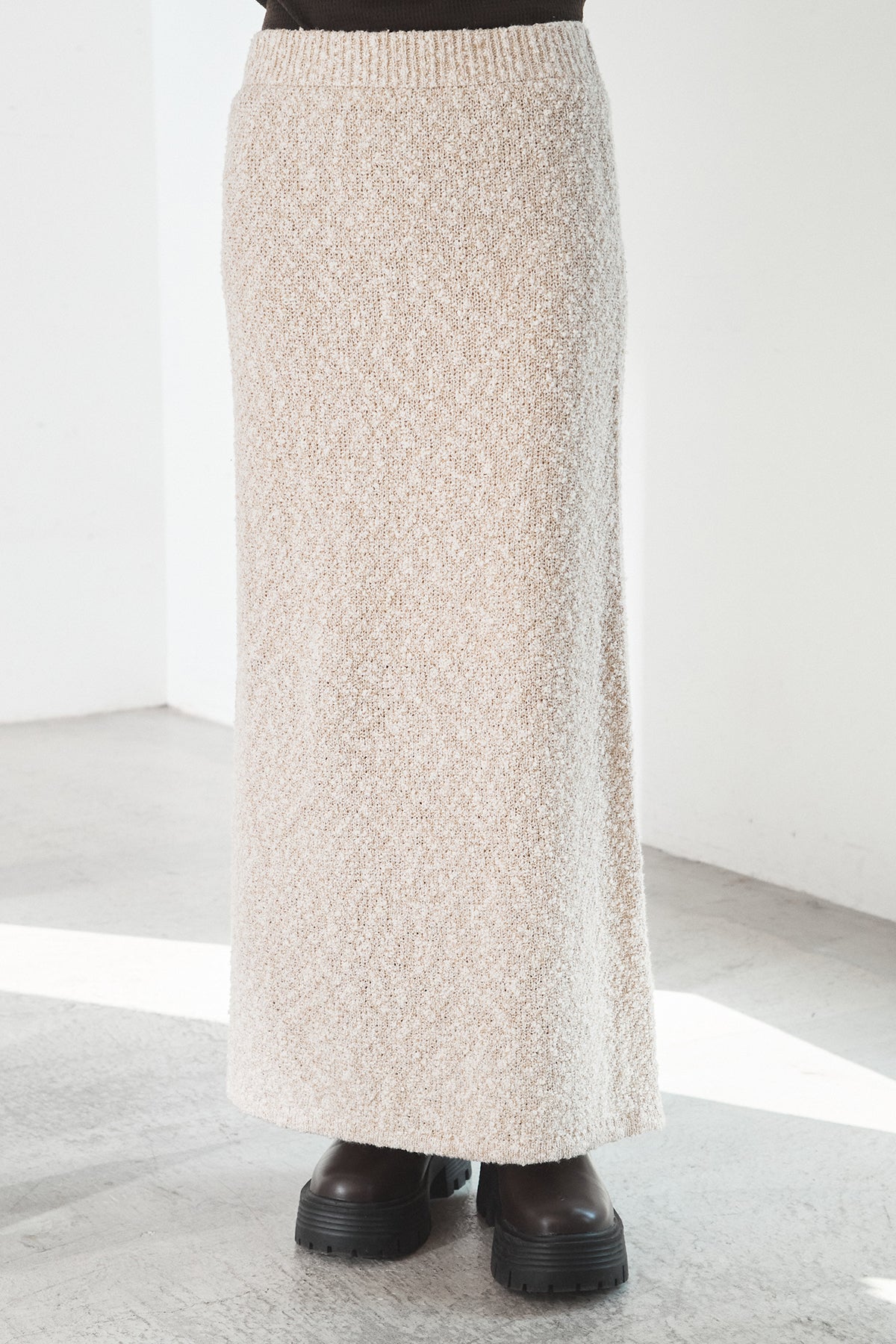 ツイード調の表情豊かな素材感が目を引く、MIXスラブスカート。複数の糸を織り交ぜたようなニュアンスのある風合いで、シンプルながらも奥行きのある印象に仕上げています。すとんと落ちるIラインシルエットが縦のラインを強調し、すっきりとしたバランスを演出。ウエストはゴム仕様で、リラックスした穿き心地も魅力です。ニットやスウェットなど幅広いトップスと好相性で、季節感のあるスタイリングに活躍します。