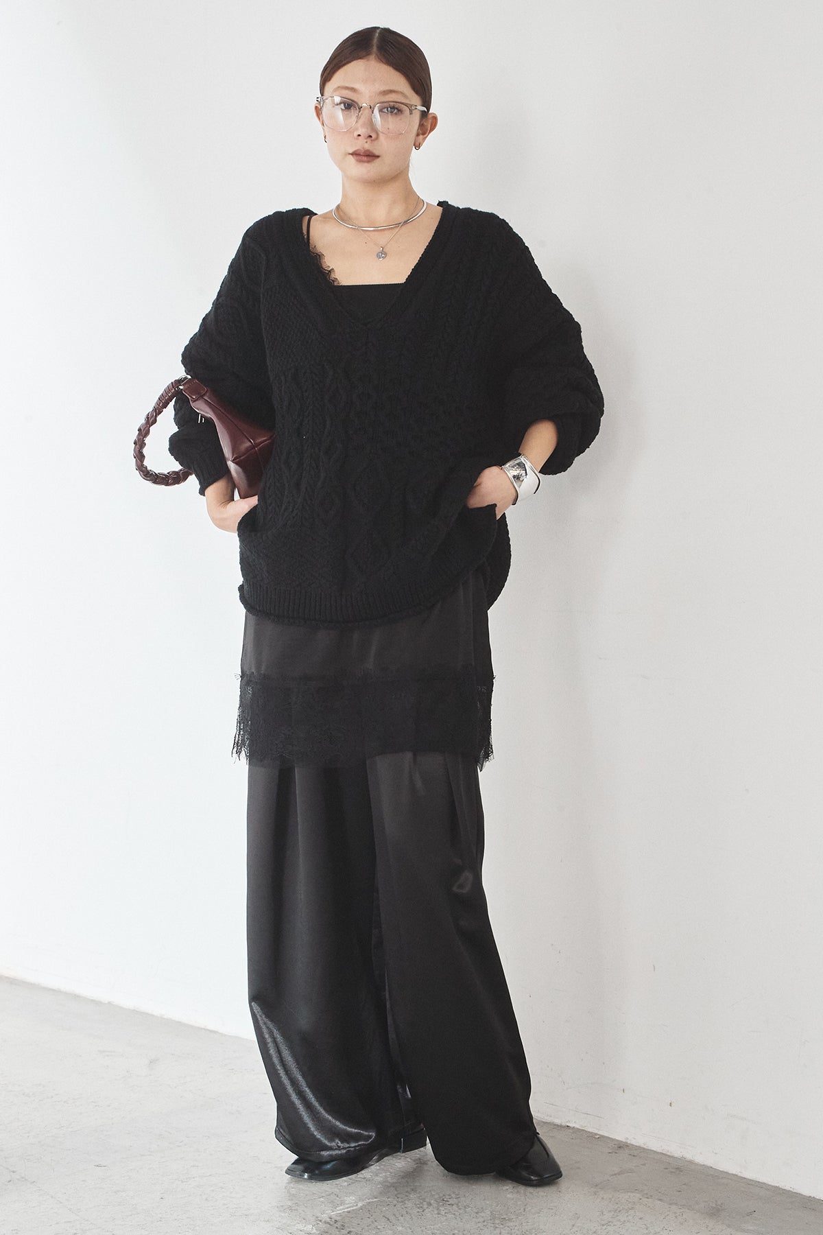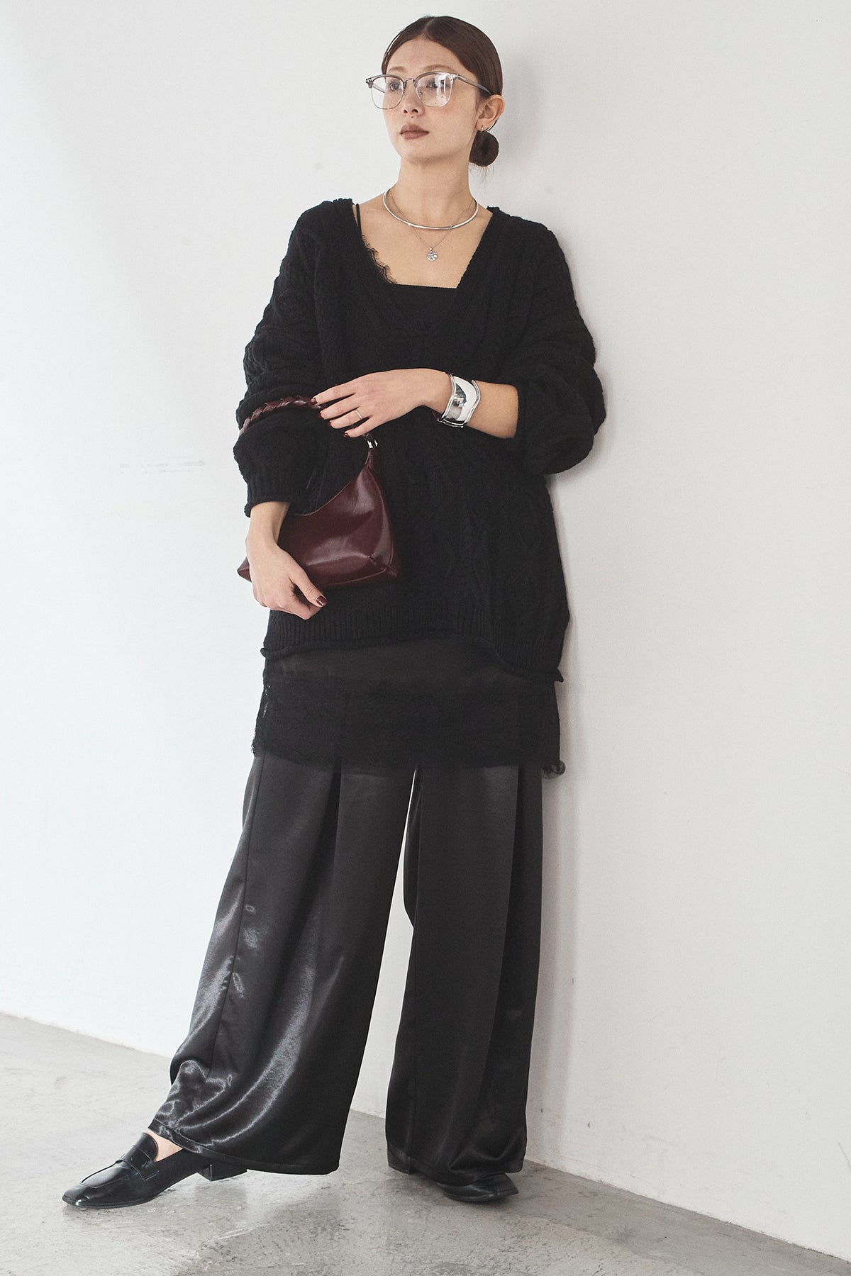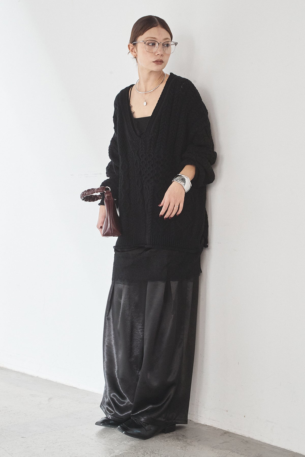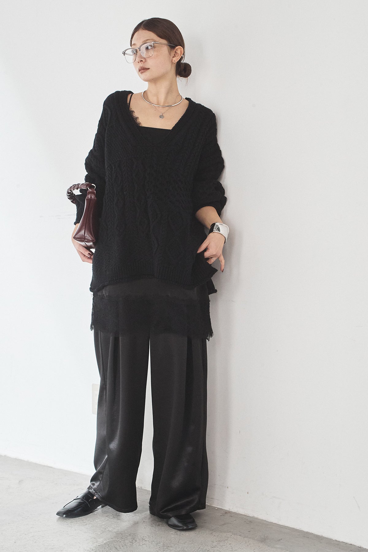 [SET]ケーブルVニットセーター+サテンタックワイドパンツ(2set)