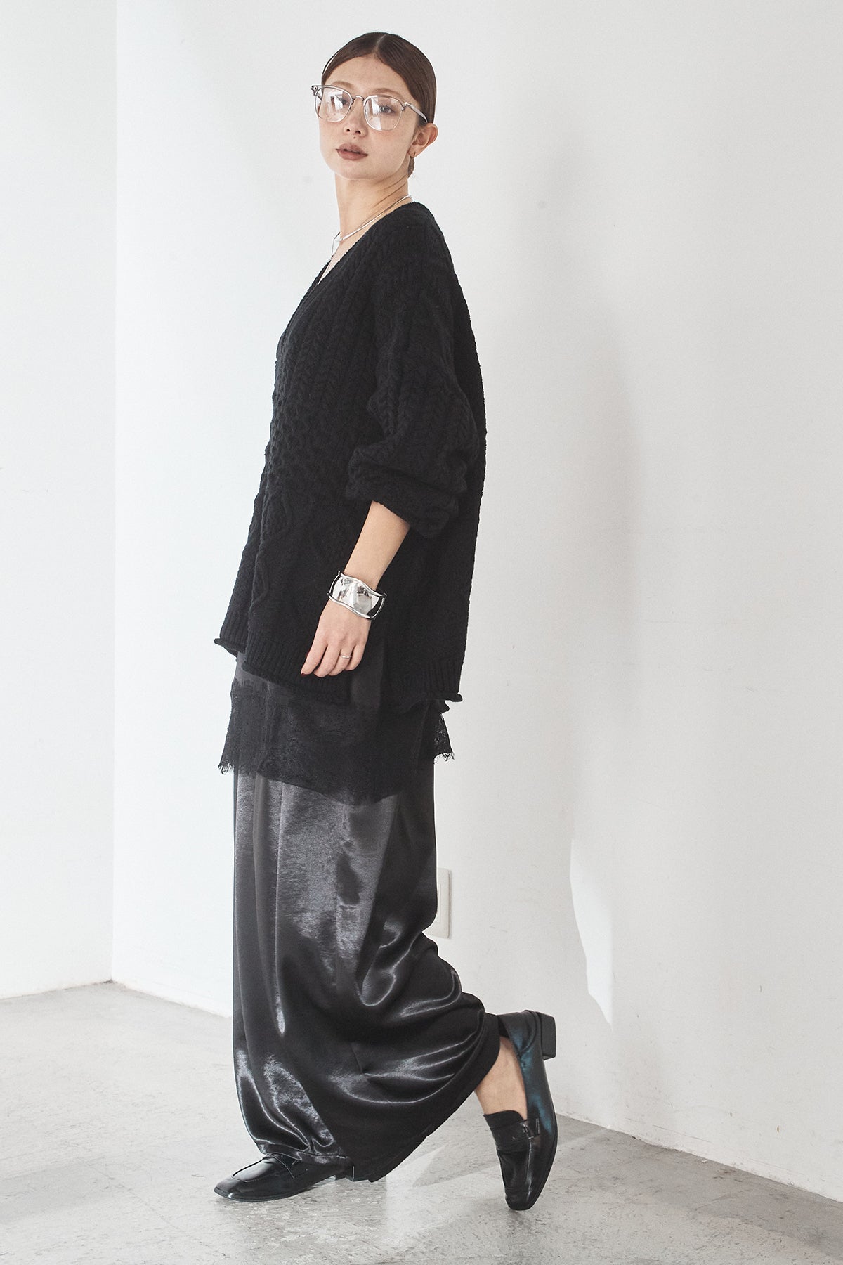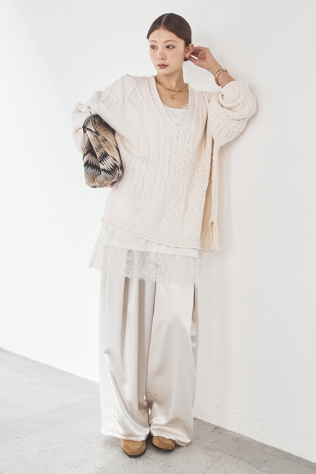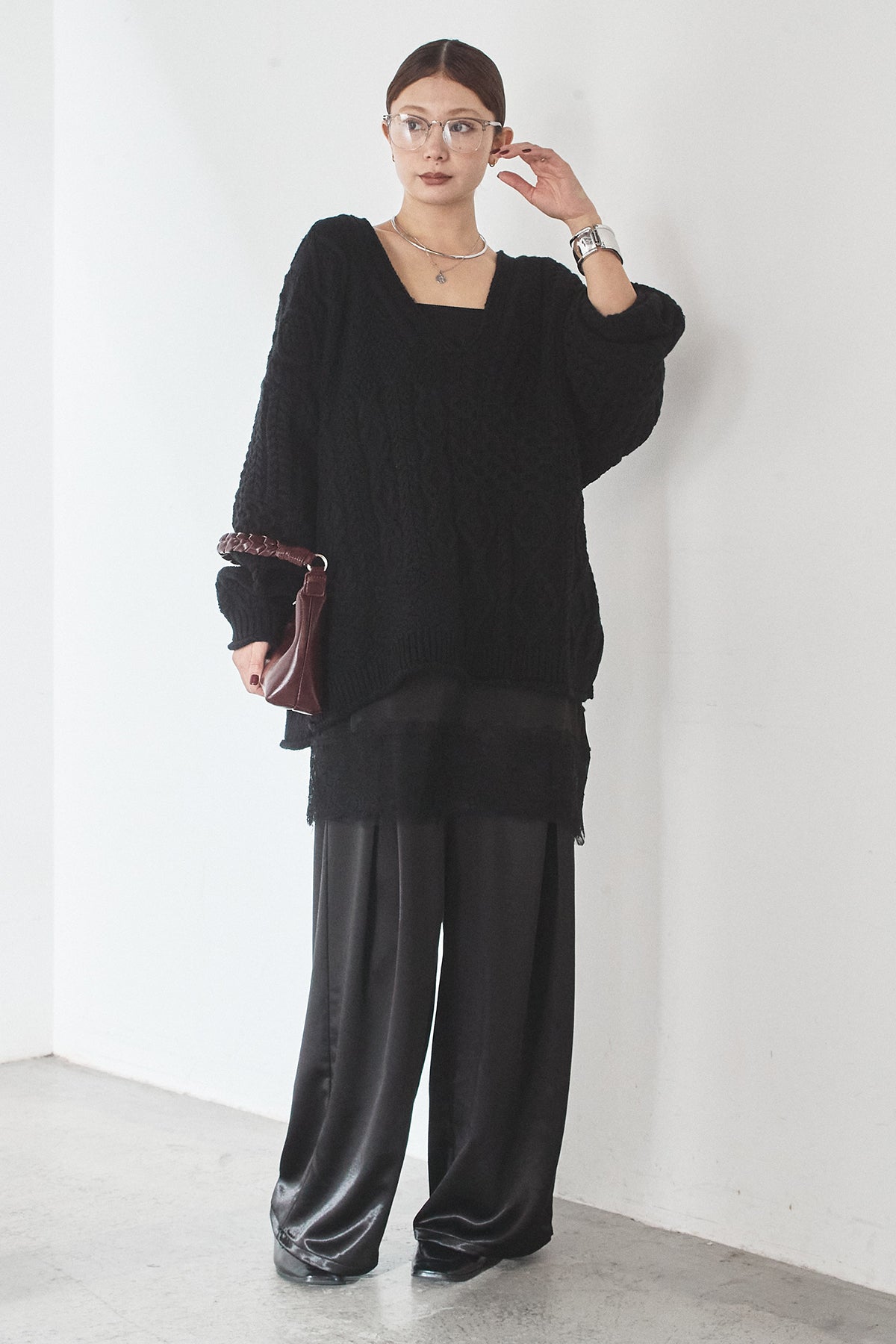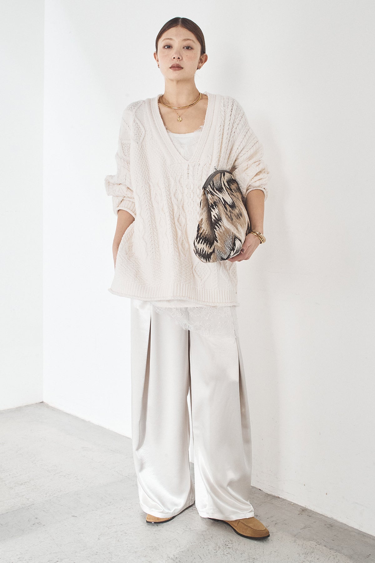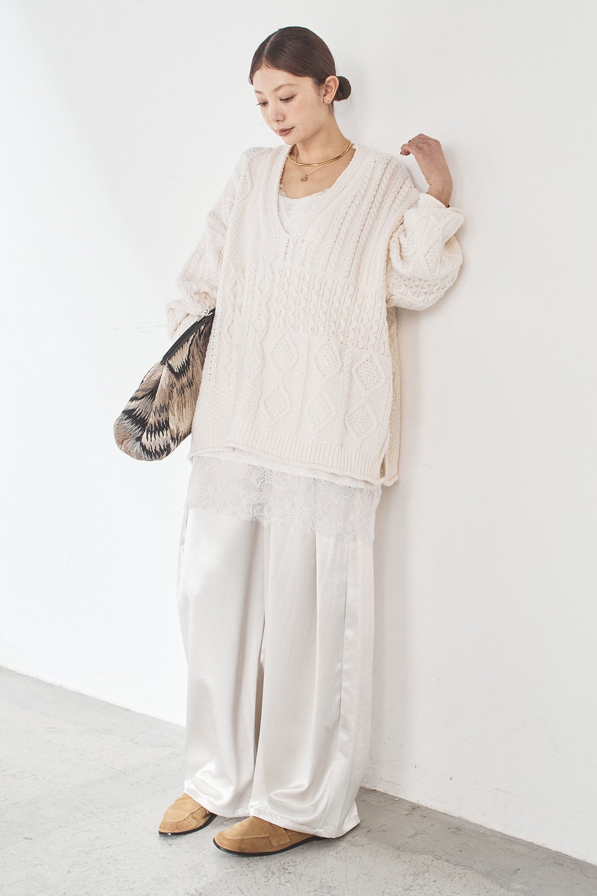 [SET]ケーブルVニットセーター+サテンタックワイドパンツ(2set)