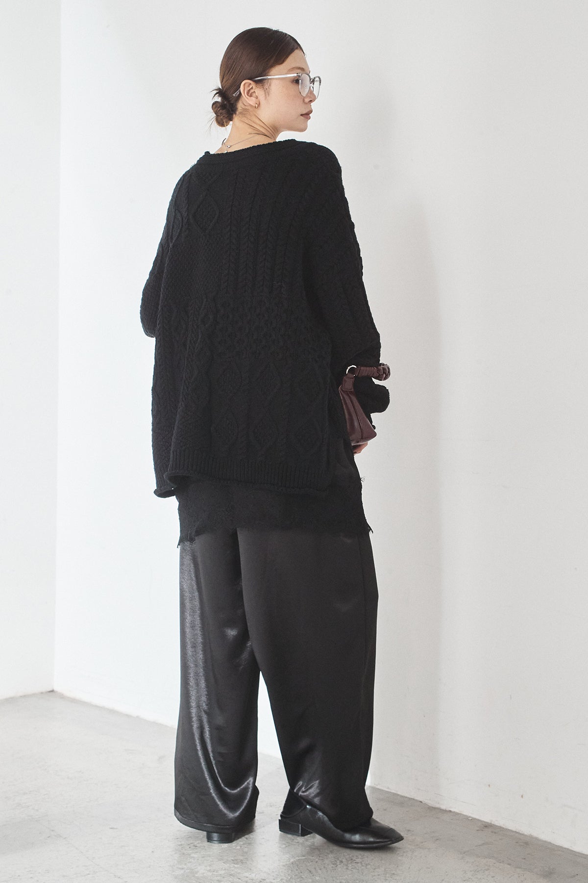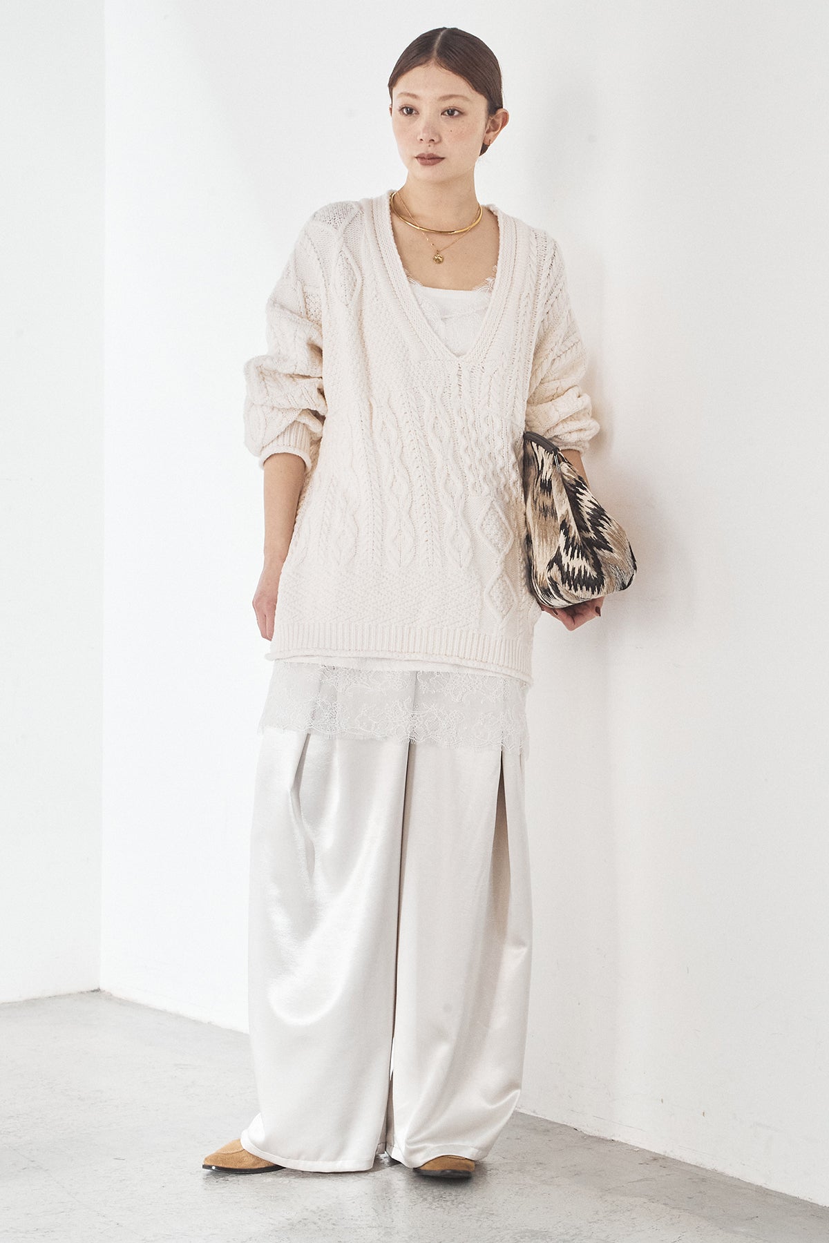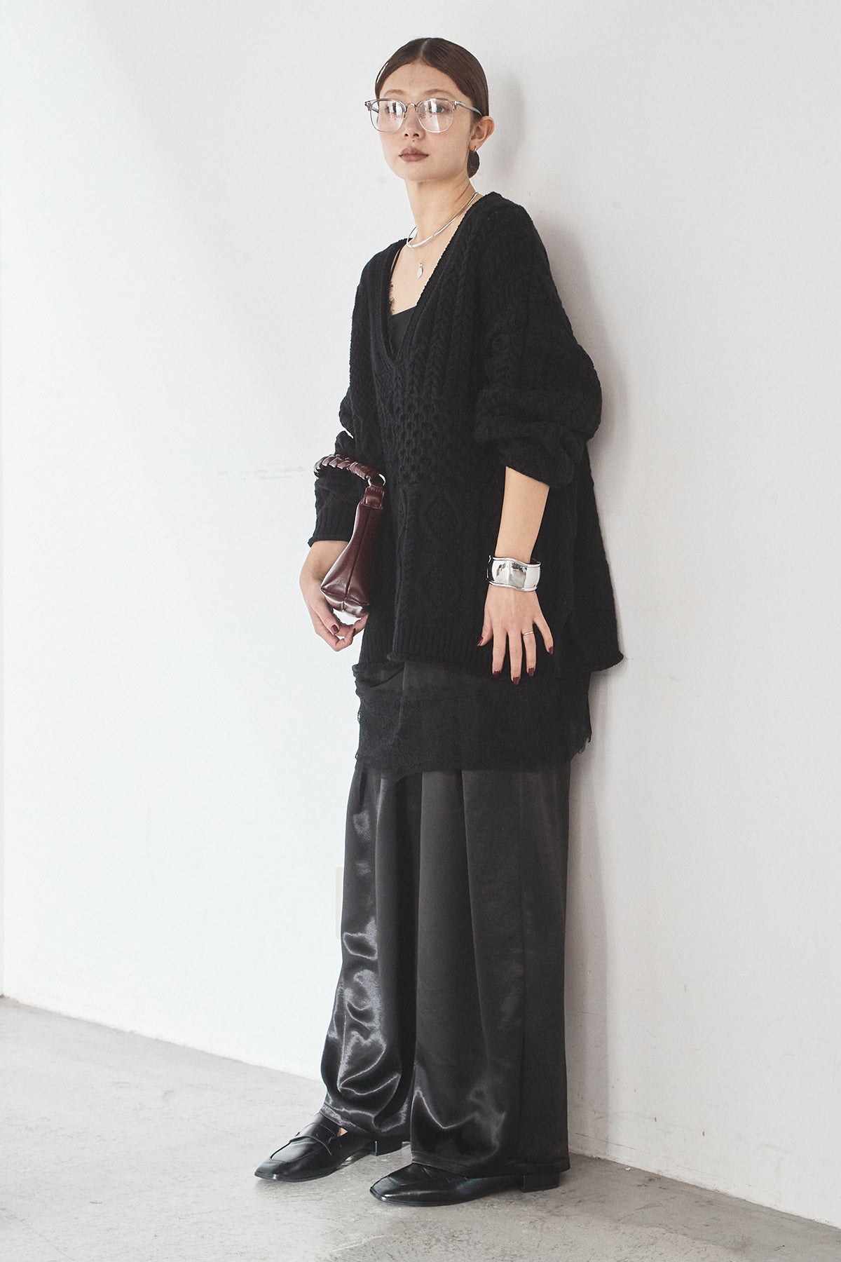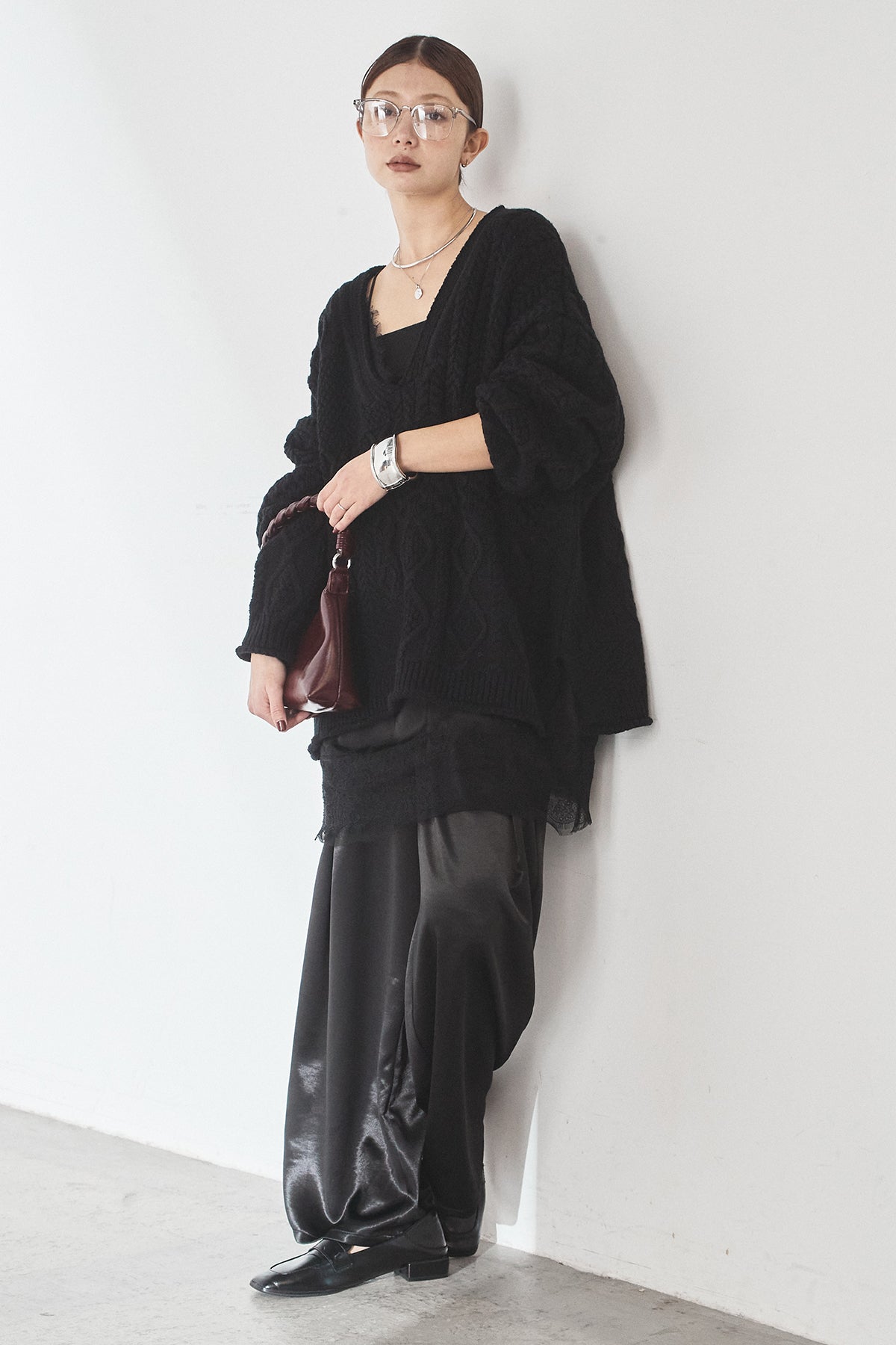 [SET]ケーブルVニットセーター+サテンタックワイドパンツ(2set)