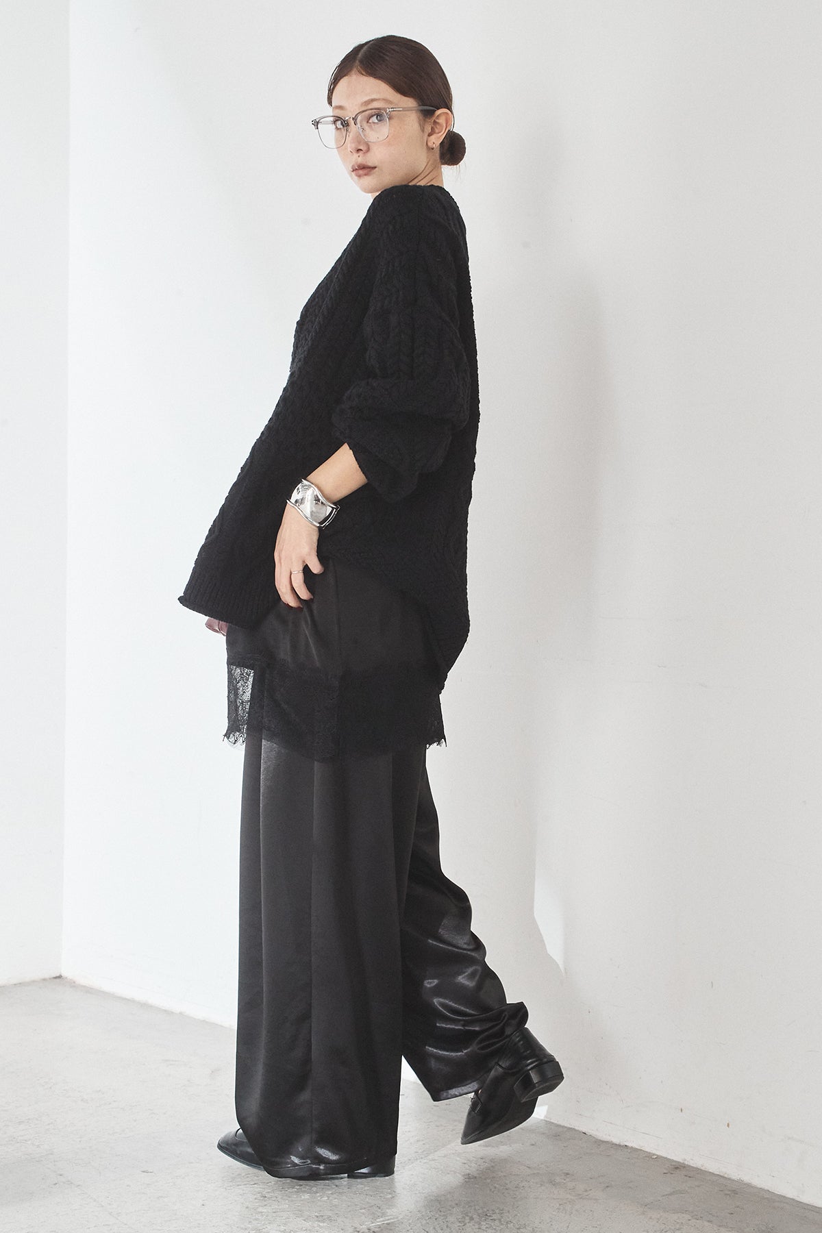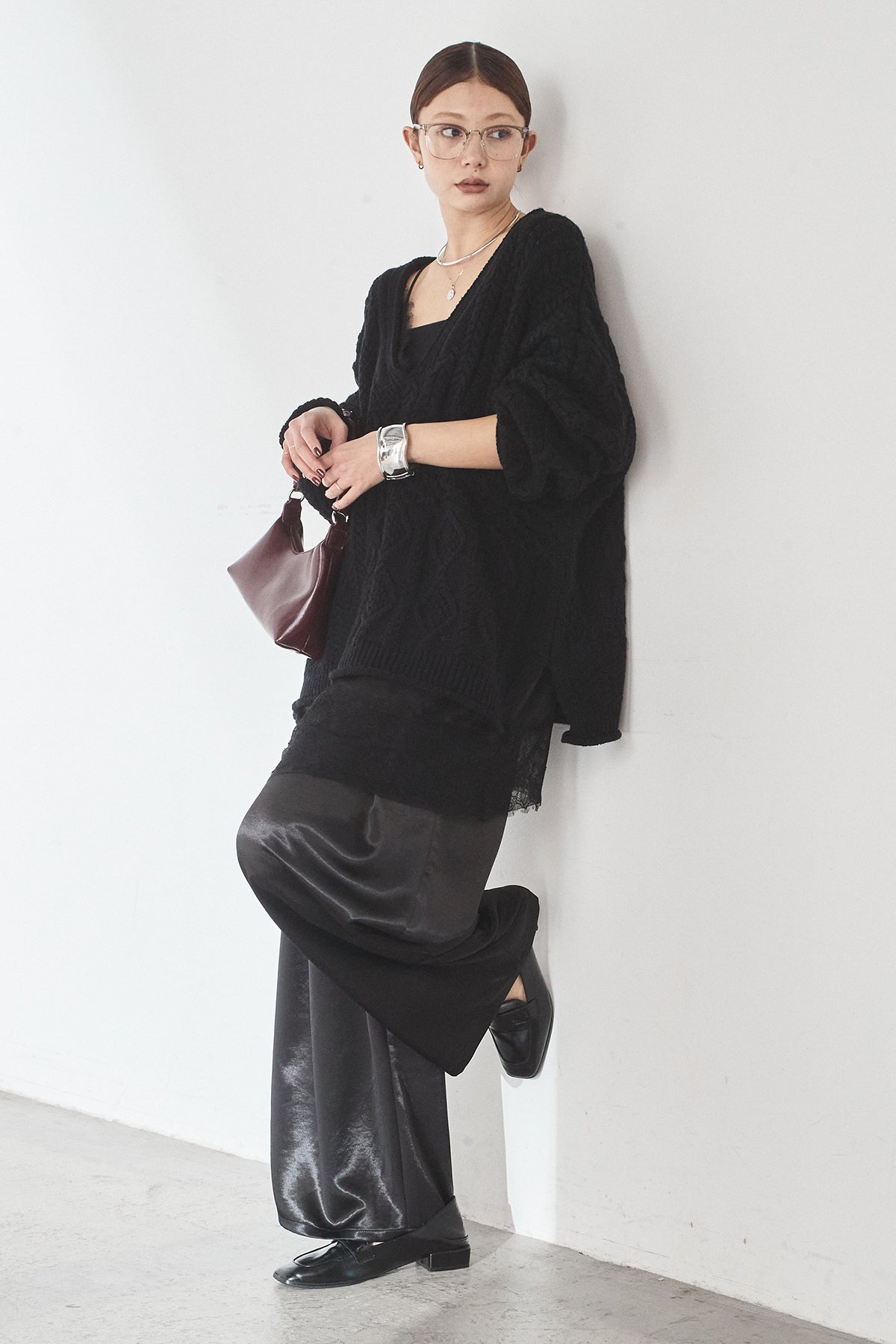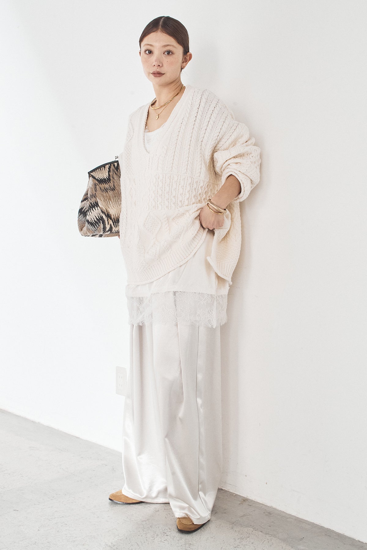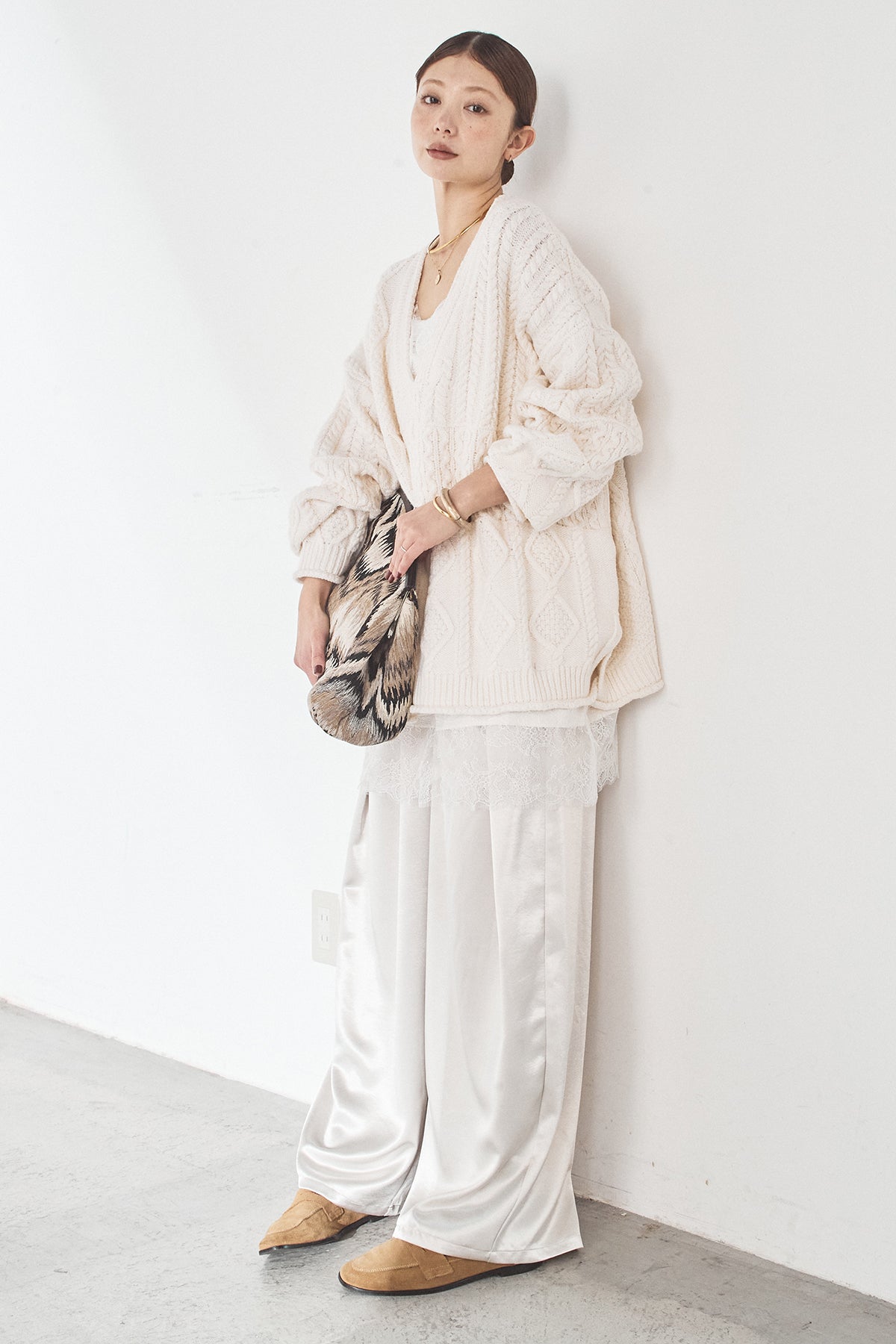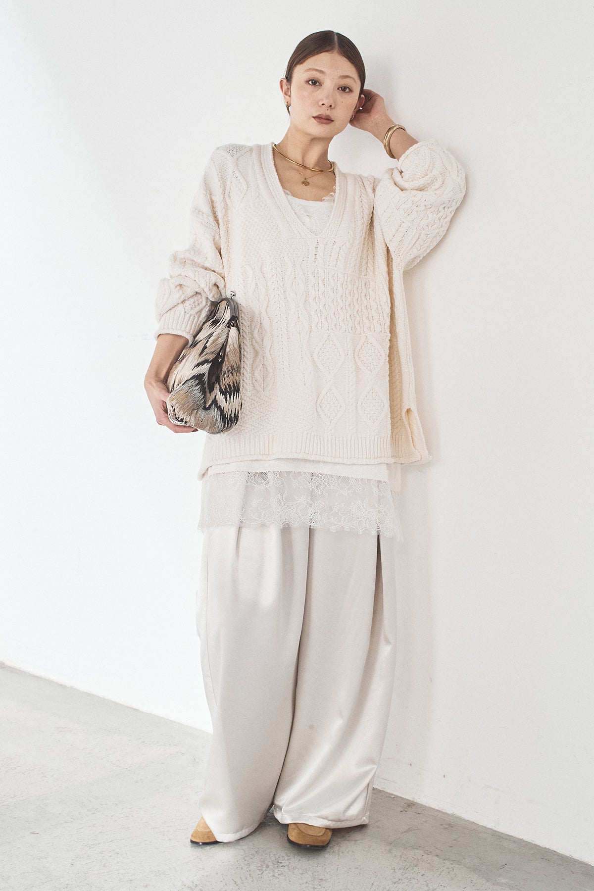 [SET]ケーブルVニットセーター+サテンタックワイドパンツ(2set)