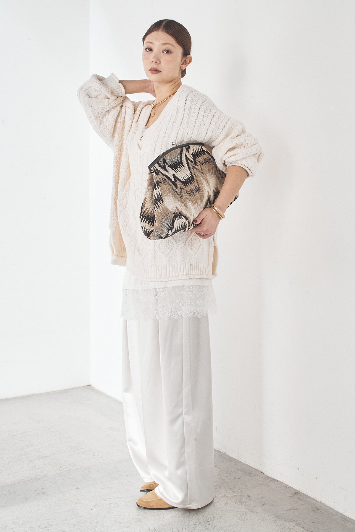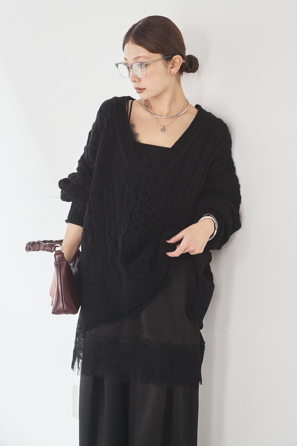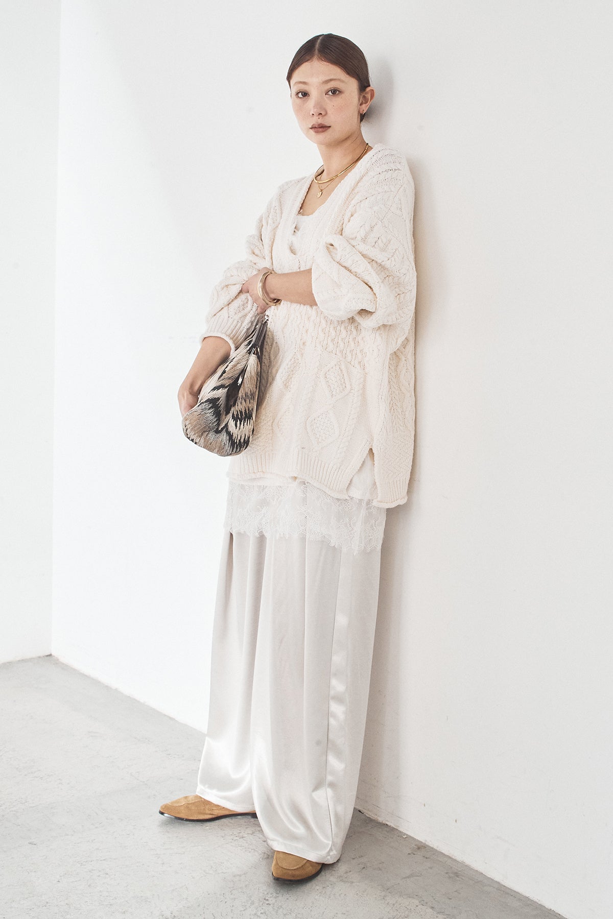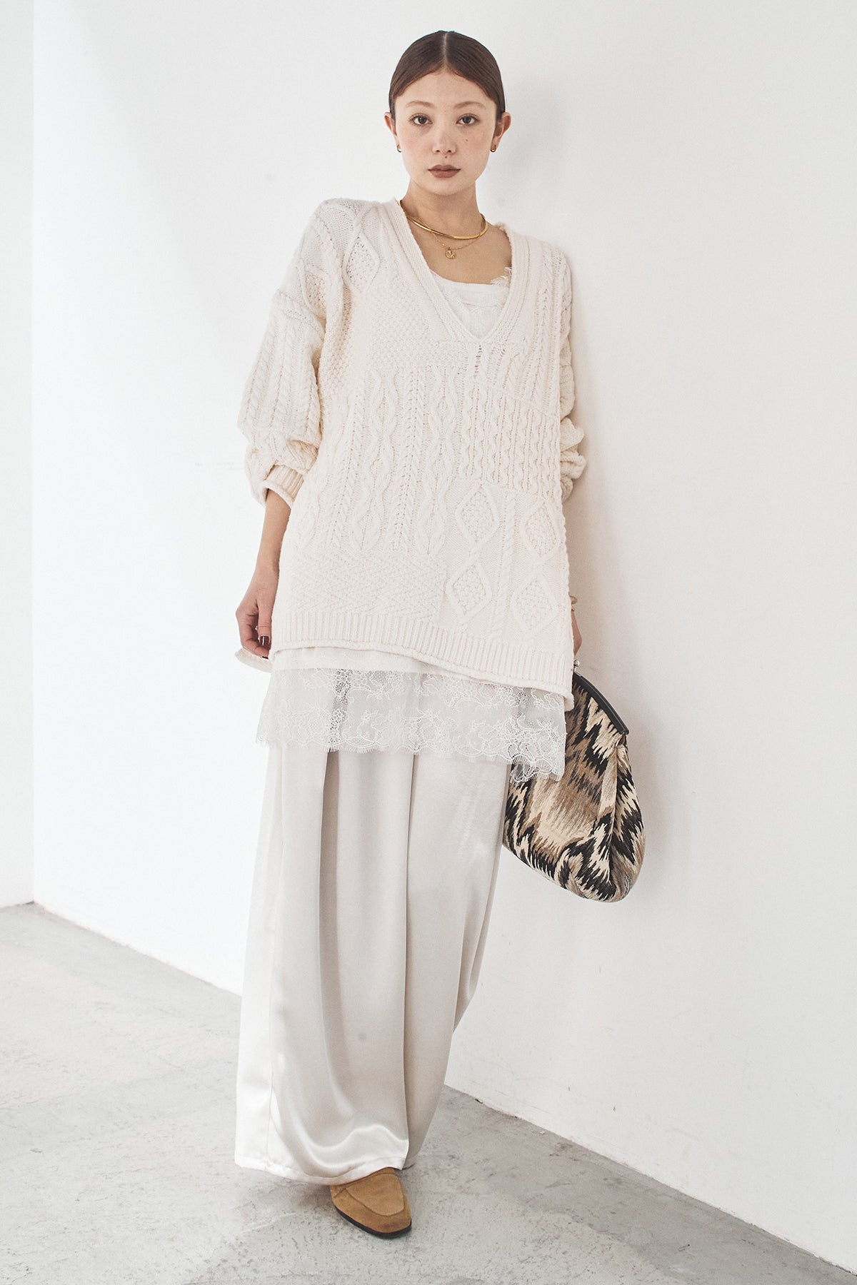 [SET]ケーブルVニットセーター+サテンタックワイドパンツ(2set)
