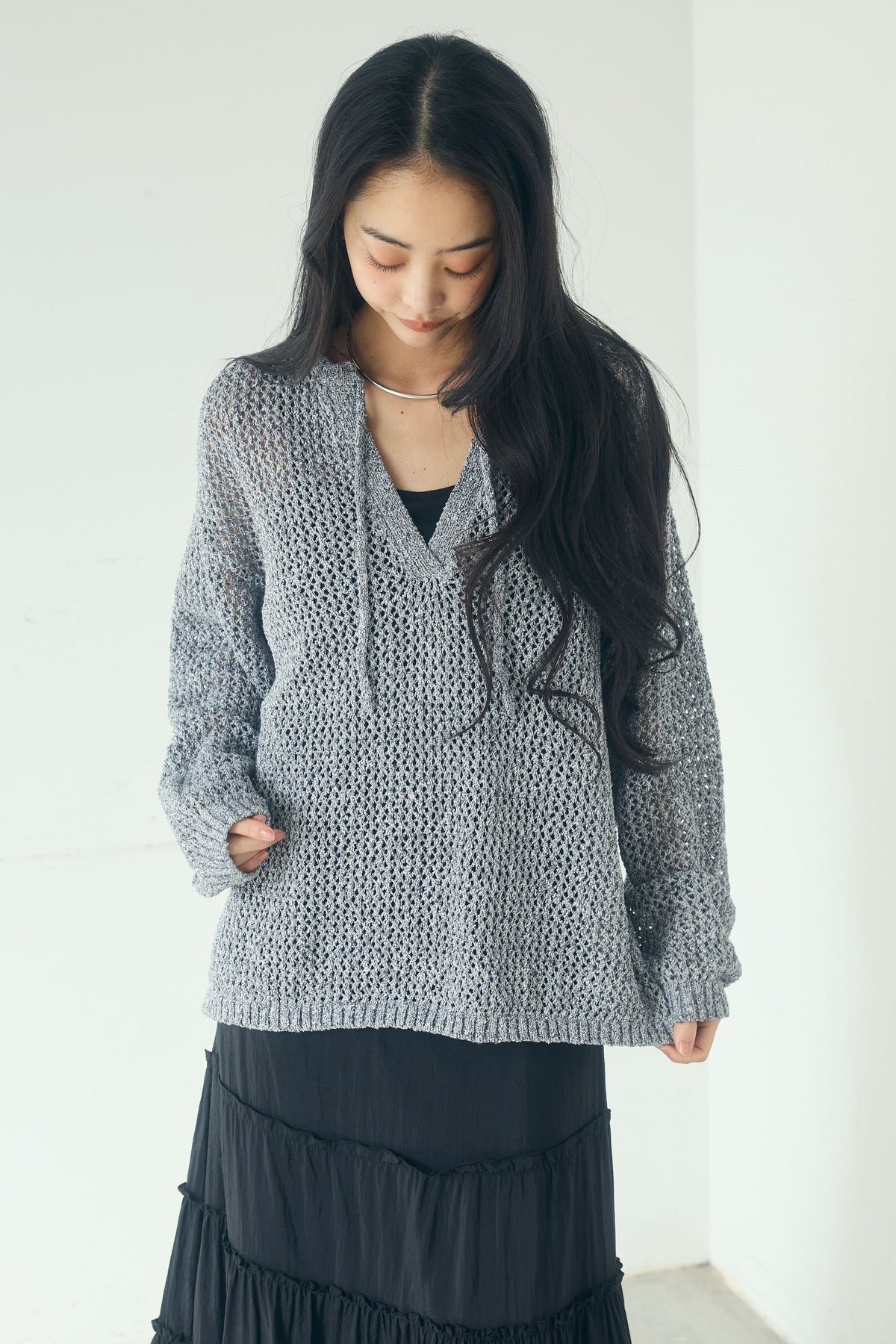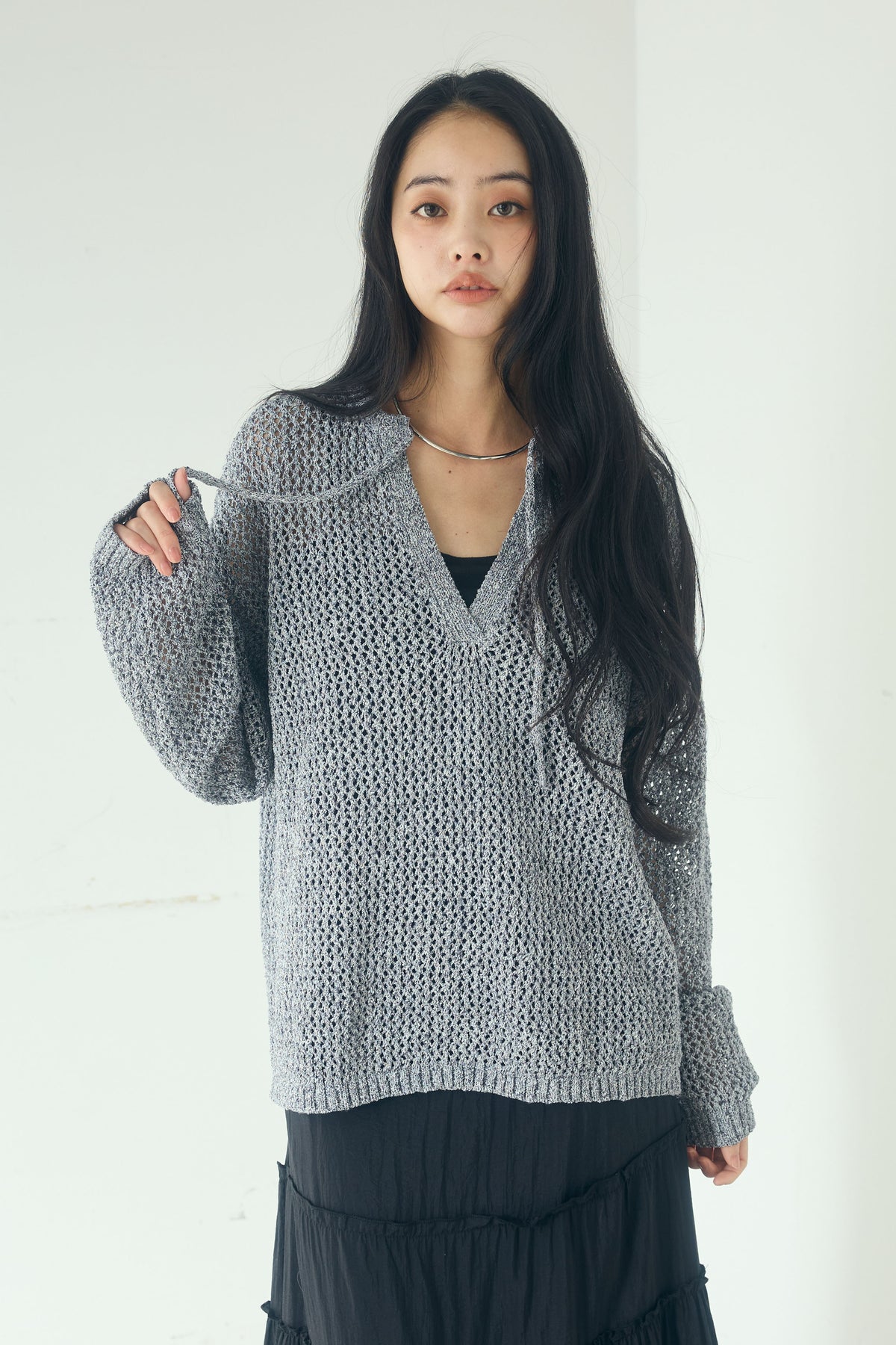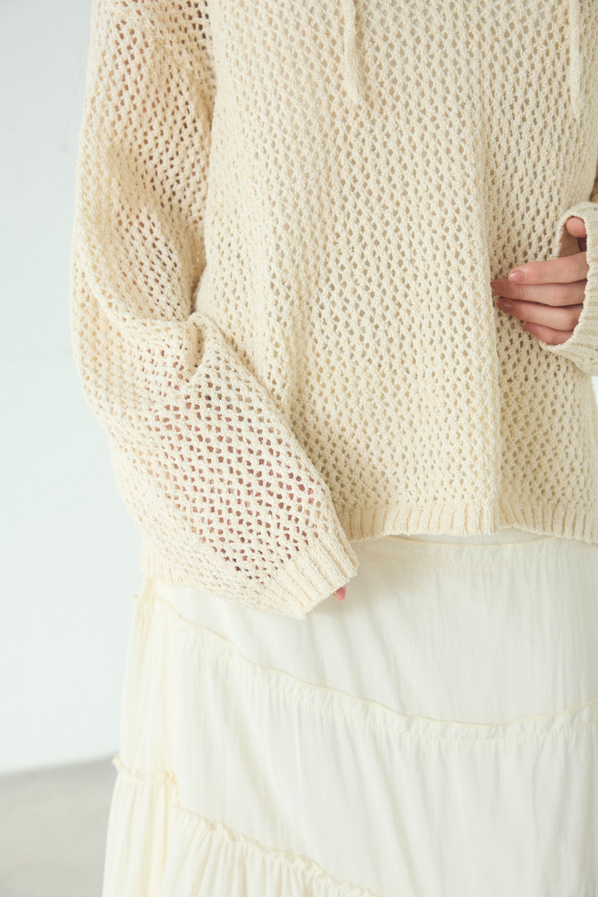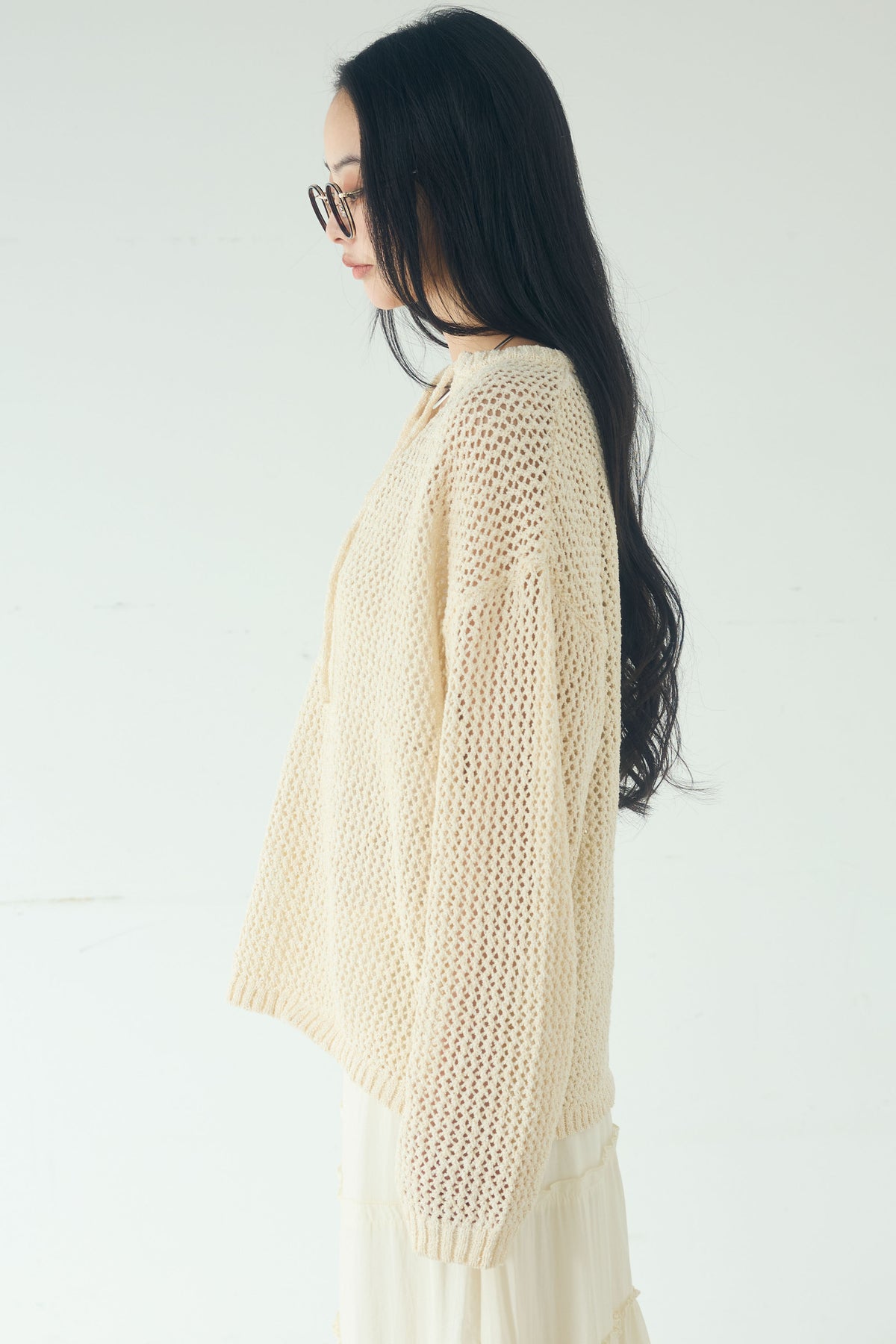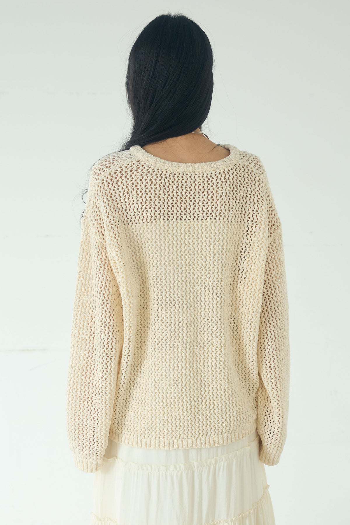 異なる編み地をミックスした表情のある素材感が印象的なキーネックプルオーバー。 程よく透け感のあるメッシュ編みが軽やかさを演出し、シンプルながらも奥行きのあるスタイリングに仕上がります。 首元のキーネックデザインが抜け感をプラスし、インナーとのレイヤードも楽しめる一枚。 ゆったりとしたシルエットで、パンツにもスカートにも合わせやすく、季節の変わり目にも活躍します。