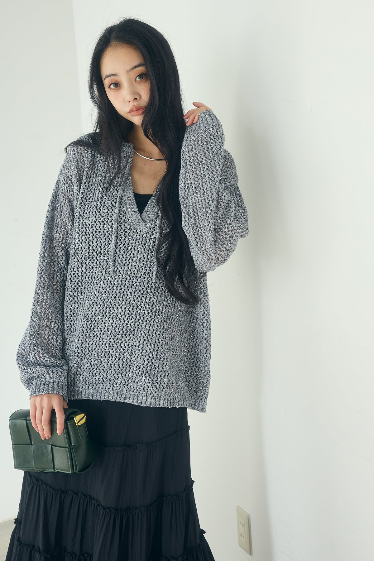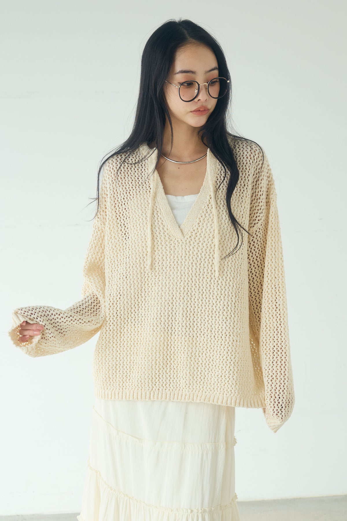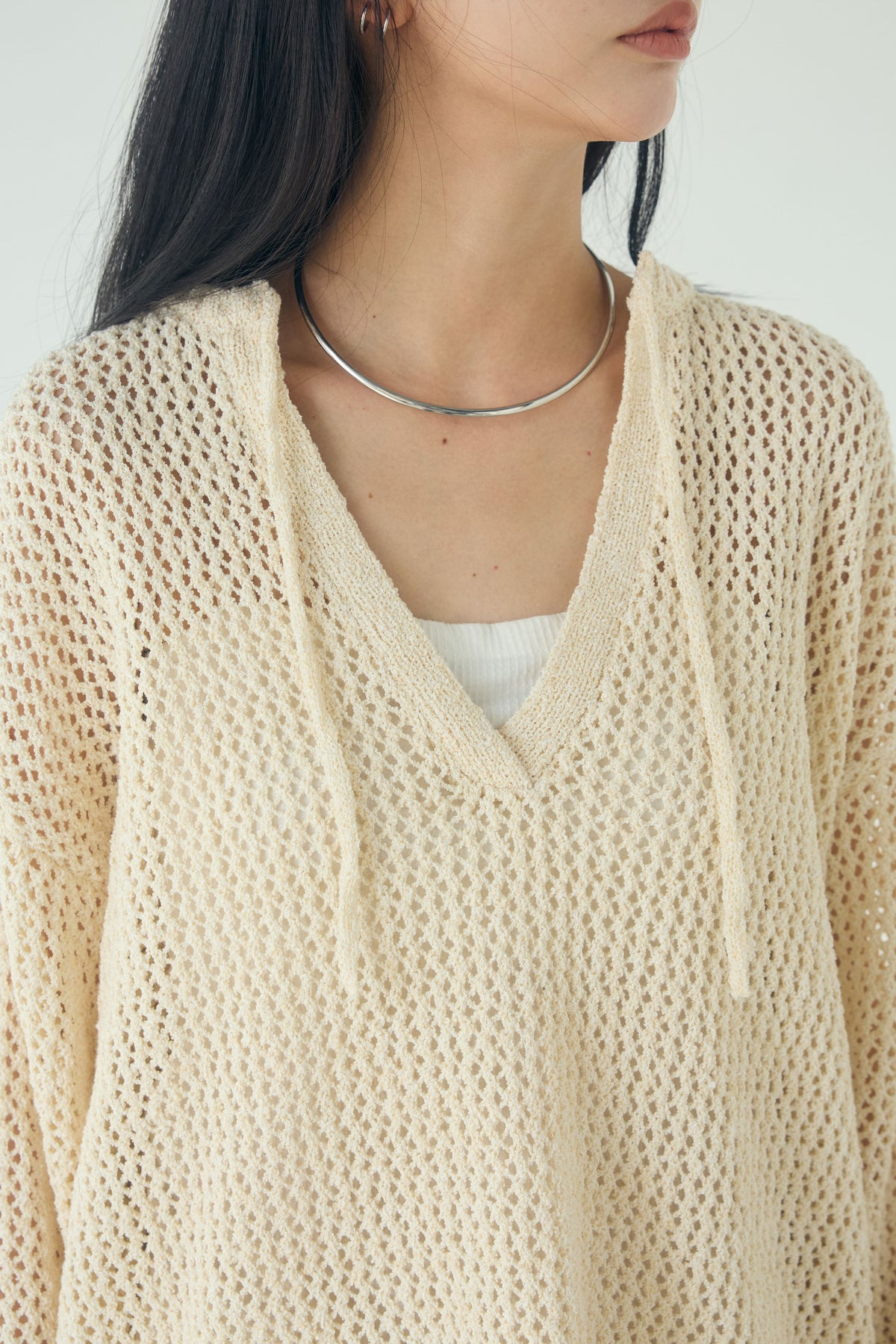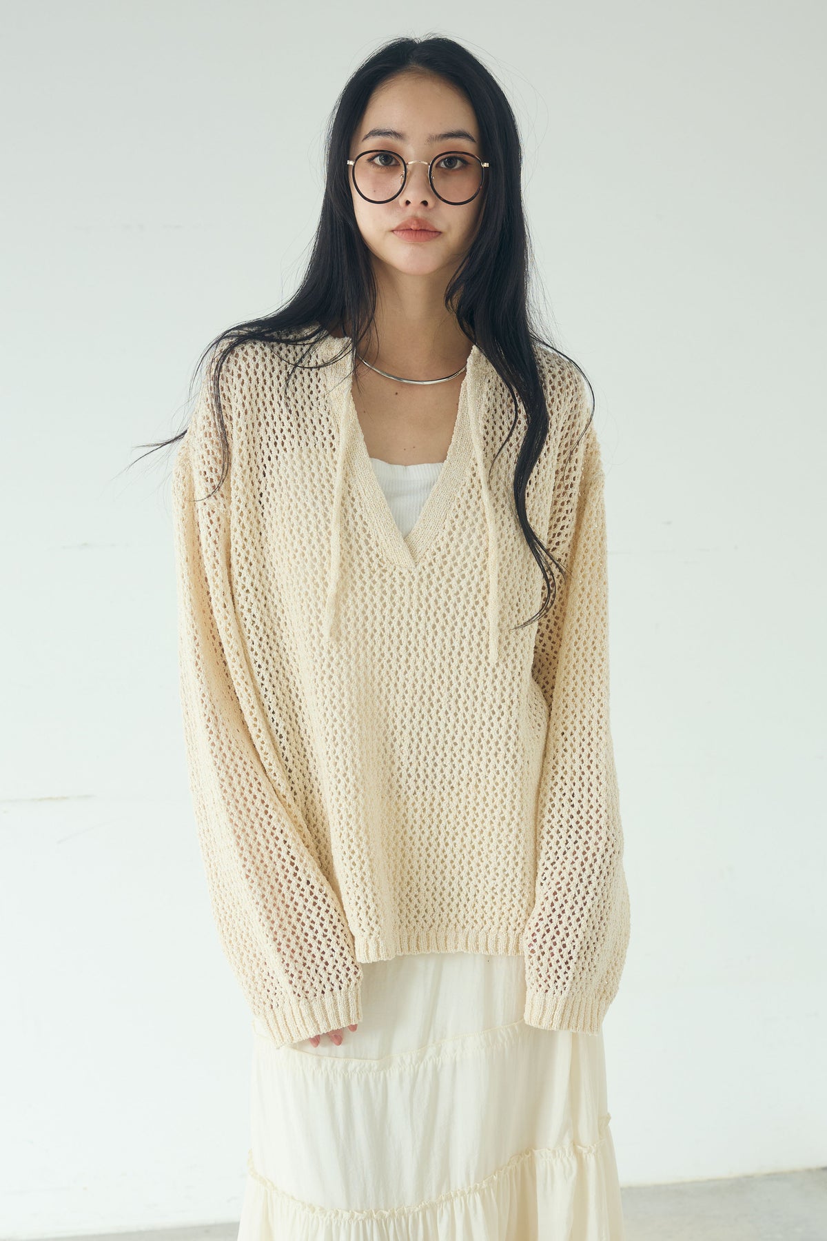 異なる編み地をミックスした表情のある素材感が印象的なキーネックプルオーバー。 程よく透け感のあるメッシュ編みが軽やかさを演出し、シンプルながらも奥行きのあるスタイリングに仕上がります。 首元のキーネックデザインが抜け感をプラスし、インナーとのレイヤードも楽しめる一枚。 ゆったりとしたシルエットで、パンツにもスカートにも合わせやすく、季節の変わり目にも活躍します。