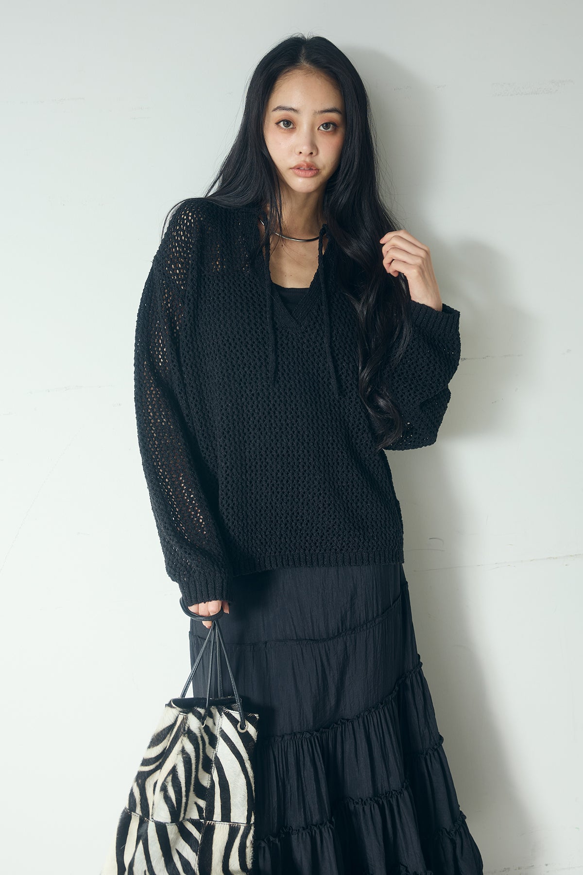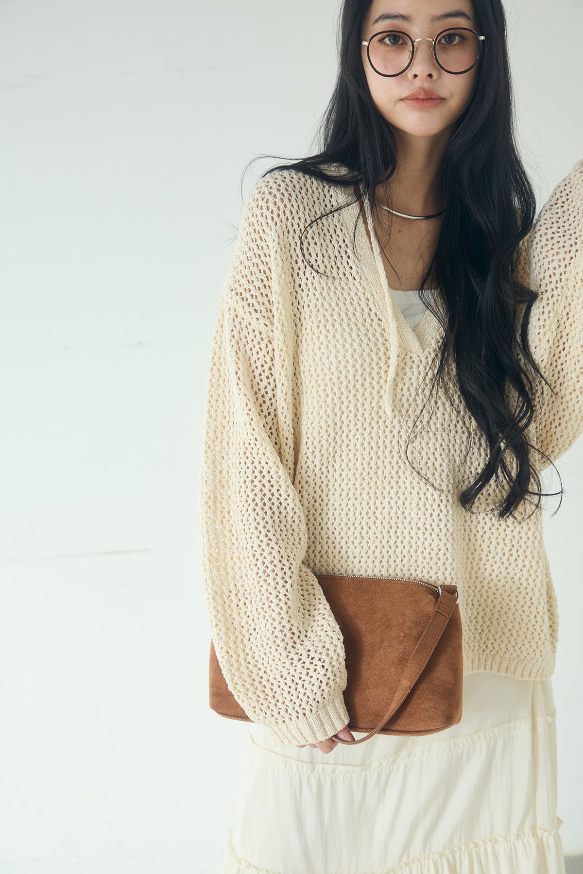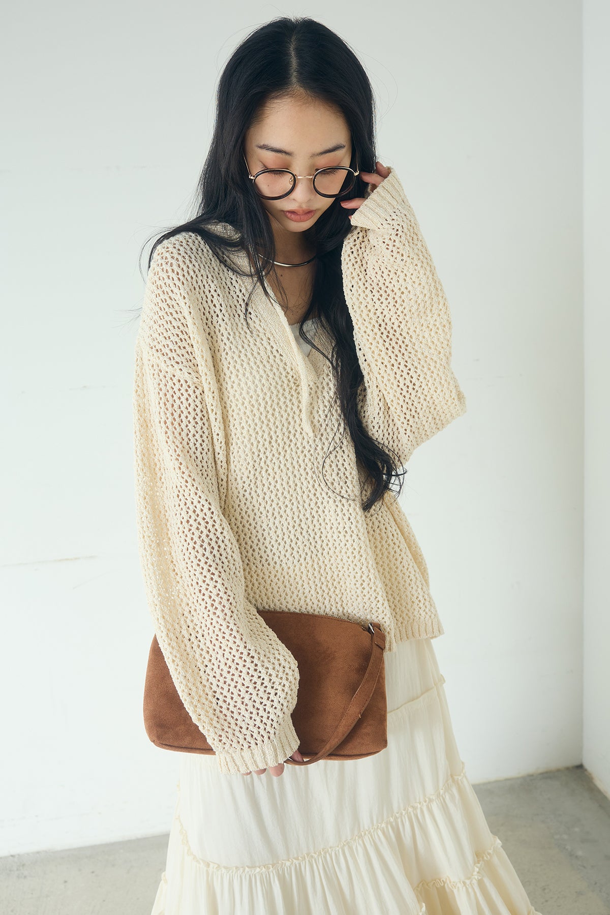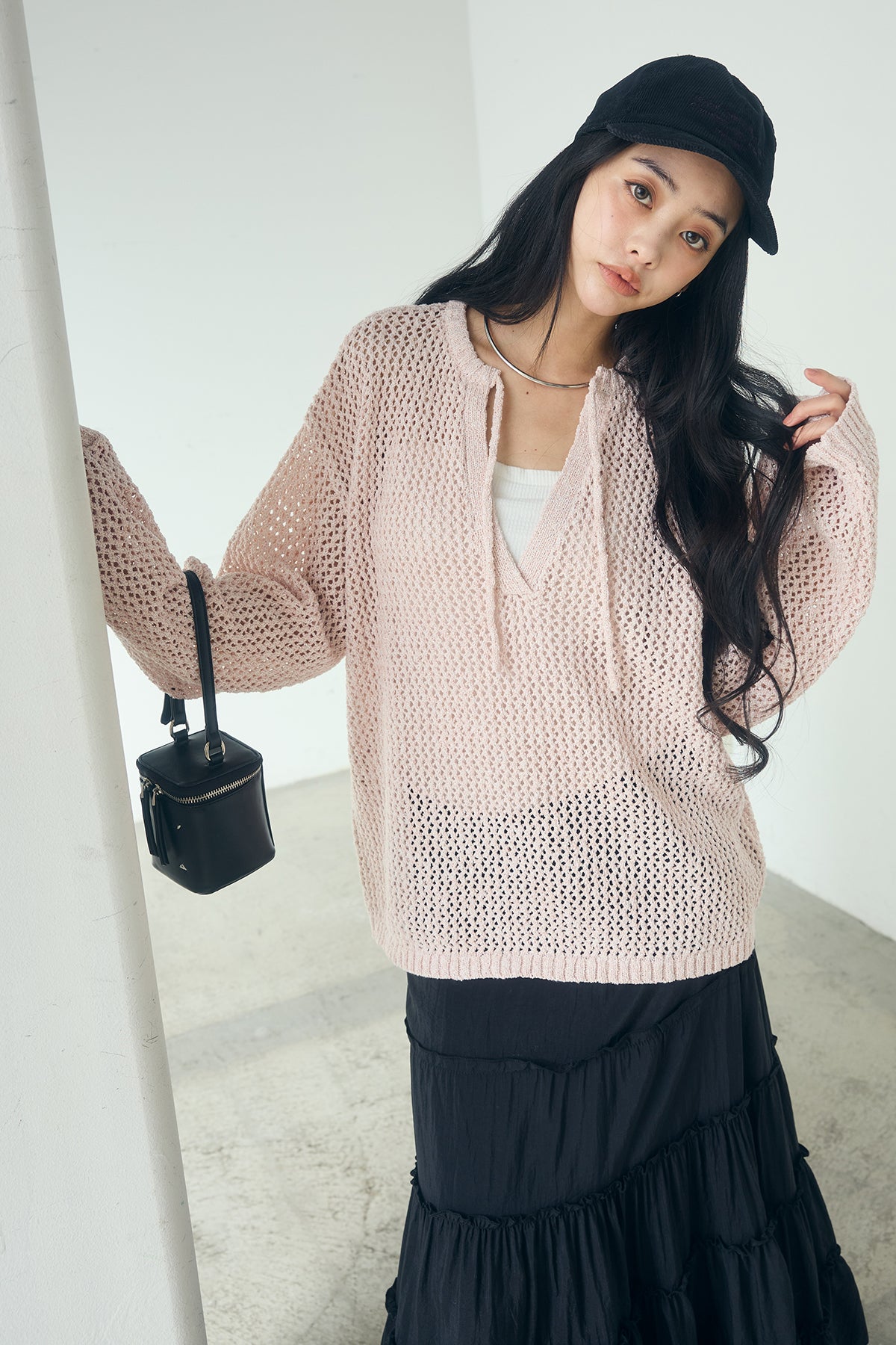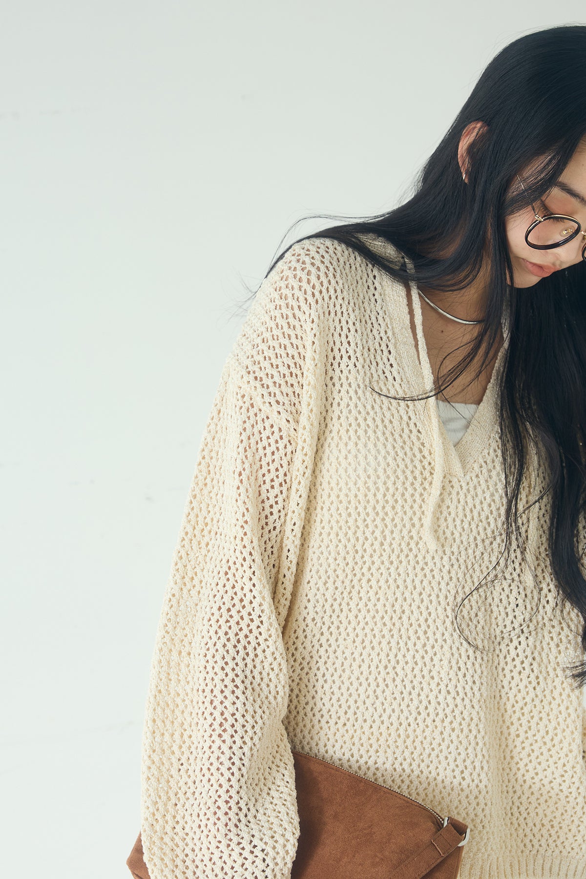 異なる編み地をミックスした表情のある素材感が印象的なキーネックプルオーバー。 程よく透け感のあるメッシュ編みが軽やかさを演出し、シンプルながらも奥行きのあるスタイリングに仕上がります。 首元のキーネックデザインが抜け感をプラスし、インナーとのレイヤードも楽しめる一枚。 ゆったりとしたシルエットで、パンツにもスカートにも合わせやすく、季節の変わり目にも活躍します。