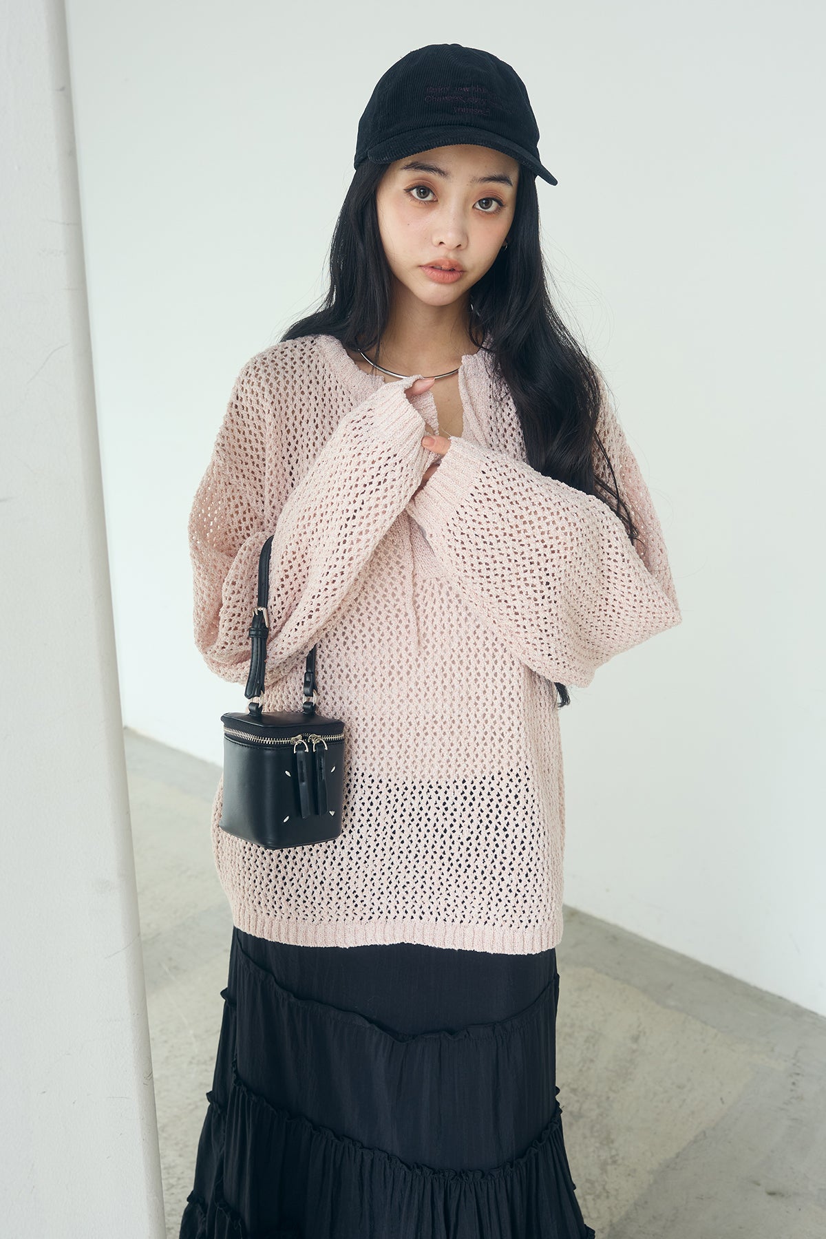 [SET]ミックスメッシュキーネックプルオーバー+ギャザーティアードマキシスカート(2set)