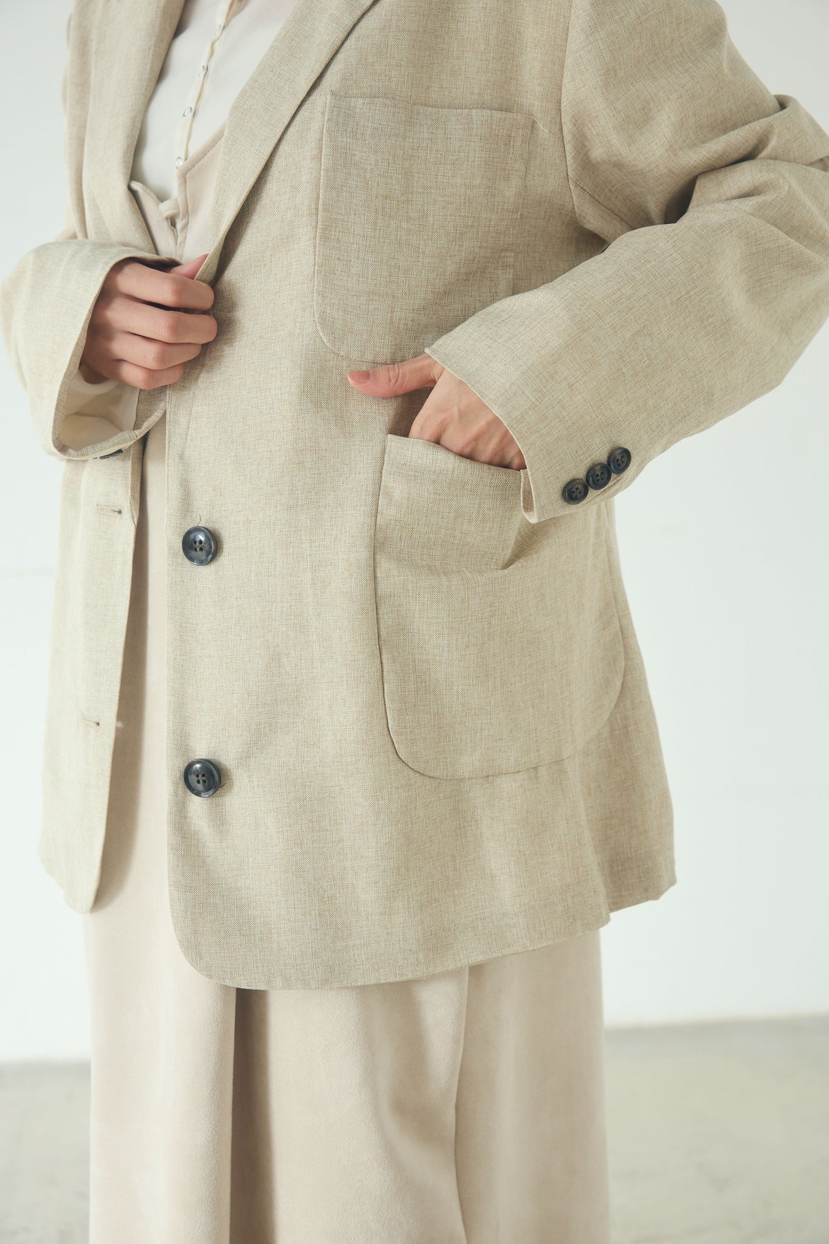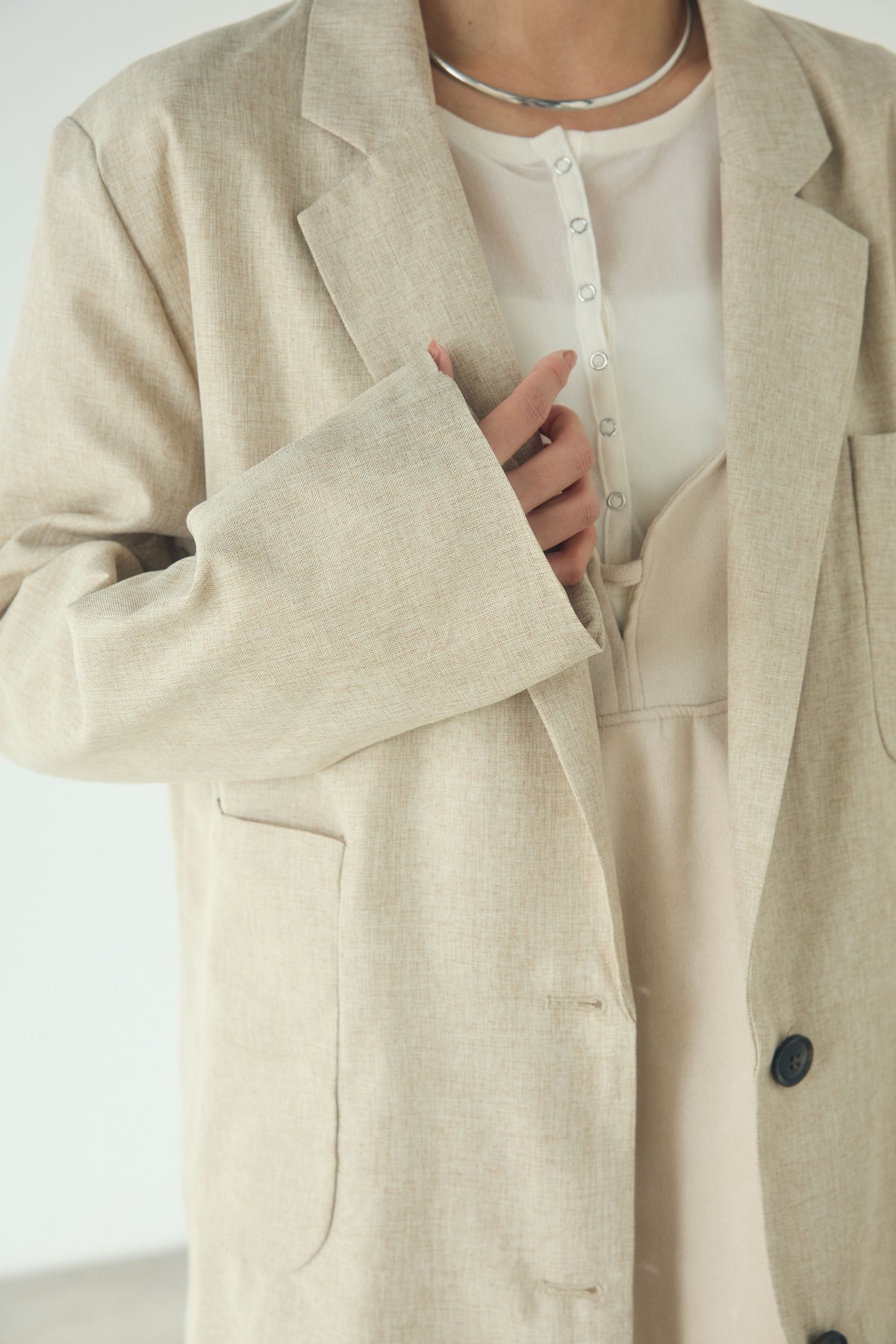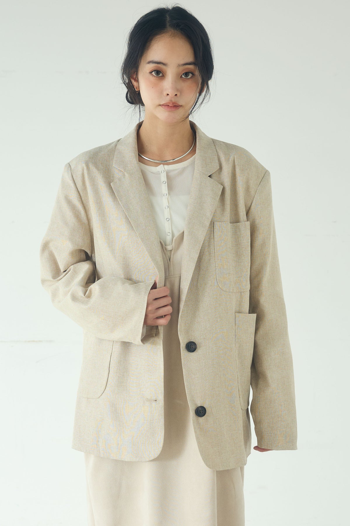 リネンのような風合いを感じさせる、軽やかな素材感のテーラードジャケット。 程よくラフな表情がありながら、きちんと感も備えたバランスの良い一着です。 ゆとりのあるシルエットで、カーディガン感覚でさっと羽織れるのもポイント。 シンプルなスタイリングにプラスするだけで、コーディネートに奥行きと抜け感を添えてくれます。