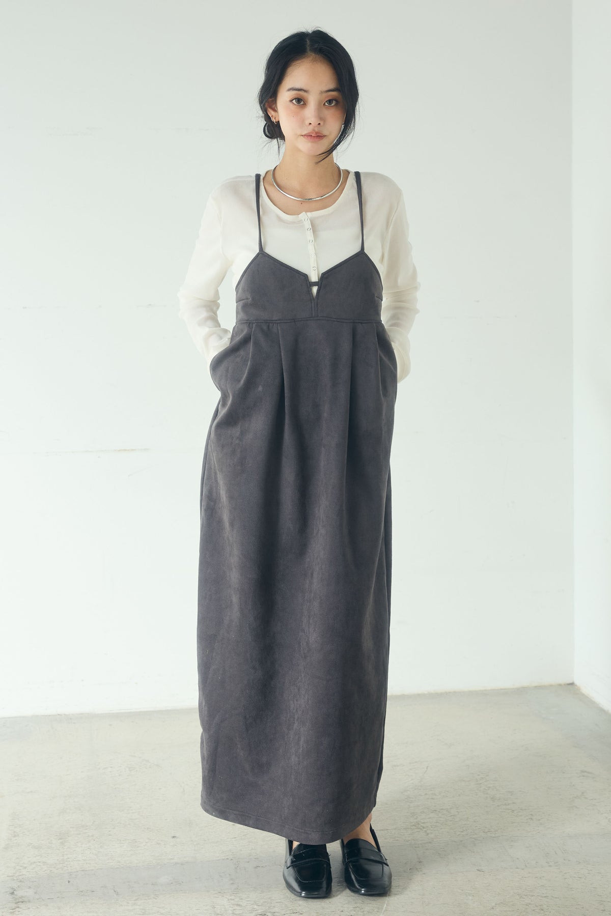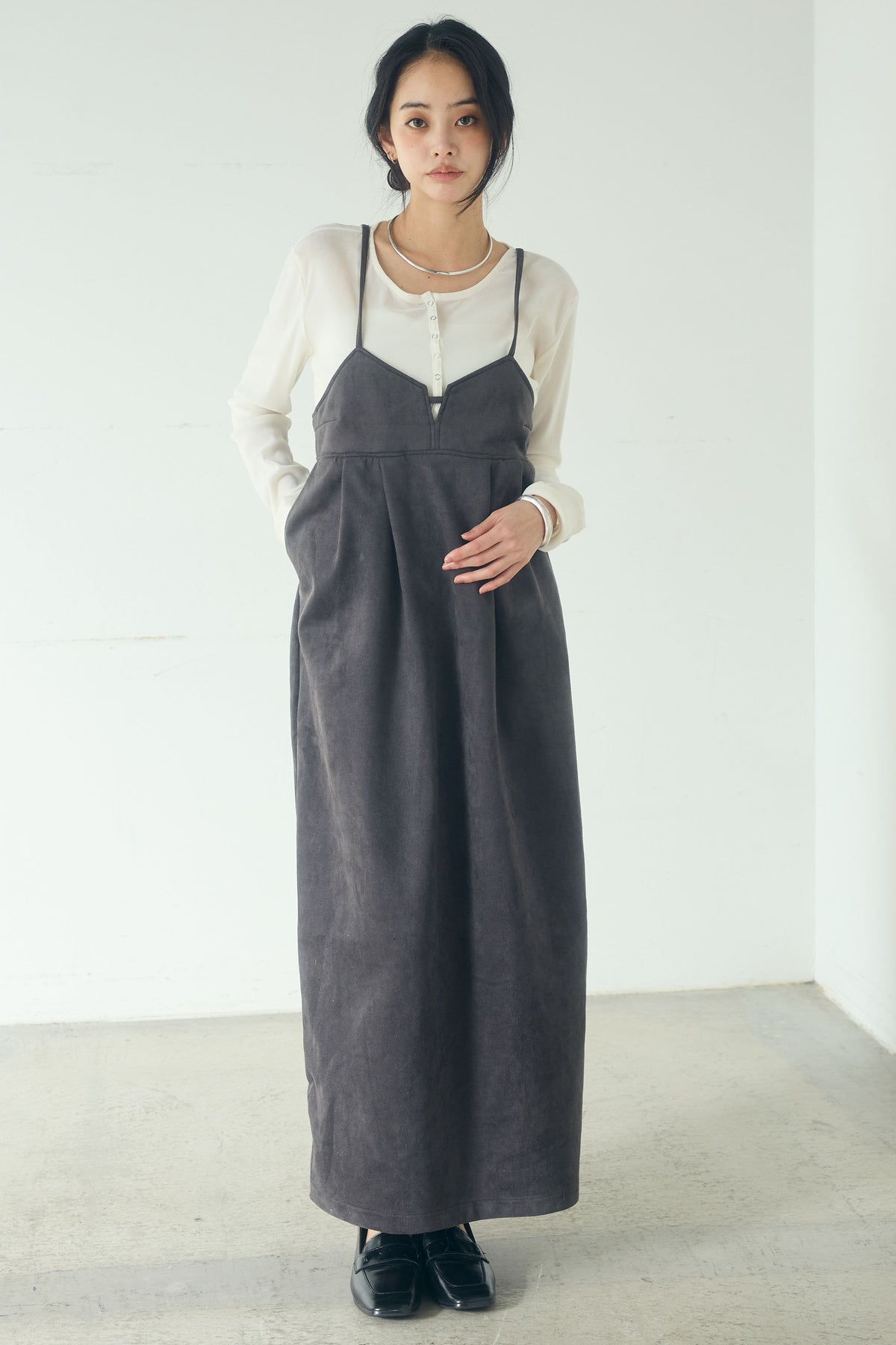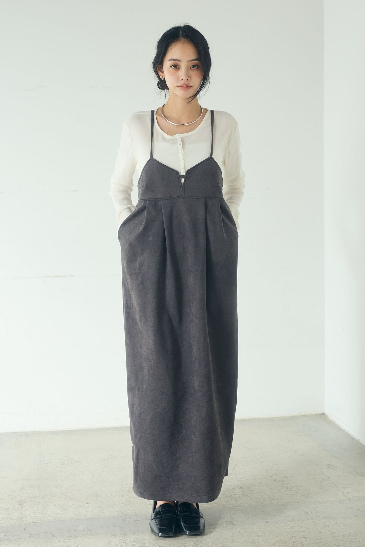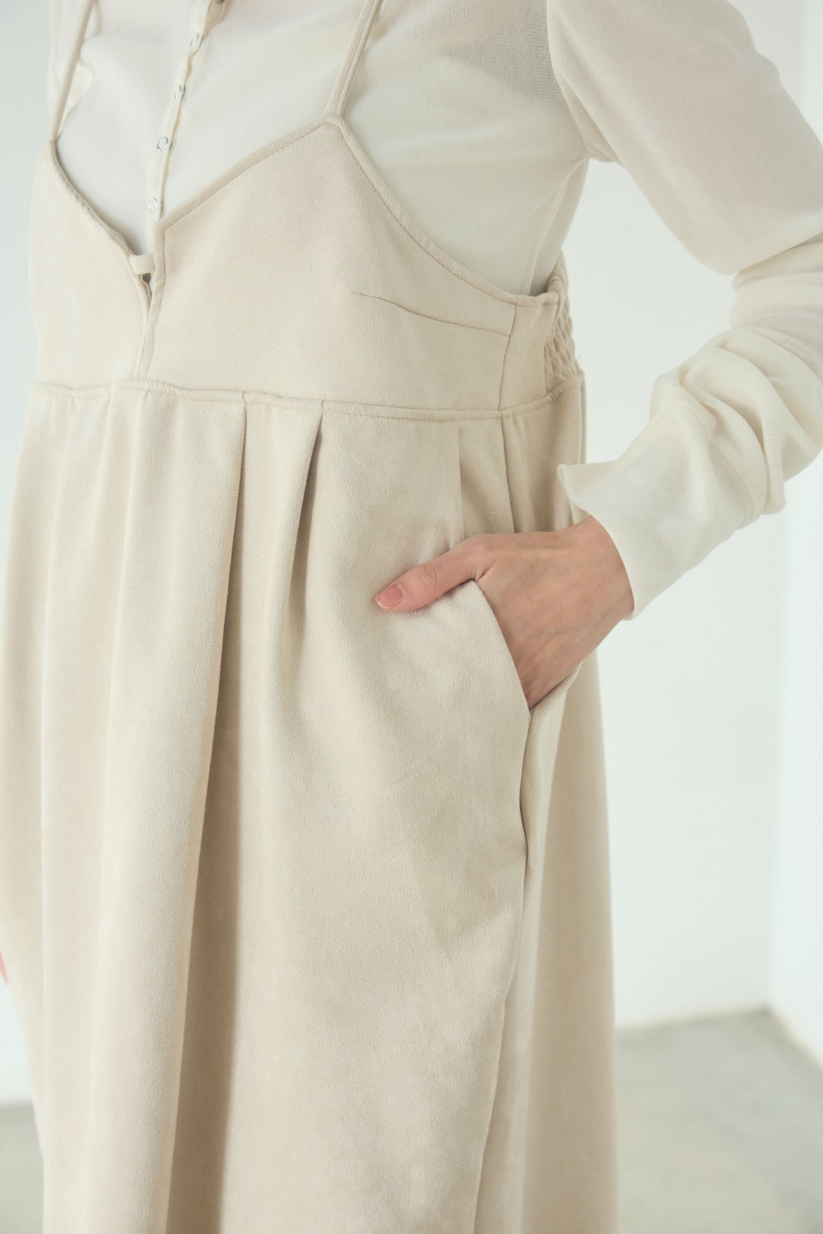 スエード調の素材感が目を引く、ポンチデザインのキャミワンピース。 胸元の切り替えと程よく立体感のあるシルエットが、シンプルながらも奥行きのある印象に仕上げます。 インナー次第でロングシーズン着用でき、ニットやカットソーとのレイヤードも楽しめる一着。 足元をブーツやスニーカーに合わせて、幅広いスタイリングに取り入れやすいアイテムです。